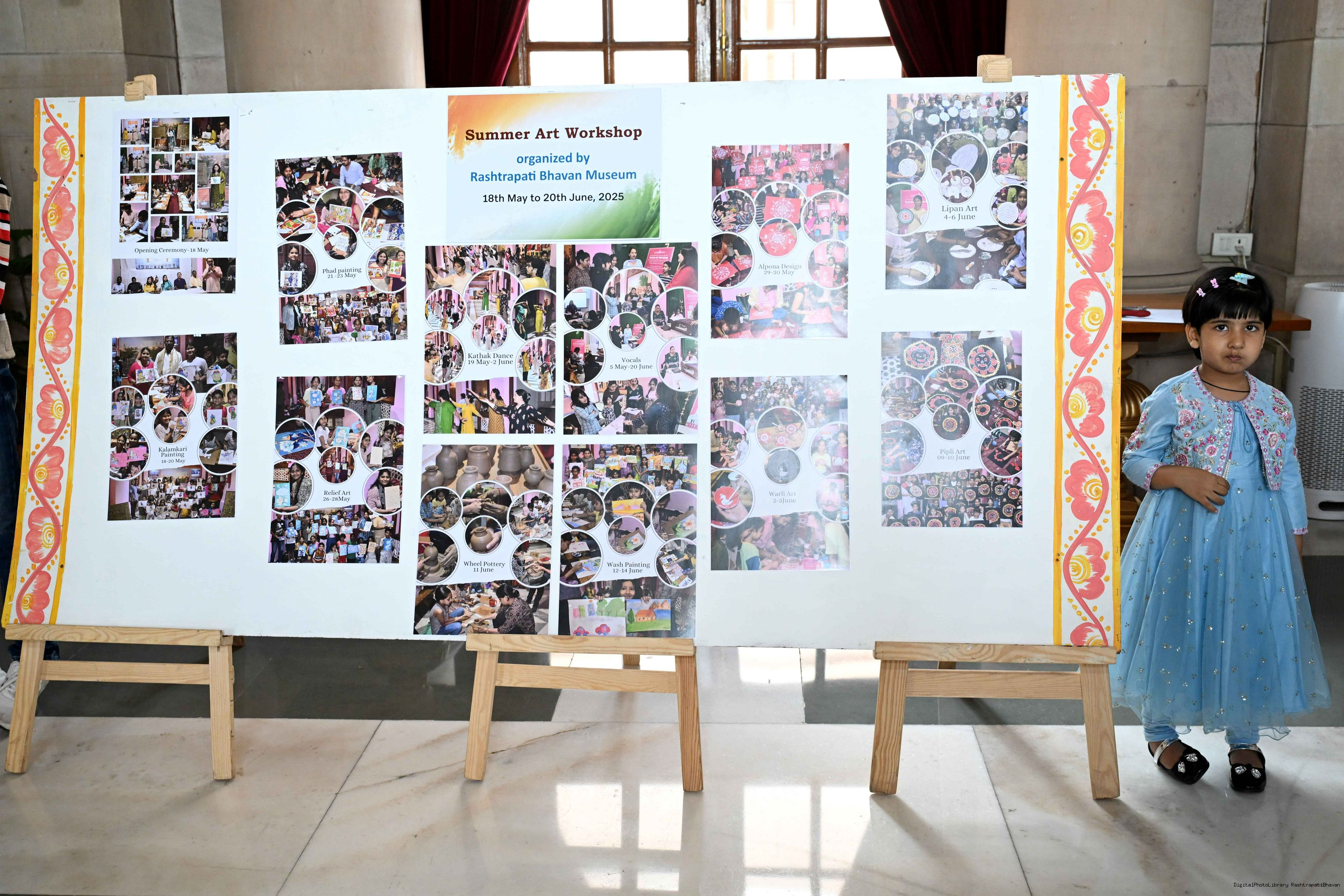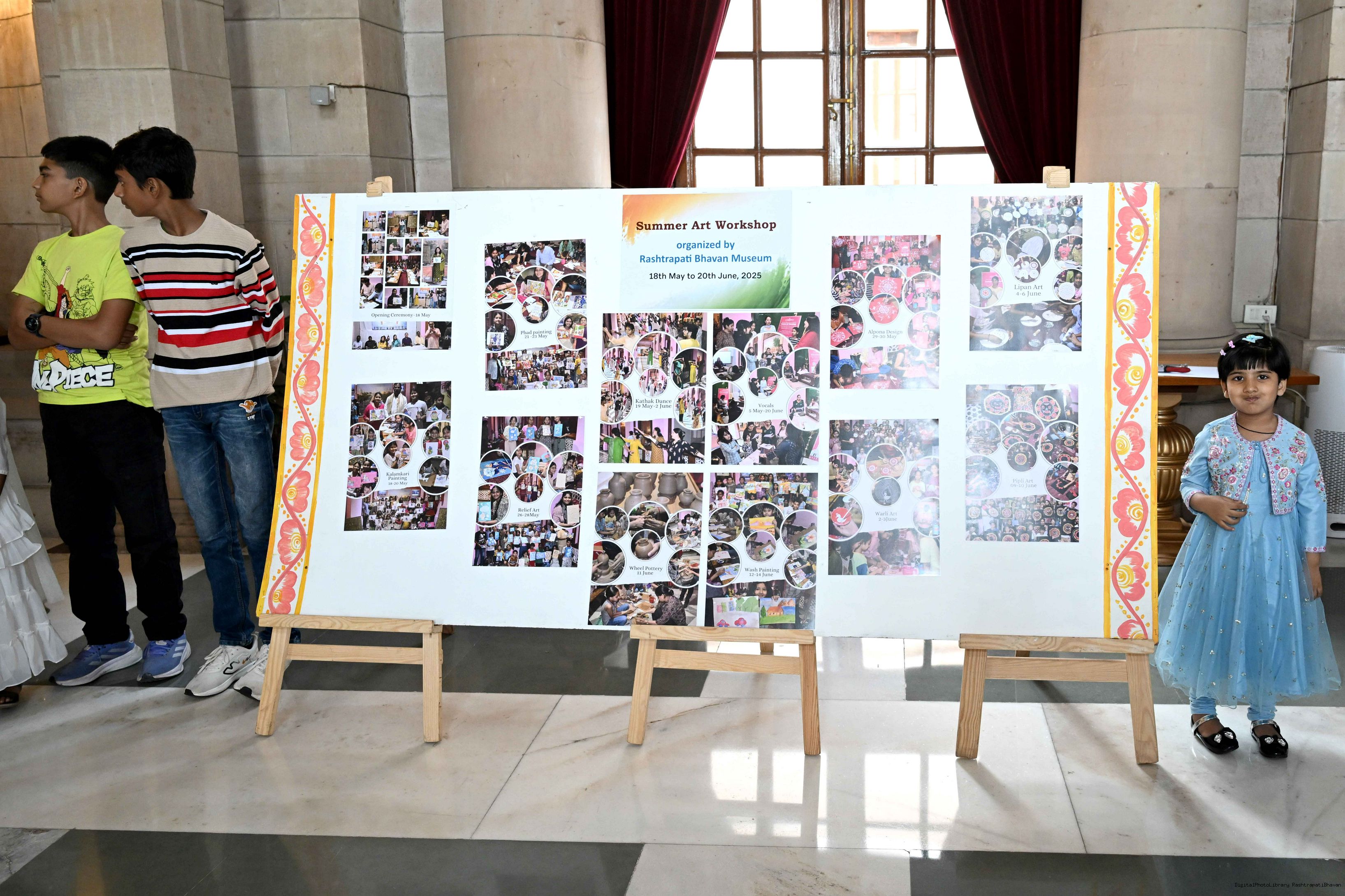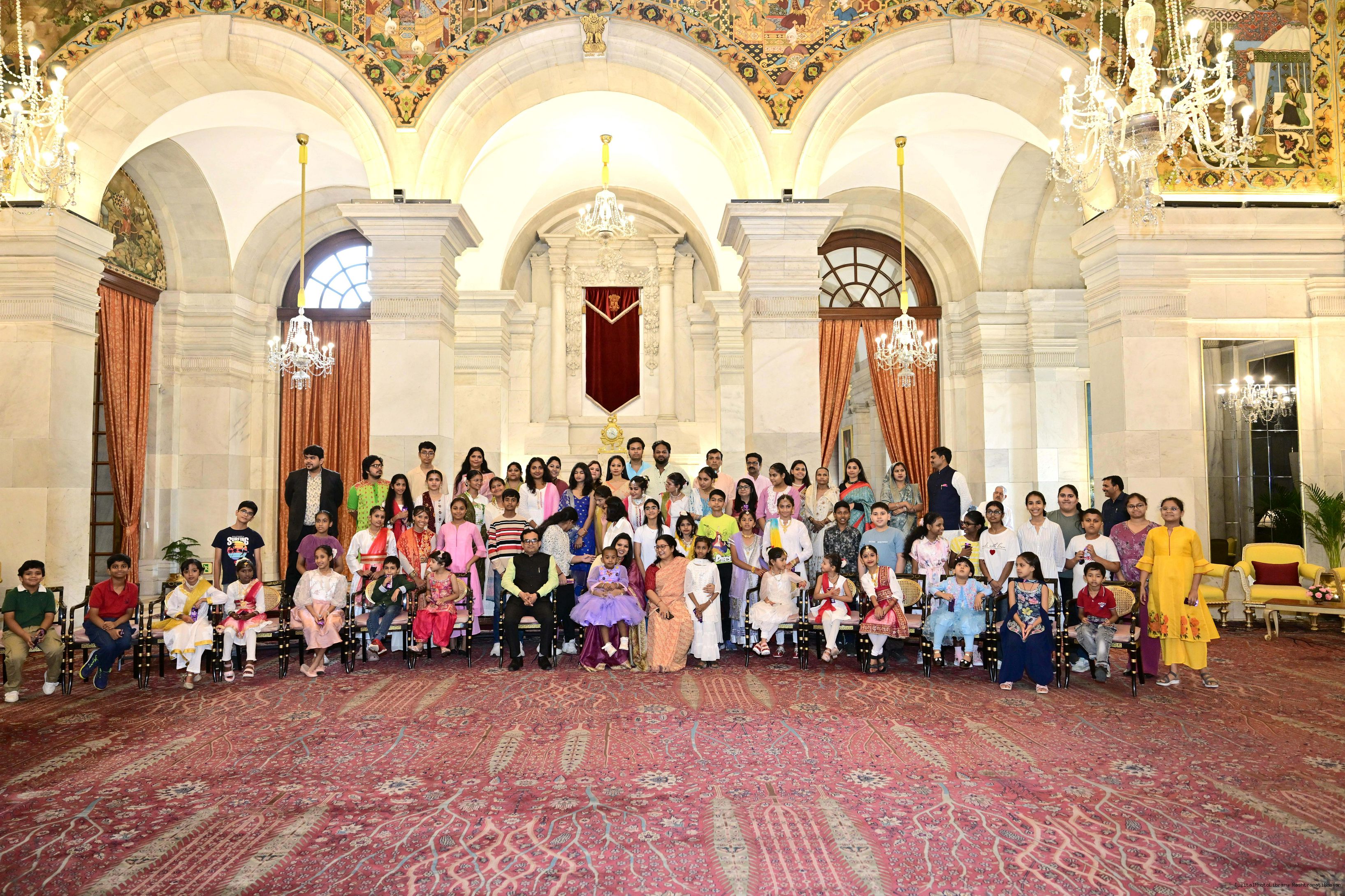 Caption: The President of India, Smt Droupadi Murmu interacted with photo opportunity with around 70 children from the Summer Workshop at President's Estate at Rashtrapati Bhavan on June 27, 2025.