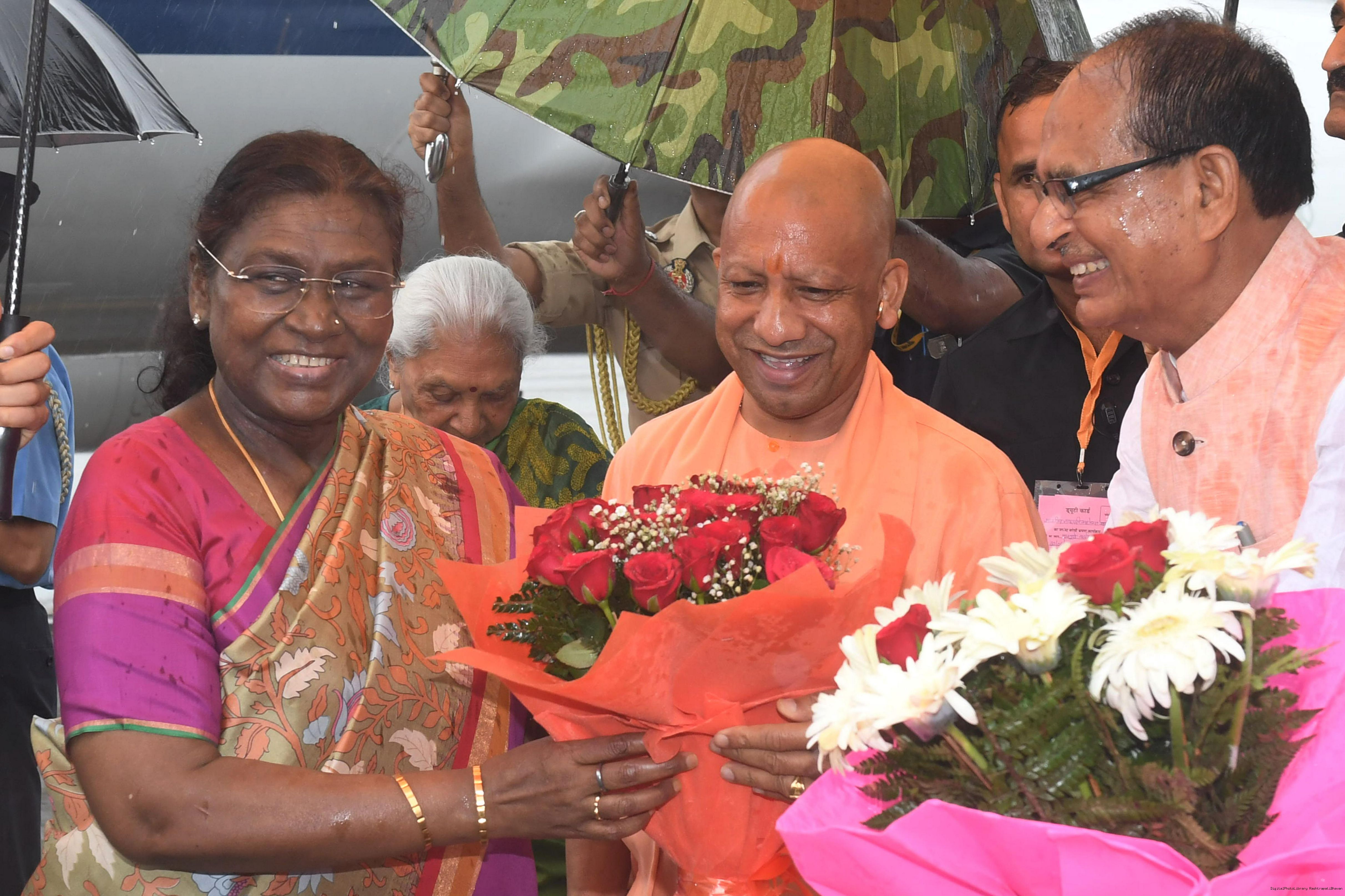 | Caption: | The Governor of Uttar Pradesh, Smt Anandiben Patel, Chief Minister Yogi Adityanath and Union Minister for Agriculture Farmers Welfare and Rural Development, Shri Shivraj Singh Chouhan received the President of India, Smt Droupadi Murmu on her arrival at Bareilly on June 30, 2025. |