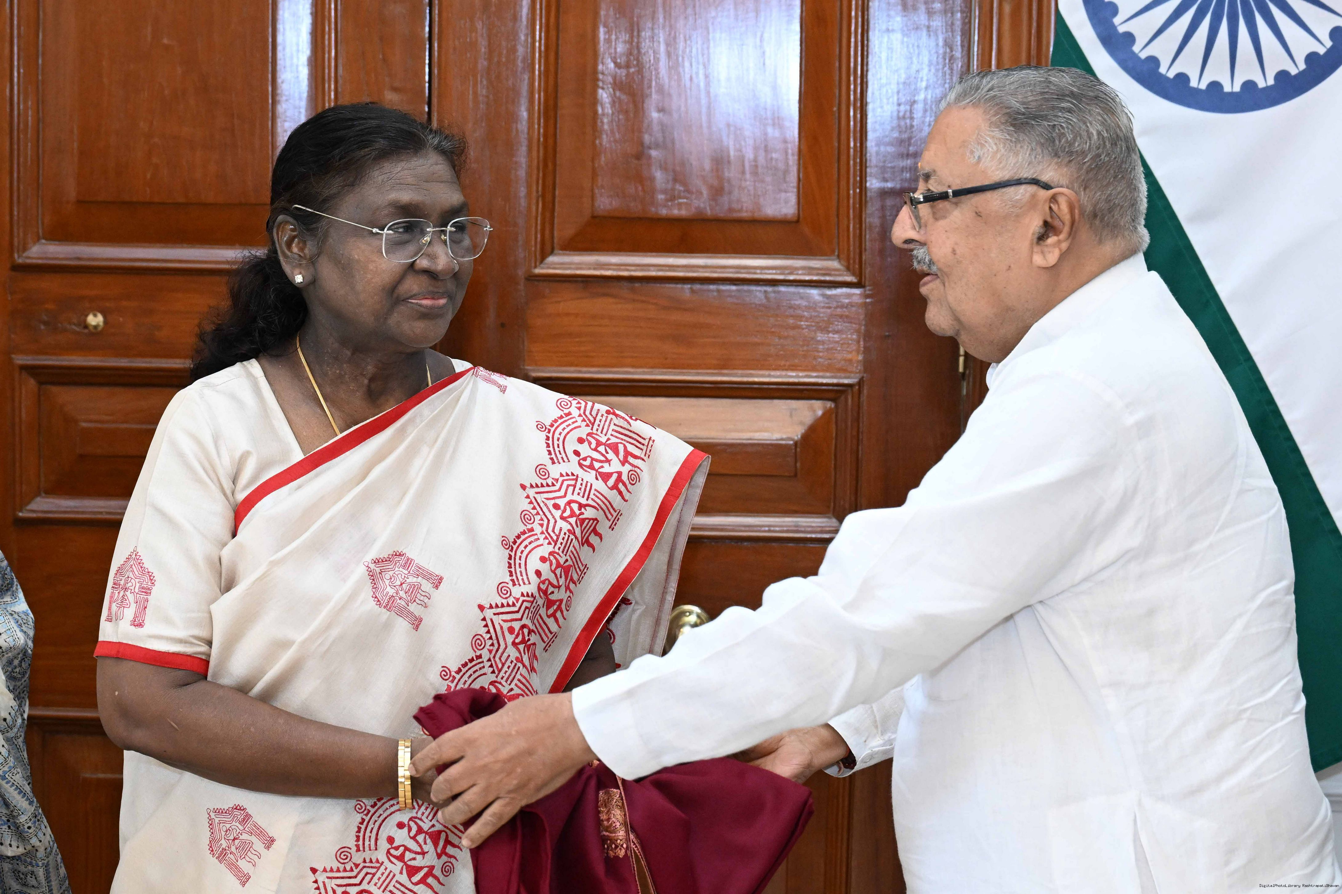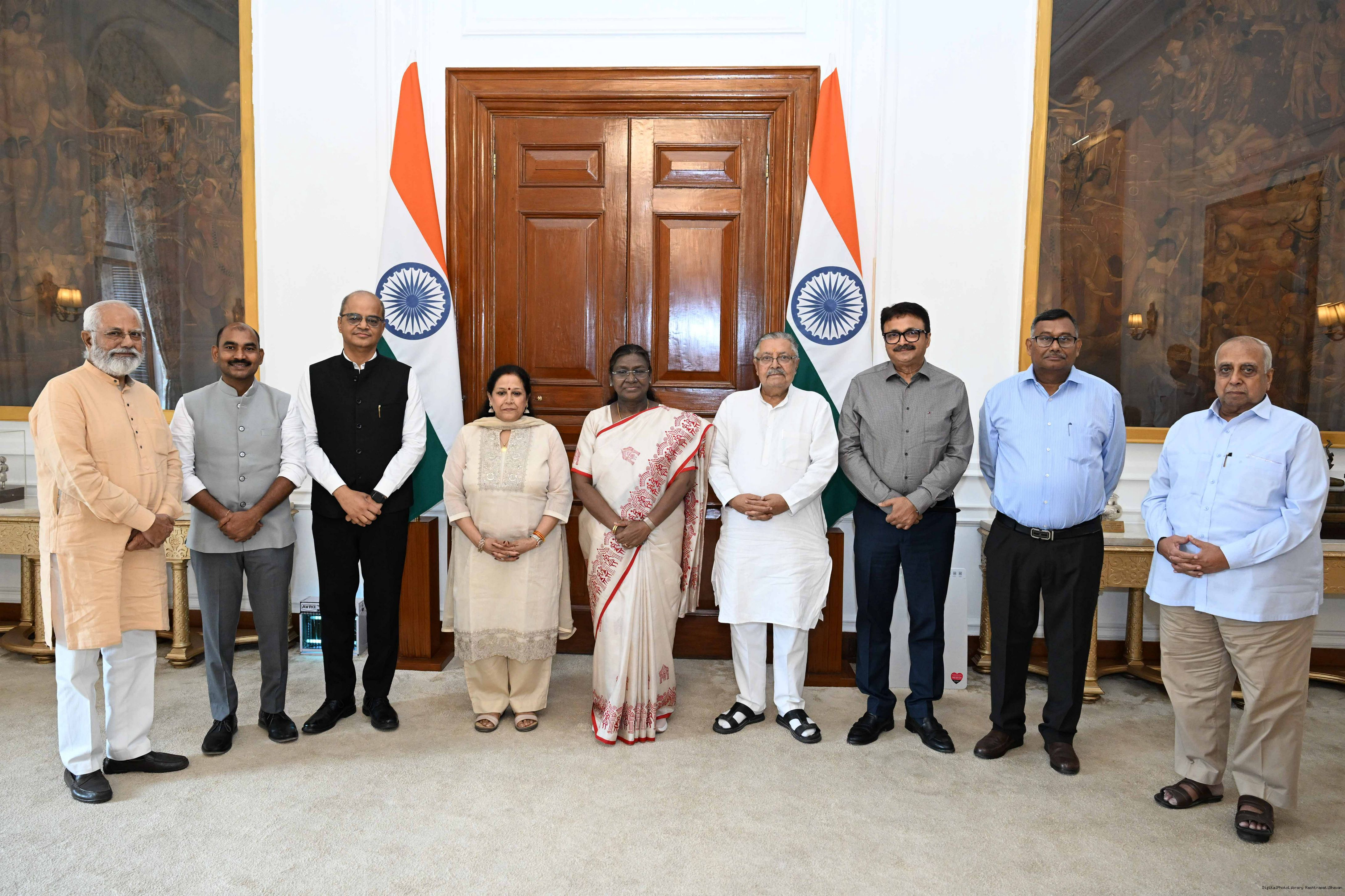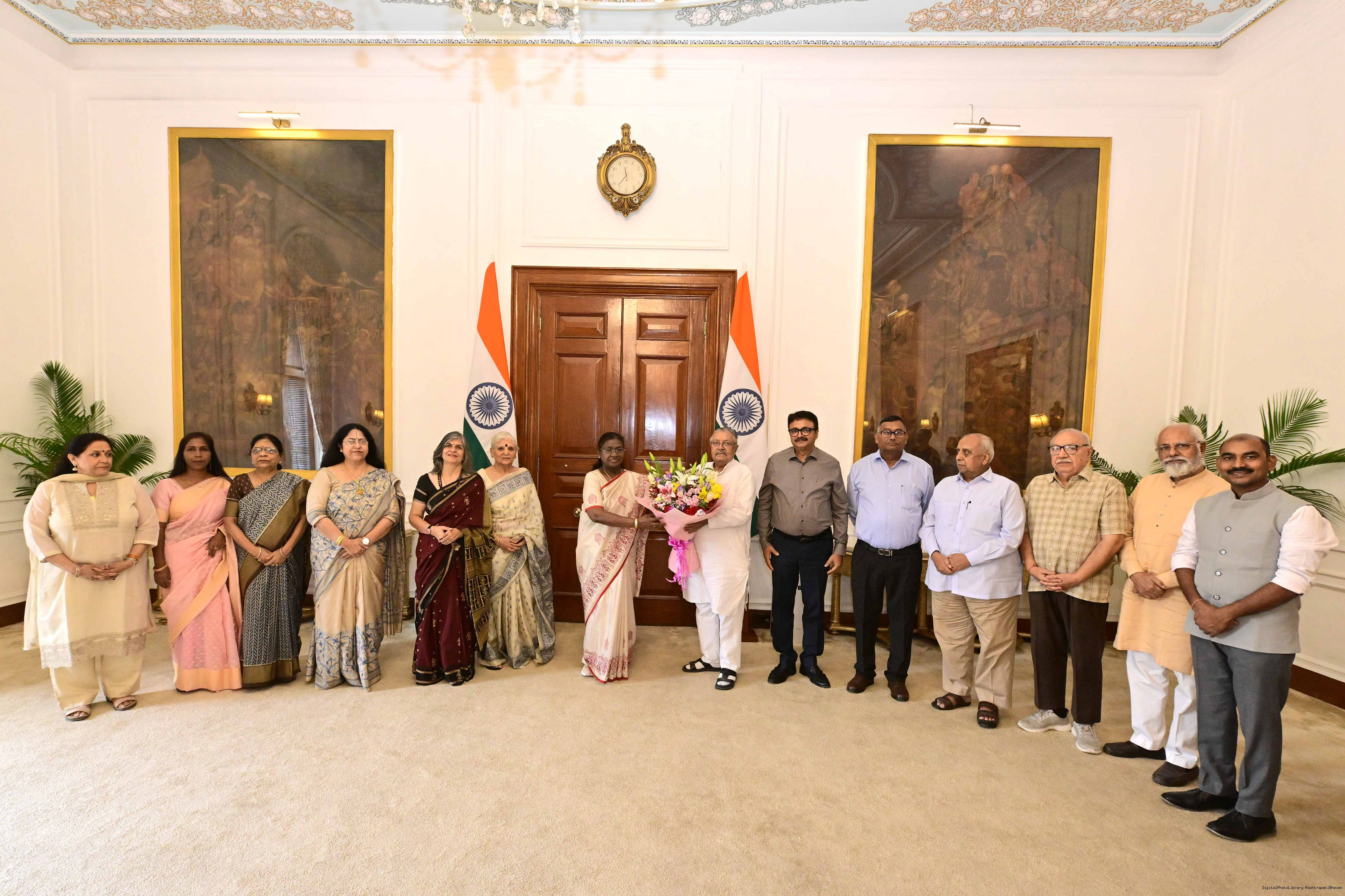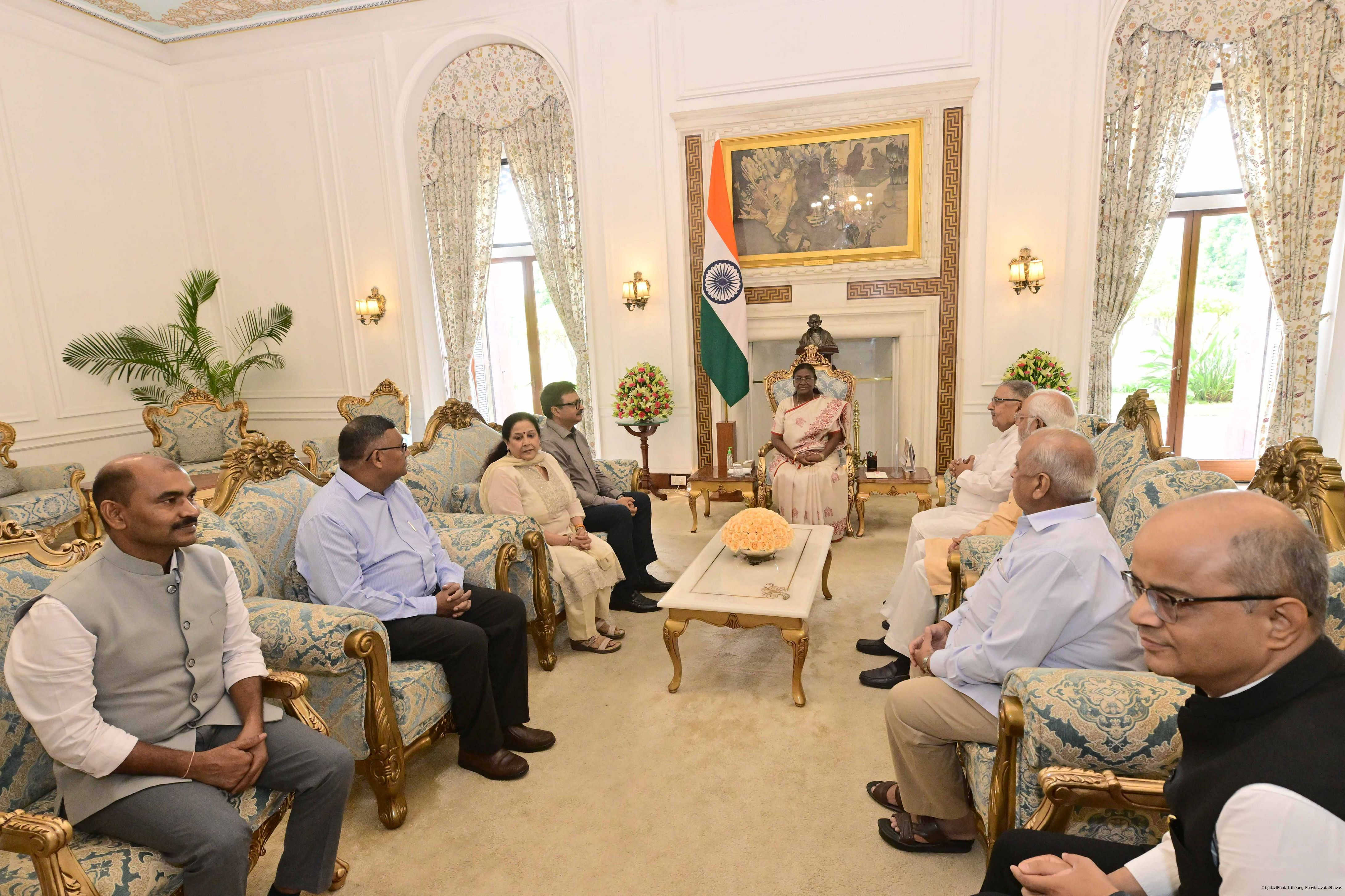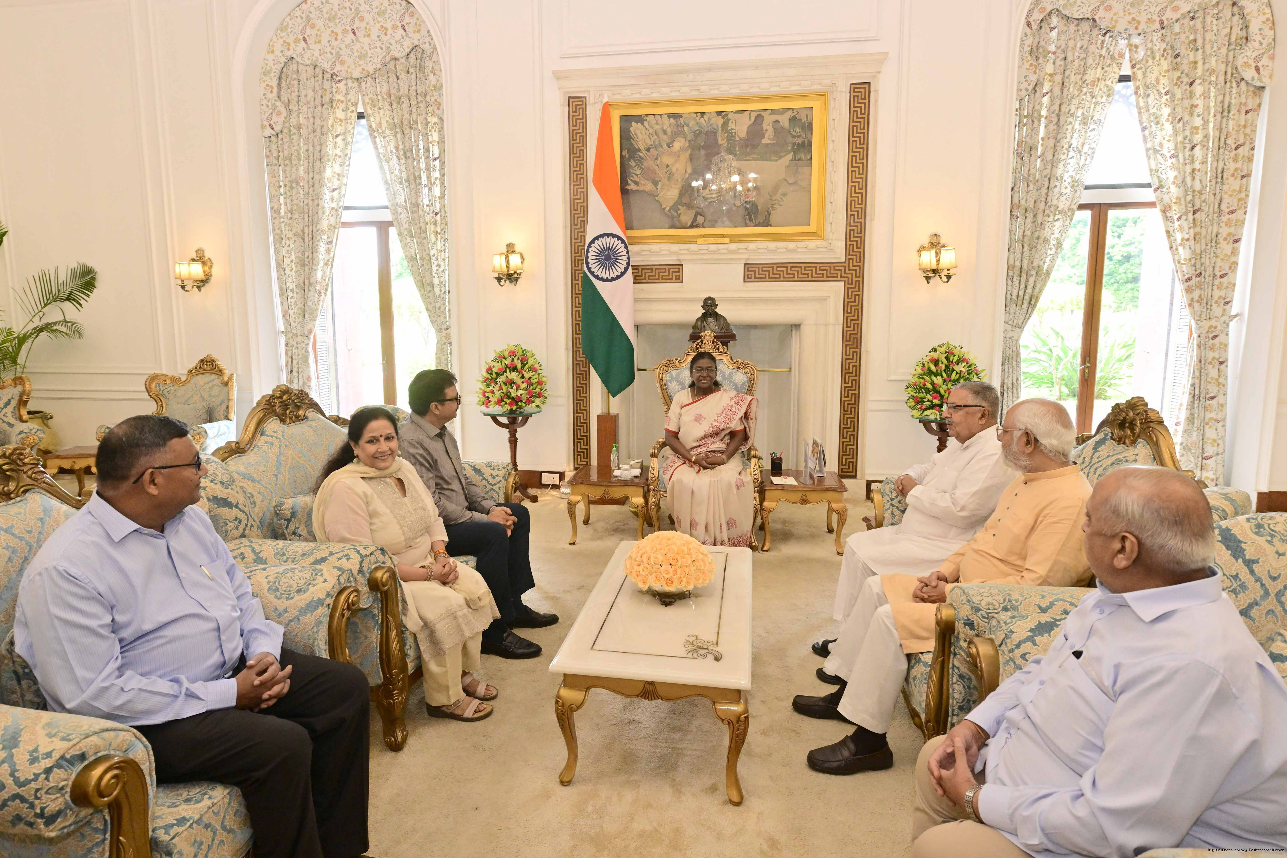 | Caption: | Shri Santosh Kumar Taneja, President Samkalp Foundation Trust Delhi Along wtih Smt. Promil Taneja and others meeting with the President of India, Smt Droupadi Murmu at Rashtrapati Bhavan on July 3, 2025. |