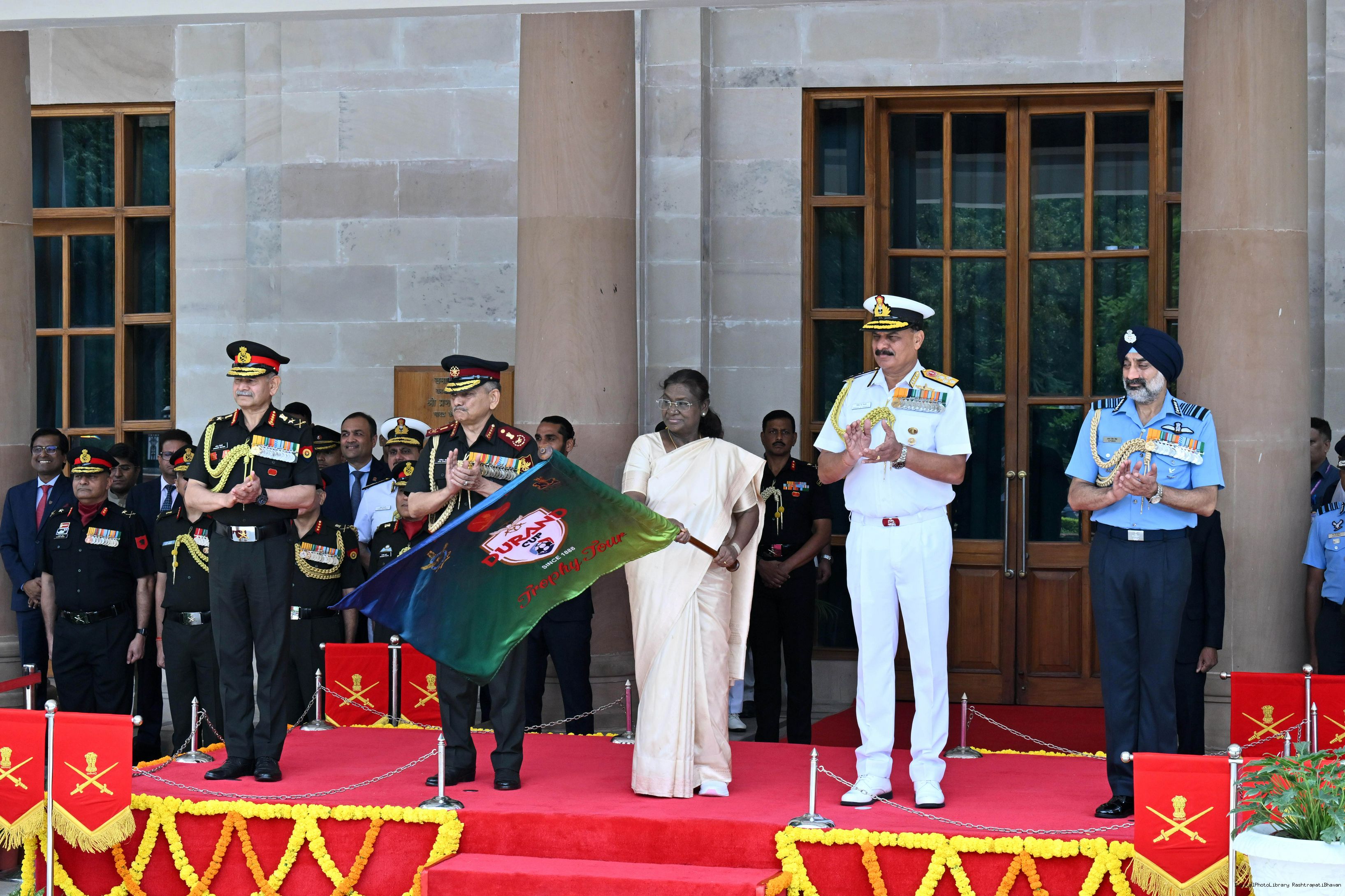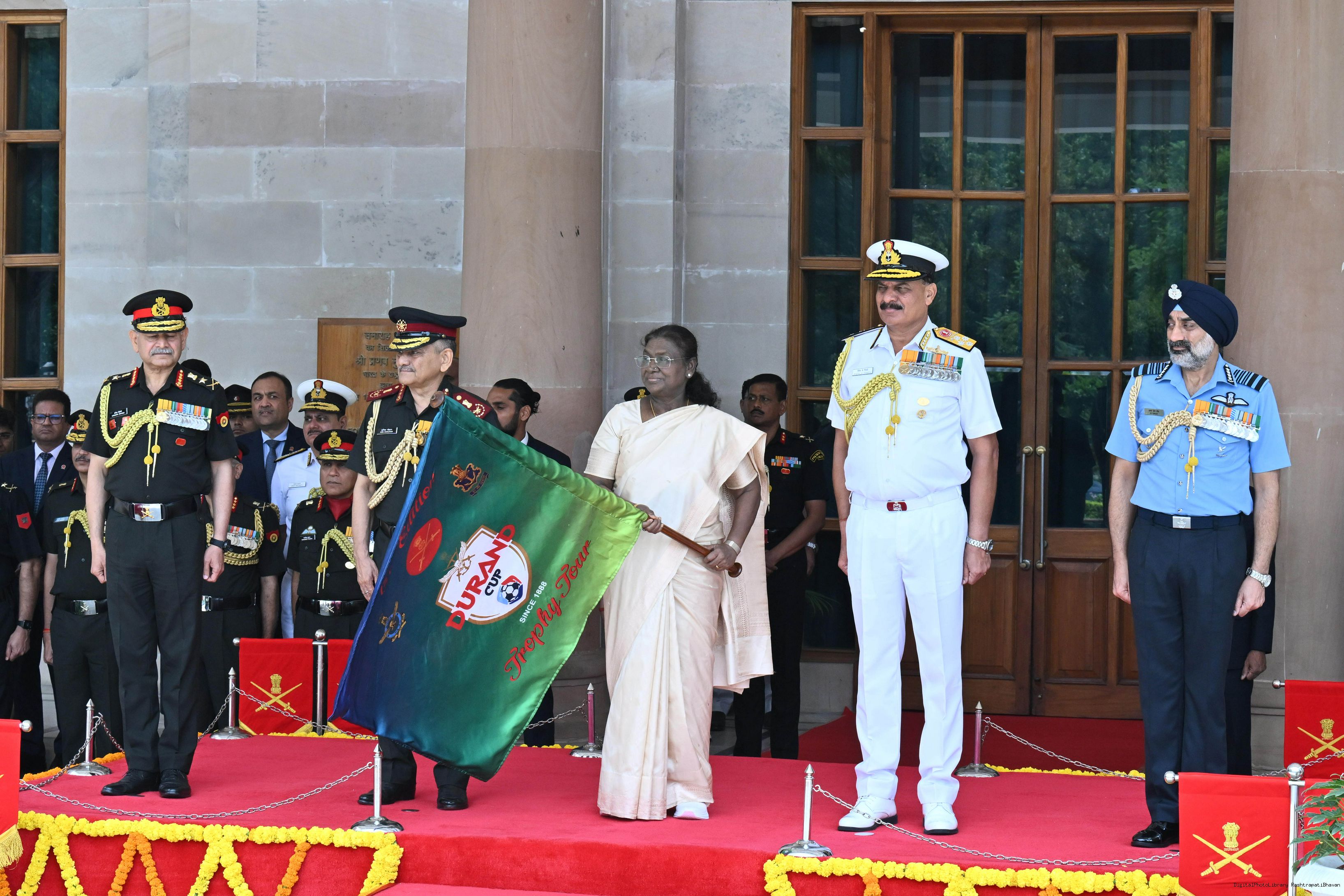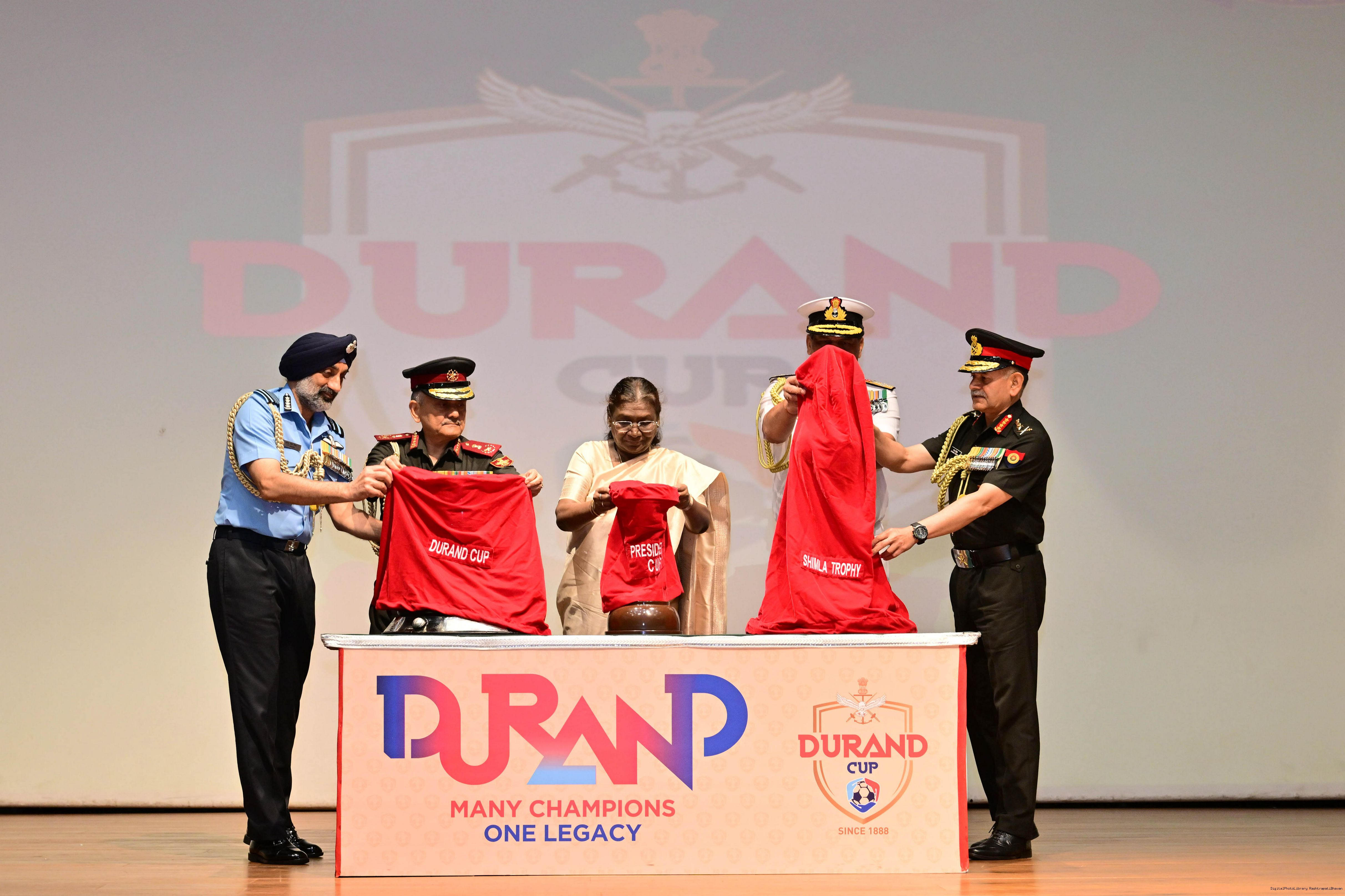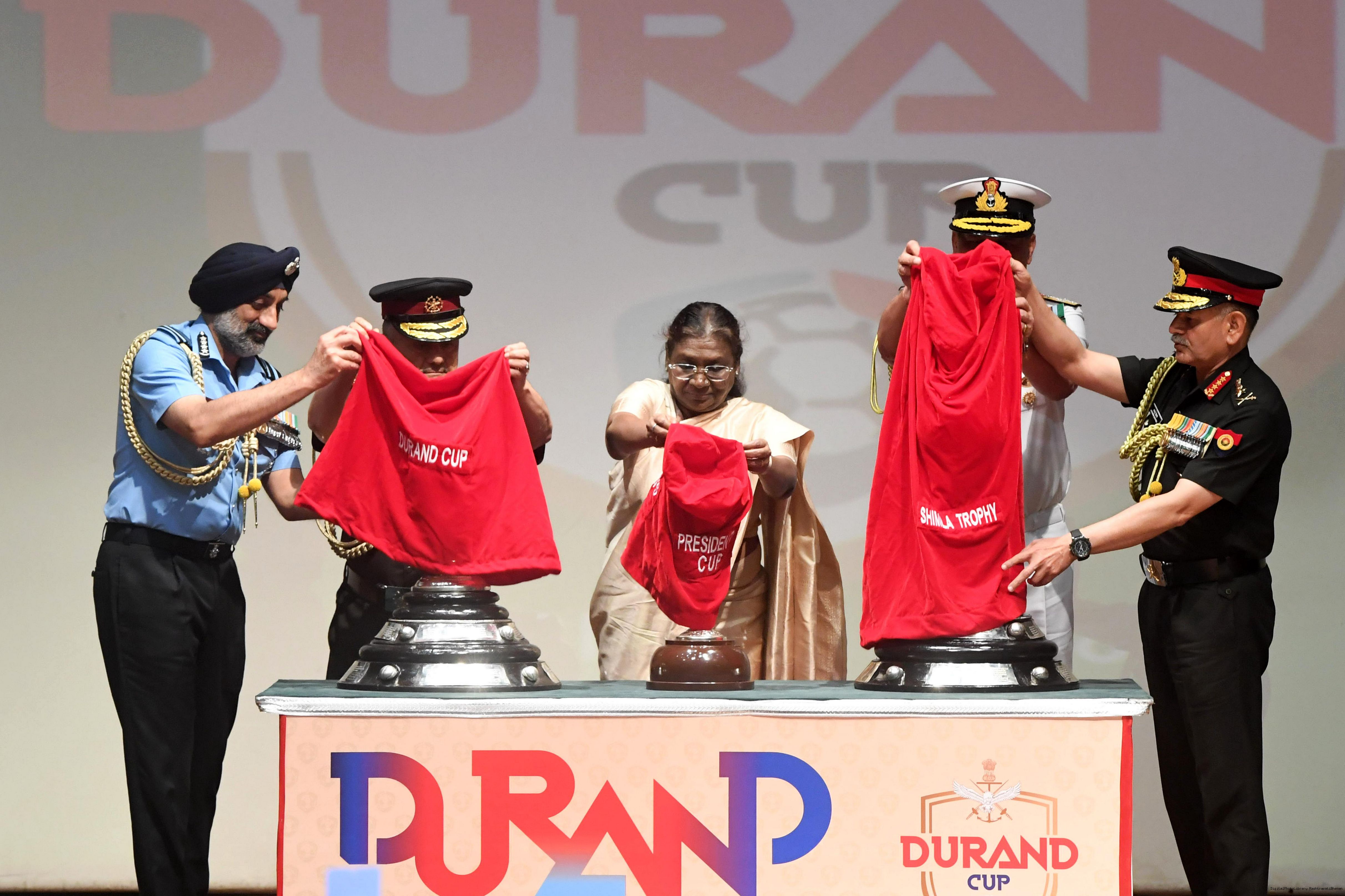 | Caption: | The President of India, Smt Droupadi Murmu unveiled and flagged off the Trophies of the Durand Cup Tournament 2025 at a function held at Rashtrapati Bhavan Cultural Centre on July 4, 2025. |