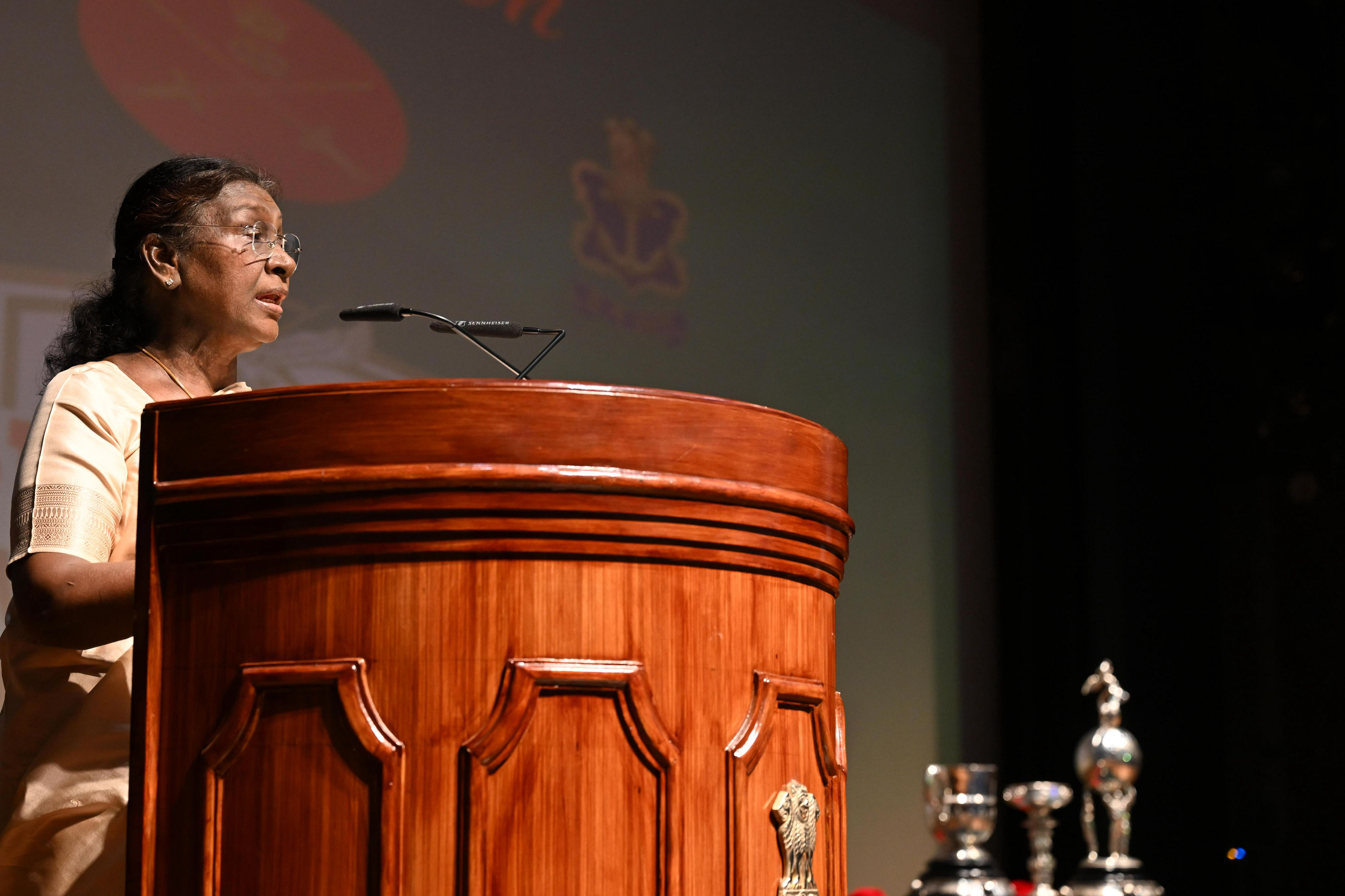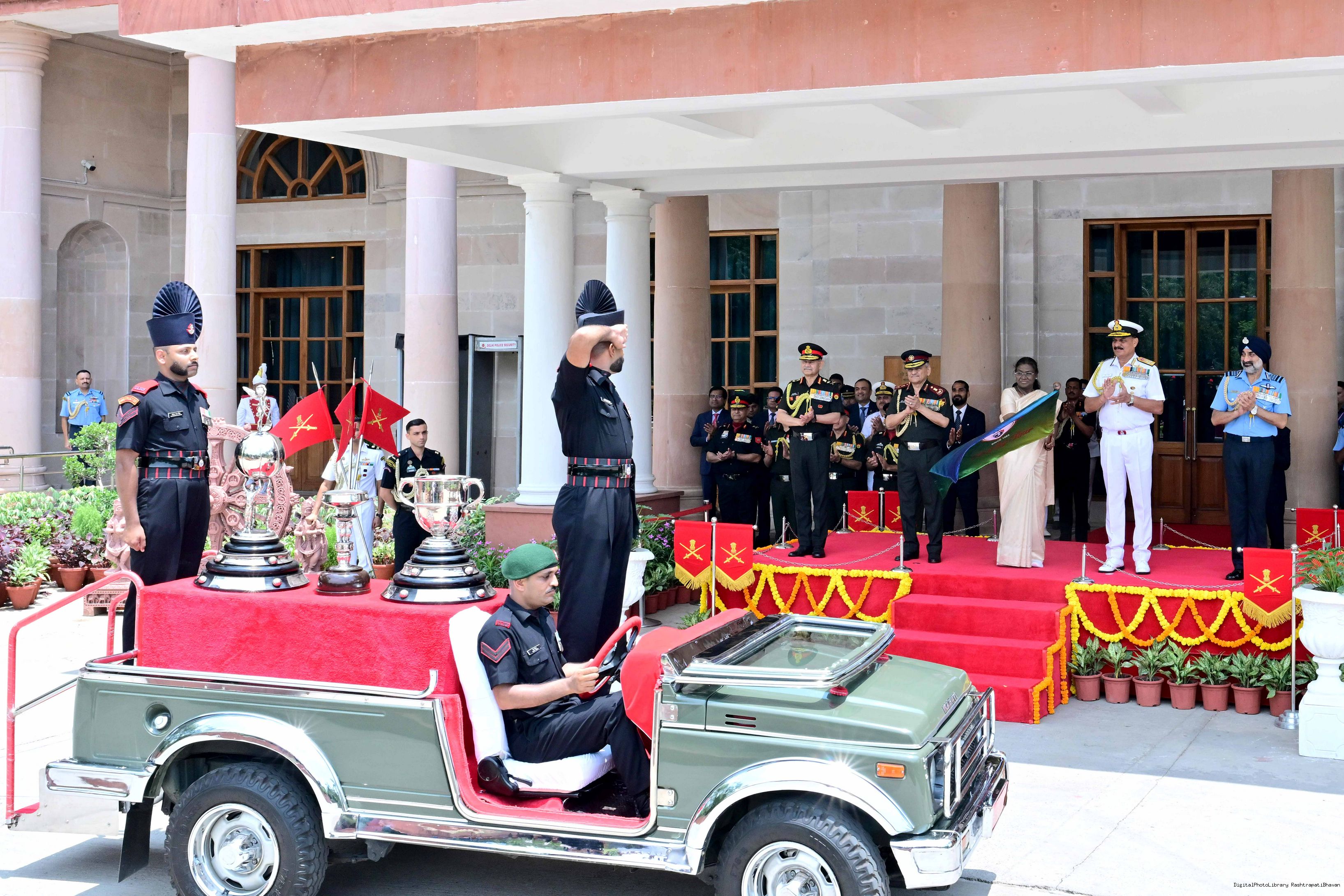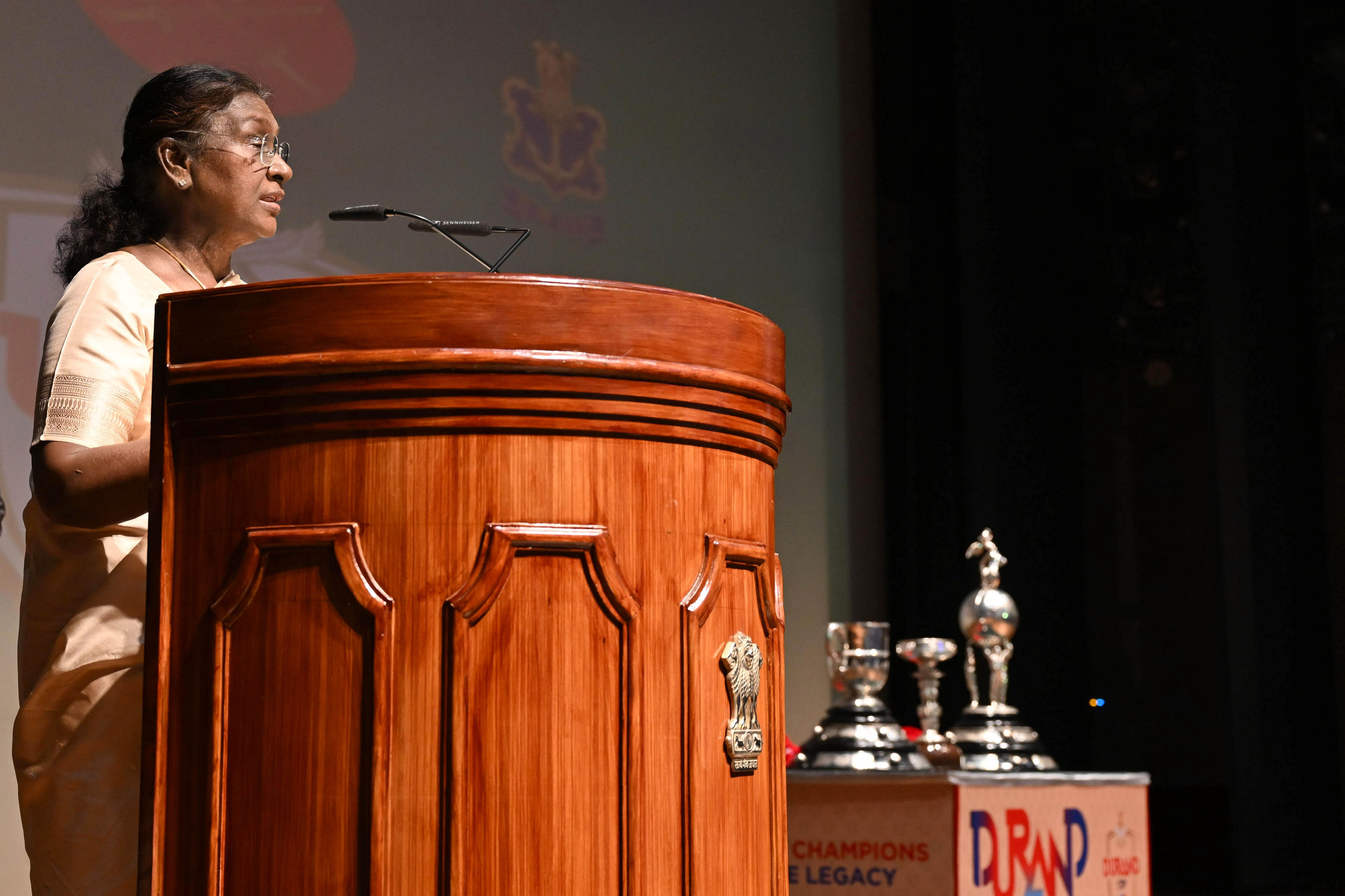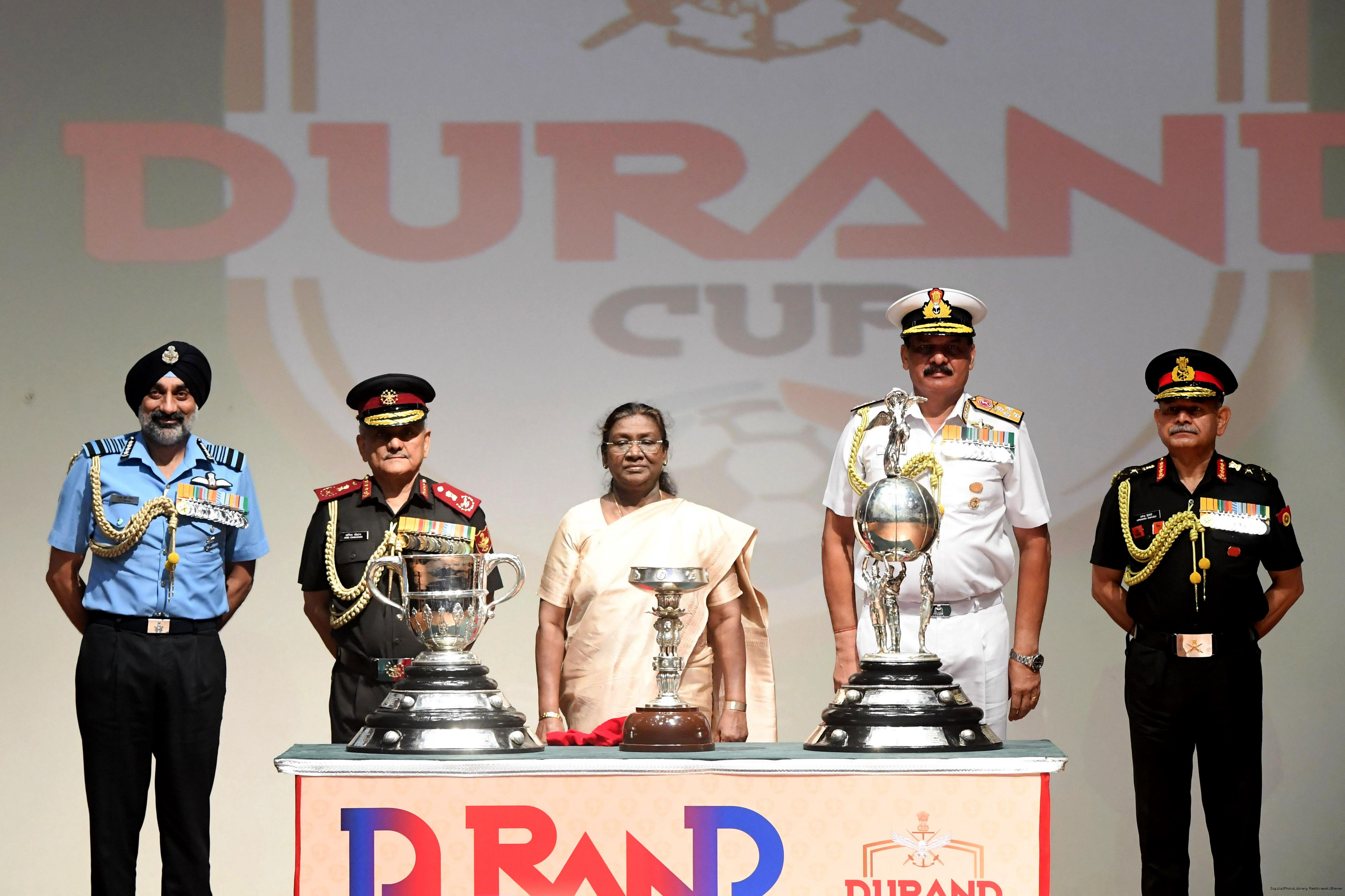 | Caption: | The President of India, Smt Droupadi Murmu unveiled and flagged off the Trophies of the Durand Cup Tournament 2025 at a function held at Rashtrapati Bhavan Cultural Centre on July 4, 2025. |