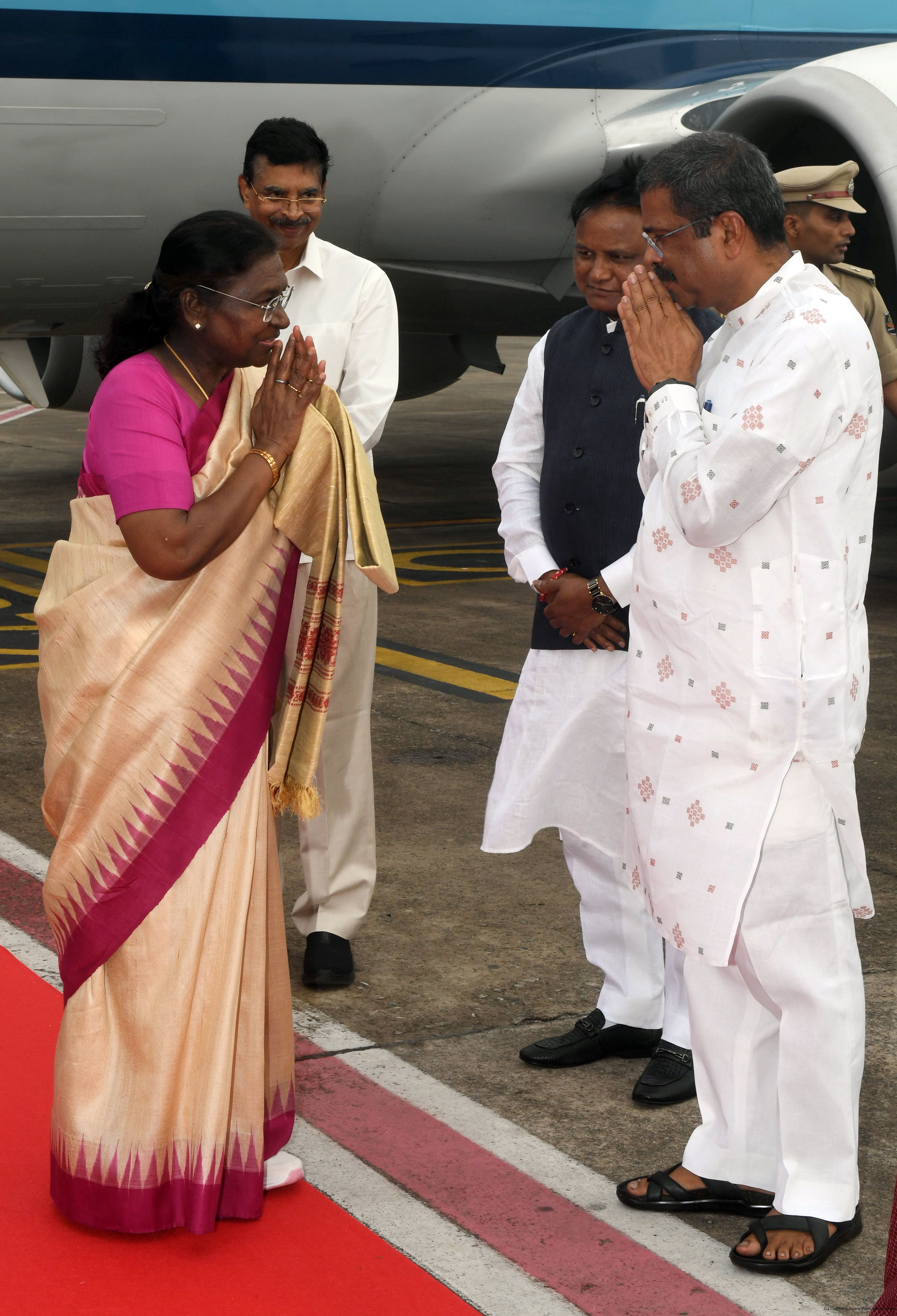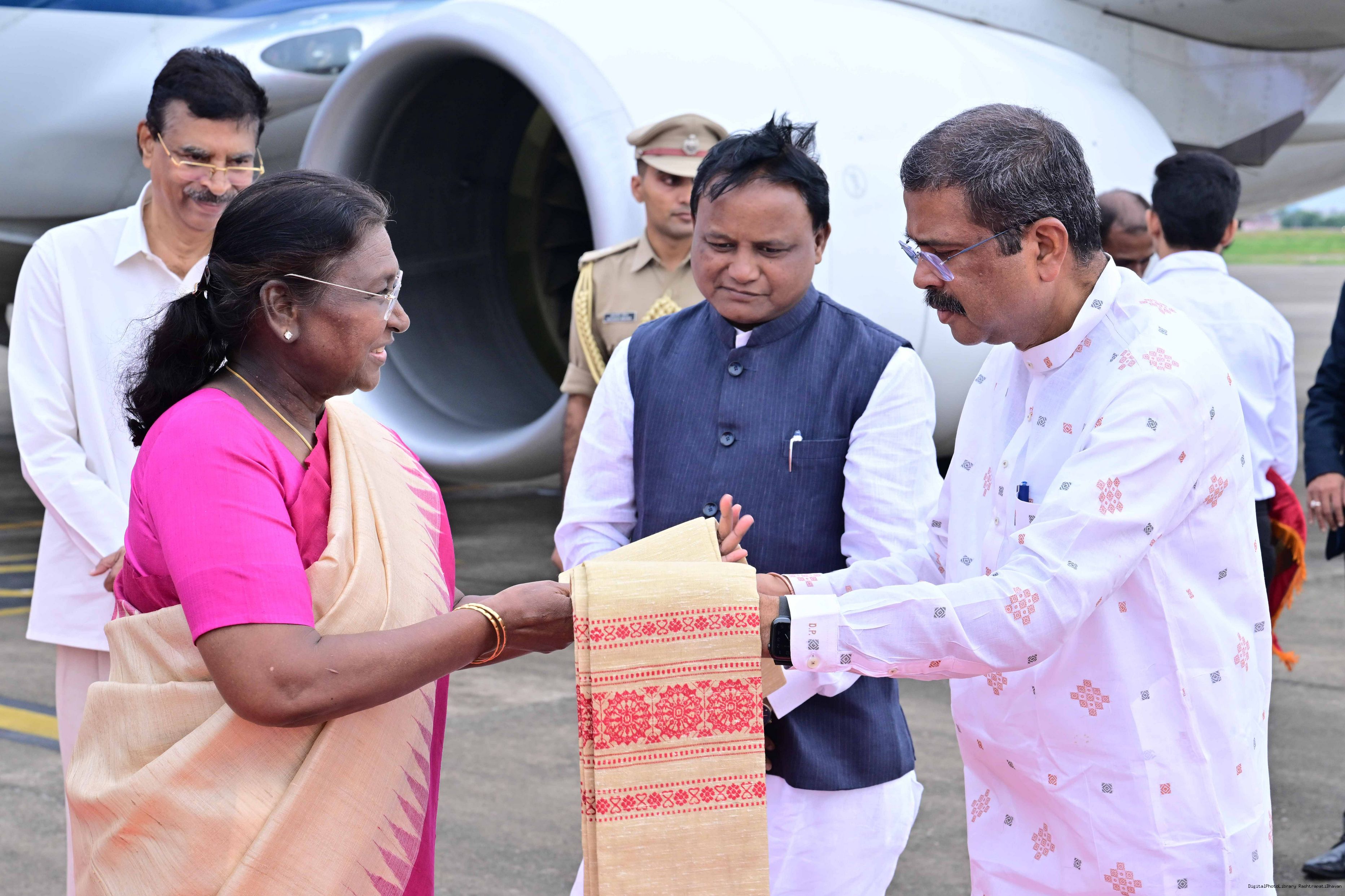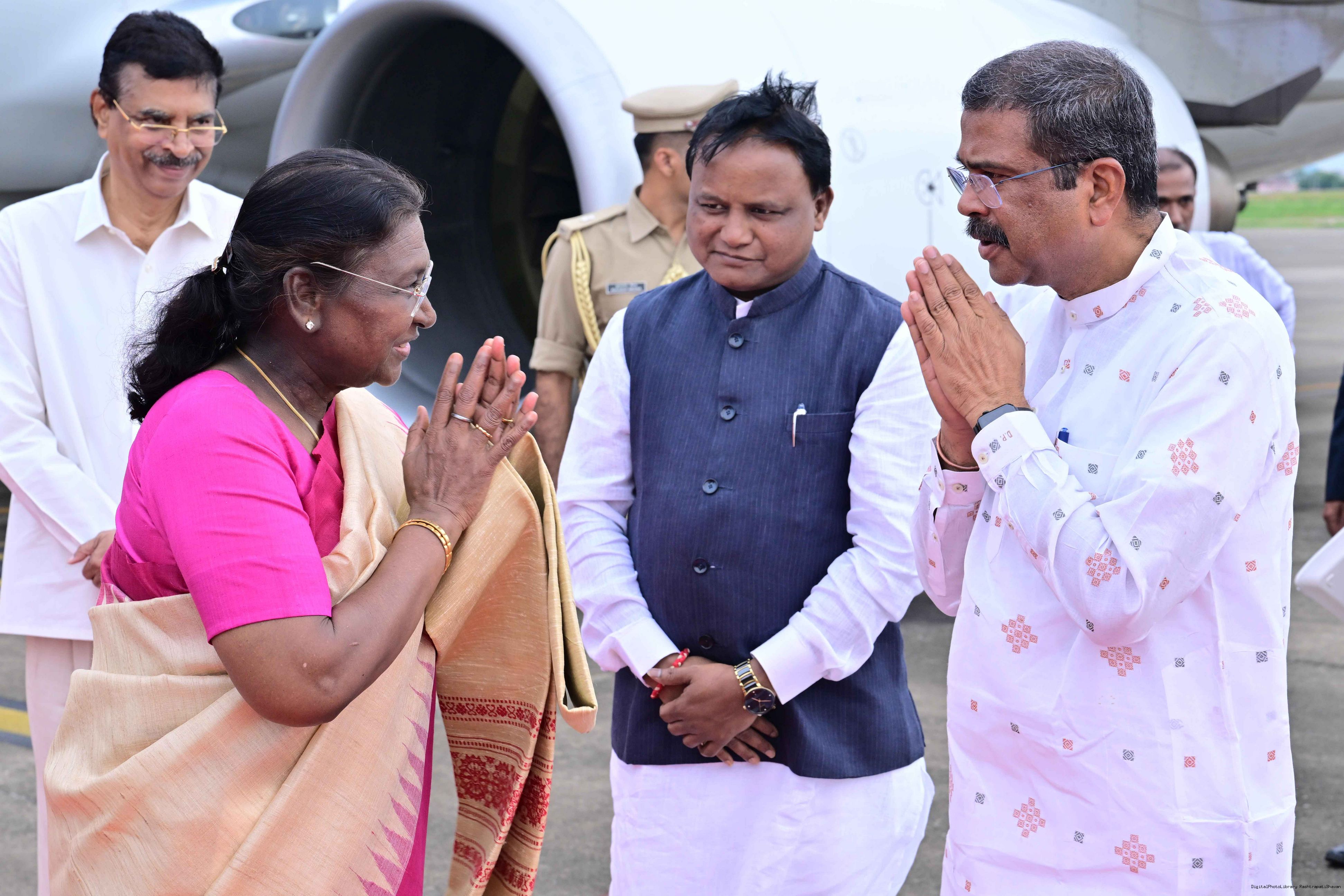 | Caption: | The Governor of Odisha, Dr Hari Babu Kambhampati, Chief Minister Shri Mohan Charan Majhi and Union Education Minister Shri Dharmendra Pradhan received the President of India, Smt Droupadi Murmu on her arrival in Bhubaneswar on July 14,2025. |