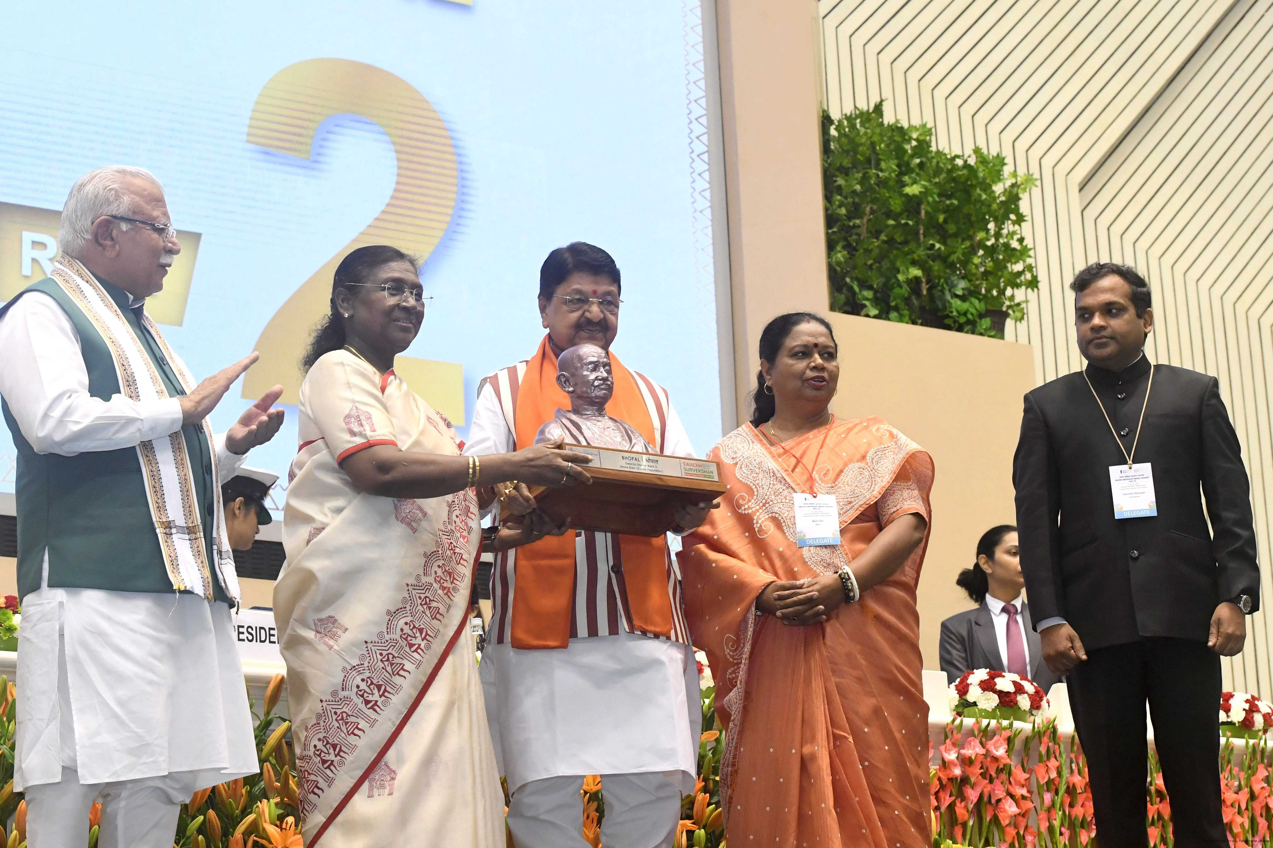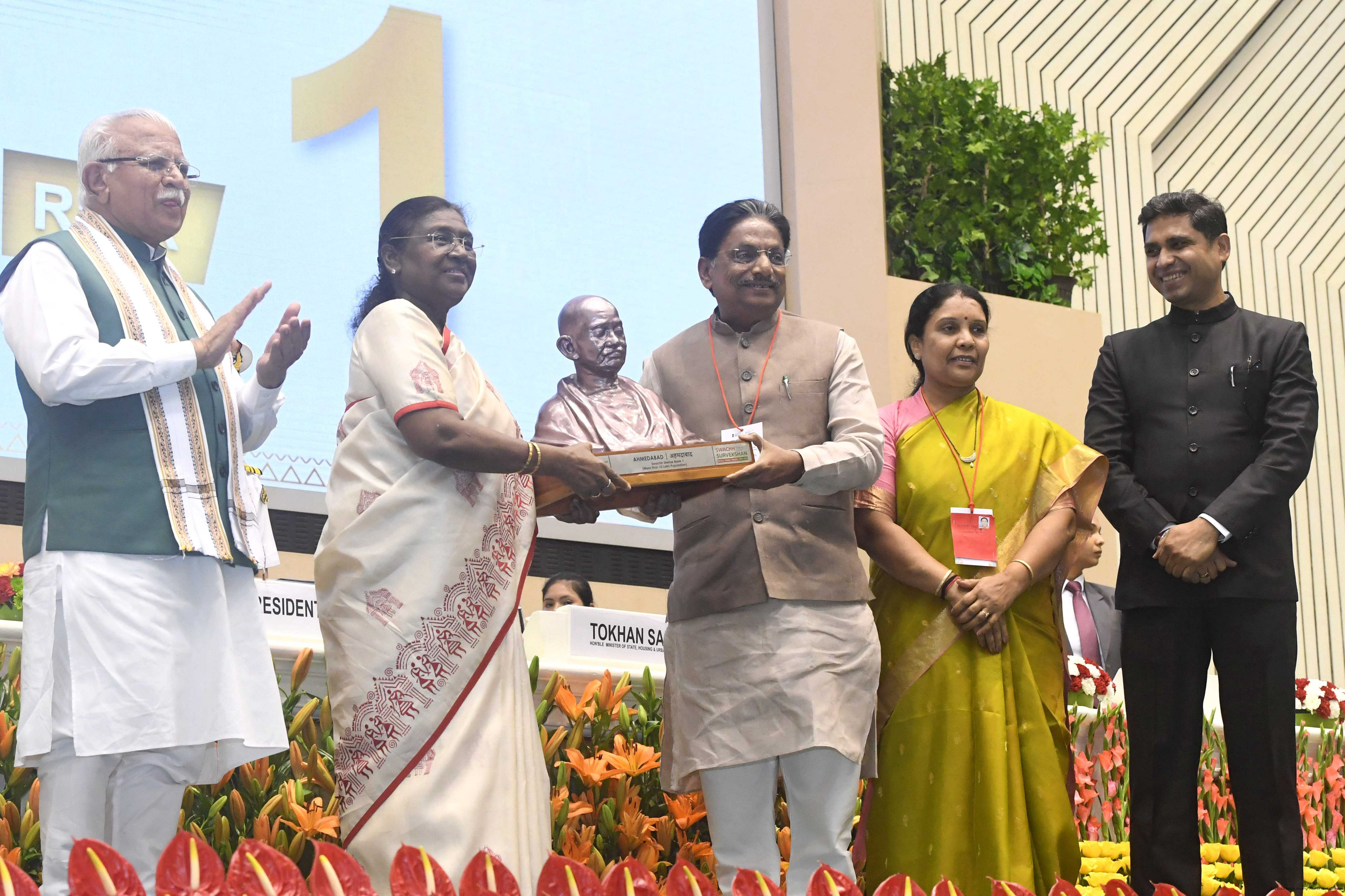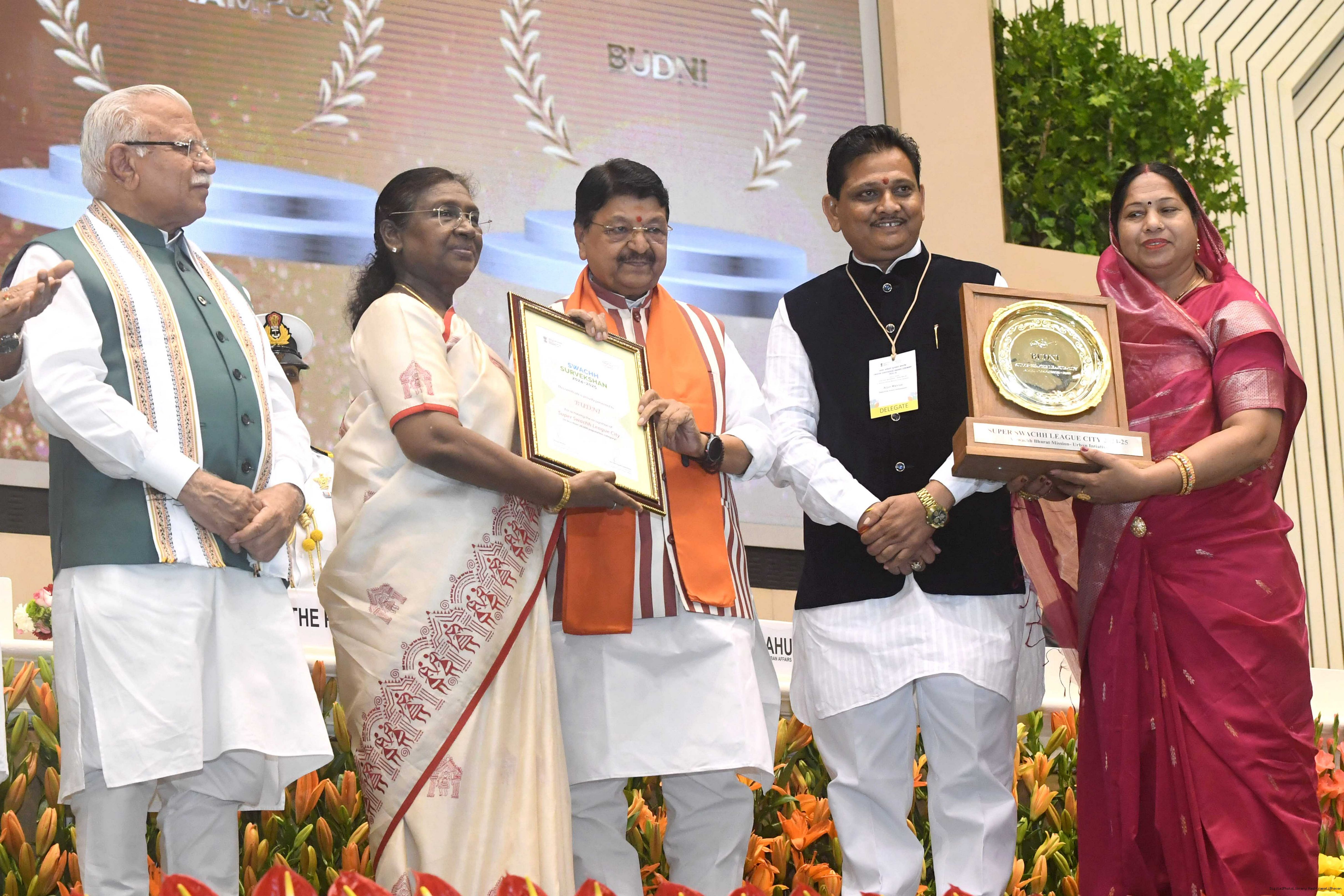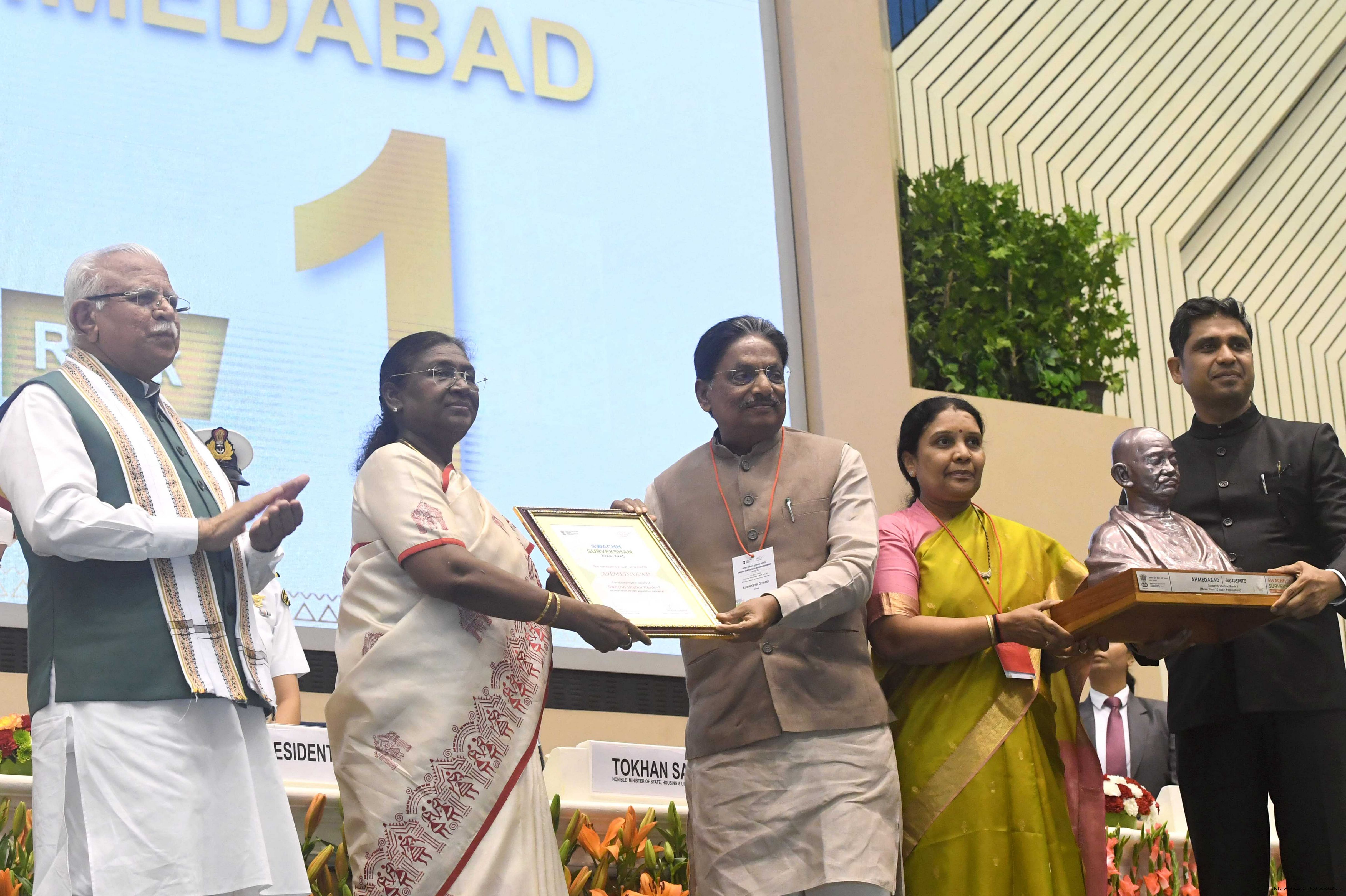 Caption: The President of India, Smt Droupadi Murmu, presented Swachh Survekshan awards at a function organized by the Ministry of Housing and Urban Affairs in New Delhi on July 17, 2025.