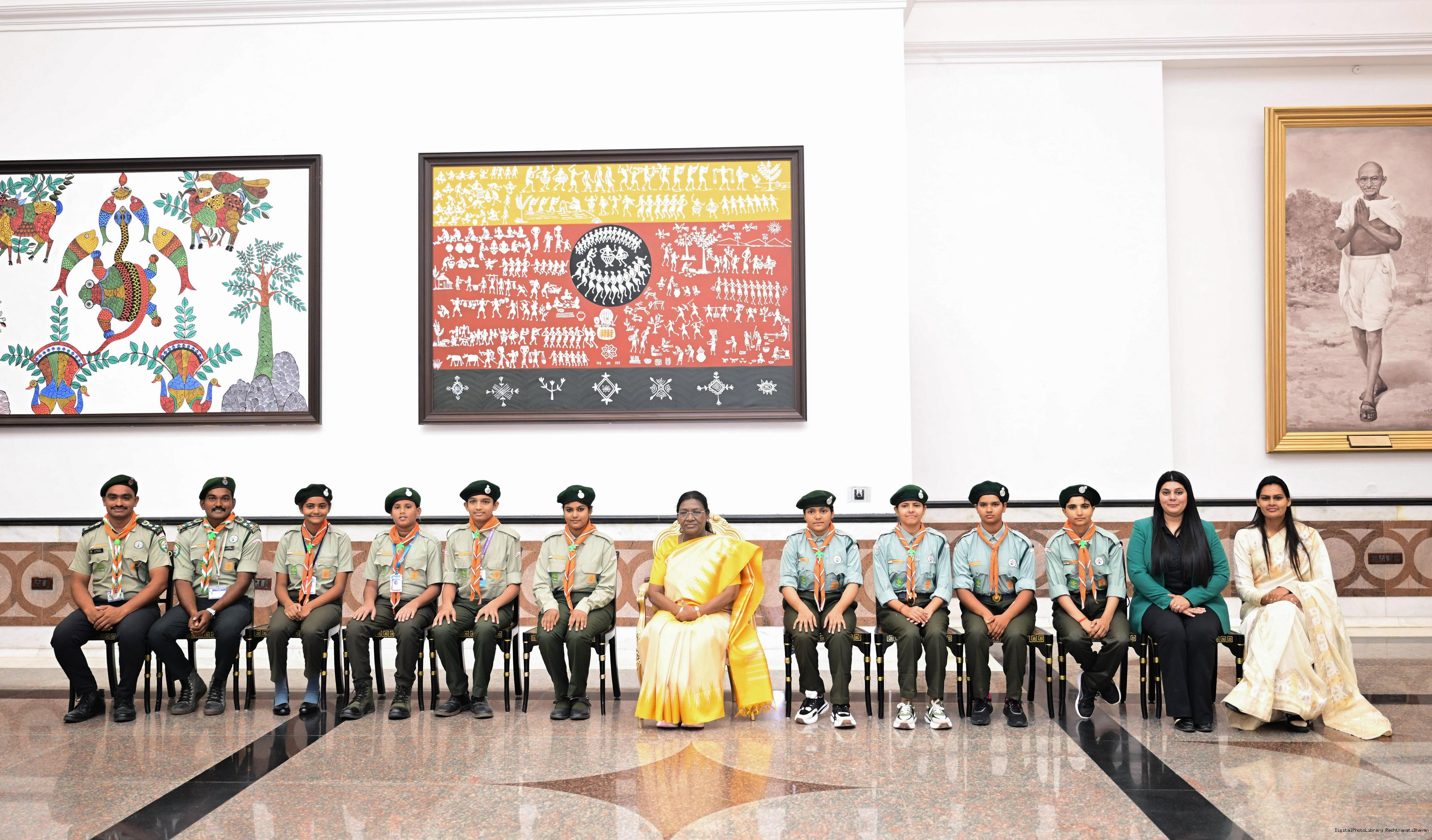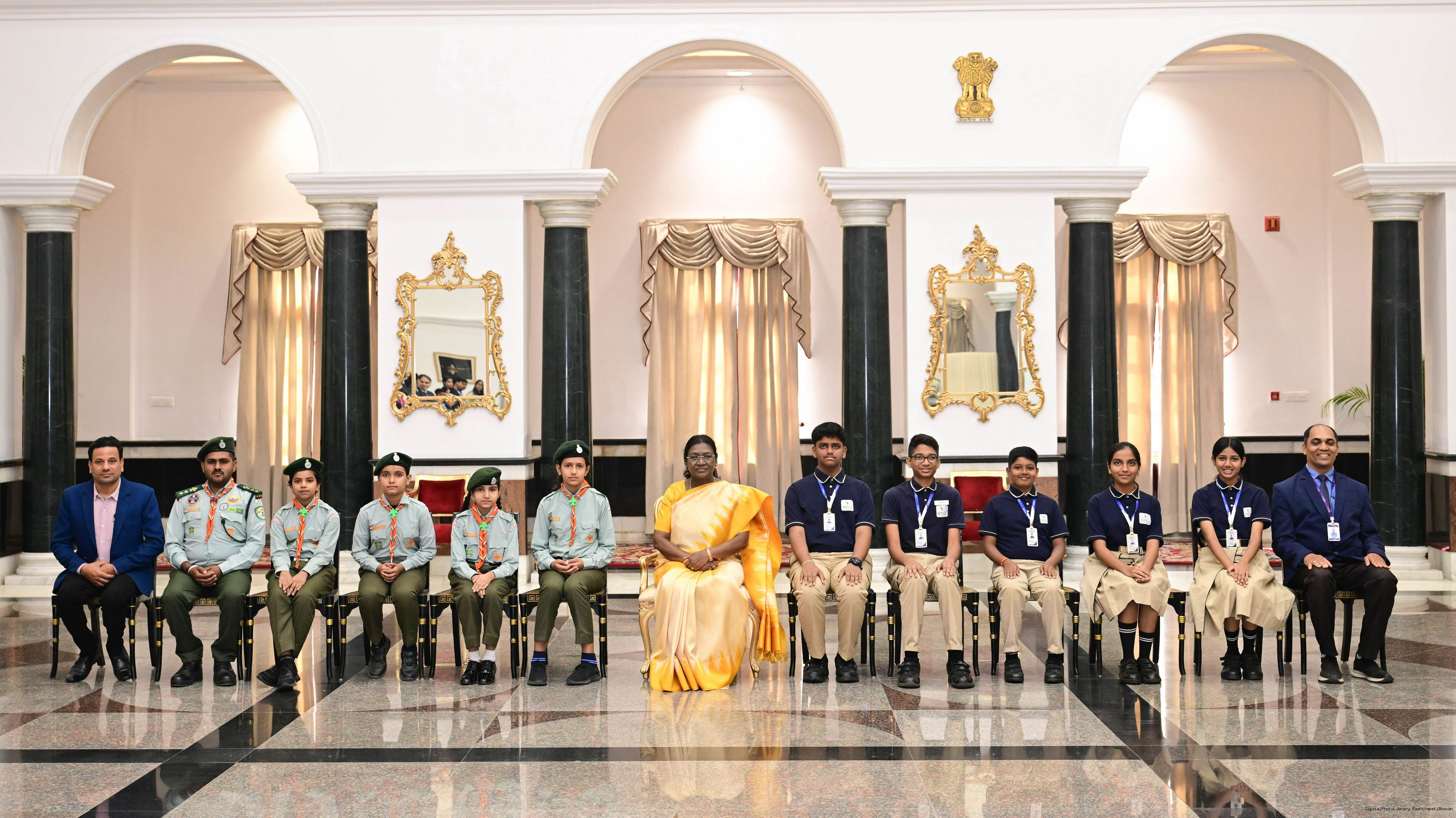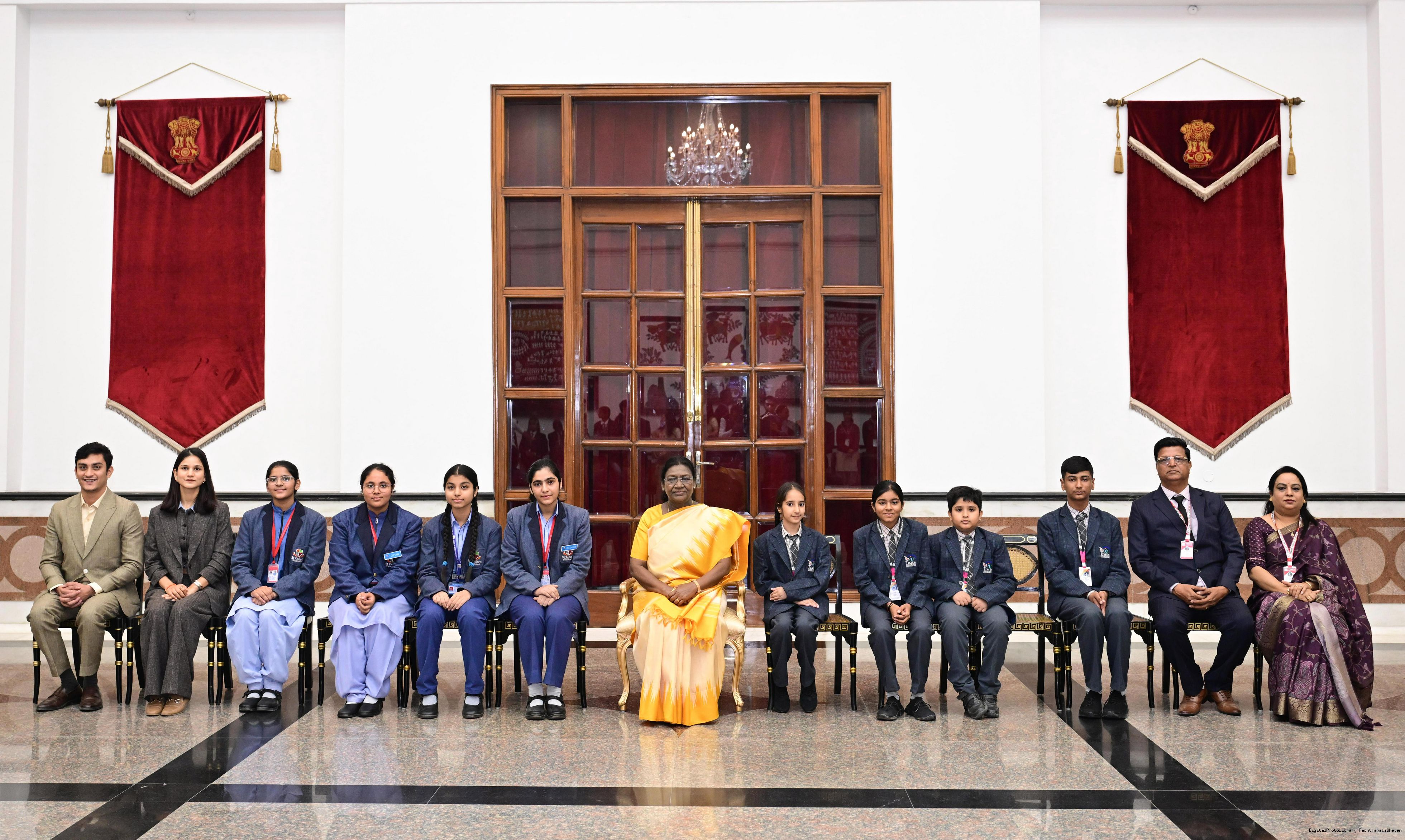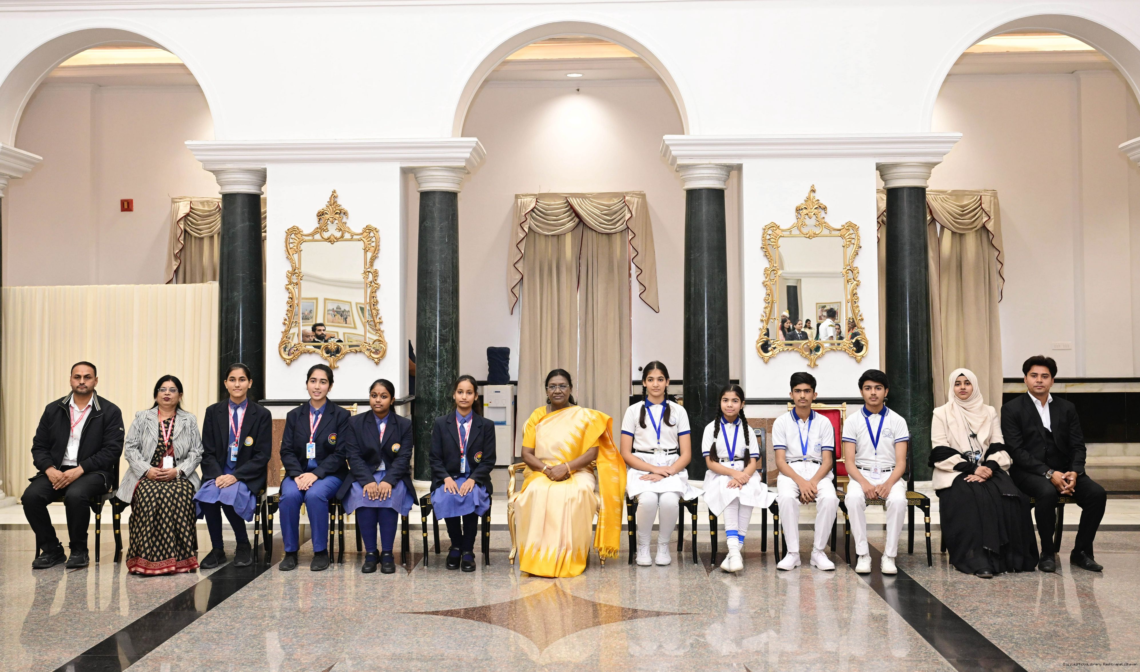 Caption: On the occasion of Children's Day, The President of India, Smt Droupadi Murmu interacted with children from various schools and organisations at Rashtrapati Bhavan Cultural Centre on November 14, 2025.