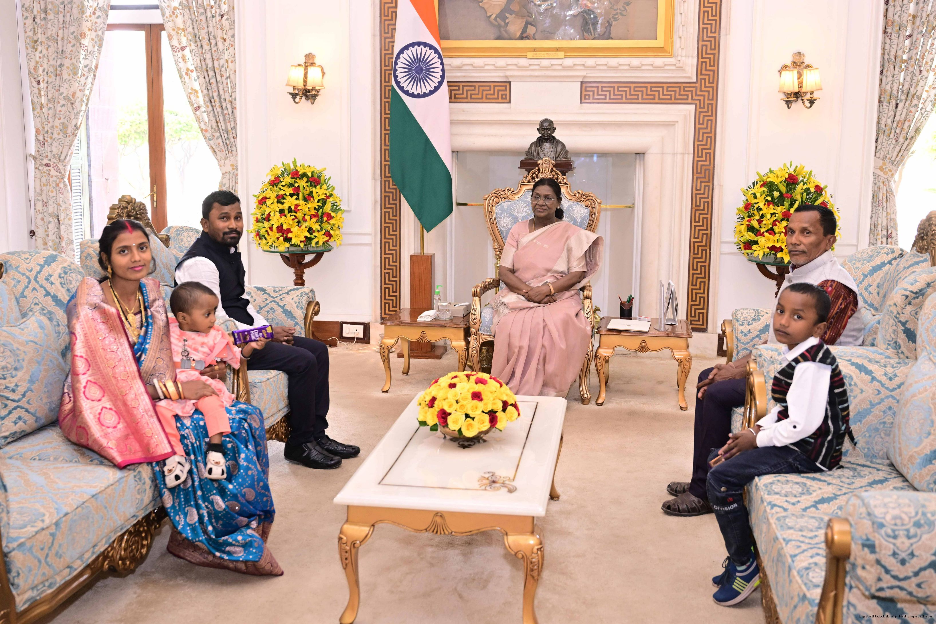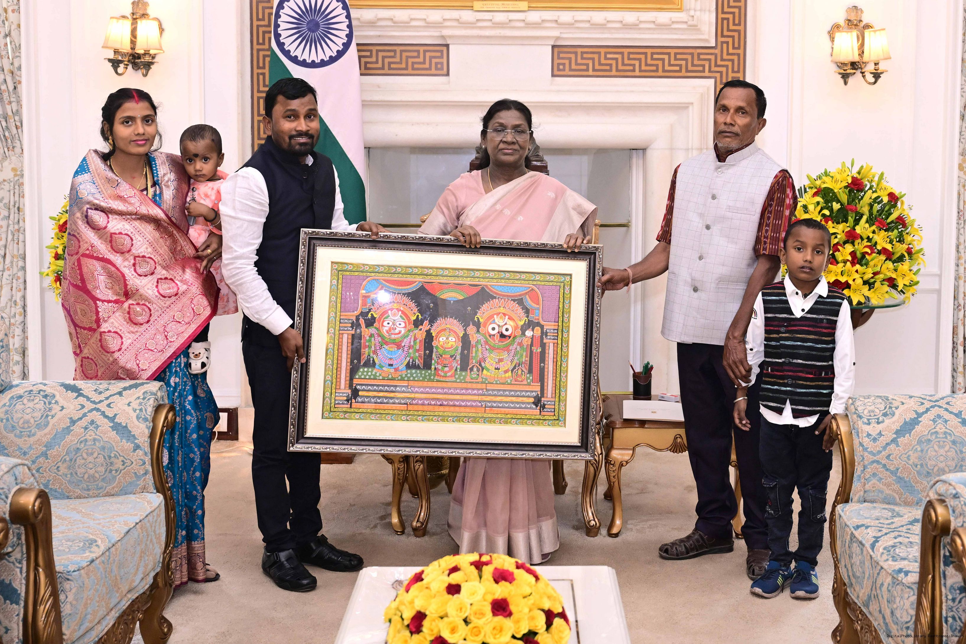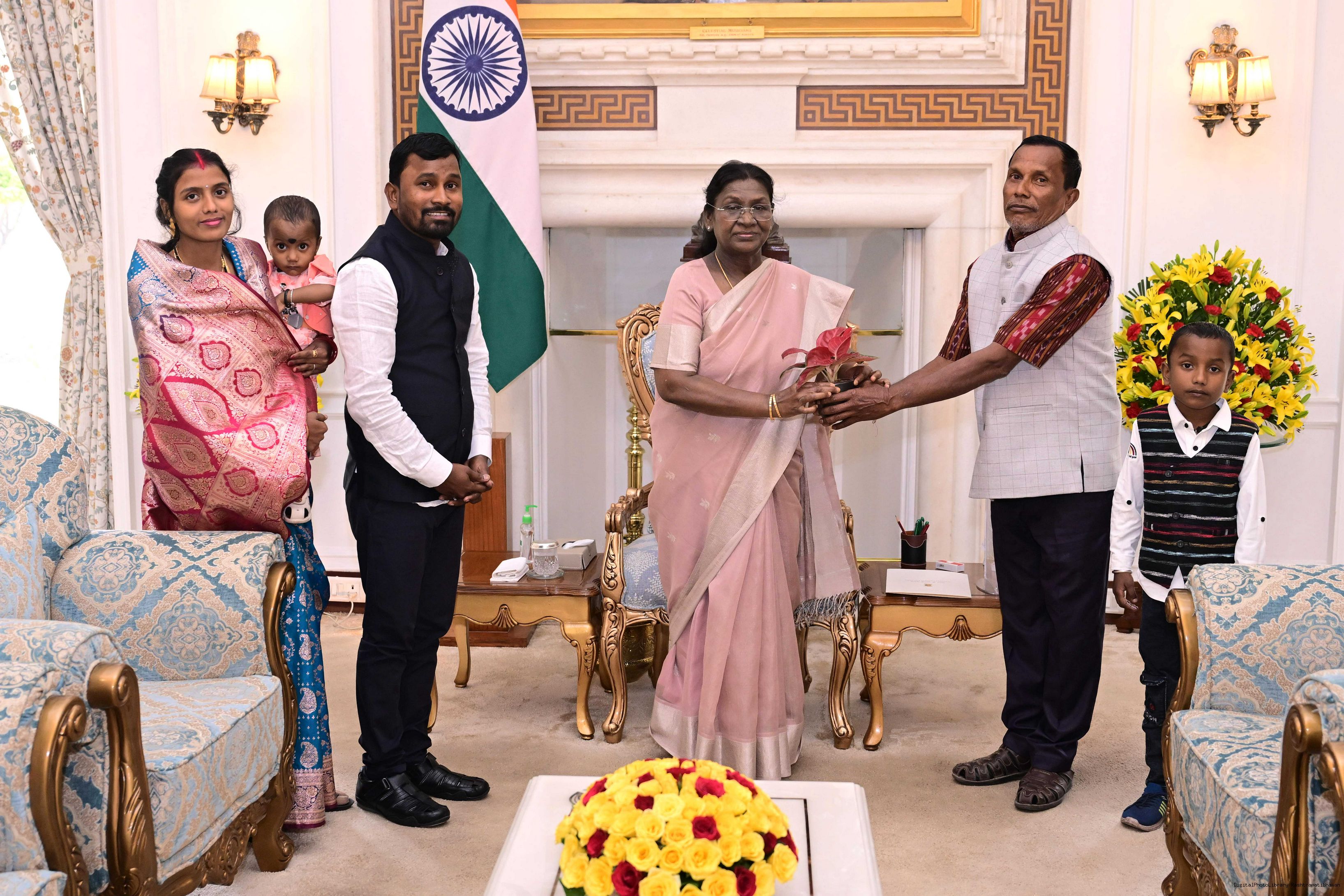 | Caption: | Shri Biswanath Rana, a stone sculptor from Balasore, Odisha along with Father Shri Ganesh Ch Rana and others meeting with the President of India, Smt. Droupadi Murmu at Rashtrapati Bhavan on November 17, 2025. |
