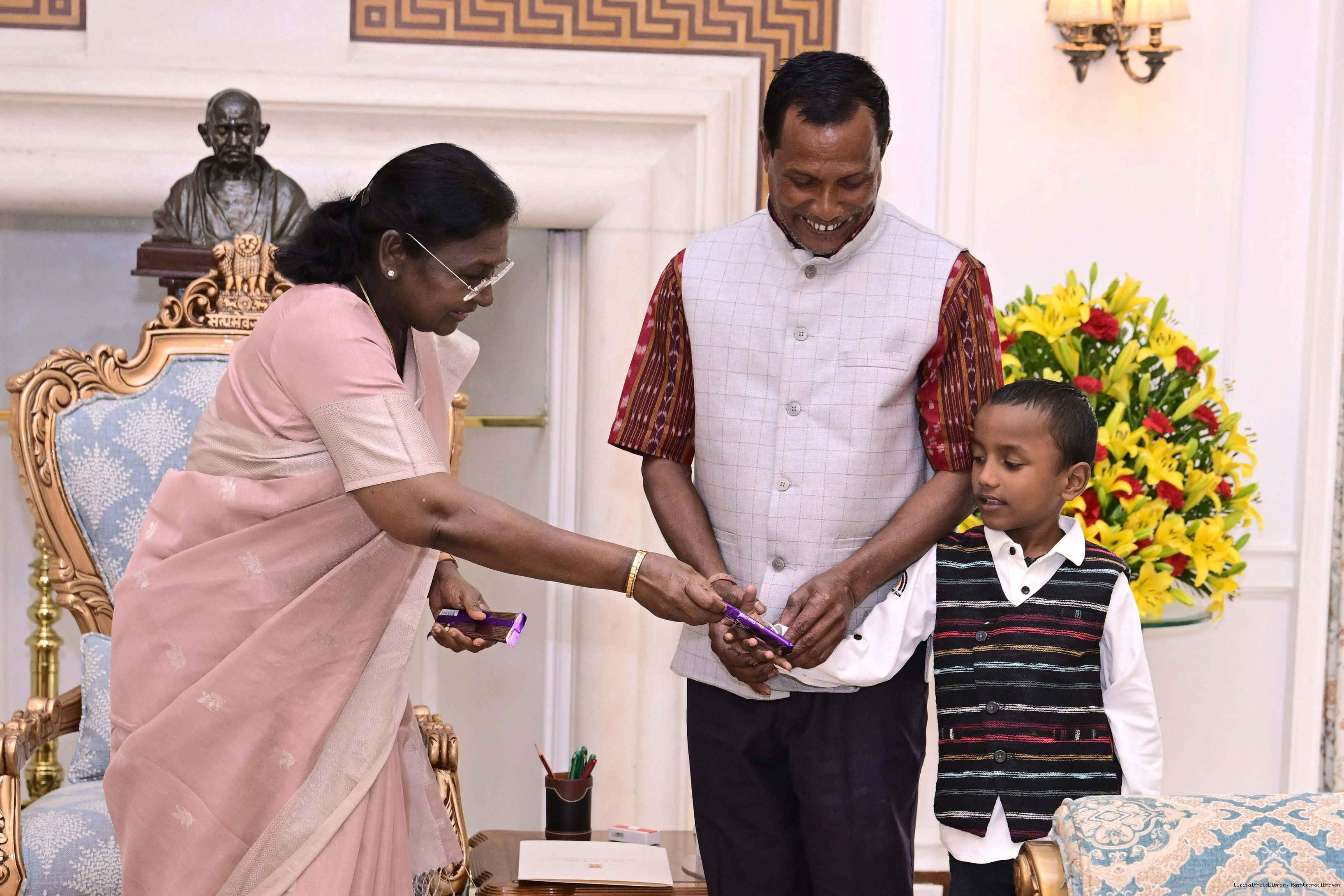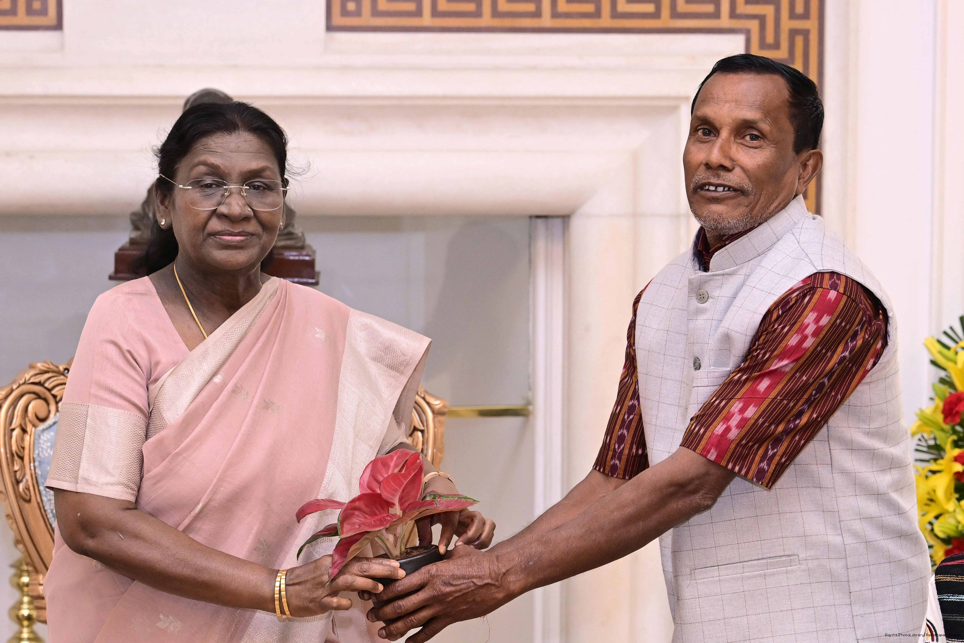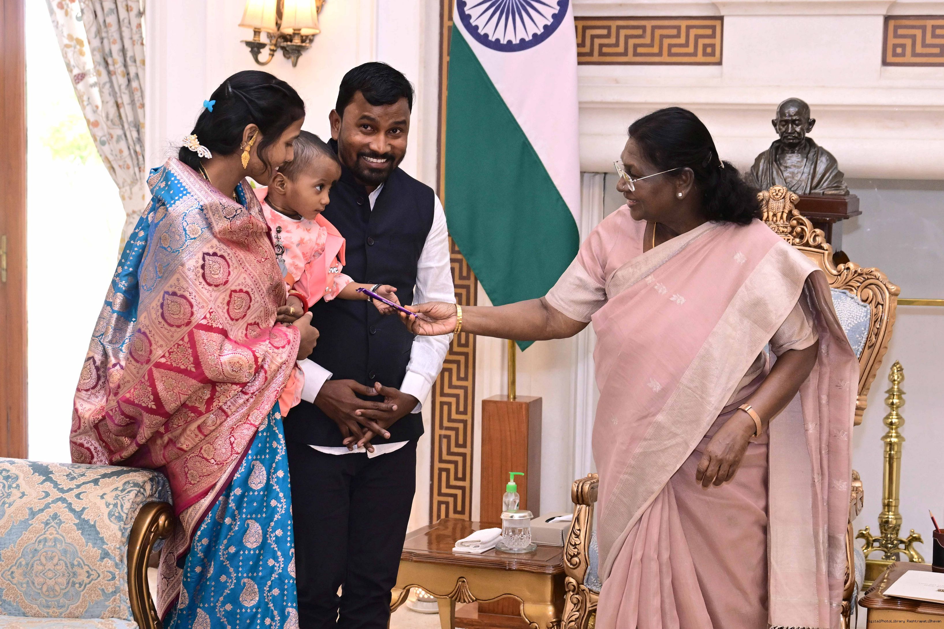 | Caption: | Shri Biswanath Rana, a stone sculptor from Balasore, Odisha along with Father Shri Ganesh Ch Rana and others meeting with the President of India, Smt. Droupadi Murmu at Rashtrapati Bhavan on November 17, 2025. |