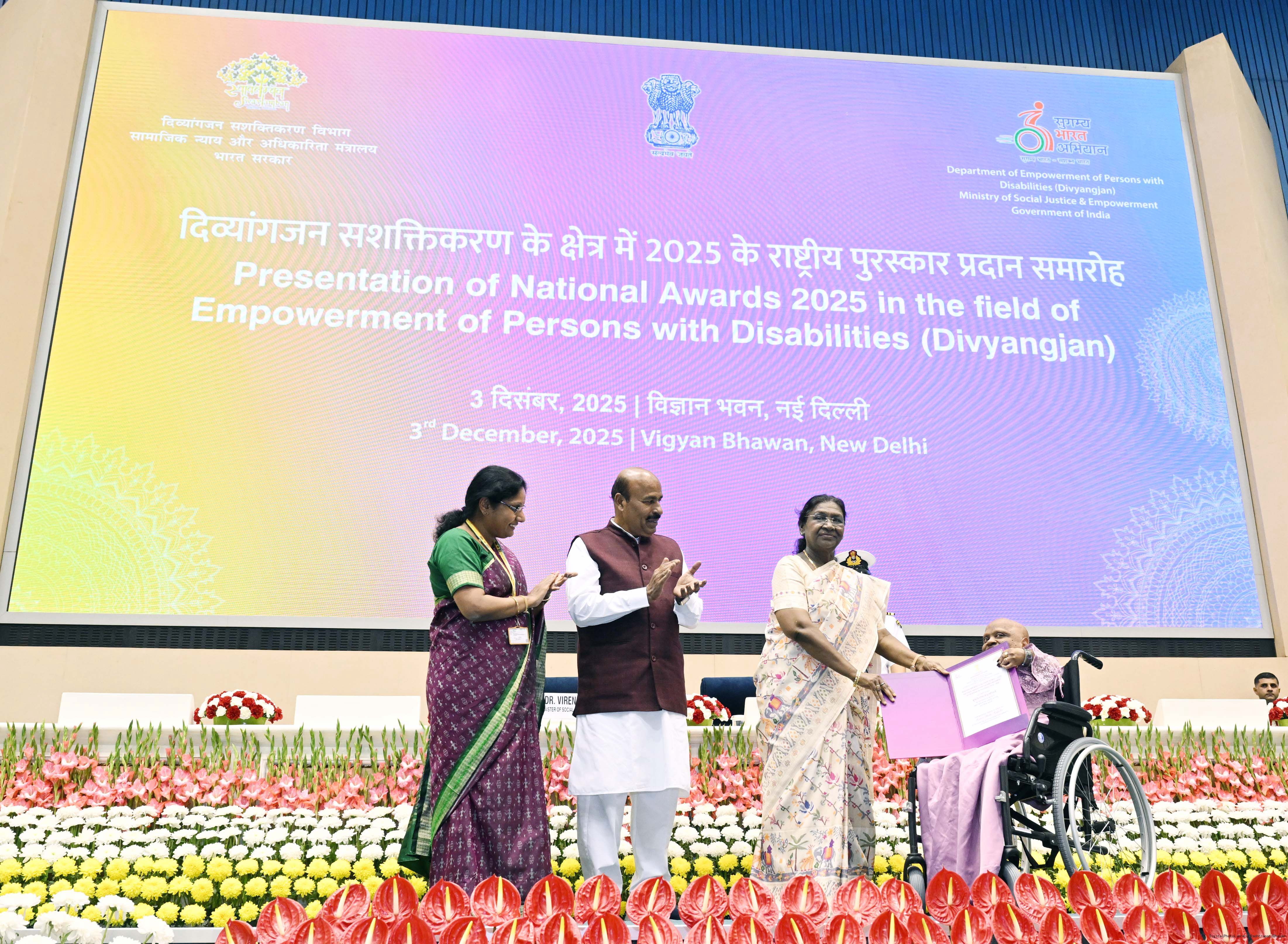 Caption: The President of India, Smt Droupadi Murmu, presented the National Awards for the Empowerment of Persons with Disabilities for the year 2025 in New Delhi on December 3, 2025 on the occasion of the International Day of Persons with Disabilities.