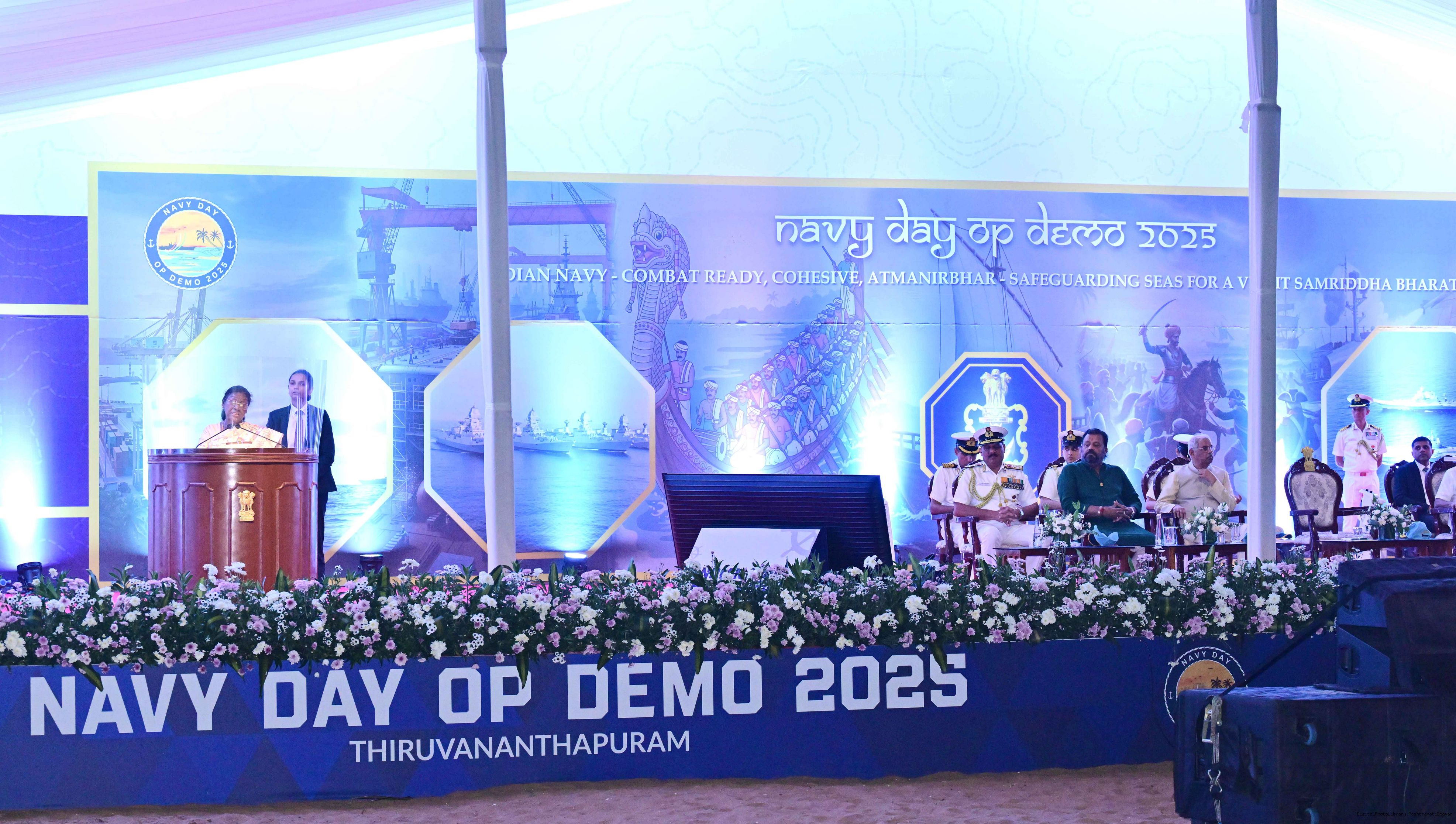 Caption: The President of India, Smt Droupadi Murmu, graced the Navy Day-2025 celebrations and witnessed the operational demonstration by the Indian Navy at Thiruvananthapuram, Kerala, on December 3, 2025.