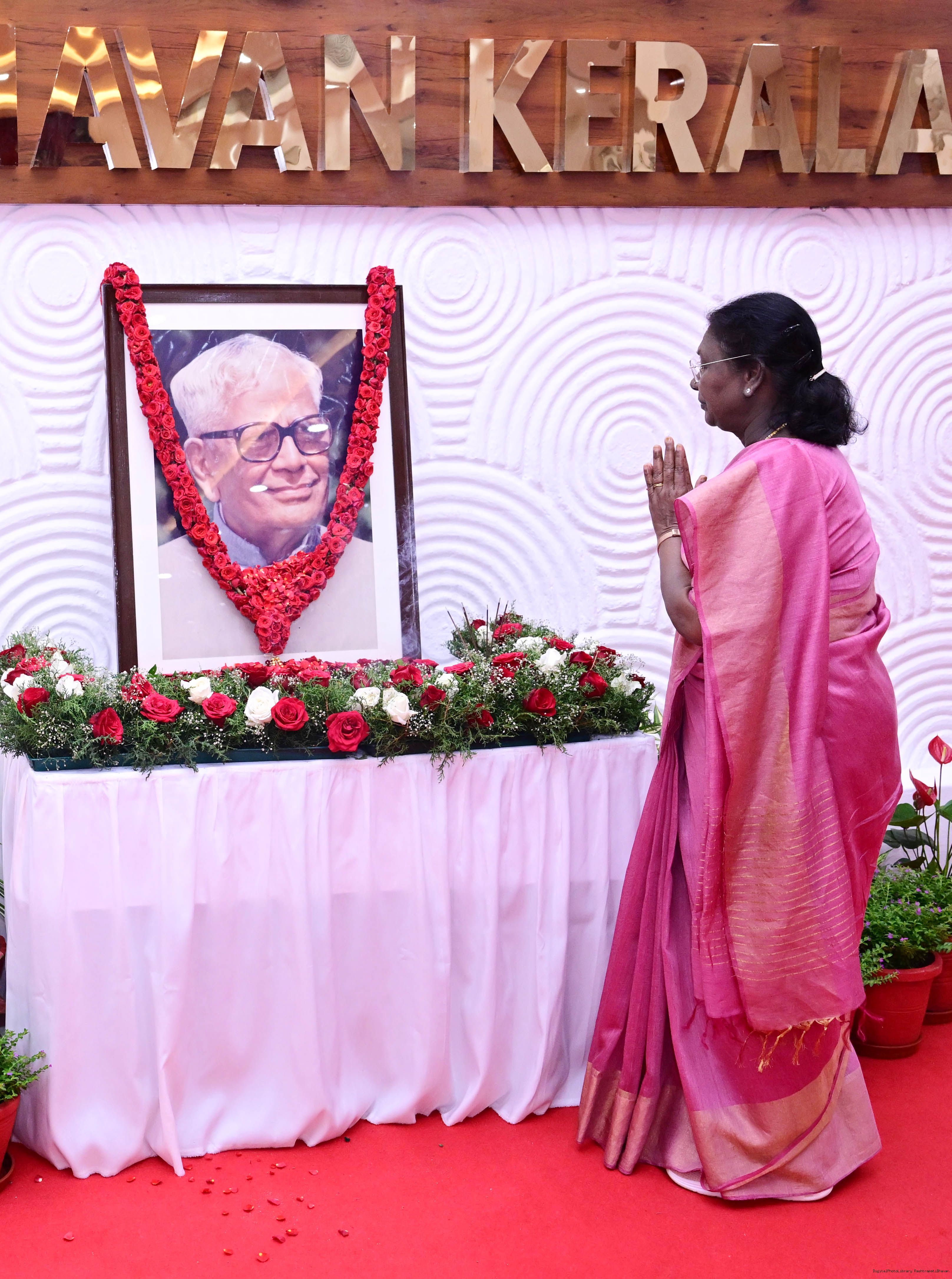 | Caption: | The President of India, Smt Droupadi Murmu paid floral tributes to Shri R. Venkataraman, former President of India, on his birth anniversary at Lok Bhavan, Thiruvananthapuram on December 4, 2025. |