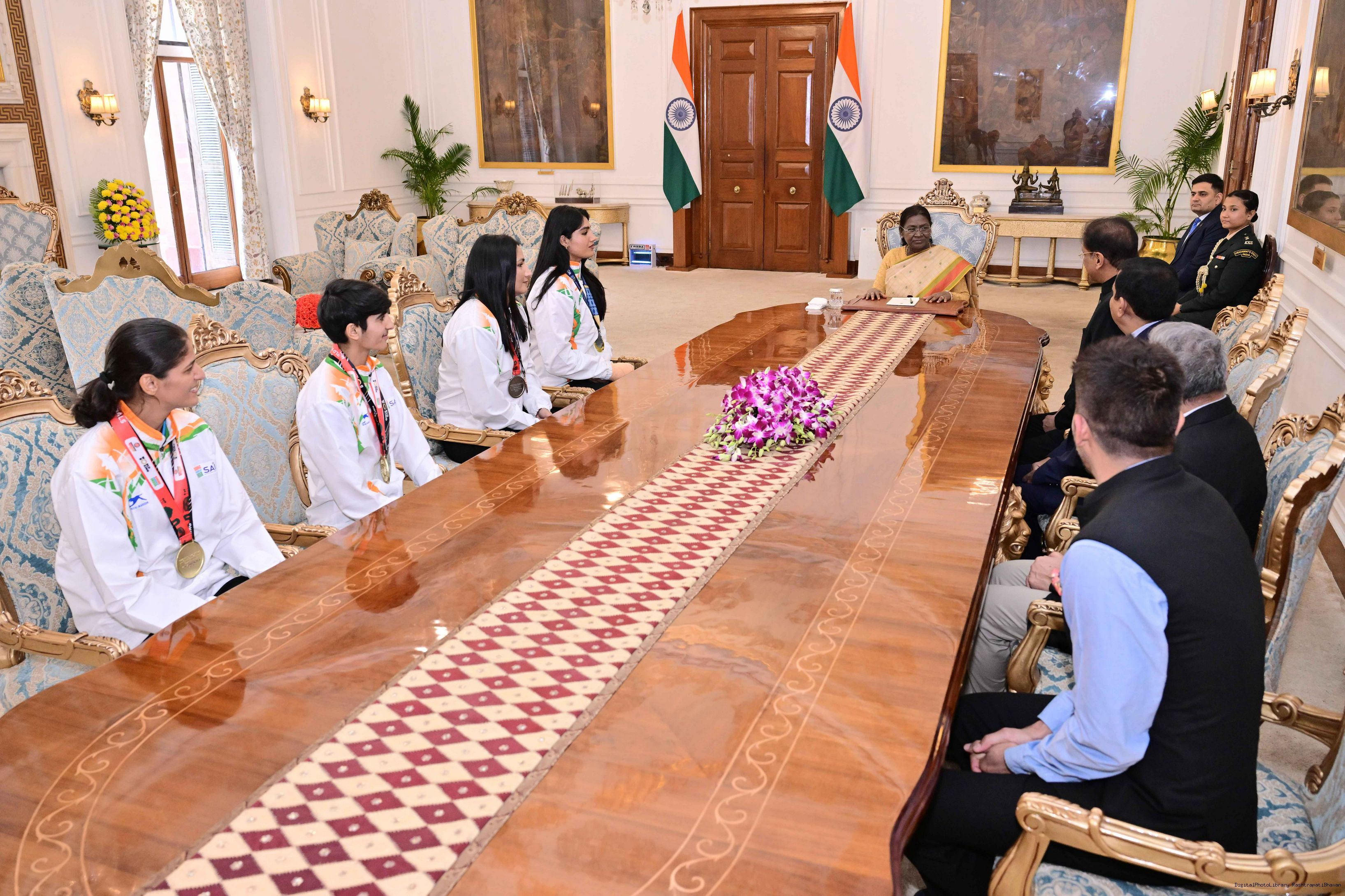 | Caption: | Indian women boxers who brought laurels to the nation at the 2025 World Boxing Championships in Liverpool called on the President Smt. Droupadi Murmu at Rashtrapati Bhavan on December 10, 2025. |