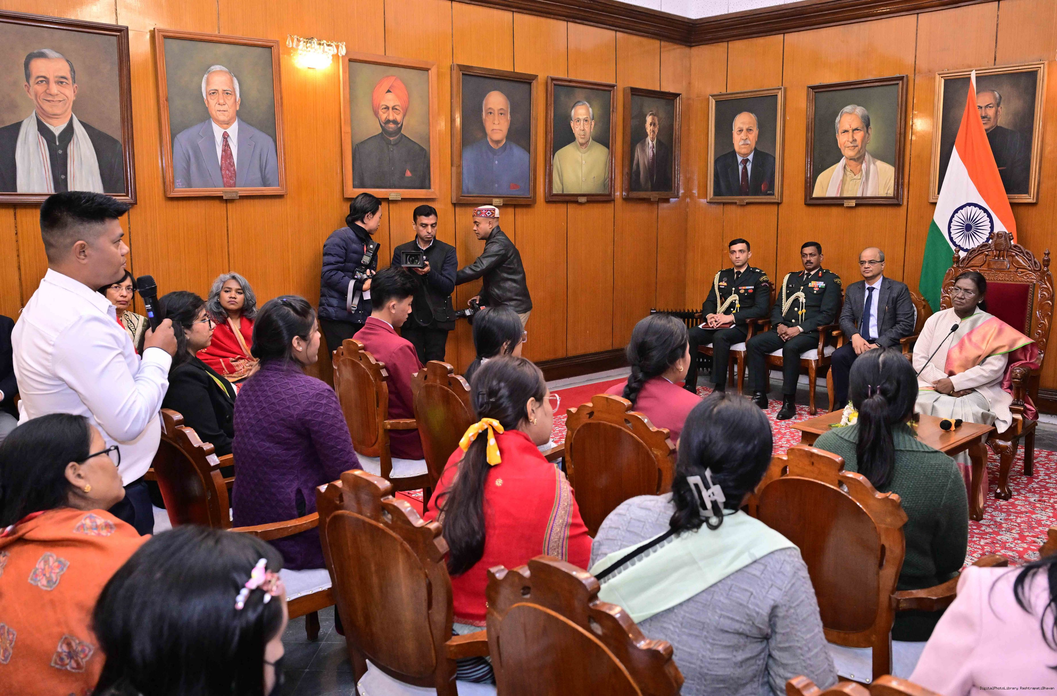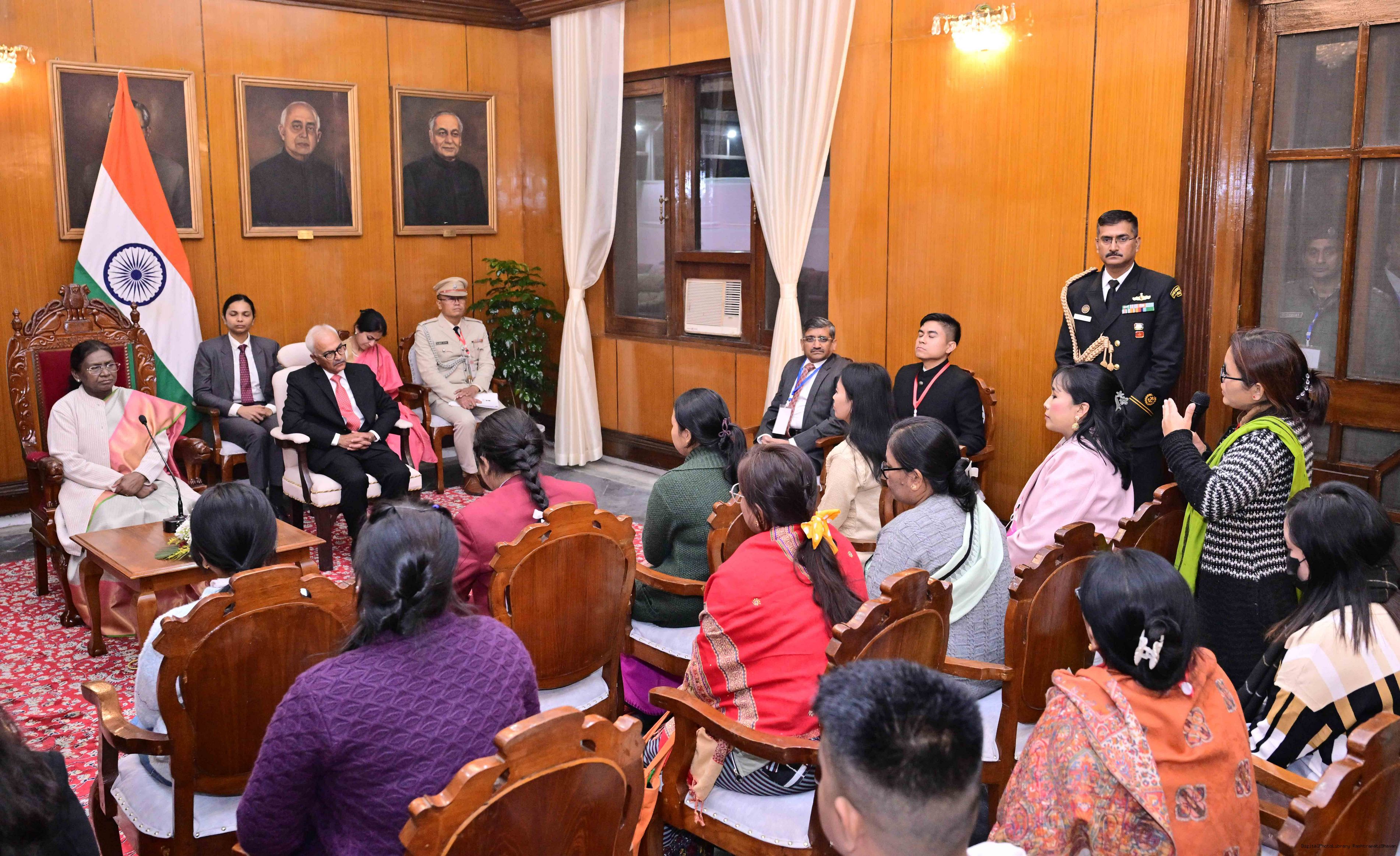 Caption: The President of India, Smt. Droupadi Murmu met and interacted with a few Internally Displaced Persons in Imphal on December 11, 2025.