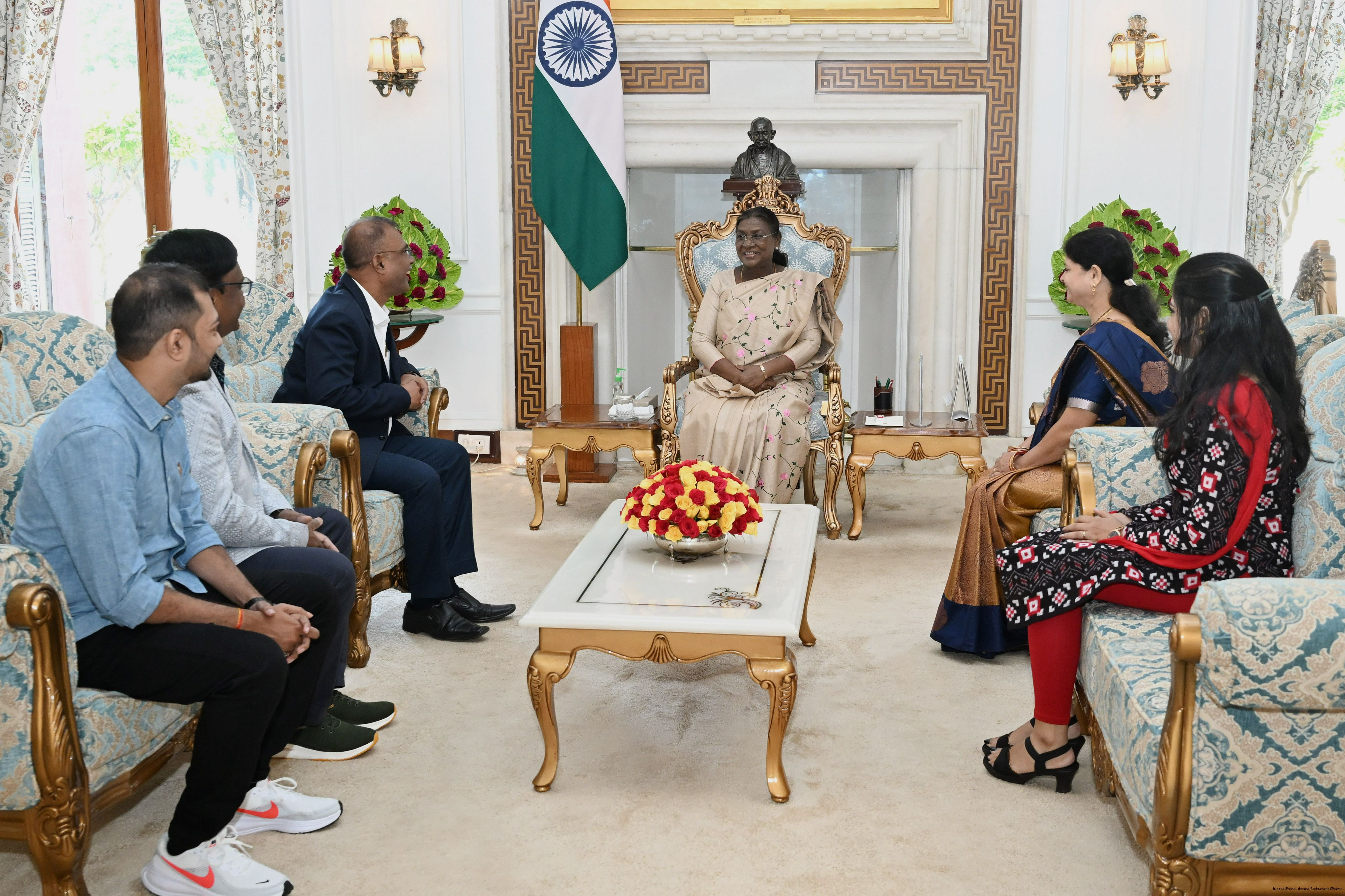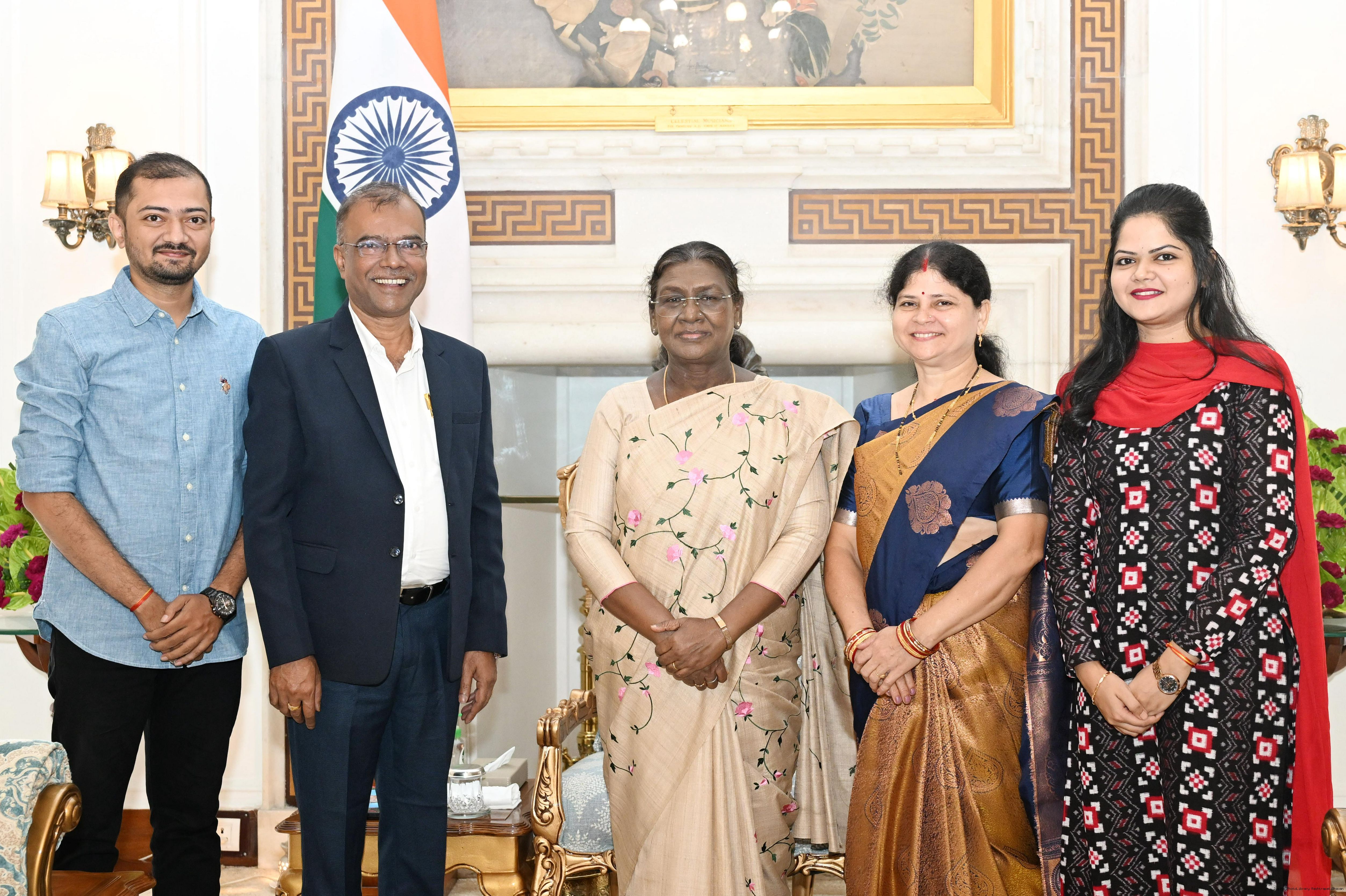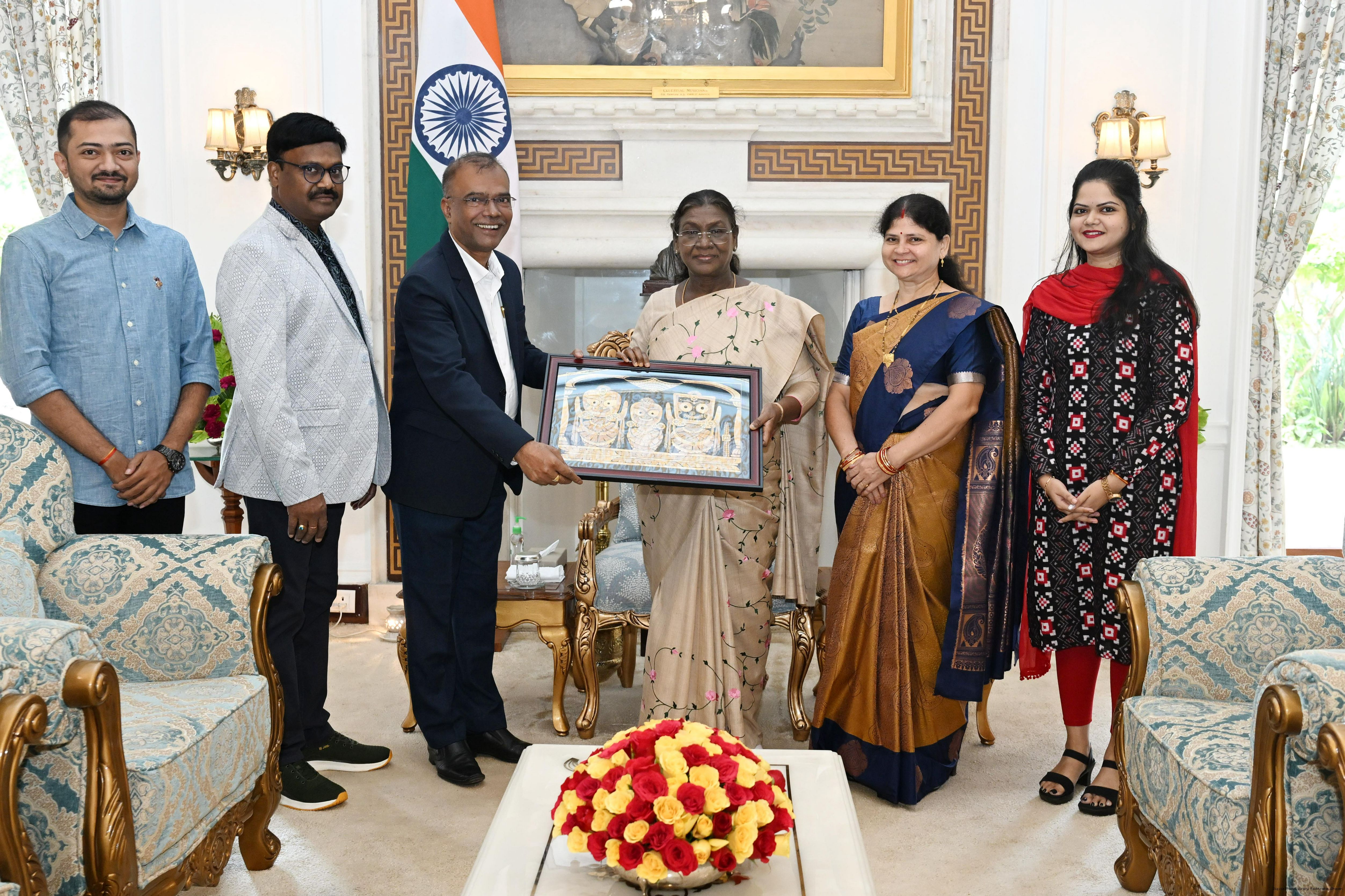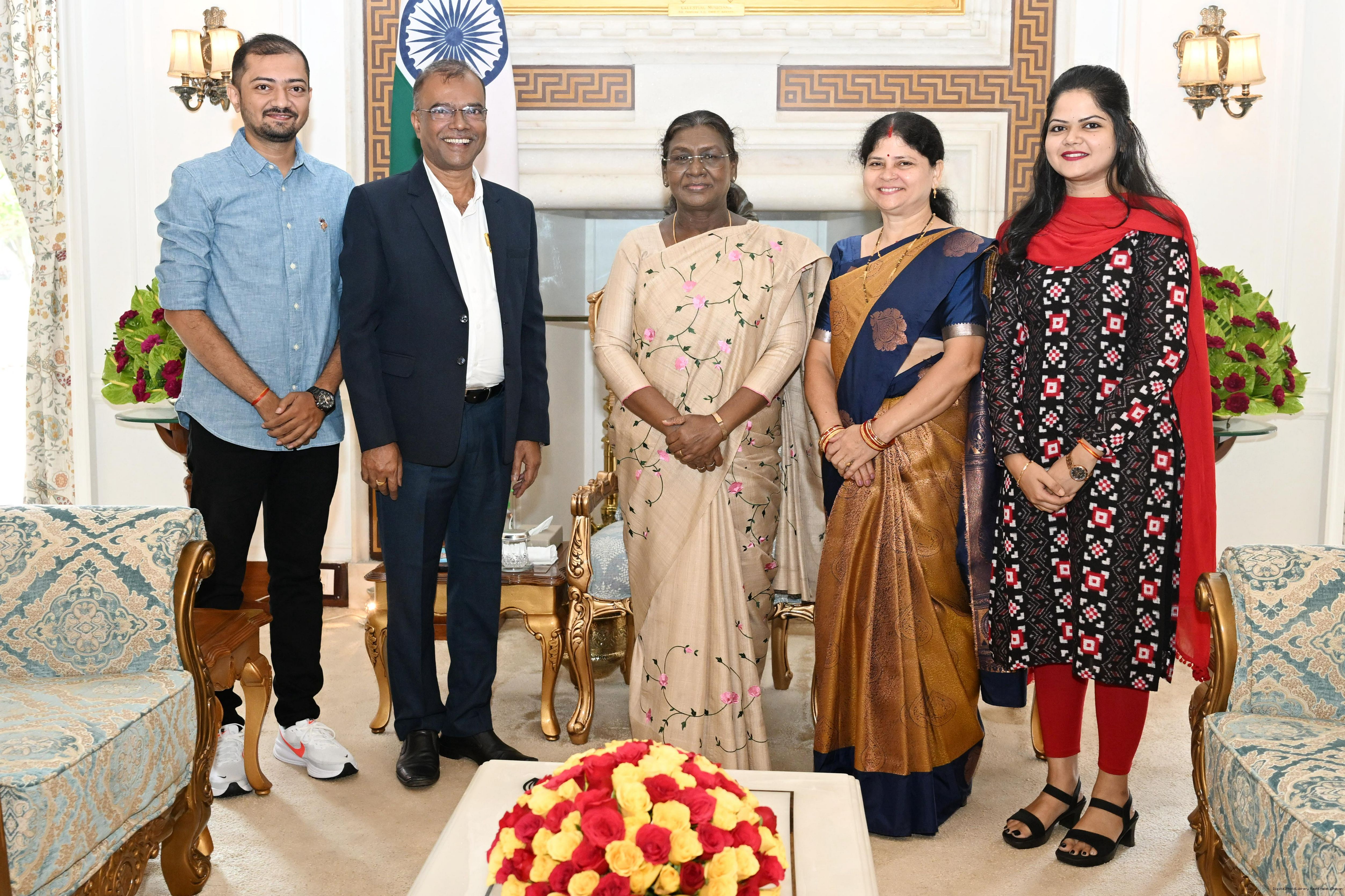 | Caption: | Shri Satish Chandra Samal, APS to the CM of Odisha along with wife Nalini Kanta Jena and others meeting the President of India Smt. Droupadi Murmu at Rashtrapati Bhavan on September 29, 2025. |