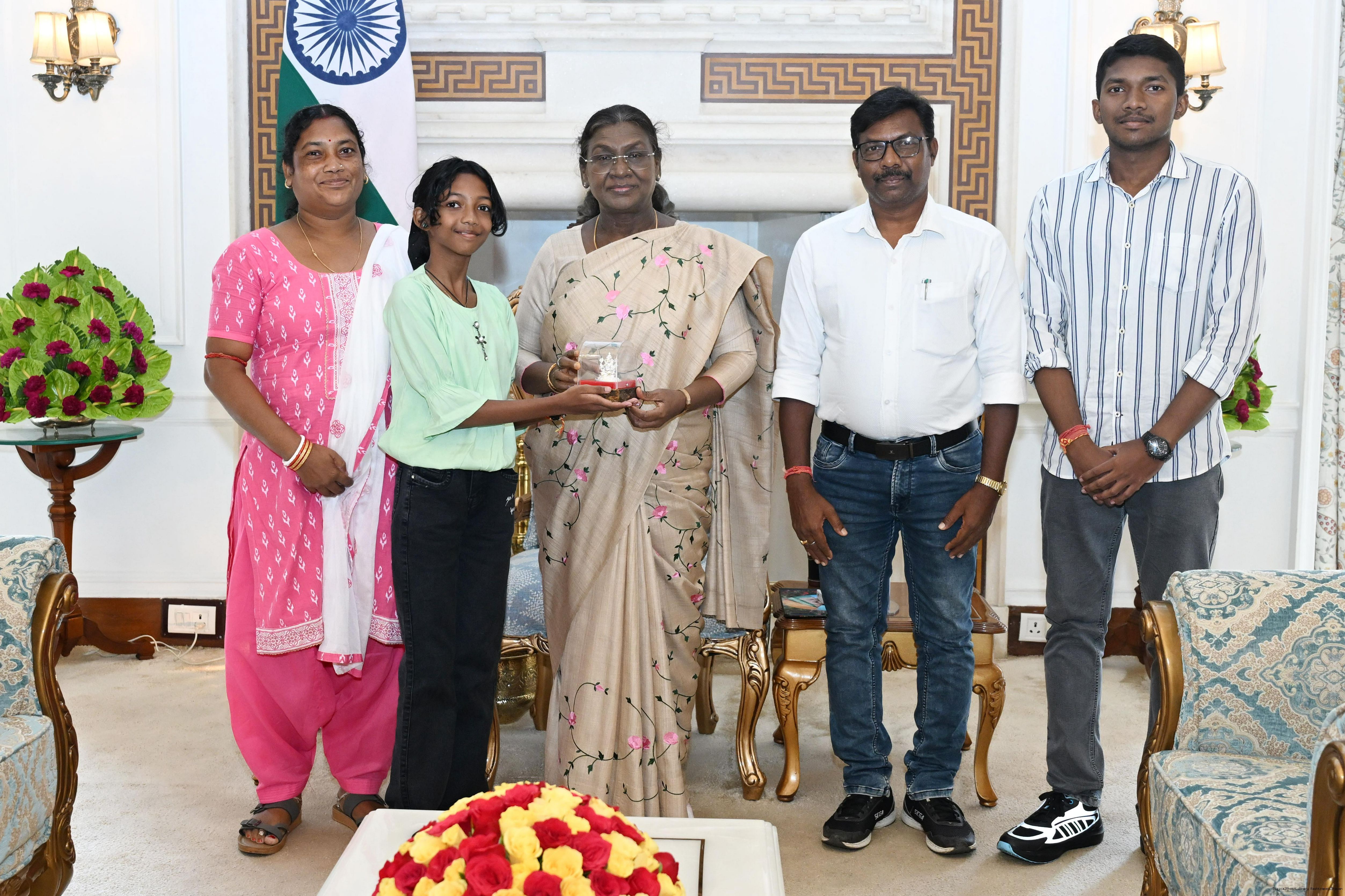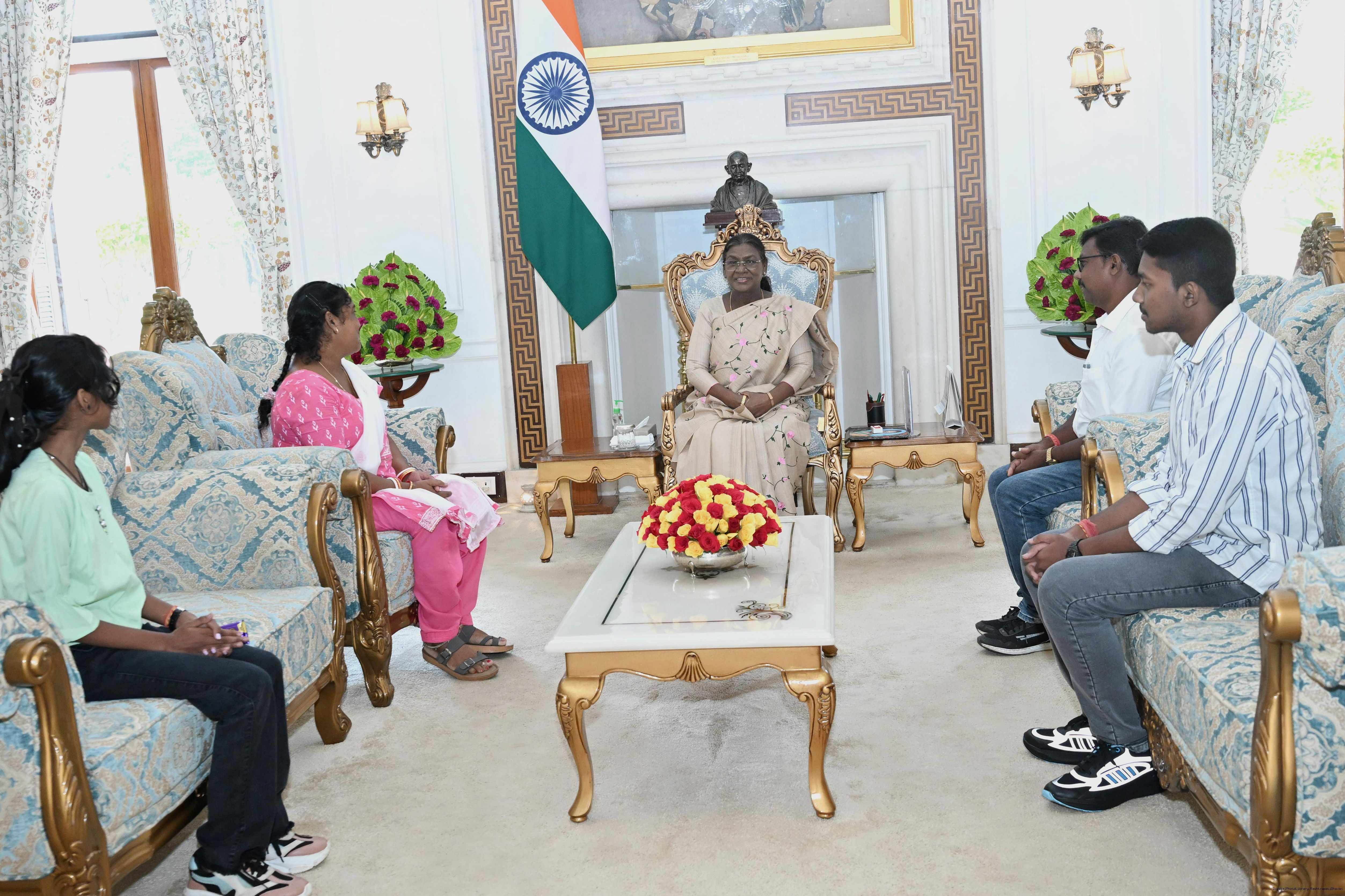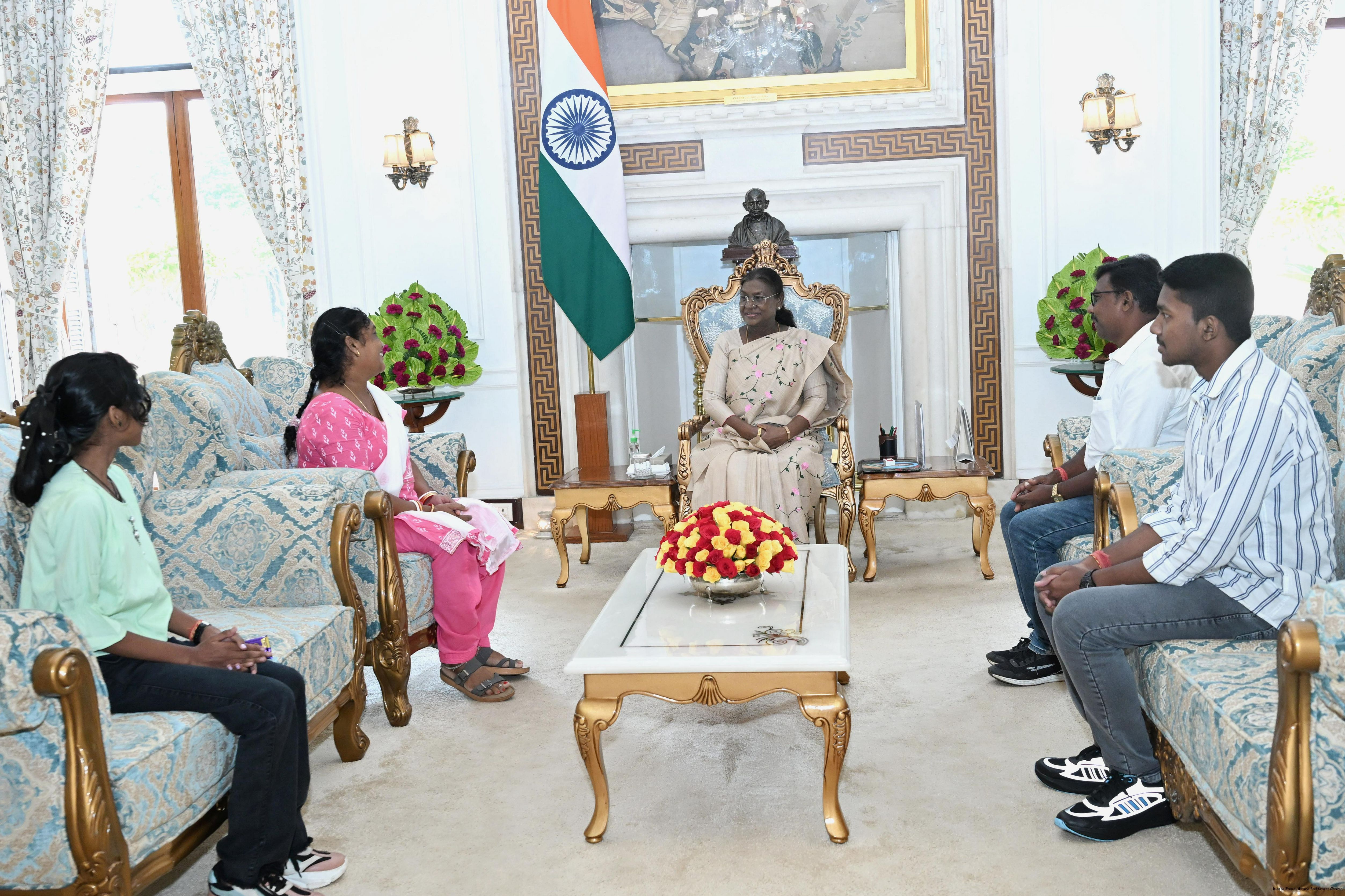 | Caption: | Smt. Salge Majhi, Niece of HR along with Dr. Muchiram Hembram and others meeting the President of India Smt. Droupadi Murmu at Rashtrapati Bhavan on September 29, 2025. |