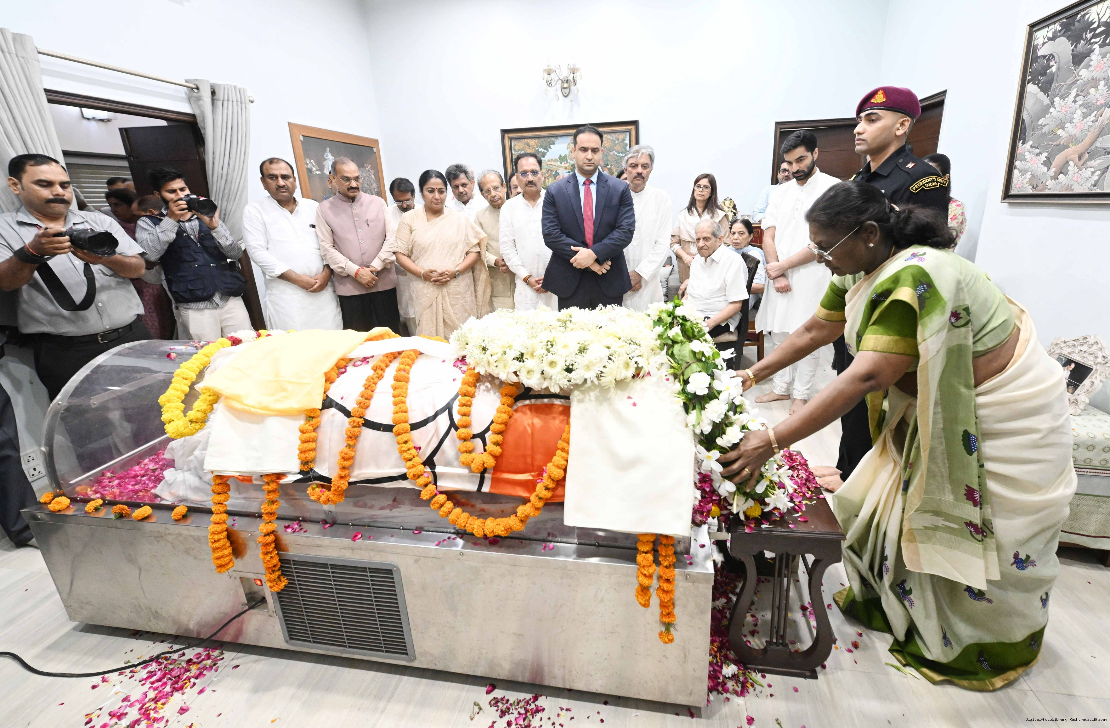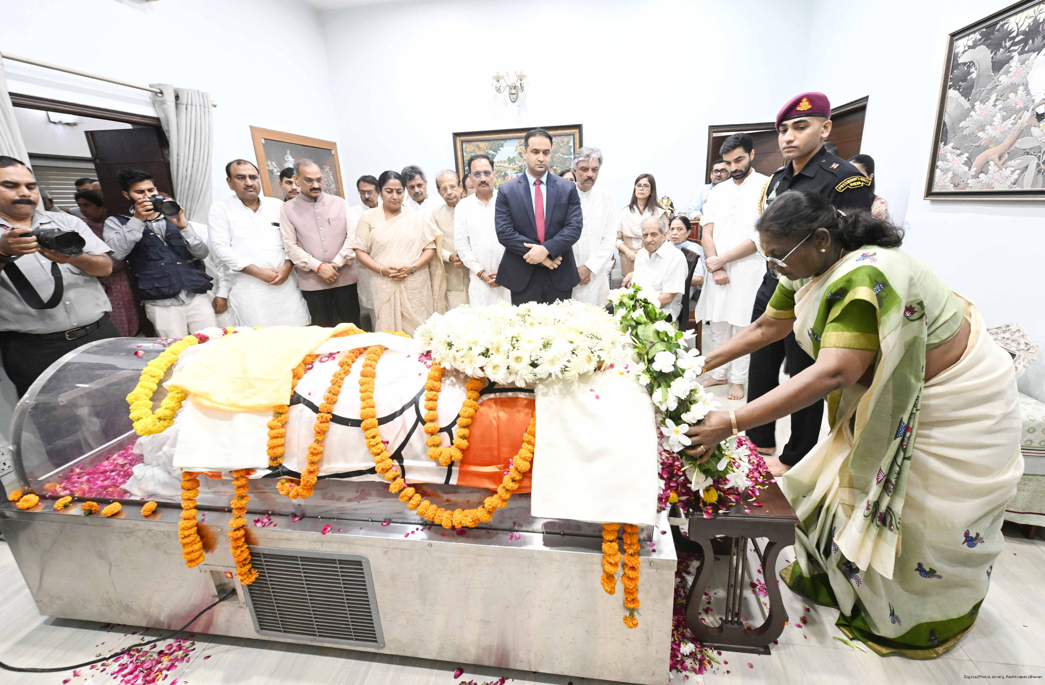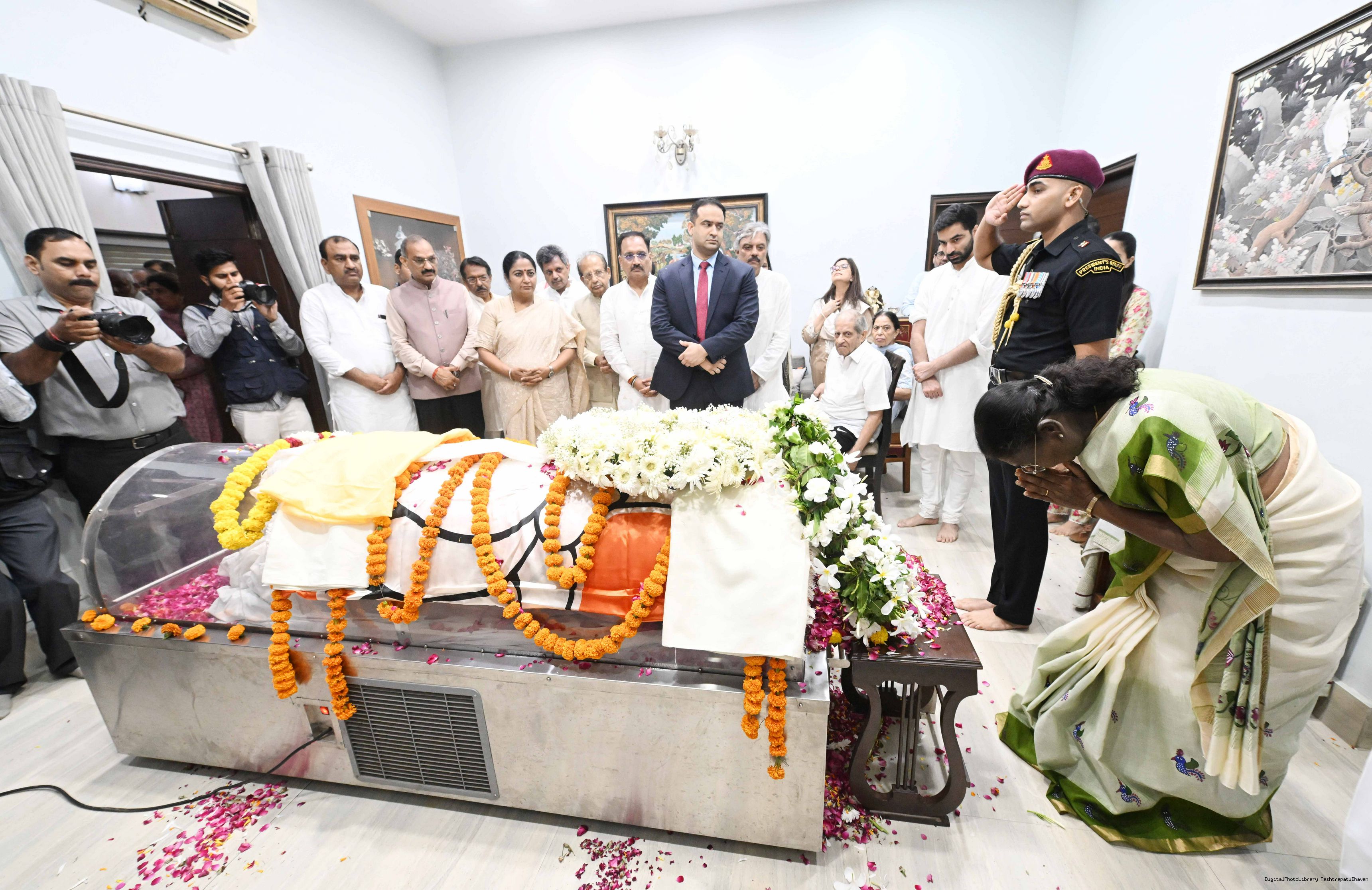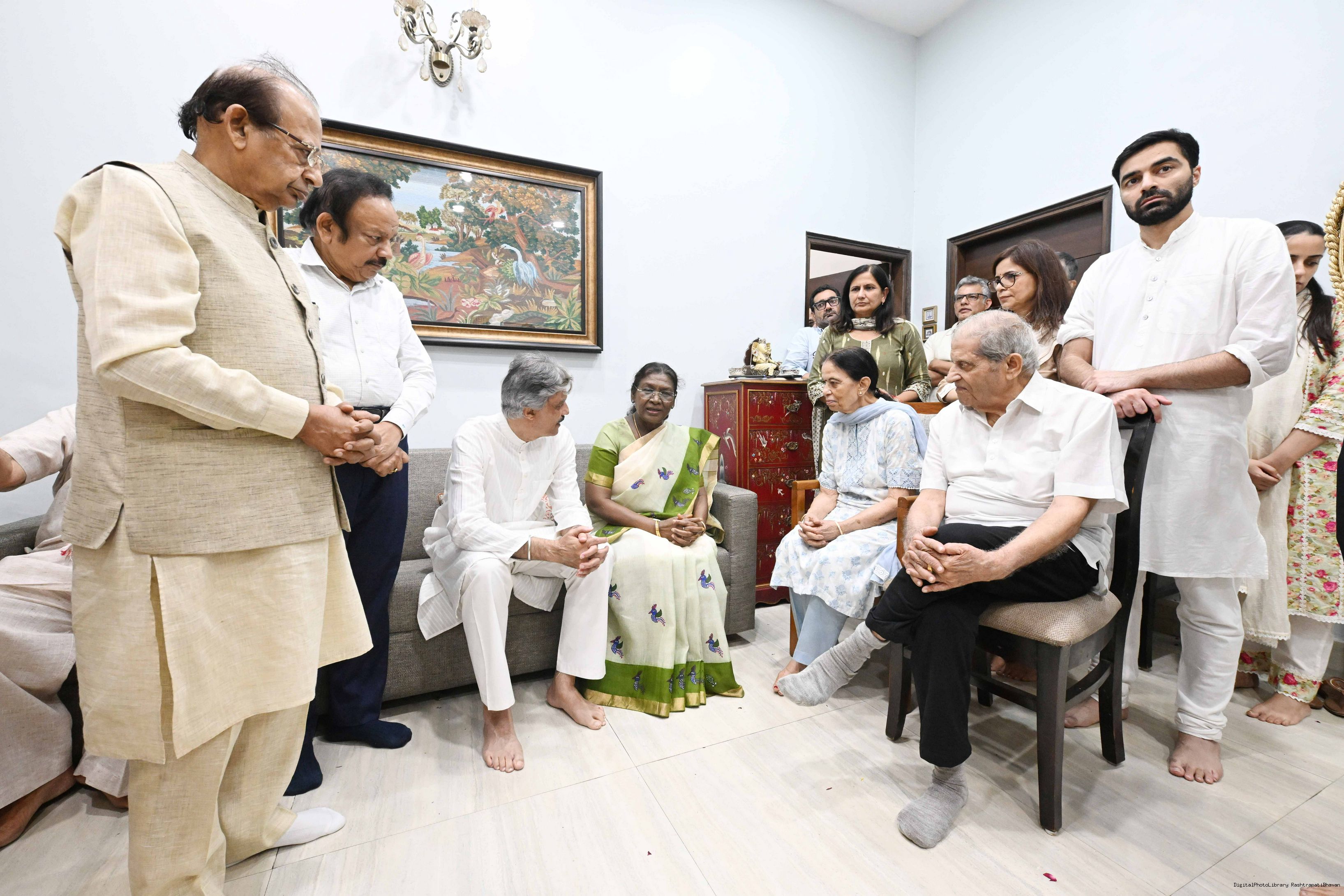 | Caption: | The President of India, Smt. Droupadi Murmu paid last respects to the eminent leader Shri Vijay Kumar Malhotra at his residence. She also offered her condolences to the family members of Shri Malhotra in New Delhi on September 30, 2025. |