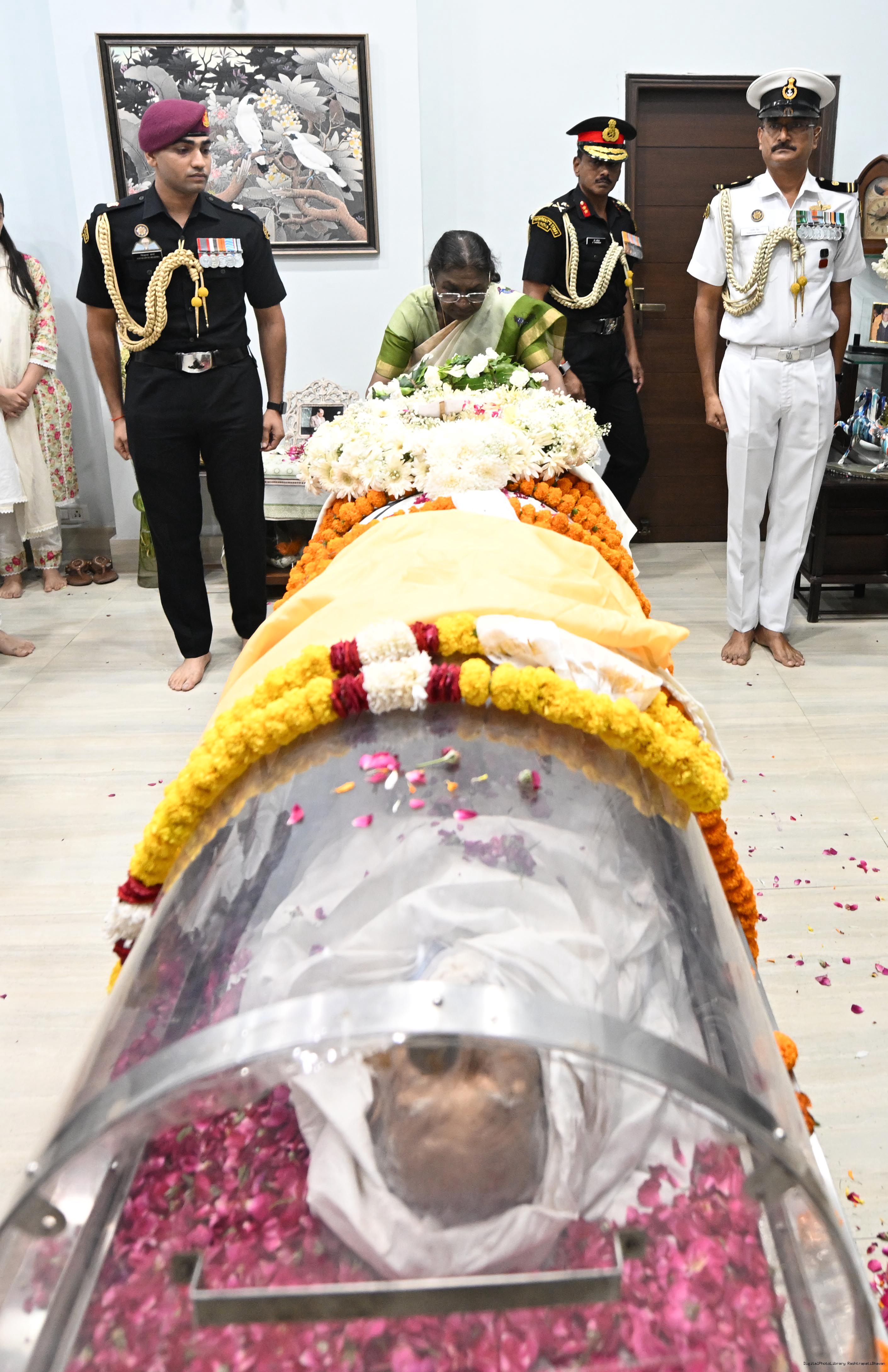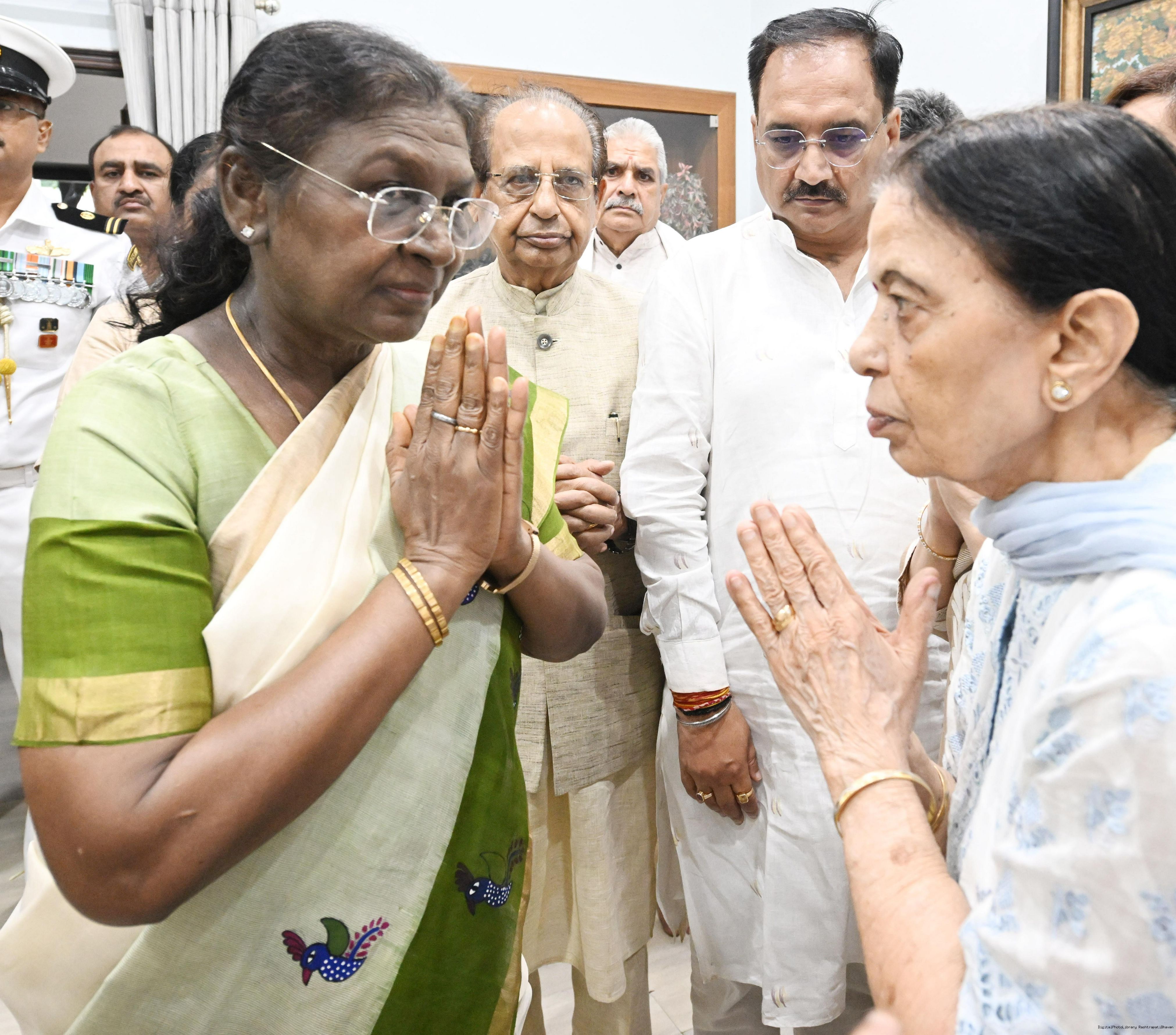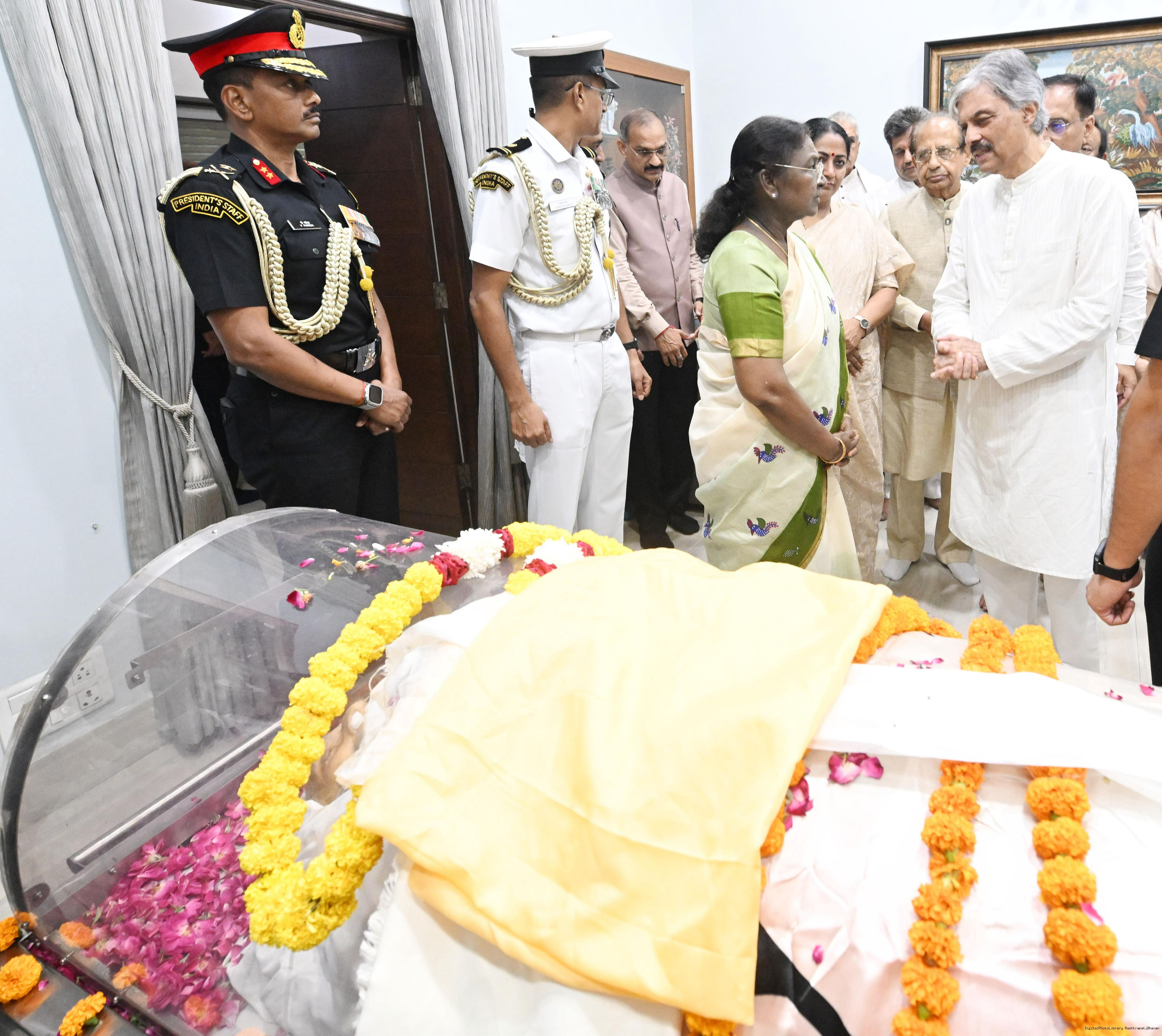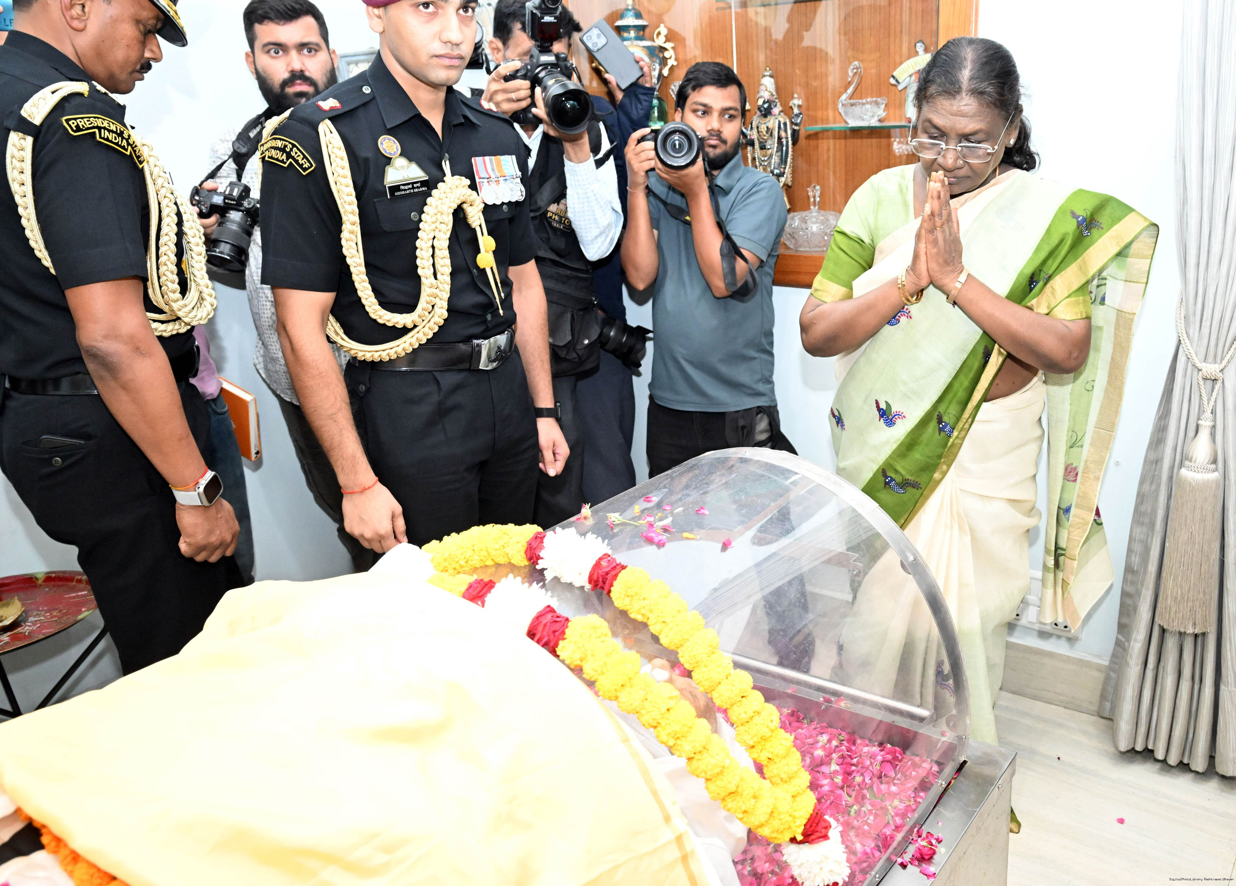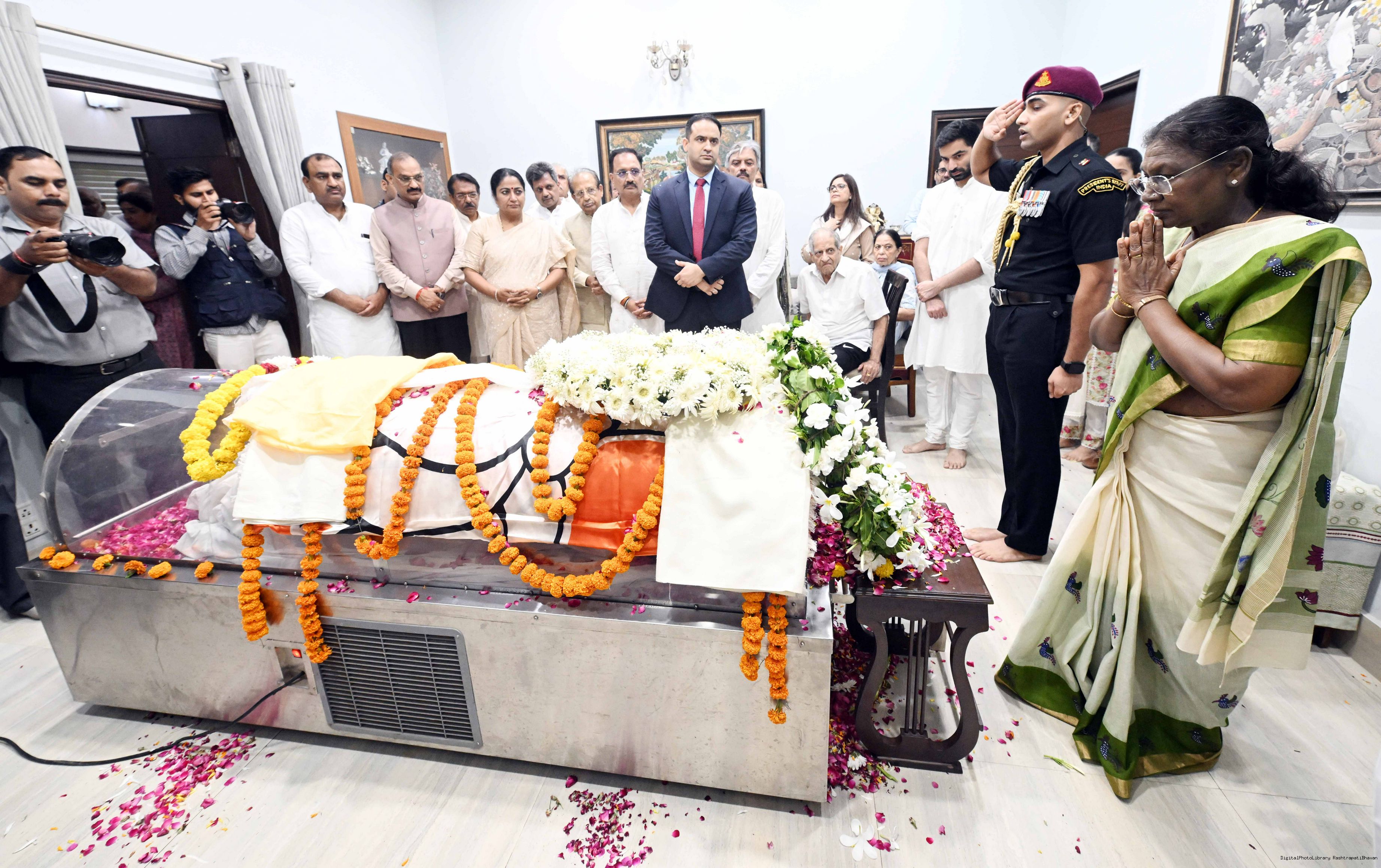 | Caption: | The President of India, Smt. Droupadi Murmu paid last respects to the eminent leader Shri Vijay Kumar Malhotra at his residence. She also offered her condolences to the family members of Shri Malhotra in New Delhi on September 30, 2025. |