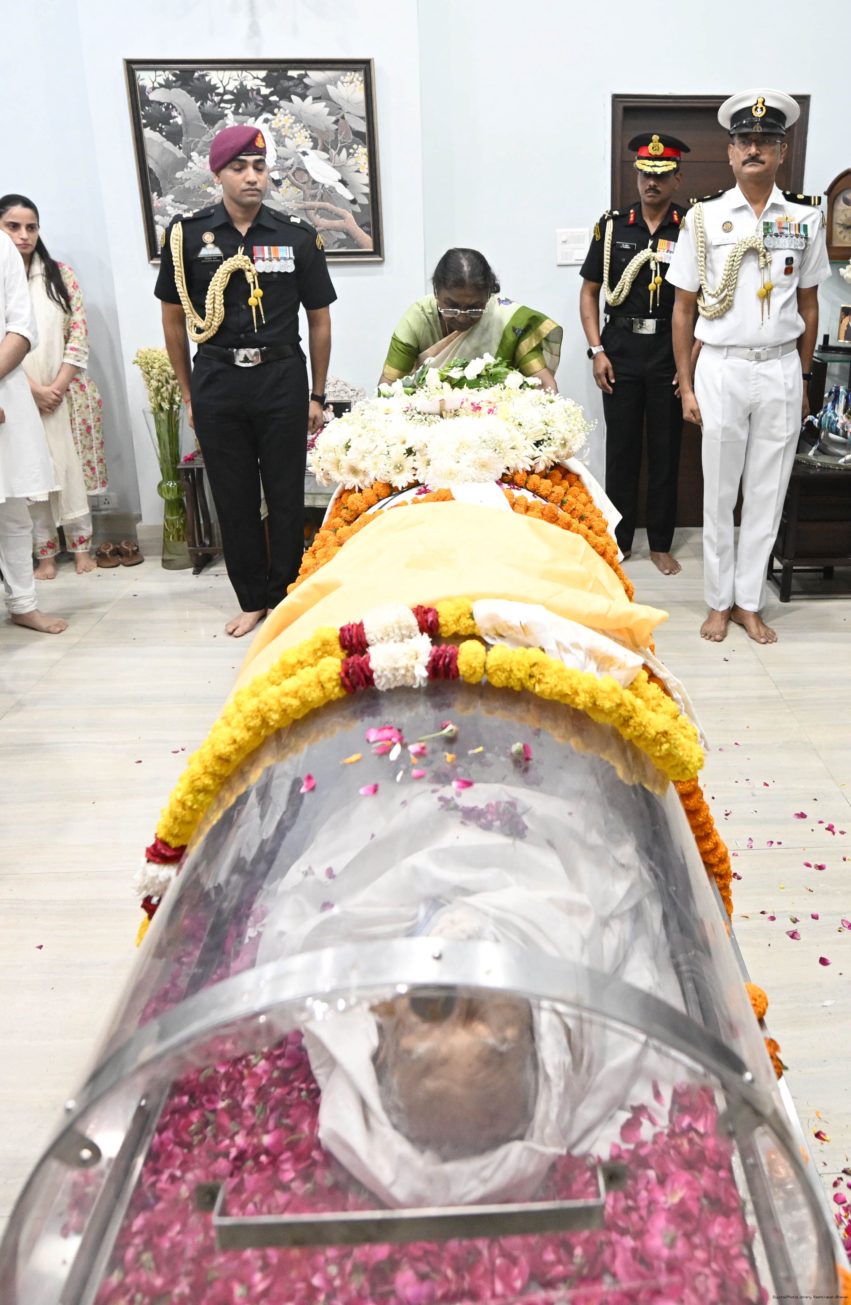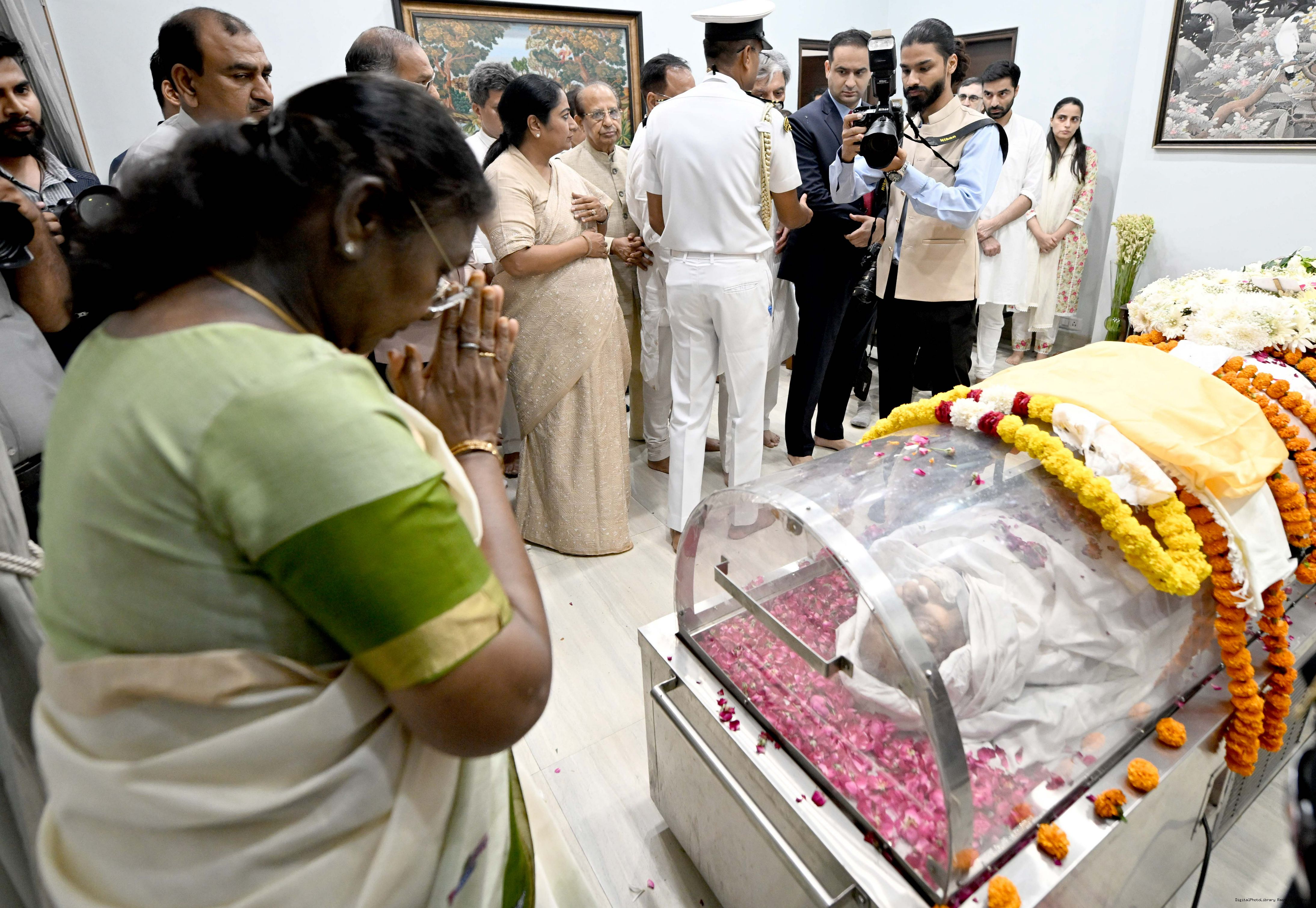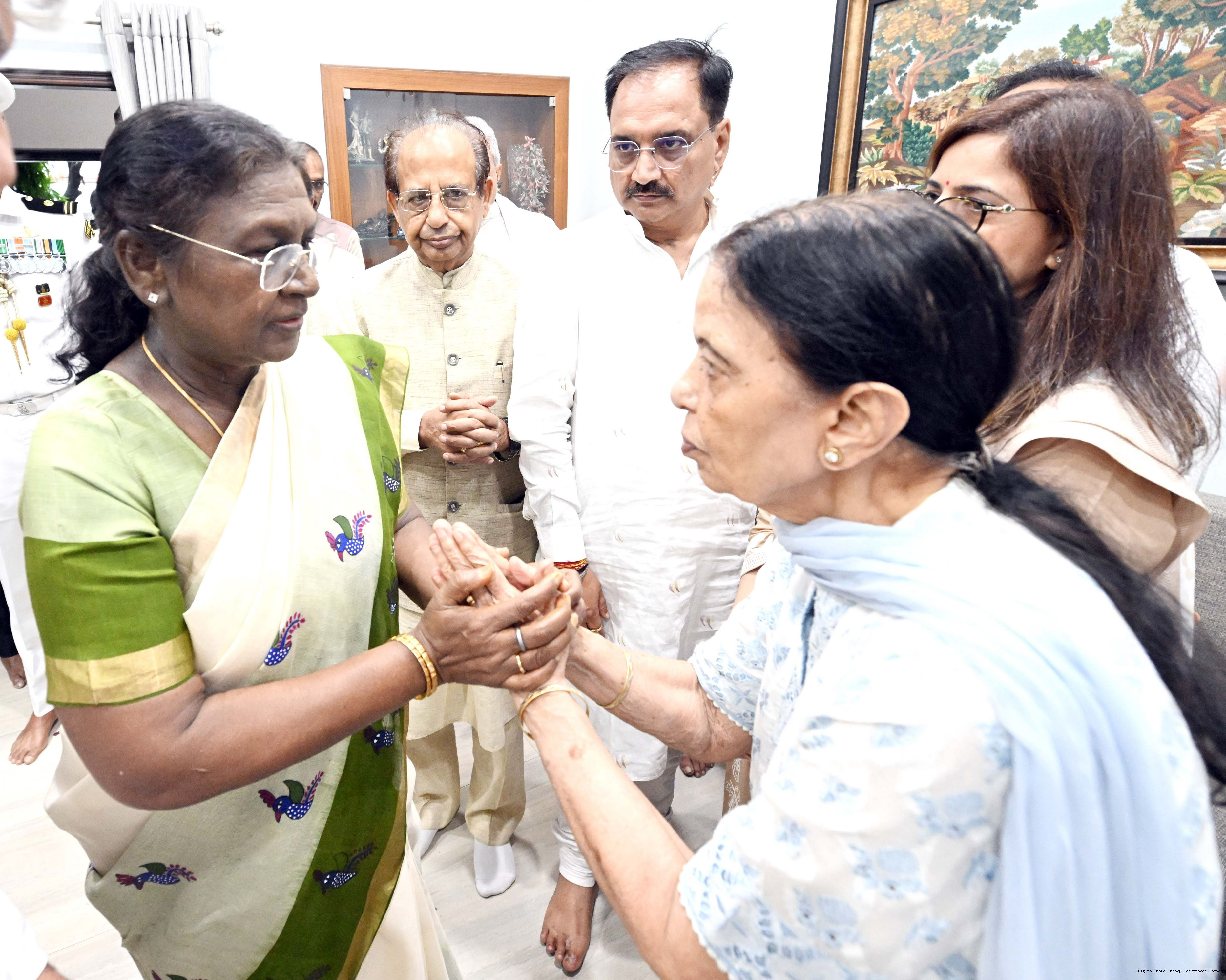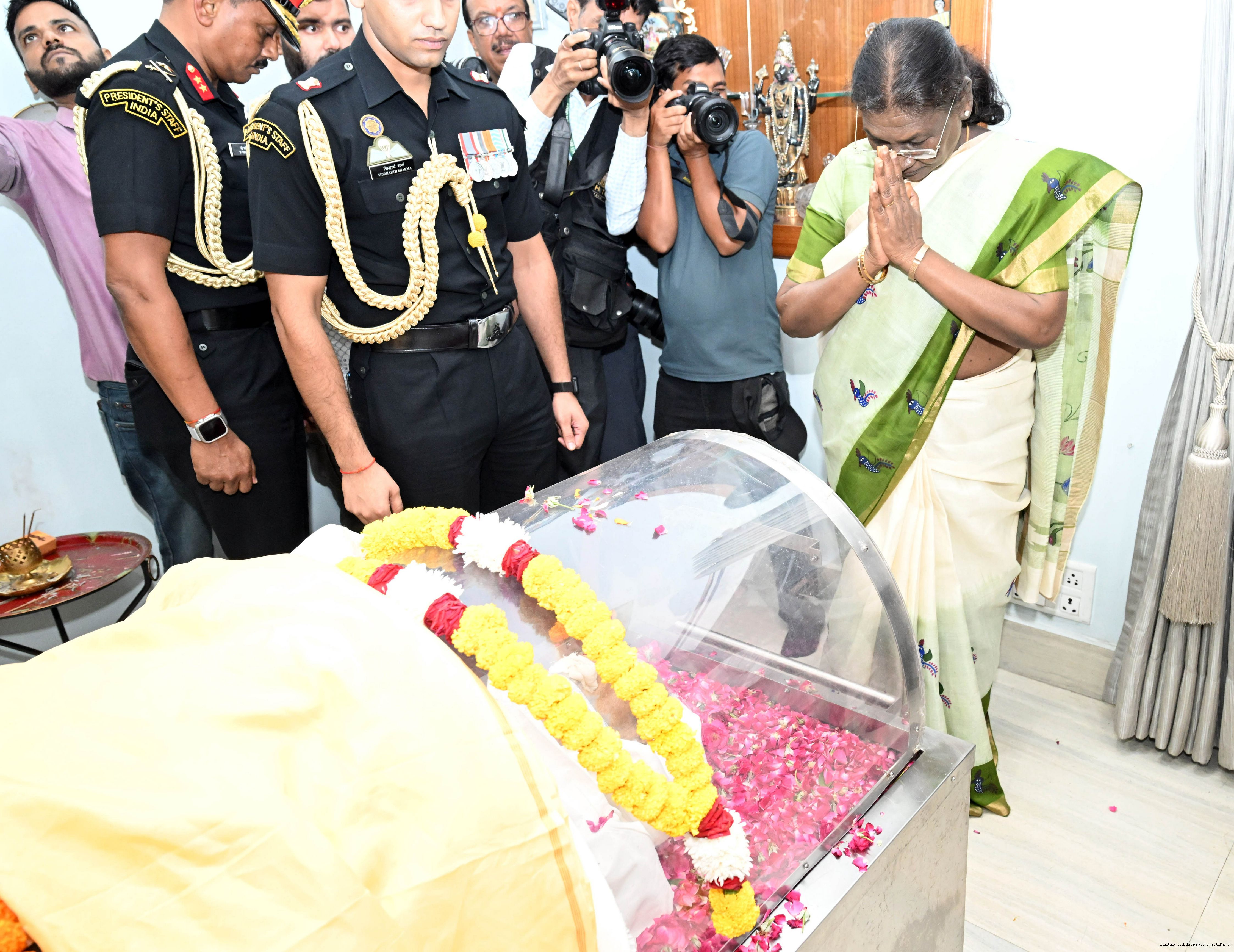 | Caption: | The President of India, Smt. Droupadi Murmu paid last respects to the eminent leader Shri Vijay Kumar Malhotra at his residence. She also offered her condolences to the family members of Shri Malhotra in New Delhi on September 30, 2025. |