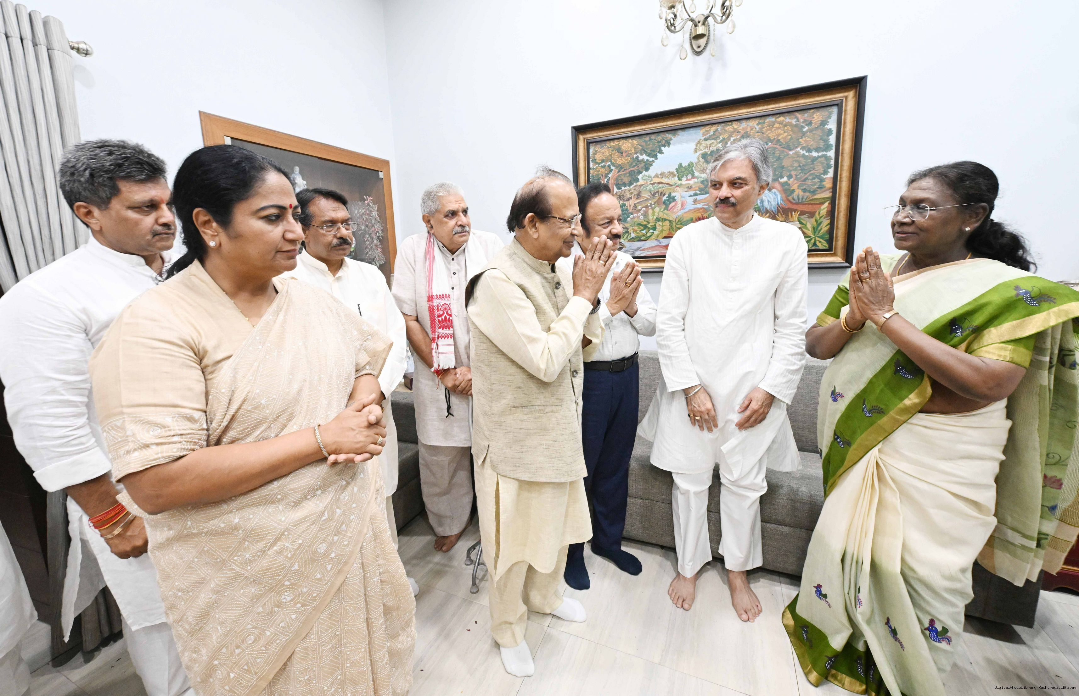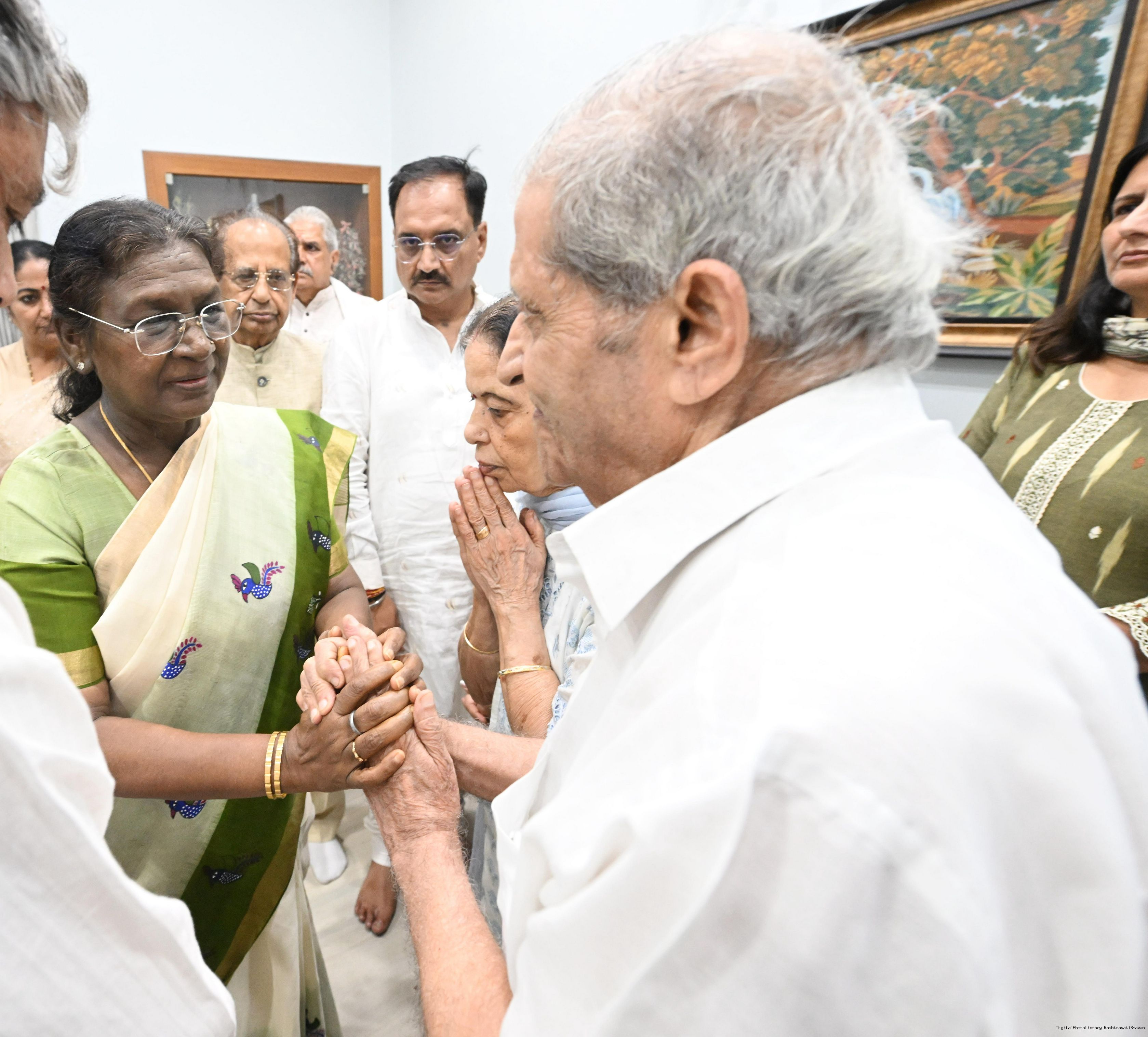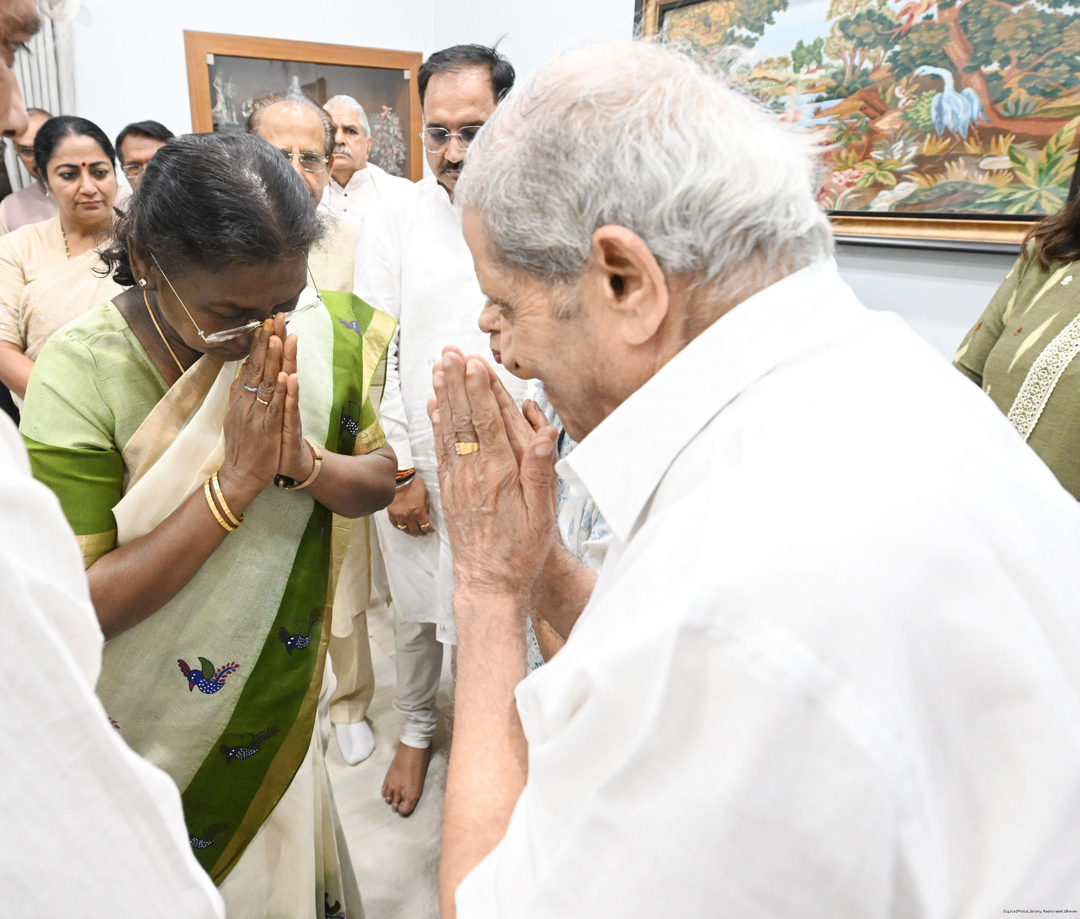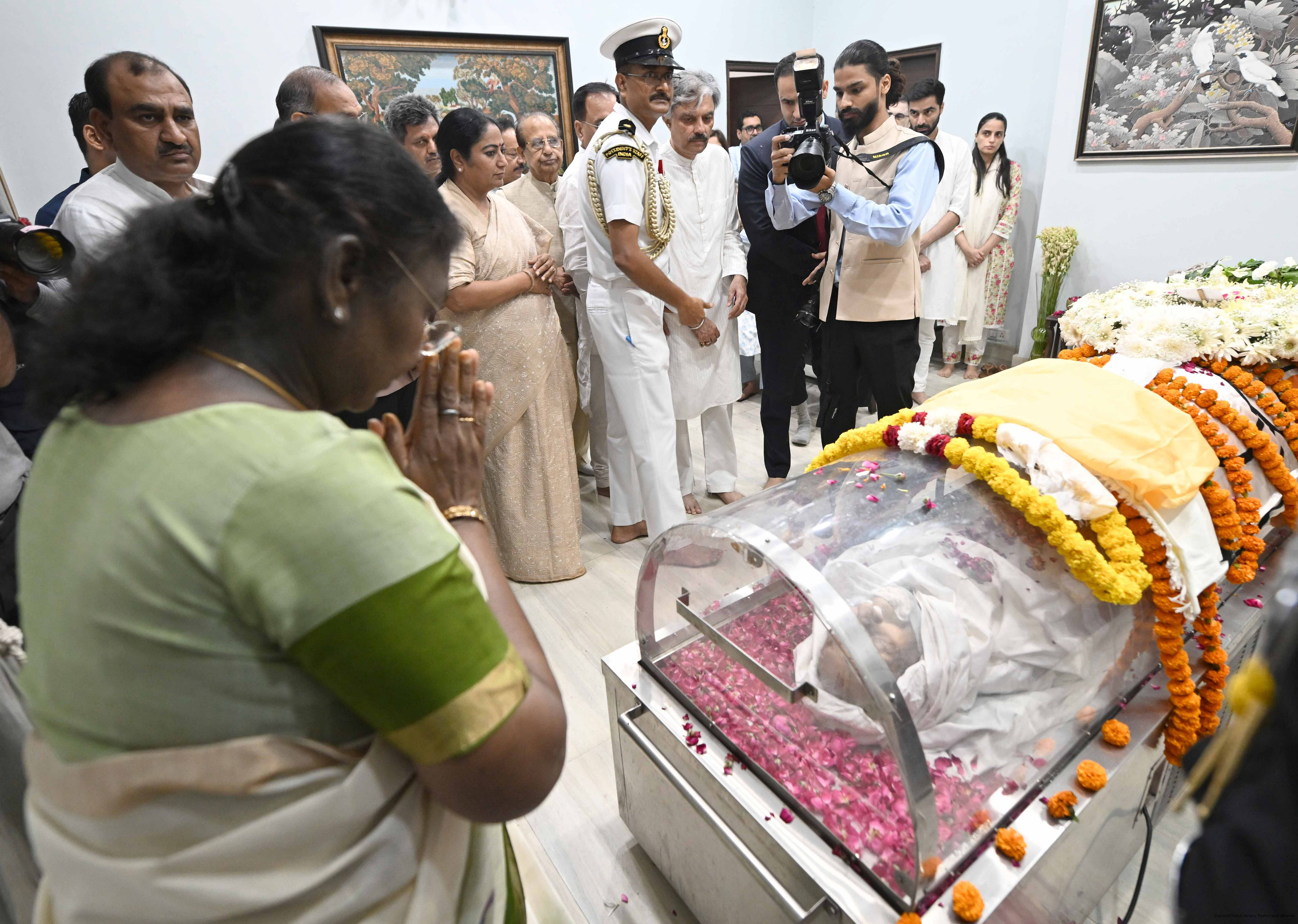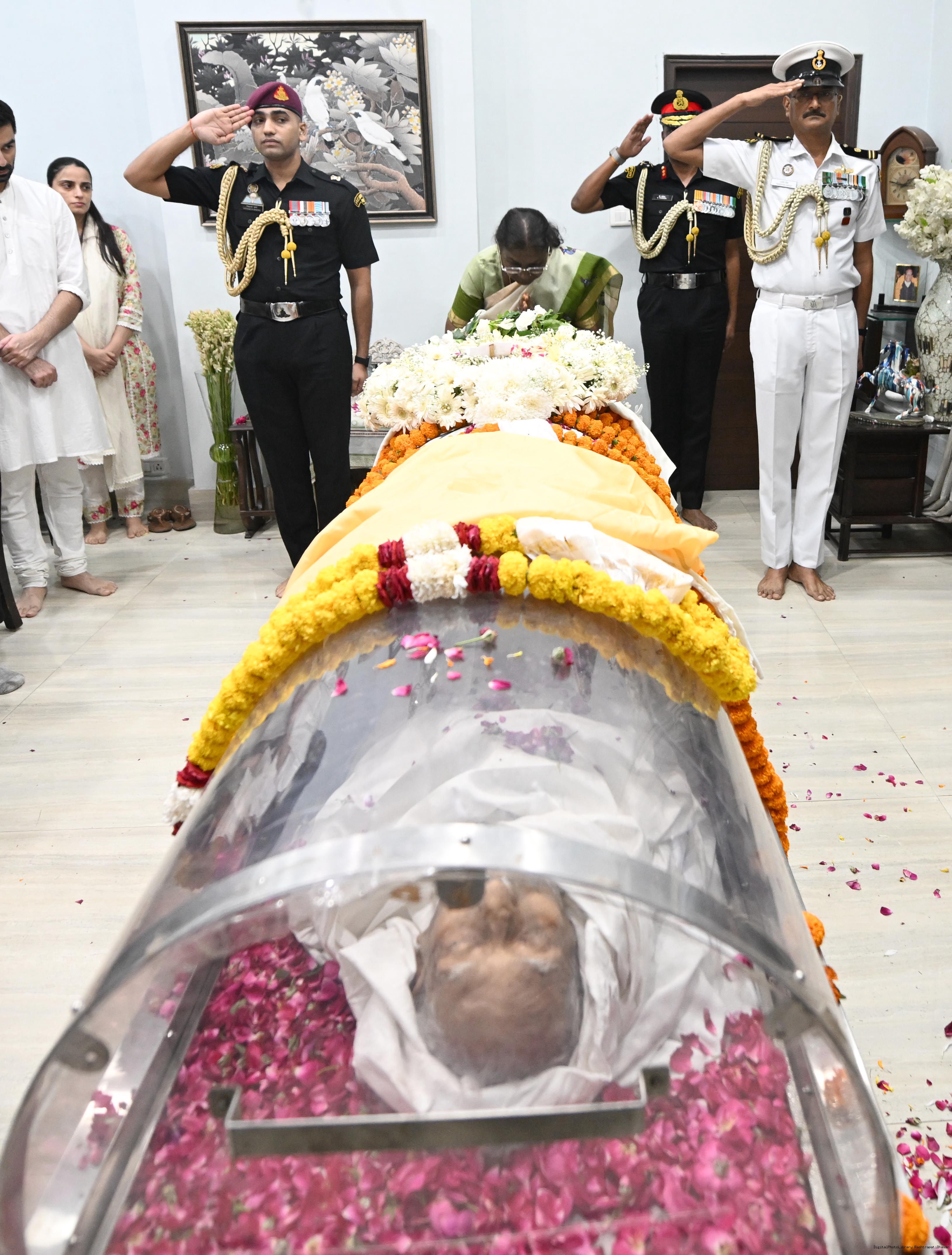 | Caption: | The President of India, Smt. Droupadi Murmu paid last respects to the eminent leader Shri Vijay Kumar Malhotra at his residence. She also offered her condolences to the family members of Shri Malhotra in New Delhi on September 30, 2025. |