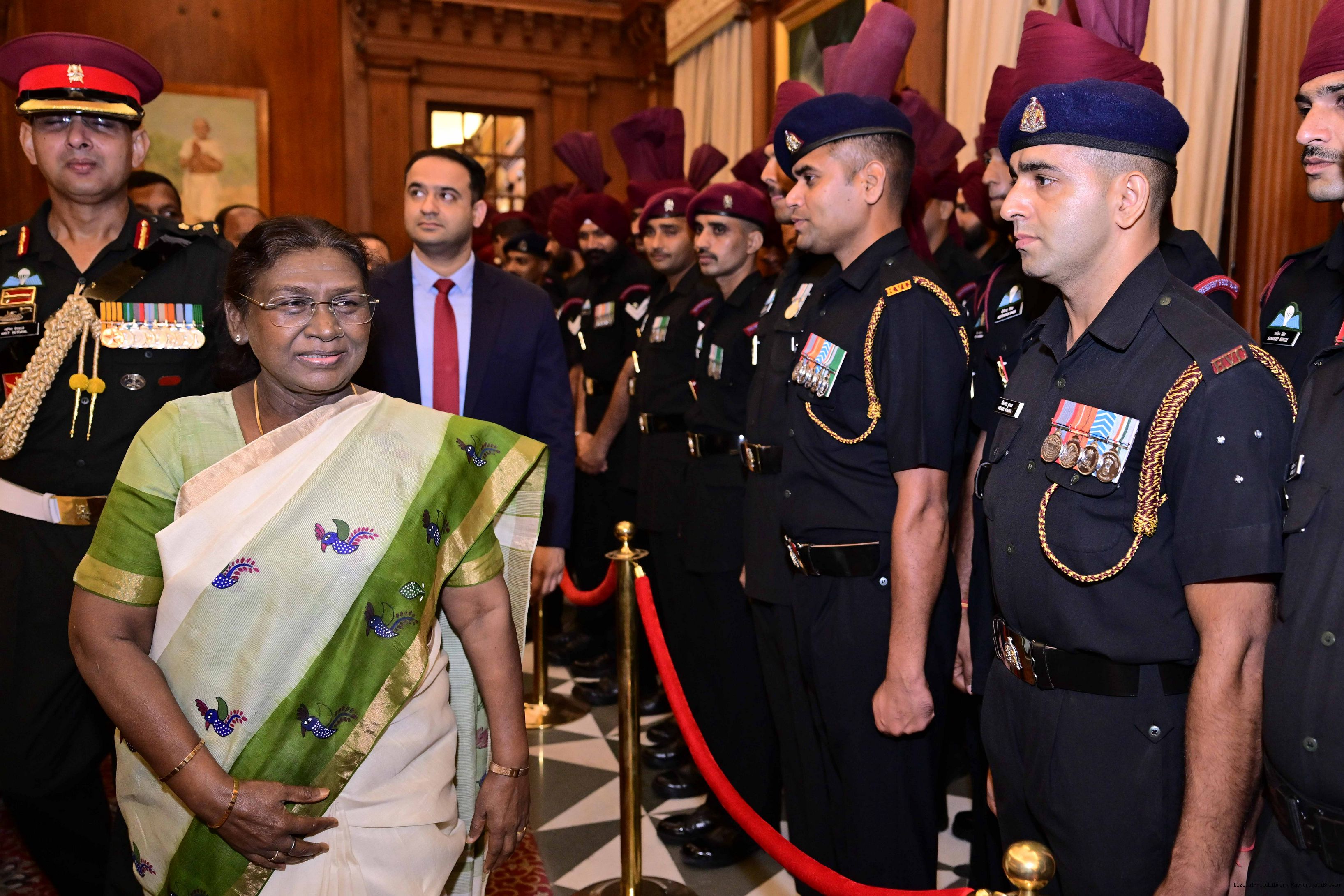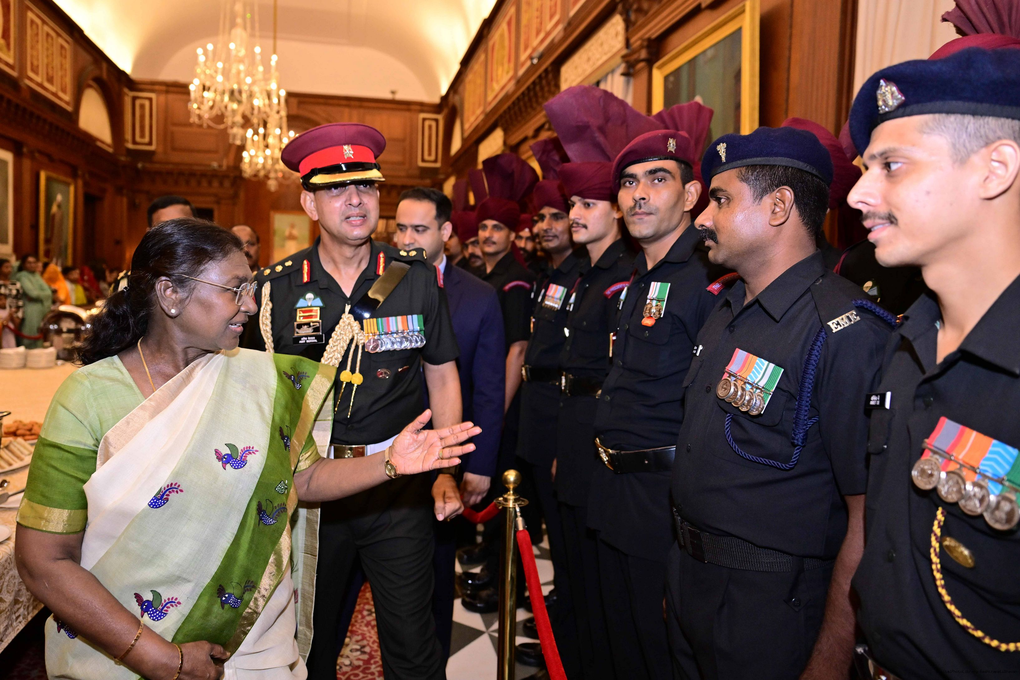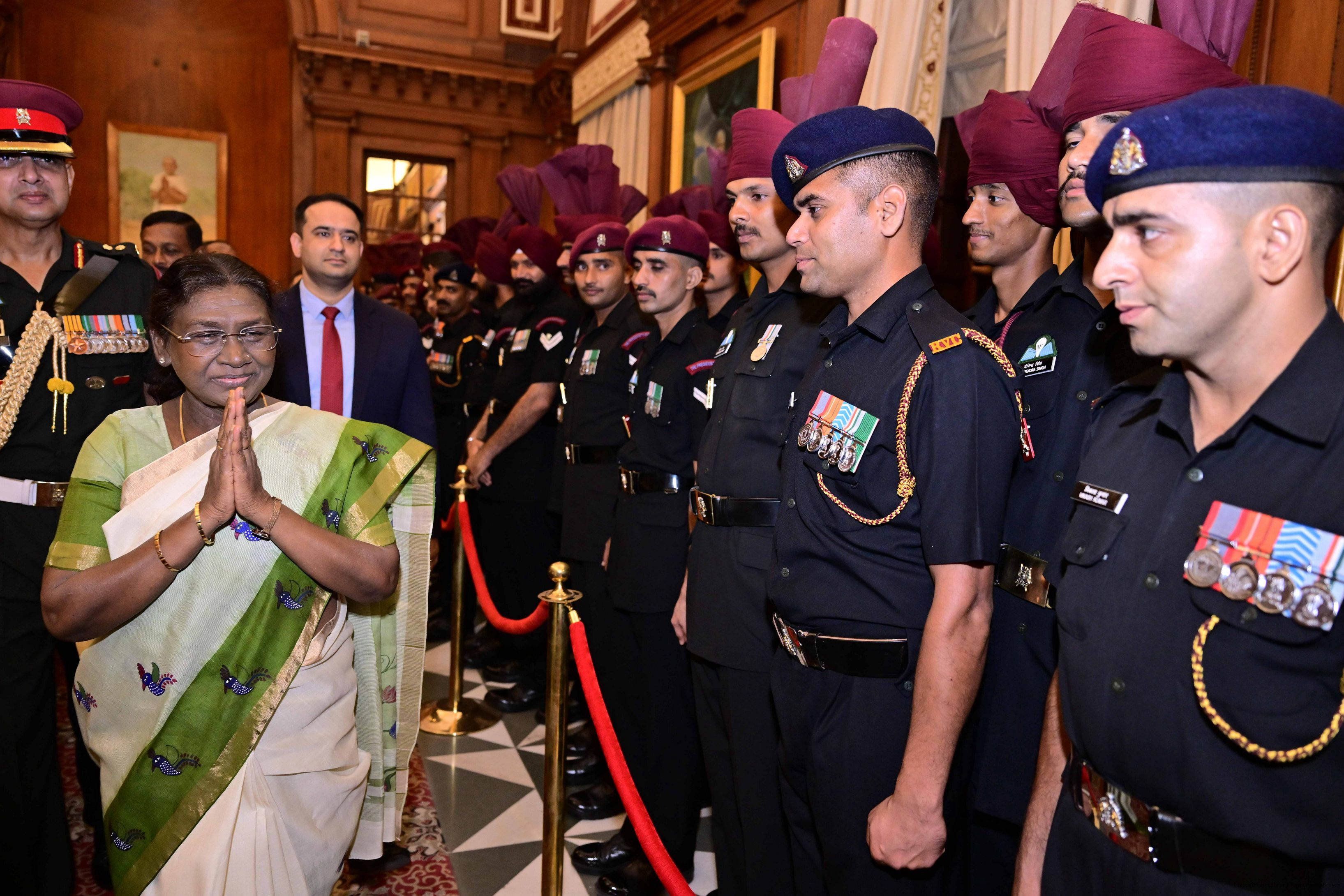 | Caption: | The President of India, Smt. Droupadi Murmu met and posing a group photograph with PBG personnel on the occasion of 75 years of being designated 'The President's Bodyguards' at Rashtrapati Bhavan on September 30, 2025. |