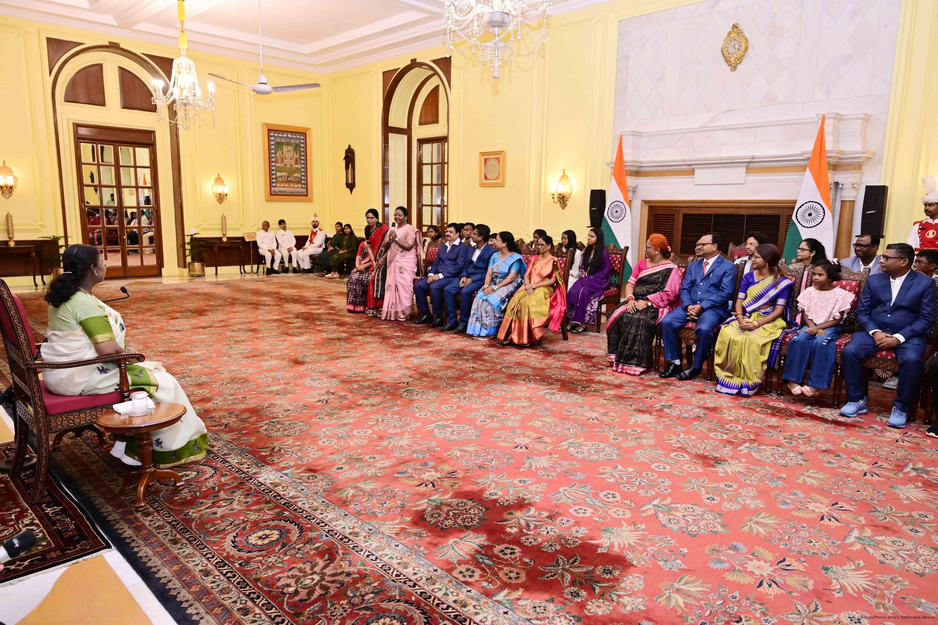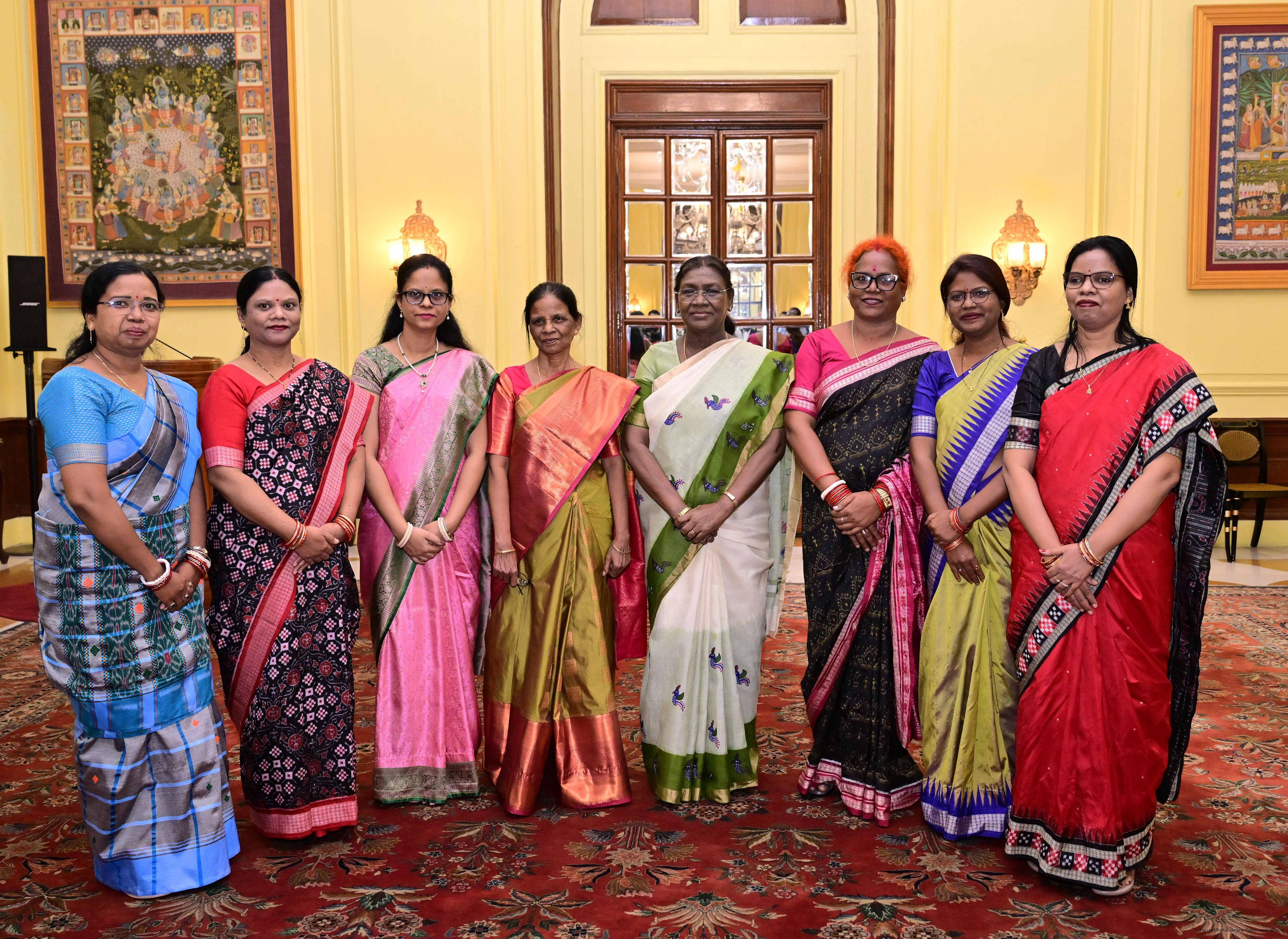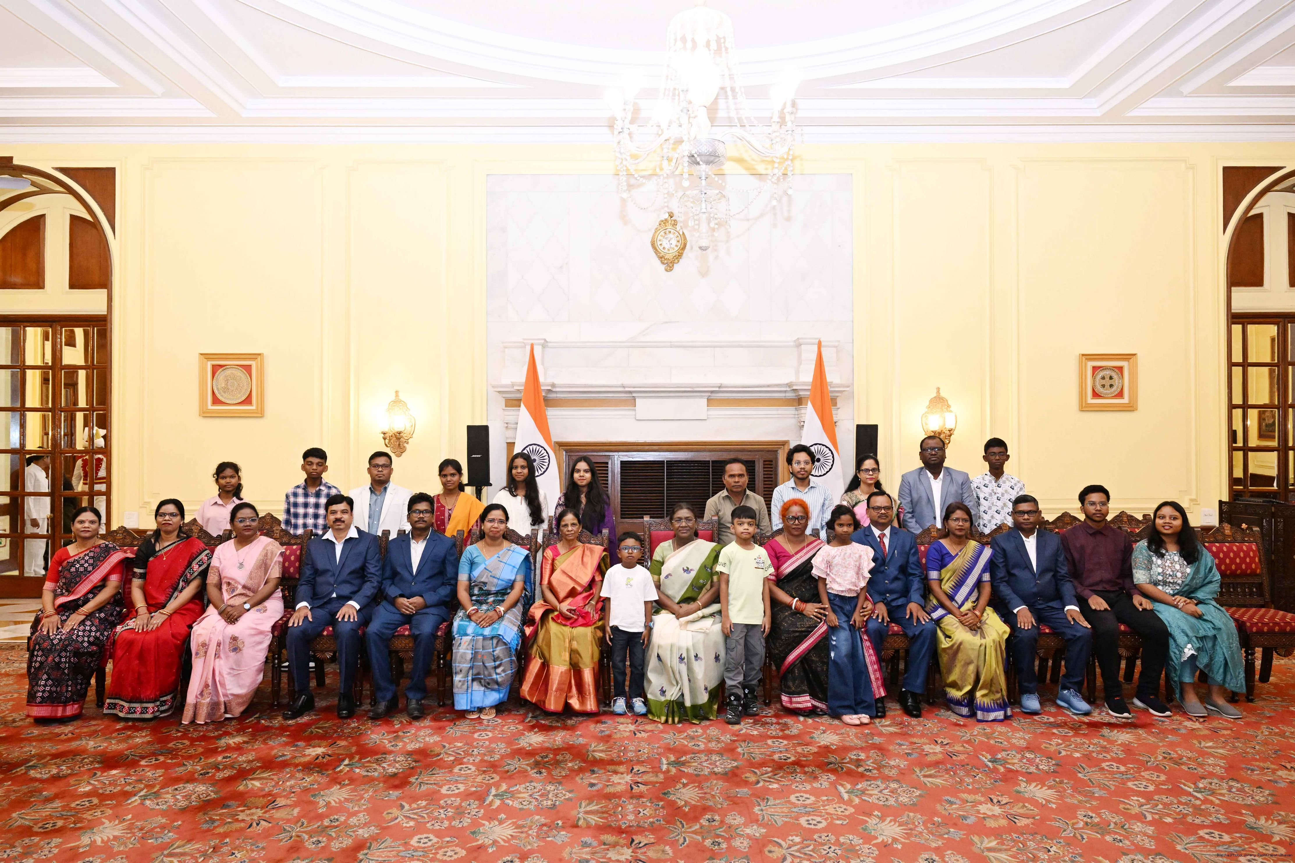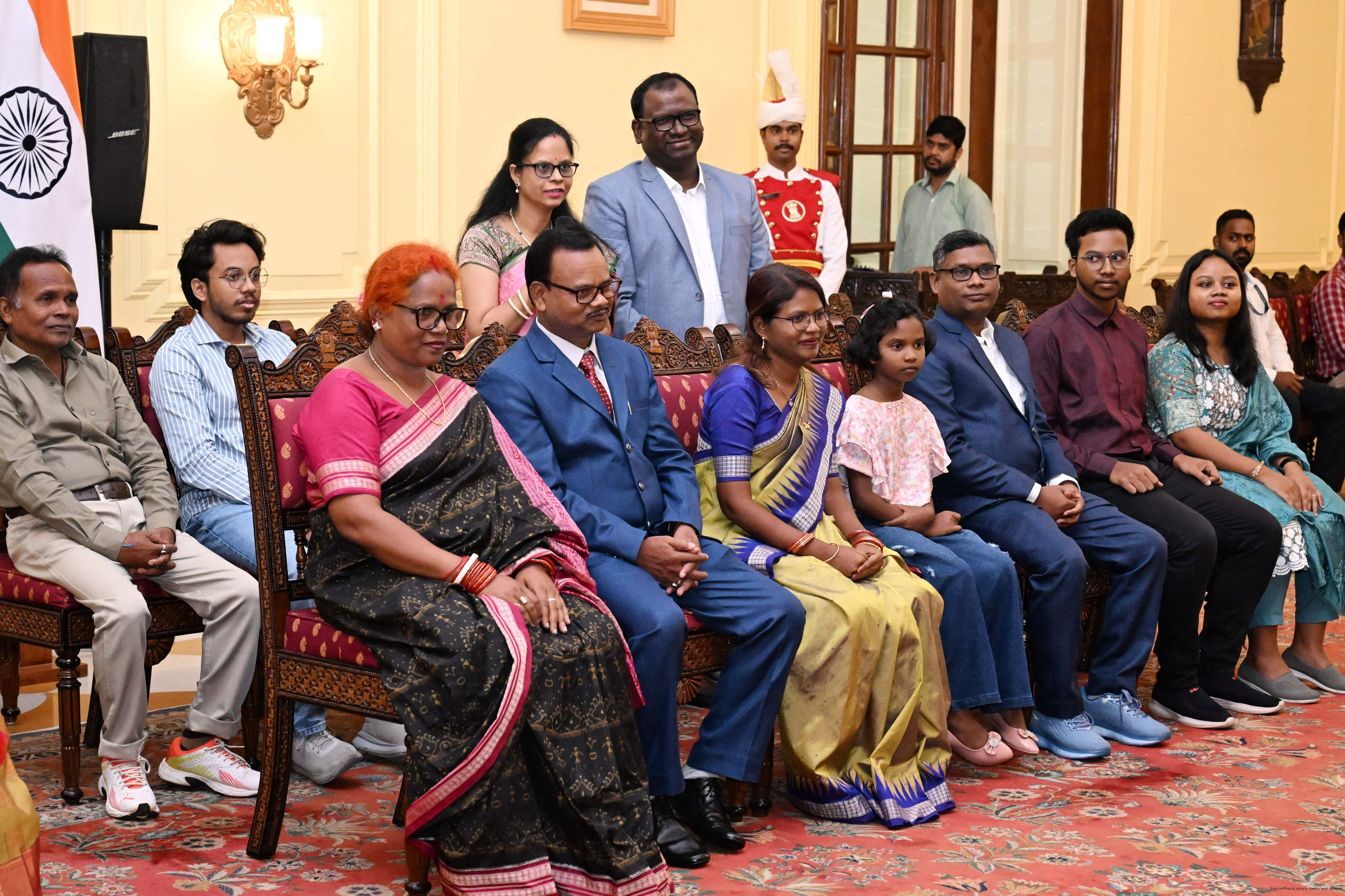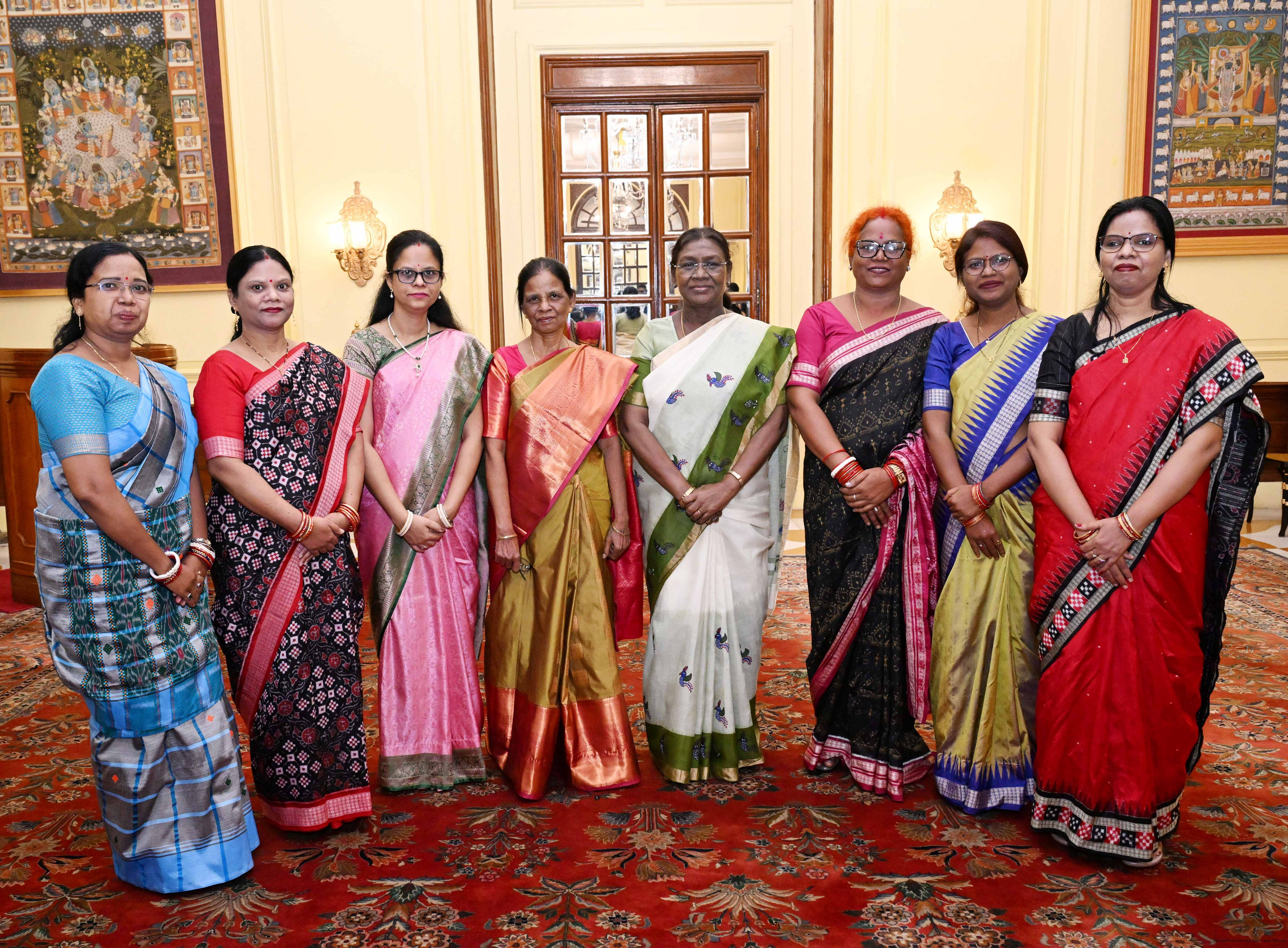 | Caption: | Smt. Saraswati Soren, Gadadharpur, Mayurbhanj along with 26 others meeting with the President of India, Smt. Droupadi Murmu at Rashtrapati Bhavan on September 30, 2025. |