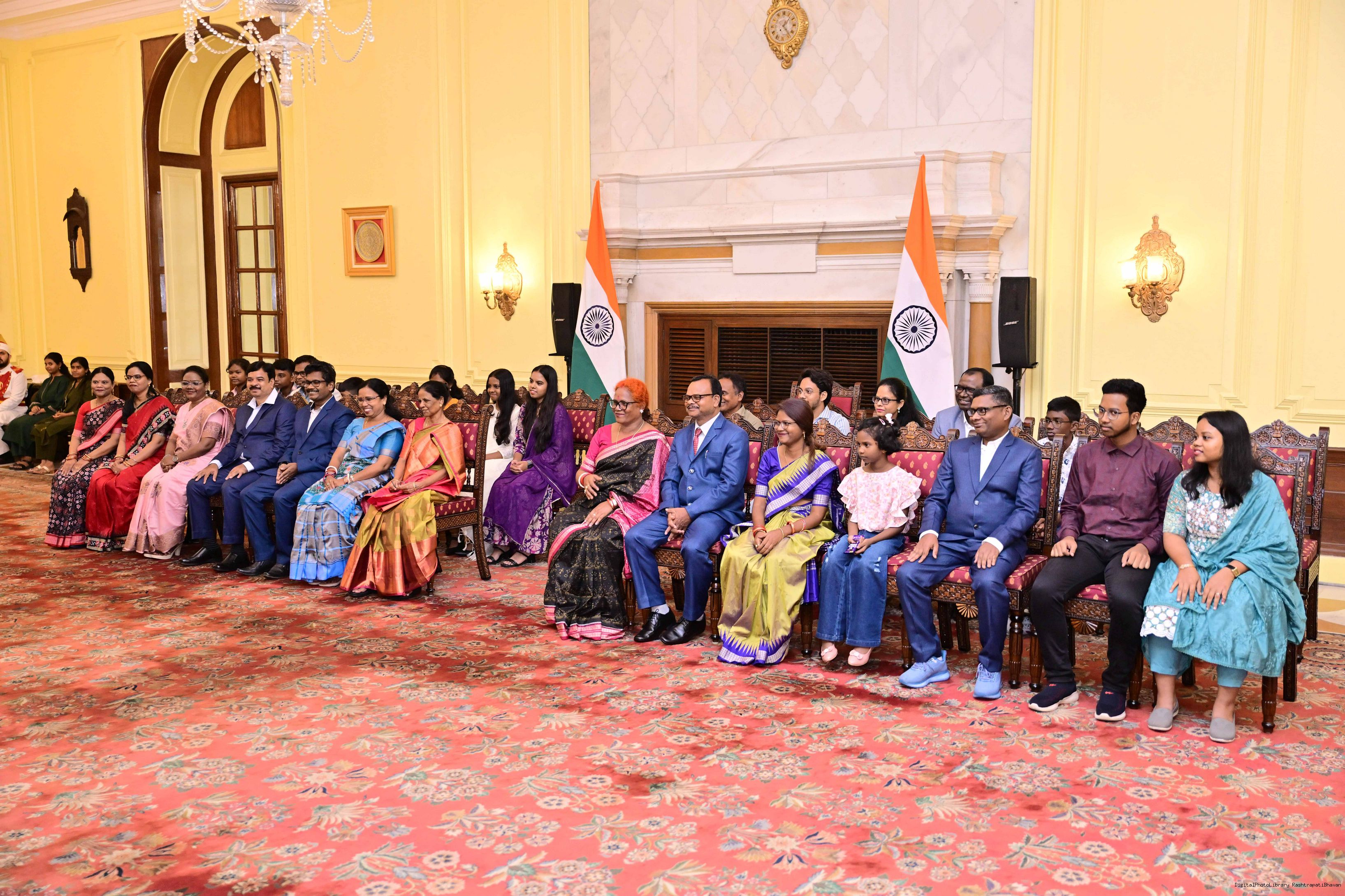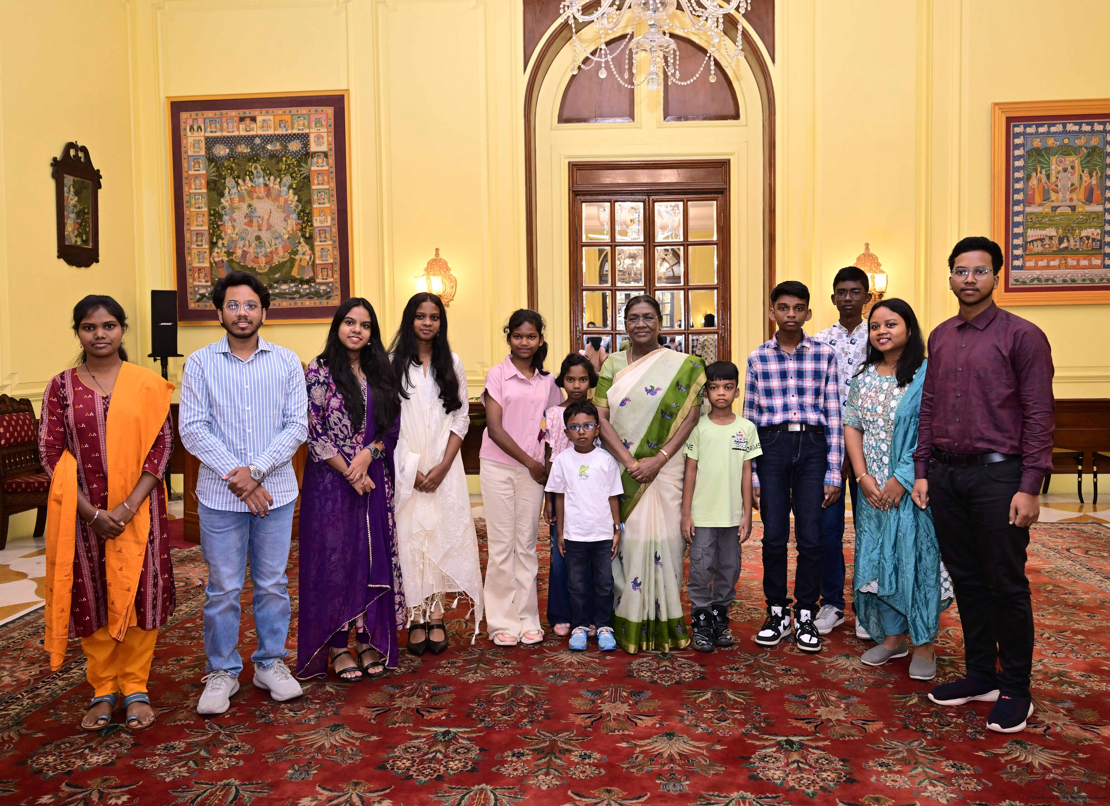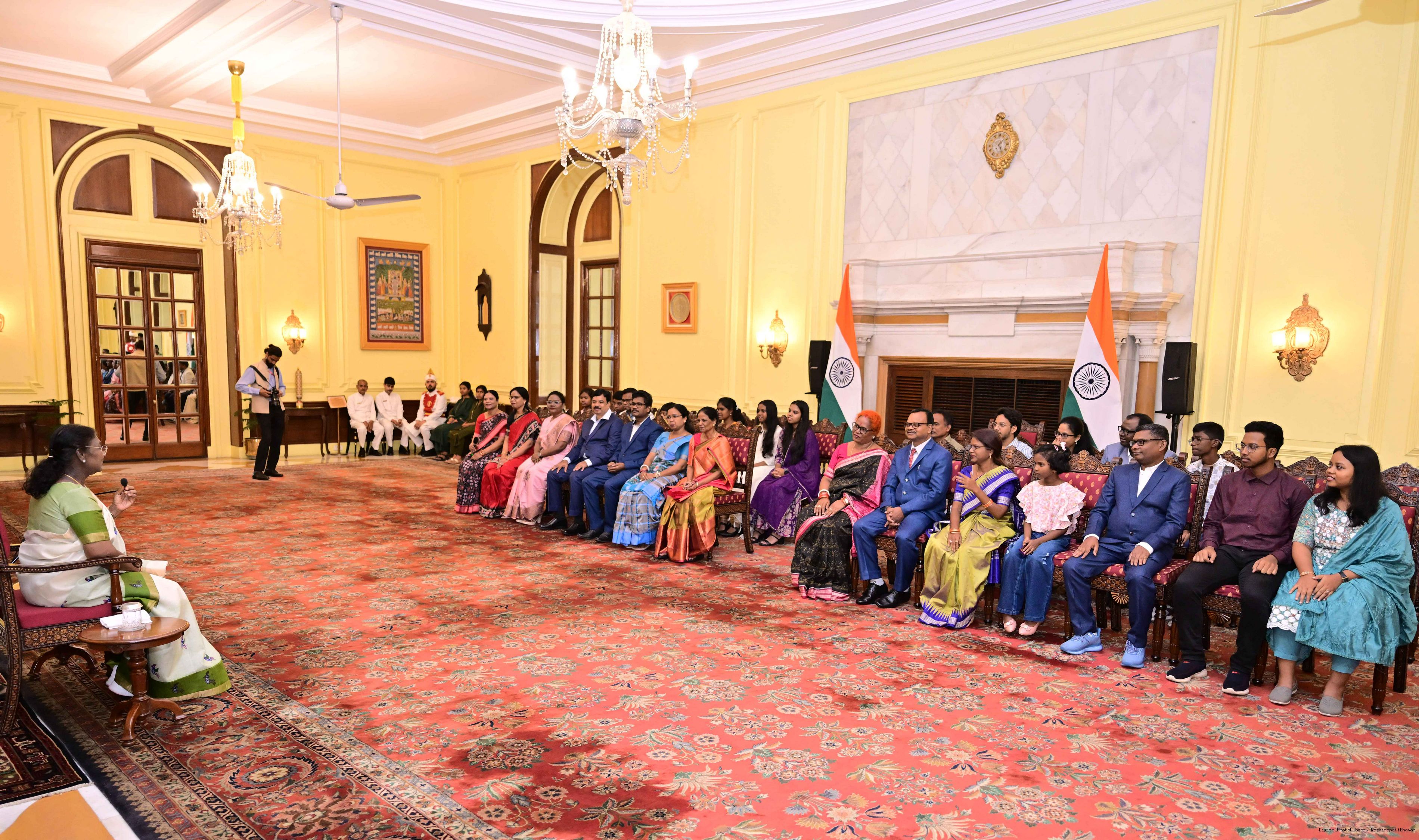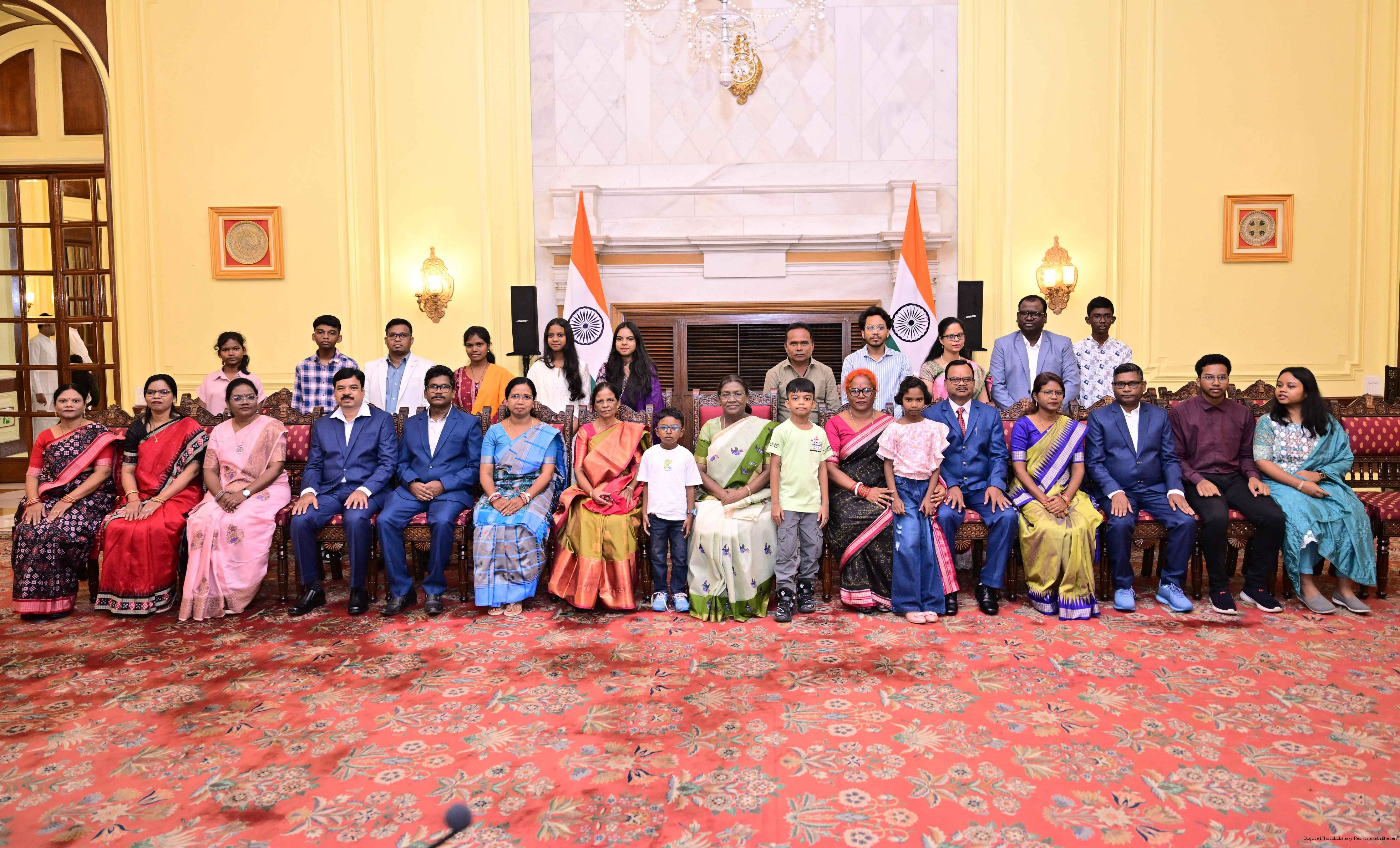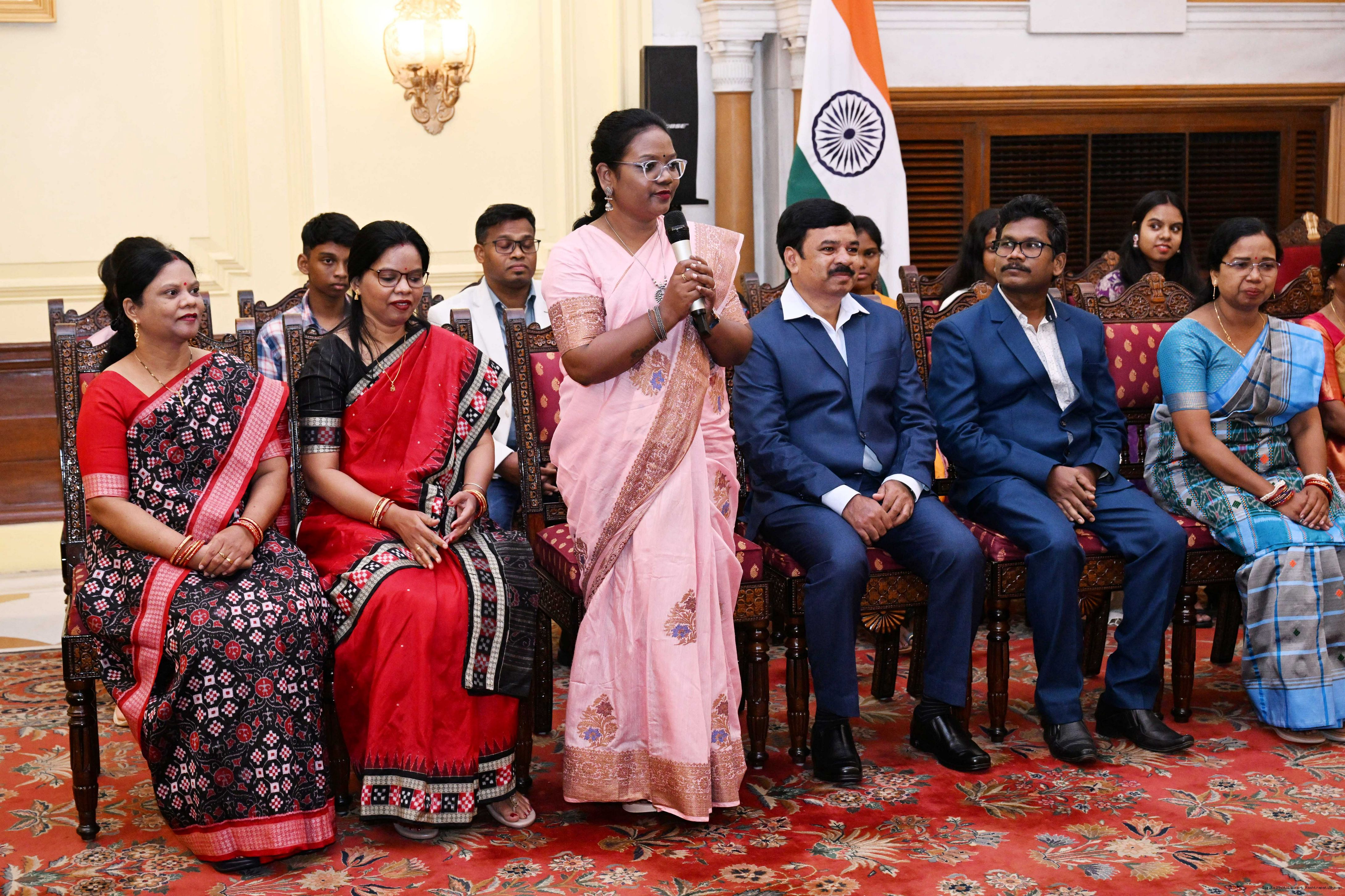 | Caption: | Smt. Saraswati Soren, Gadadharpur, Mayurbhanj along with 26 others meeting with the President of India, Smt. Droupadi Murmu at Rashtrapati Bhavan on September 30, 2025. |