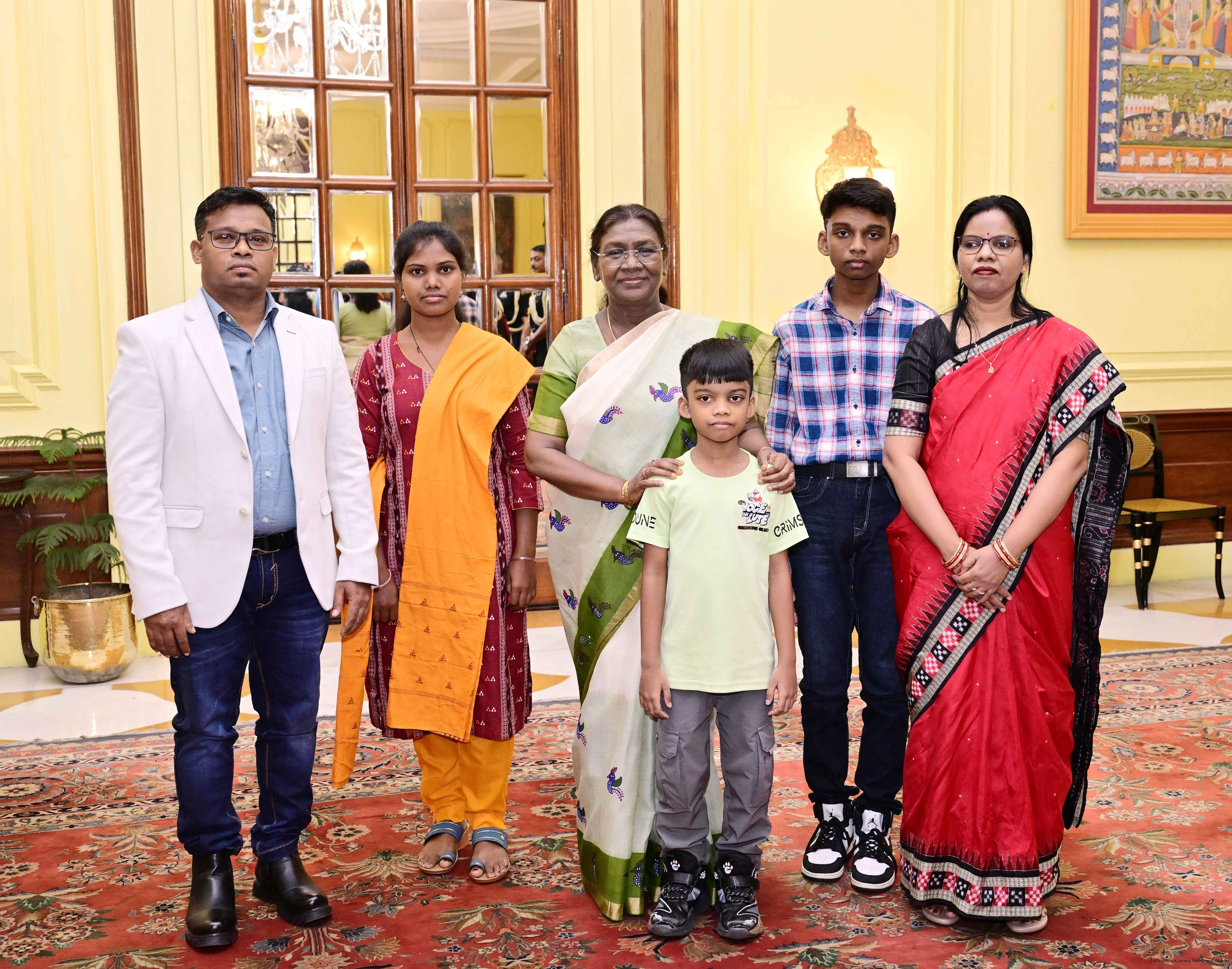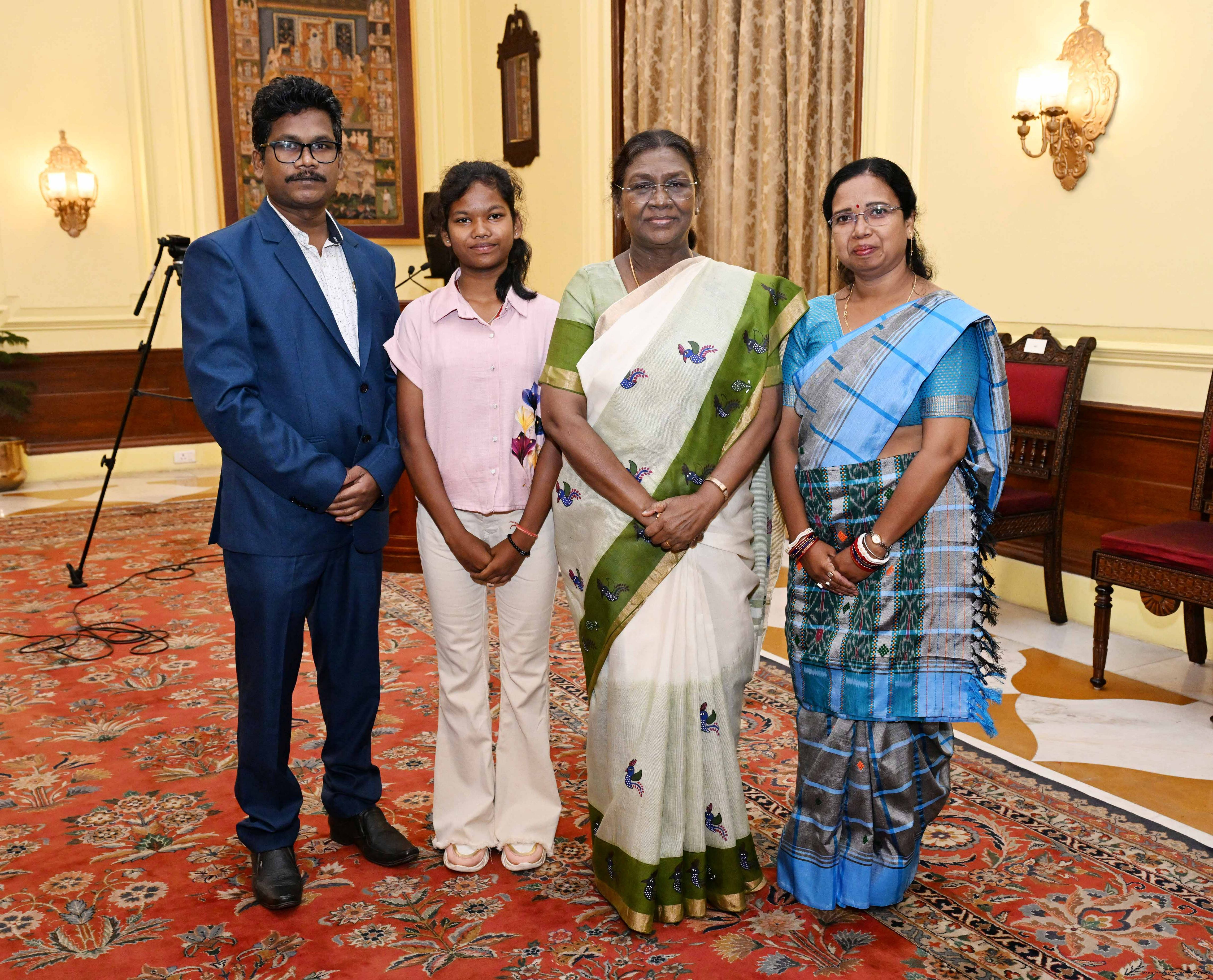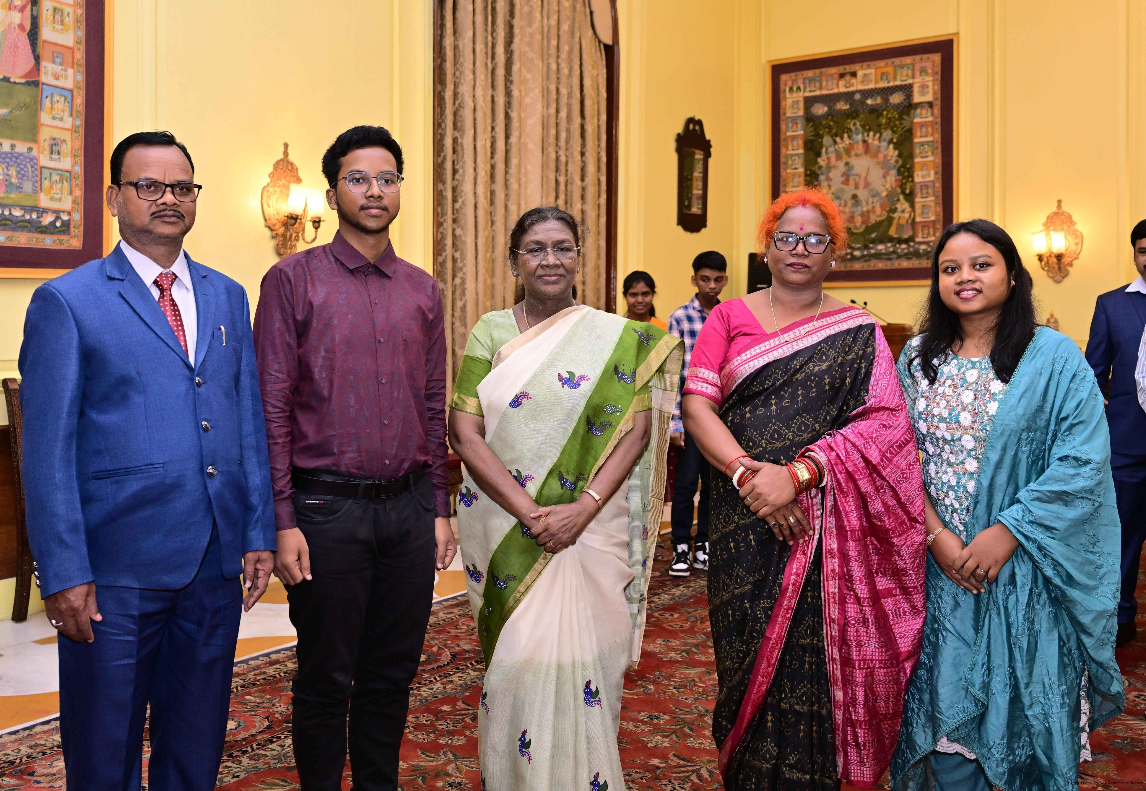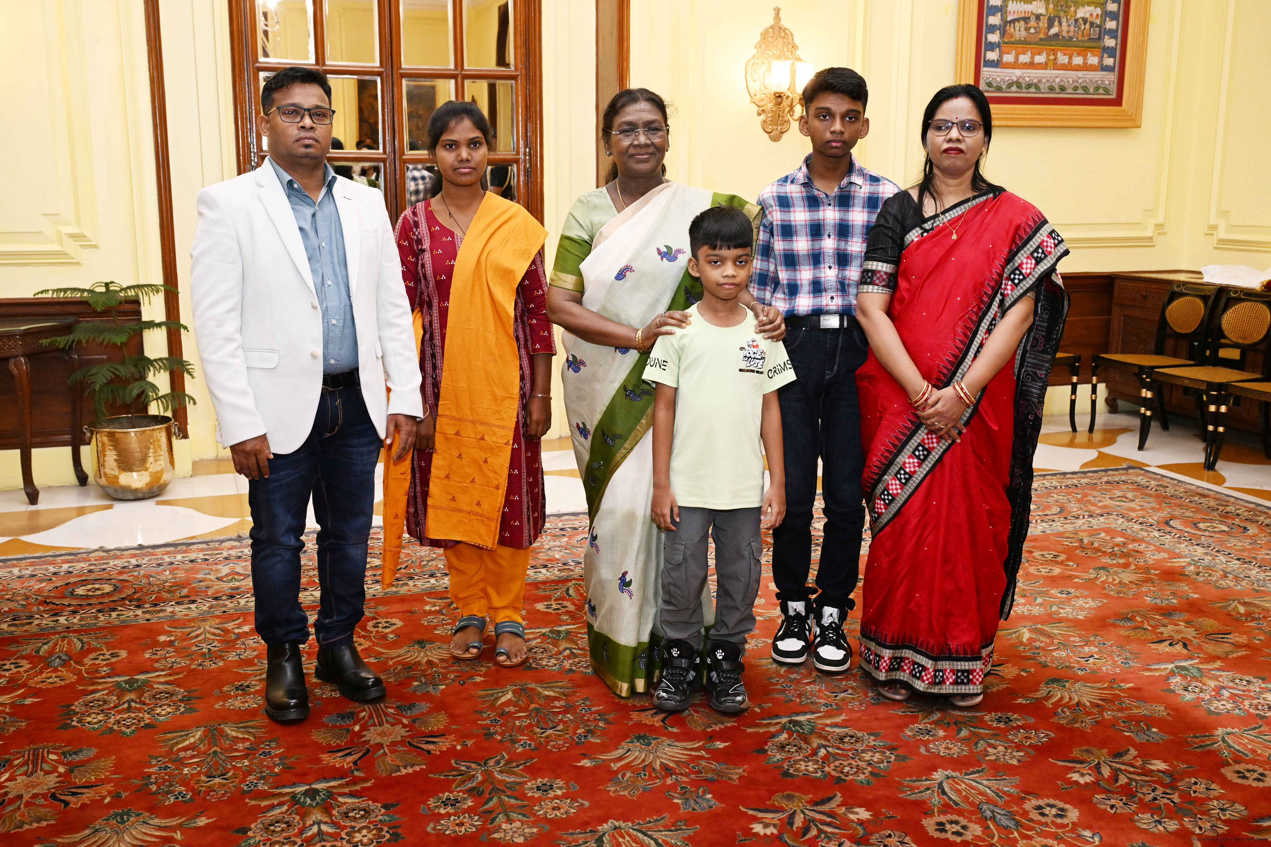 | Caption: | Smt. Saraswati Soren, Gadadharpur, Mayurbhanj along with 26 others meeting with the President of India, Smt. Droupadi Murmu at Rashtrapati Bhavan on September 30, 2025. |