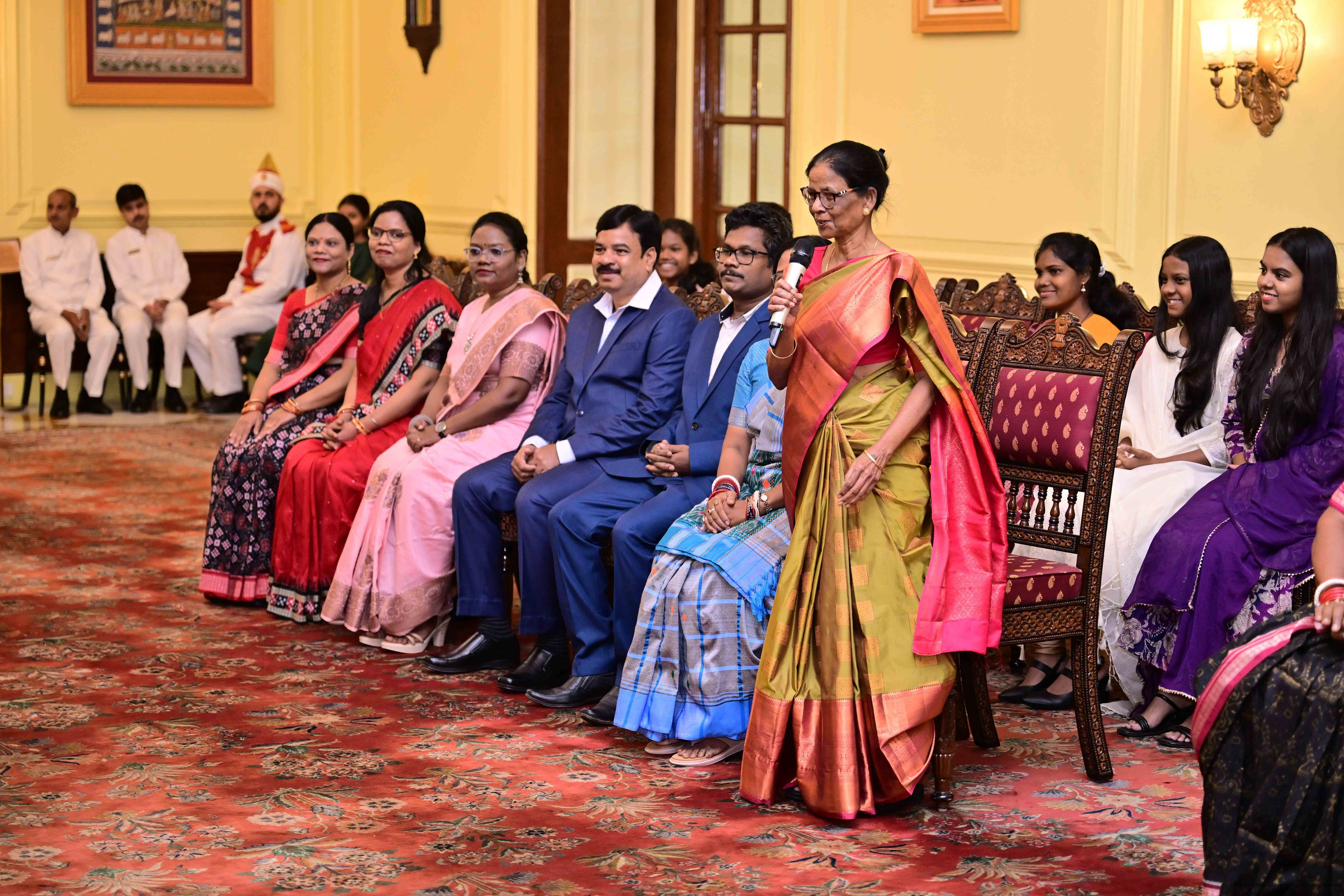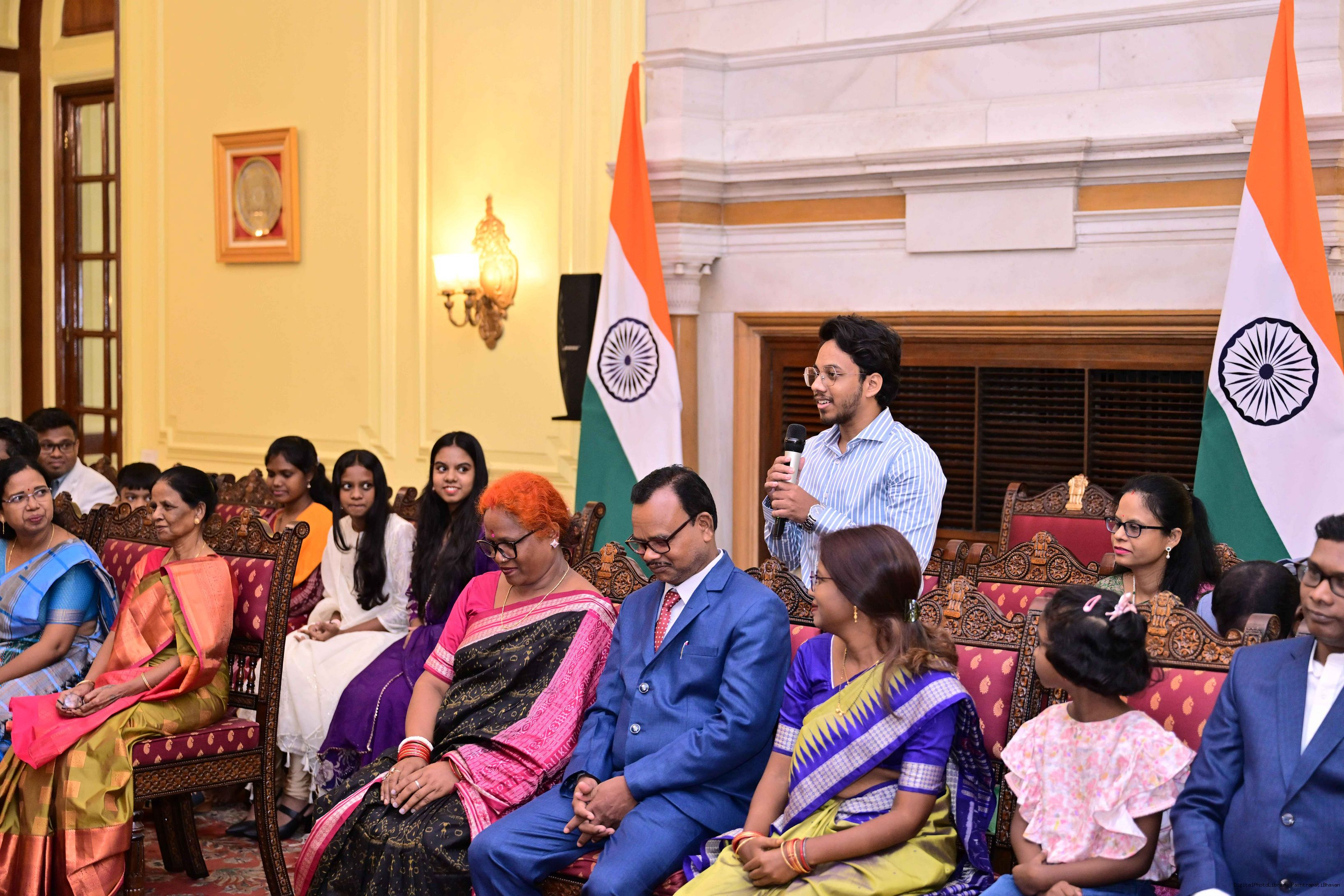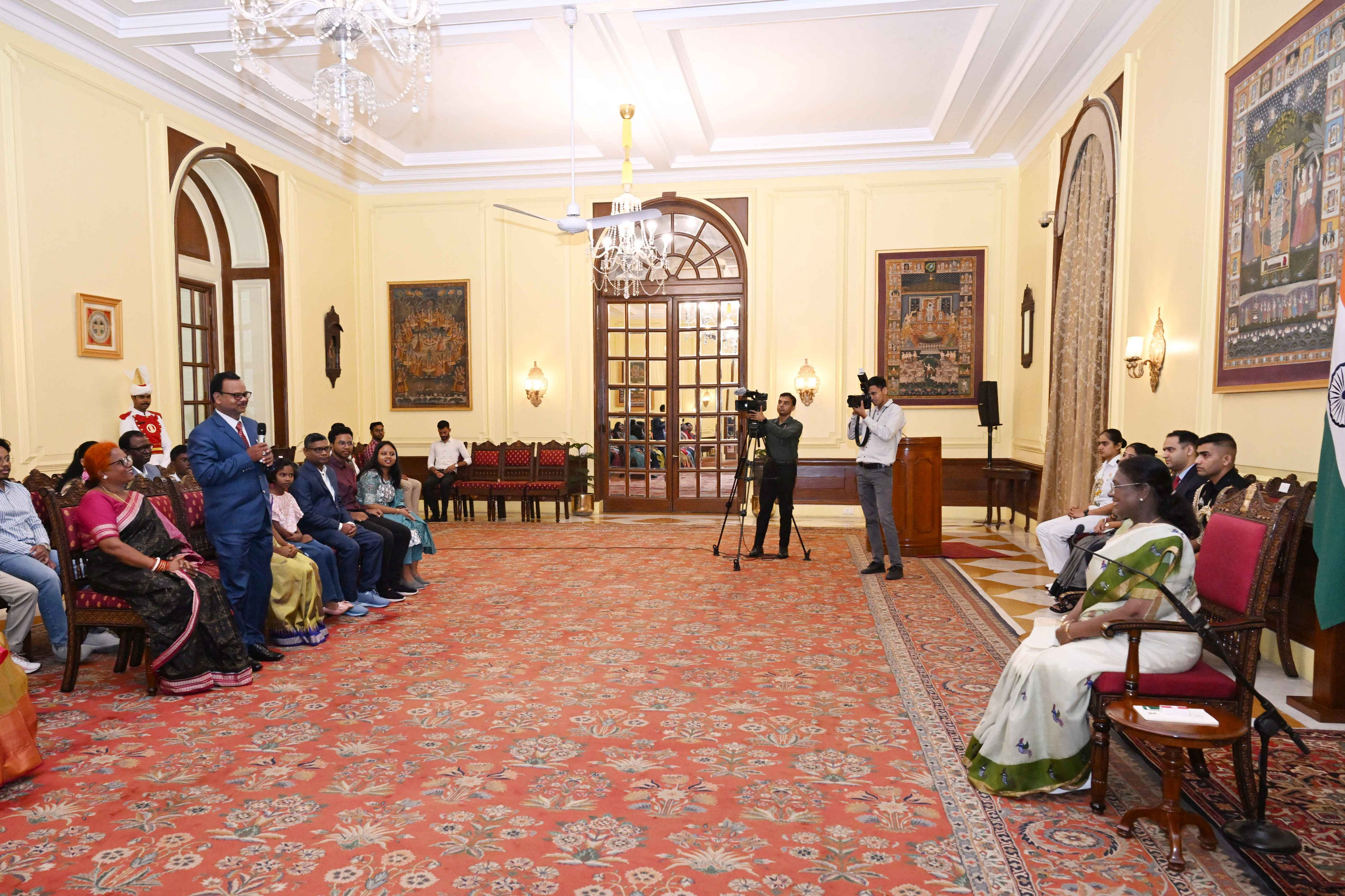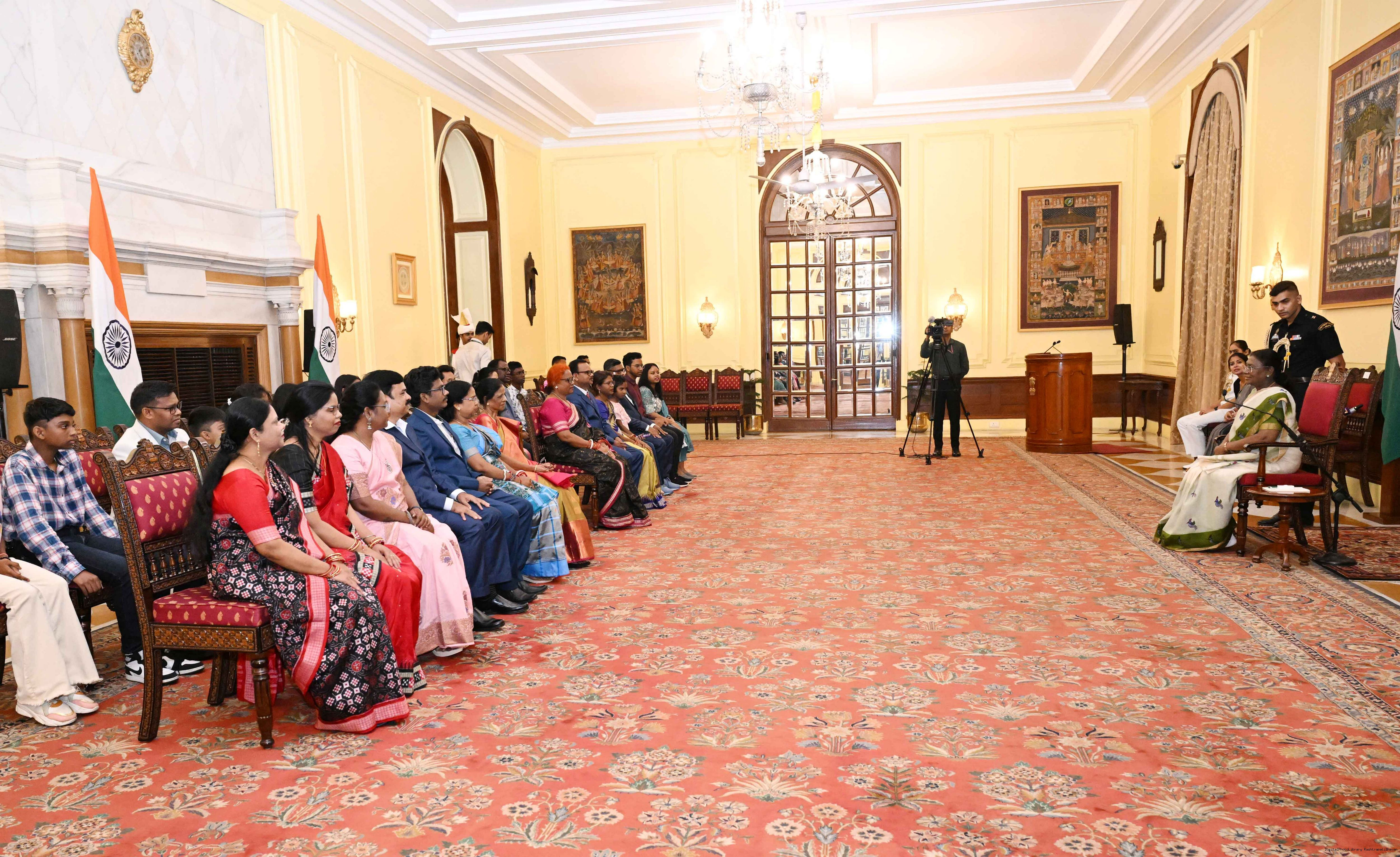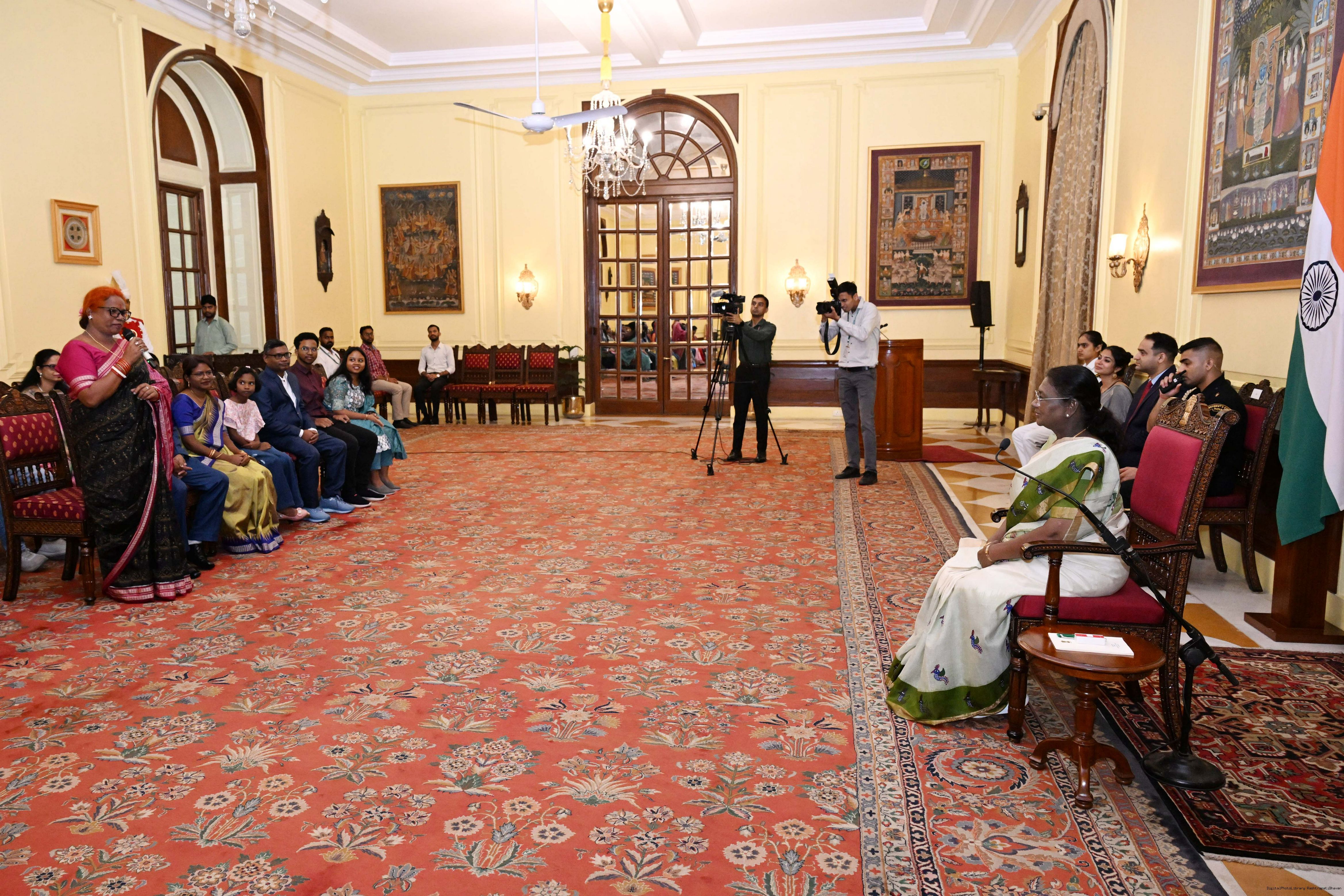 | Caption: | Smt. Saraswati Soren, Gadadharpur, Mayurbhanj along with 26 others meeting with the President of India, Smt. Droupadi Murmu at Rashtrapati Bhavan on September 30, 2025. |