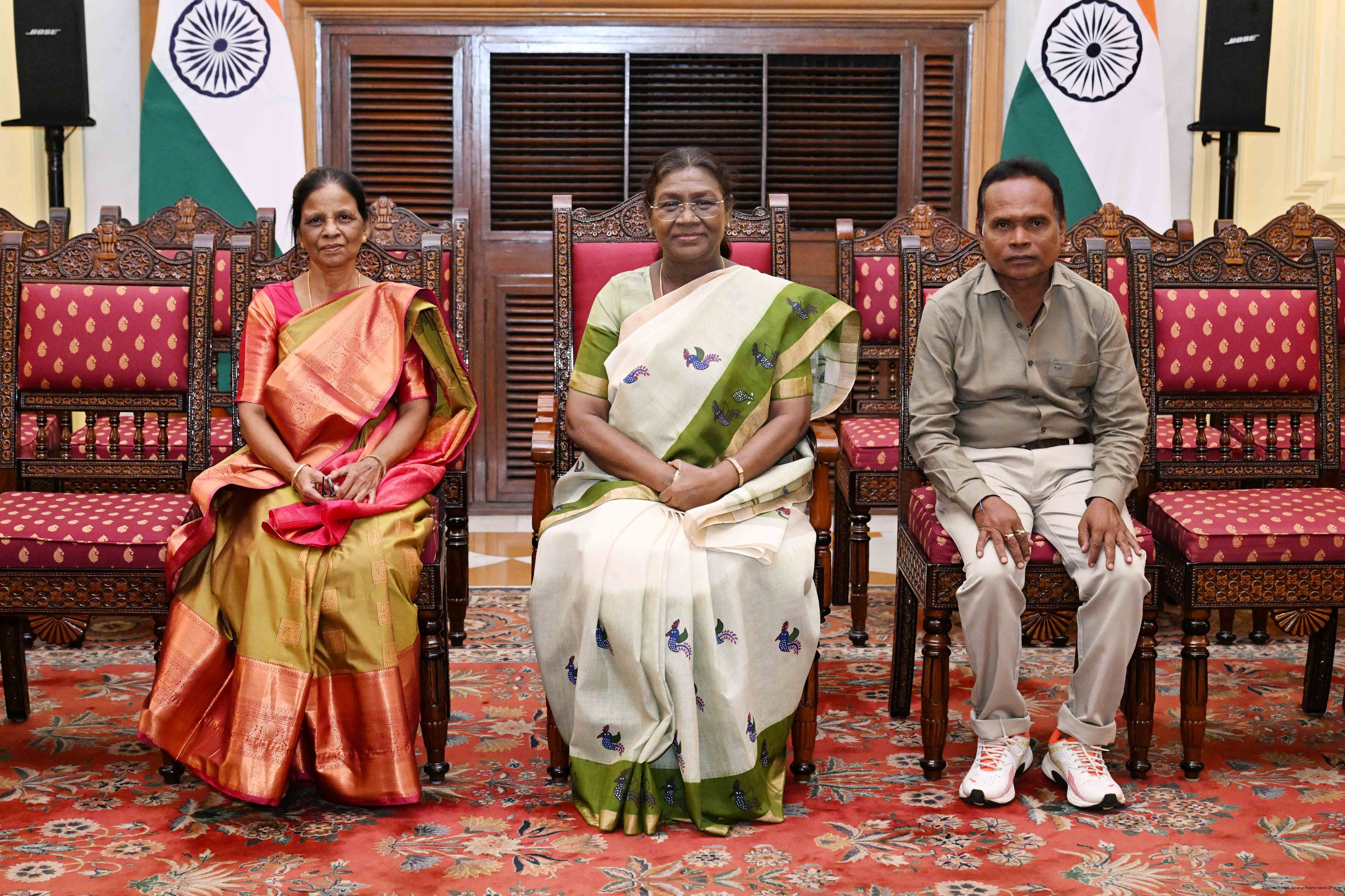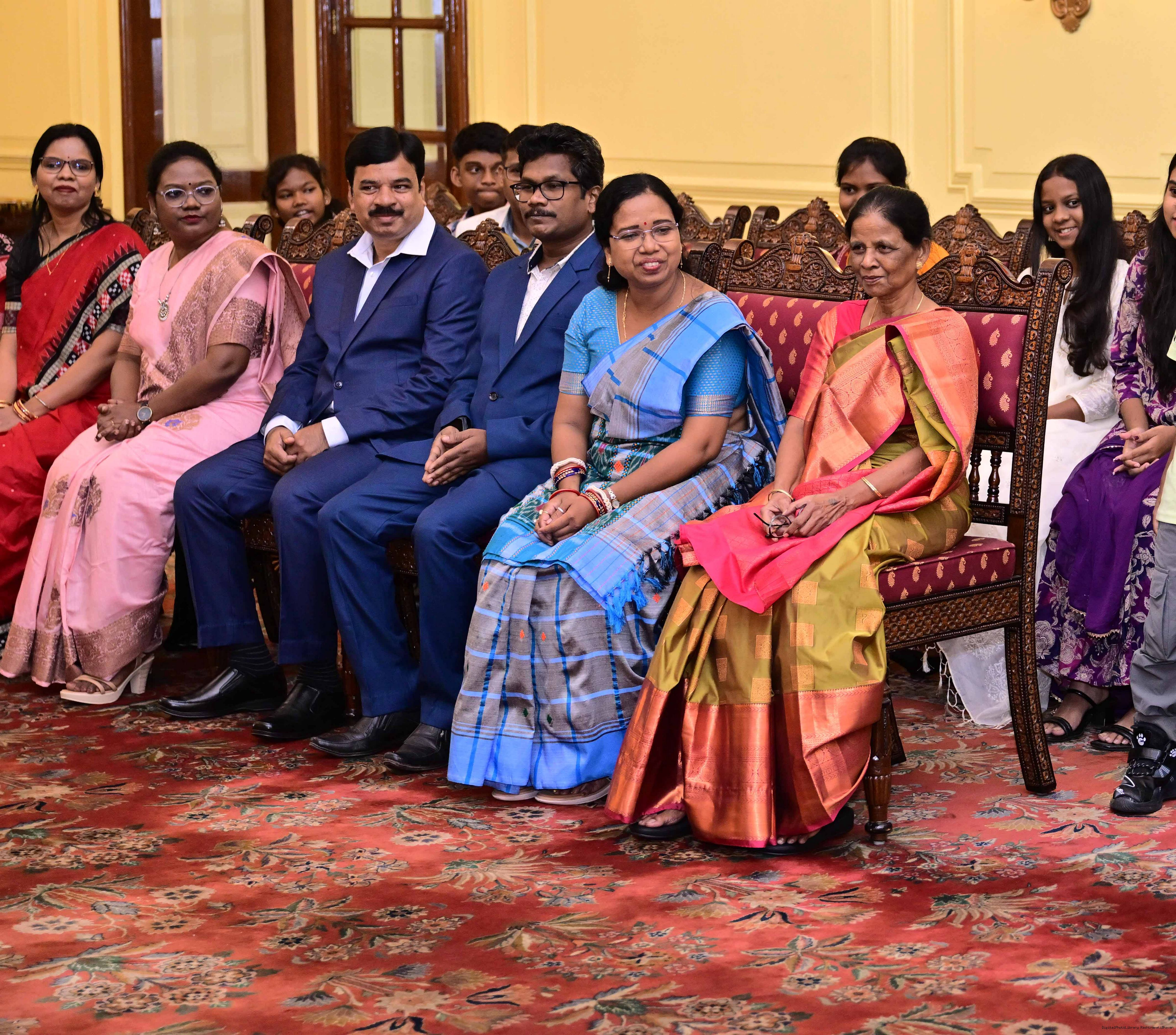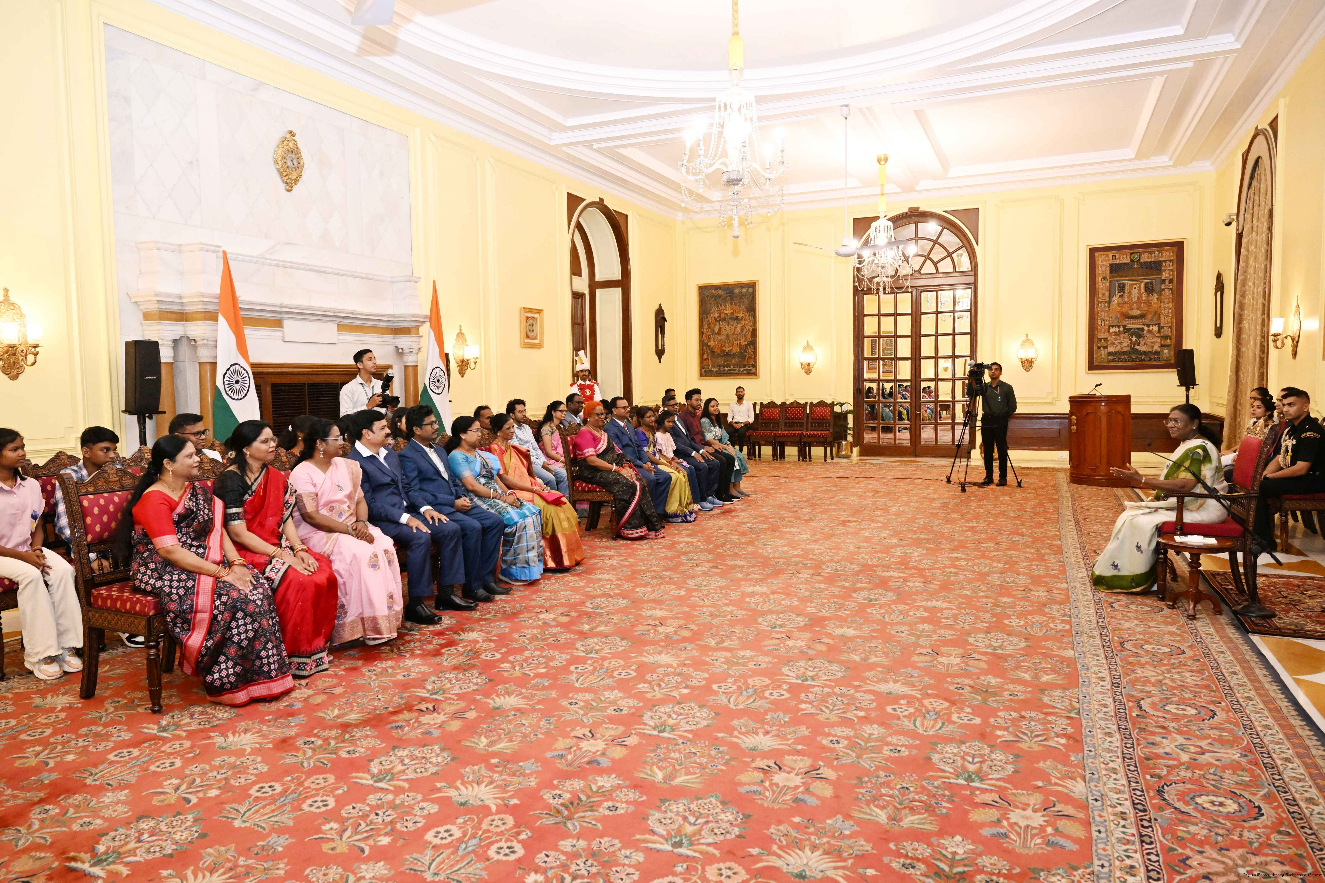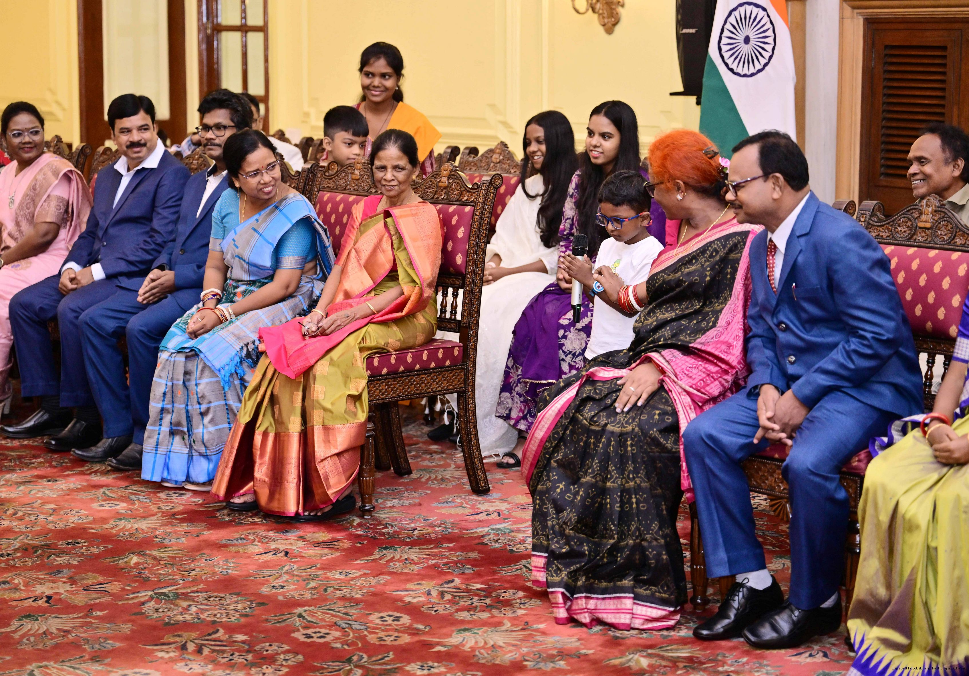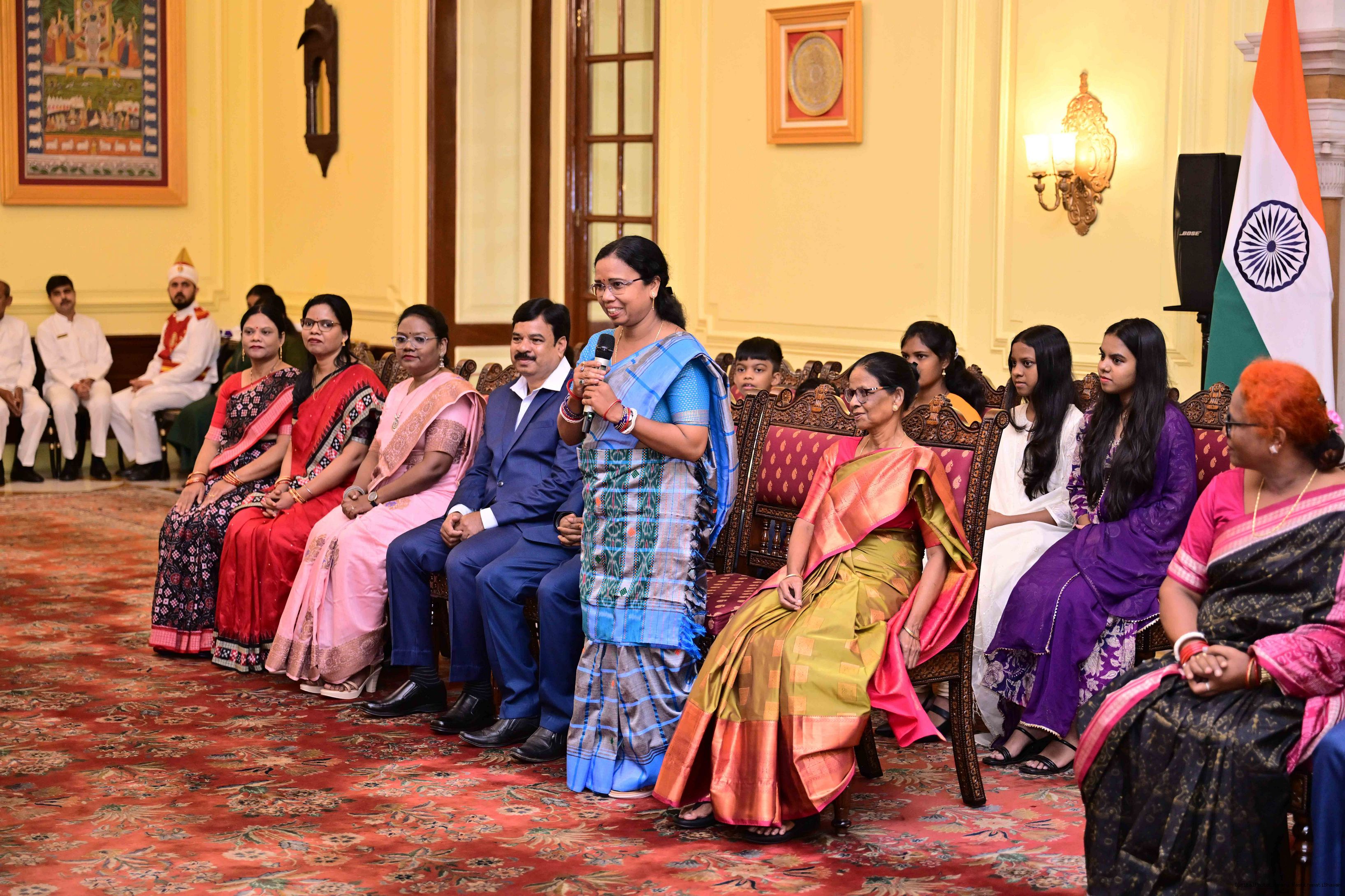 | Caption: | Smt. Saraswati Soren, Gadadharpur, Mayurbhanj along with 26 others meeting with the President of India, Smt. Droupadi Murmu at Rashtrapati Bhavan on September 30, 2025. |