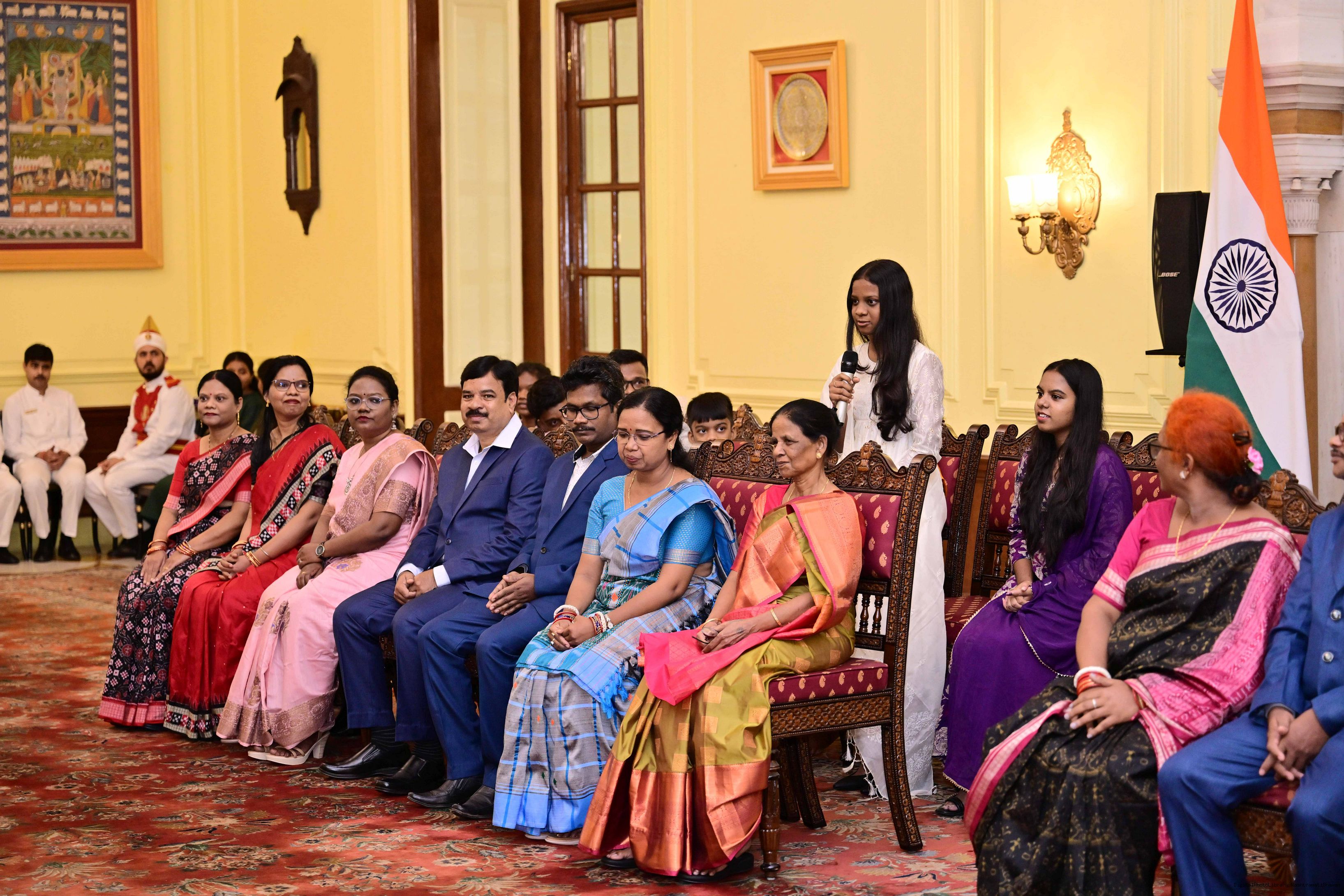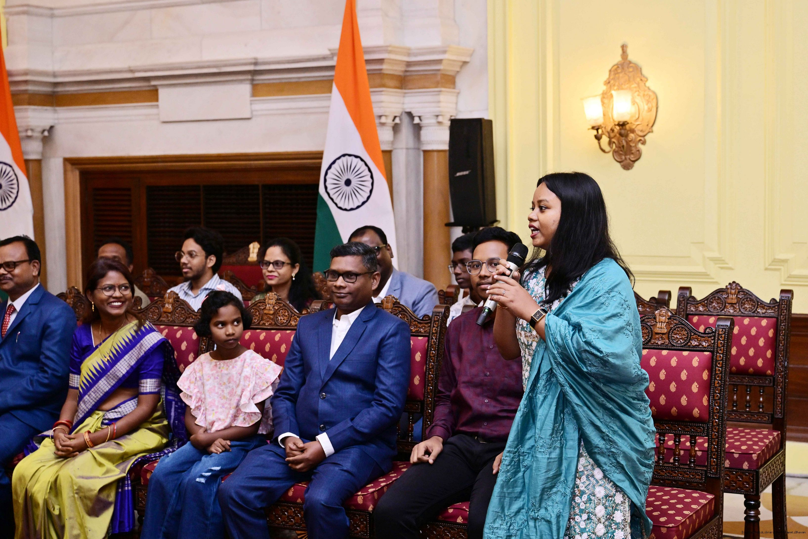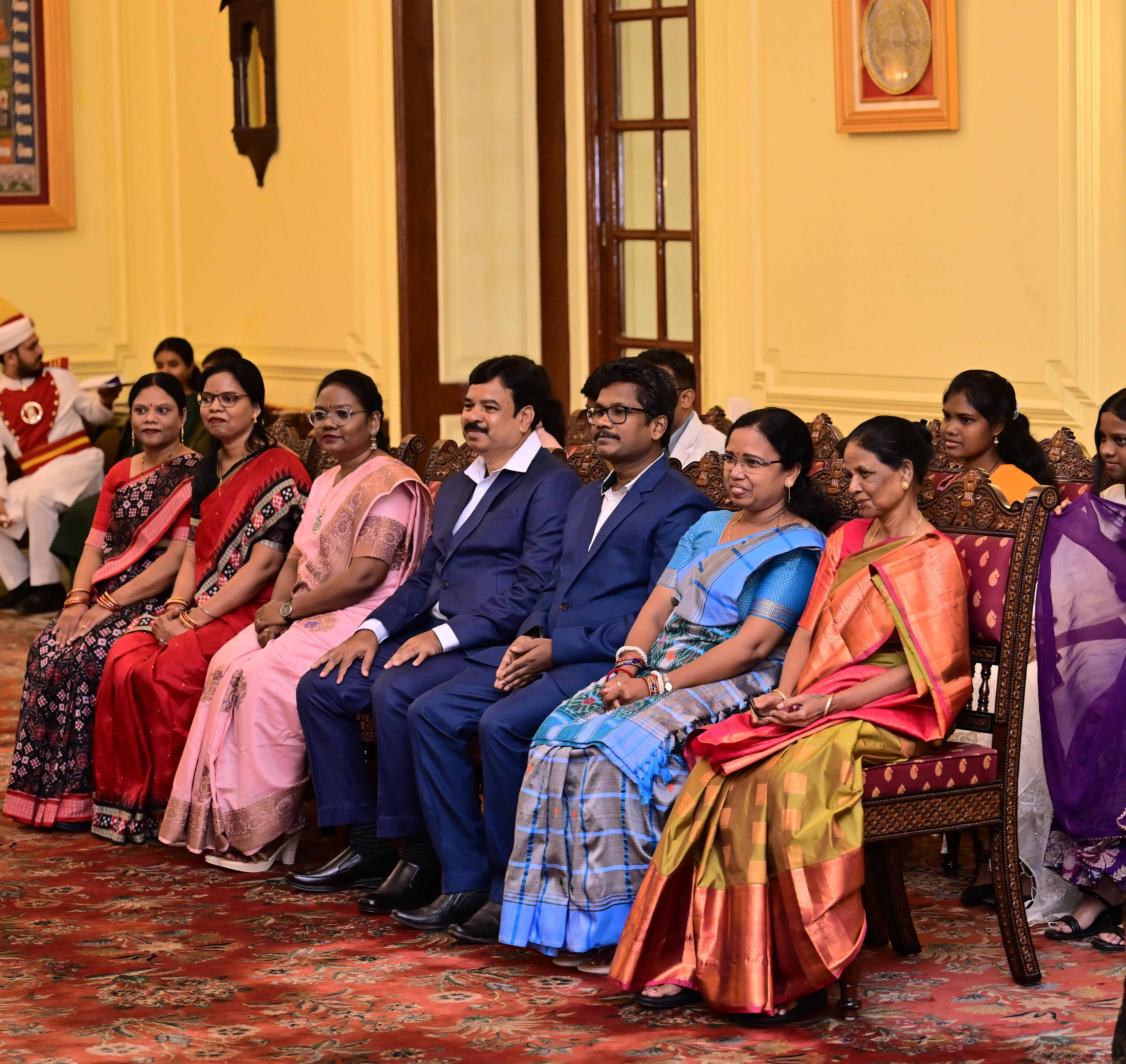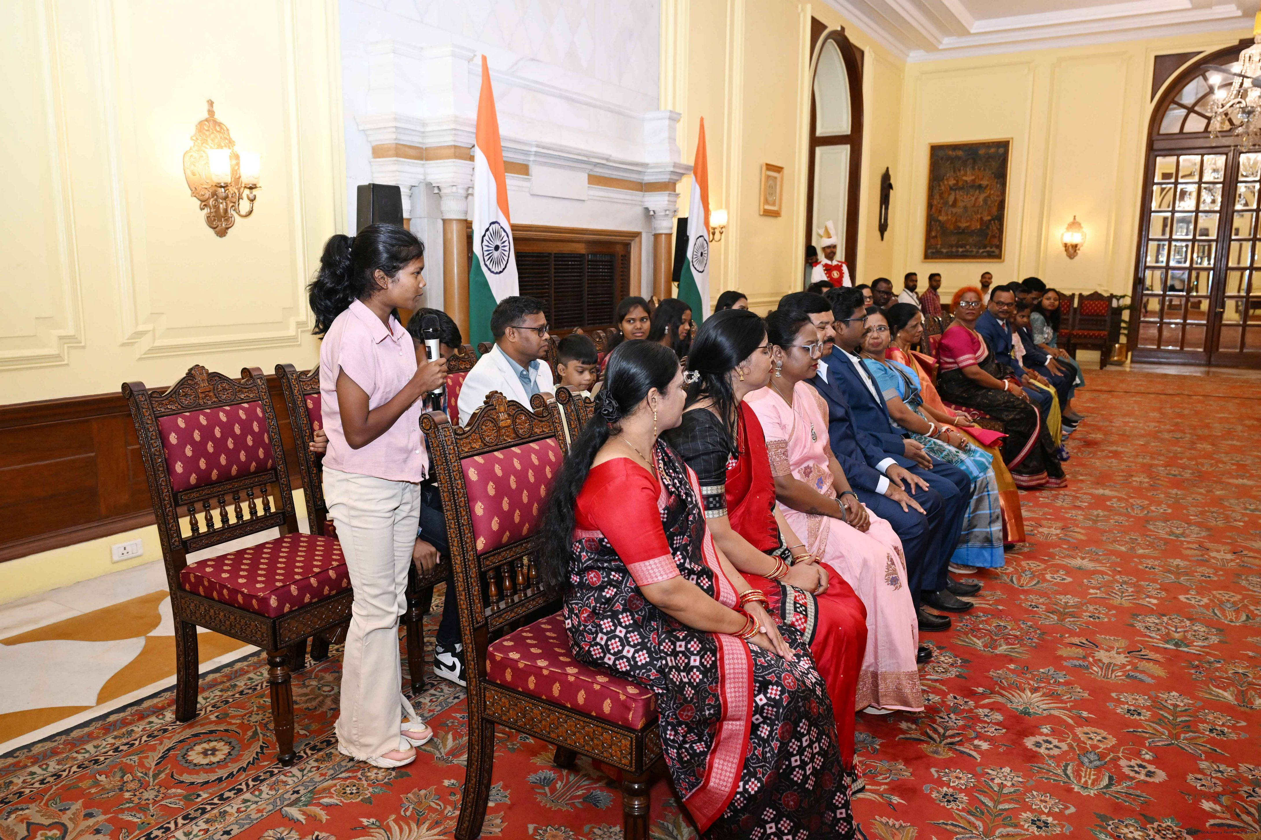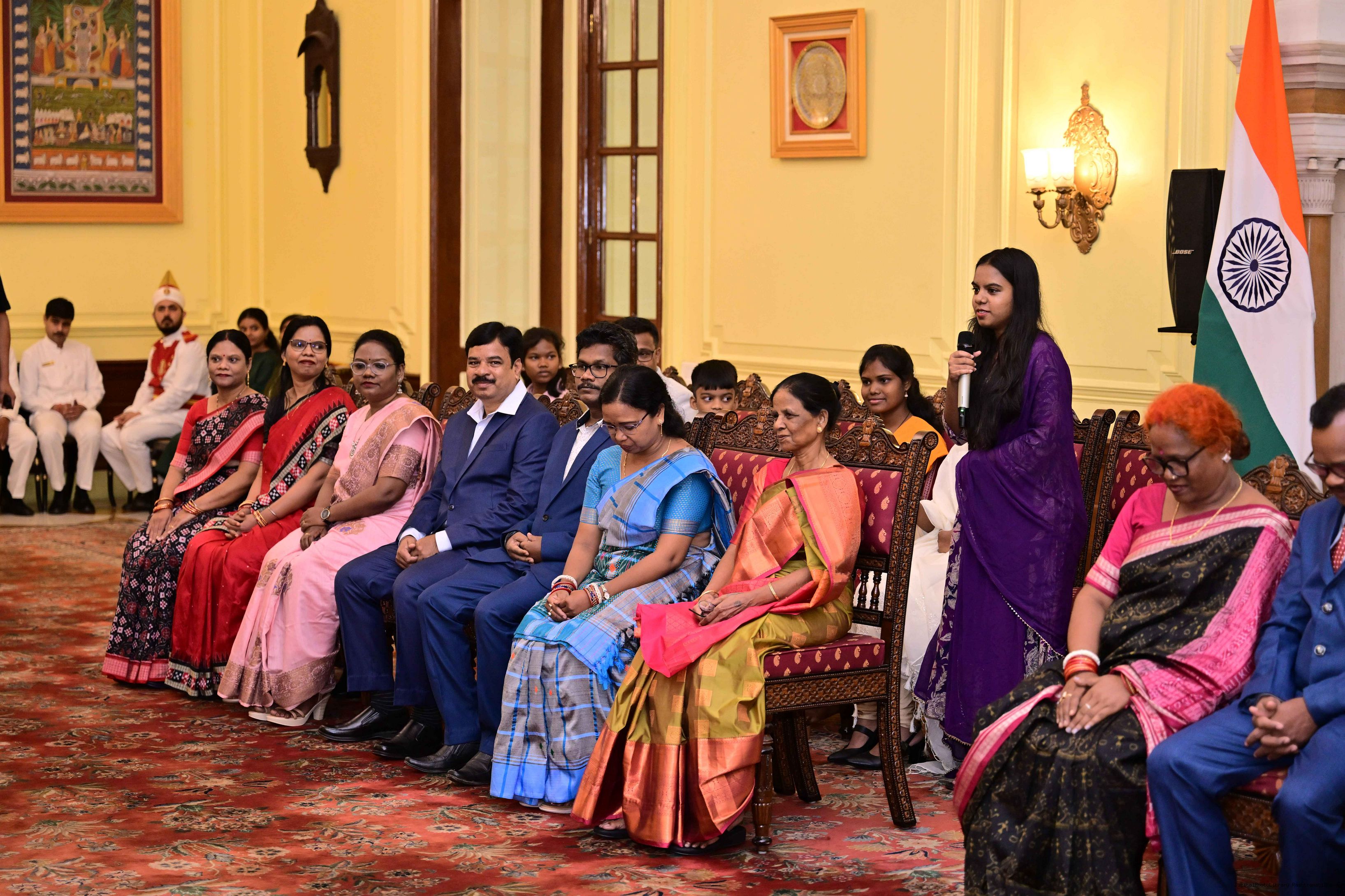 | Caption: | Smt. Saraswati Soren, Gadadharpur, Mayurbhanj along with 26 others meeting with the President of India, Smt. Droupadi Murmu at Rashtrapati Bhavan on September 30, 2025. |