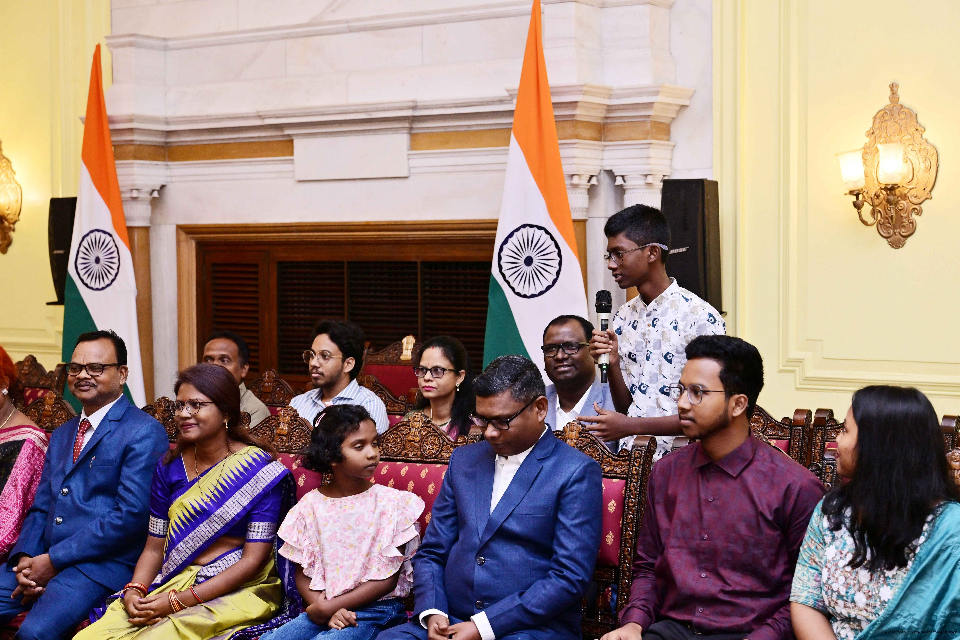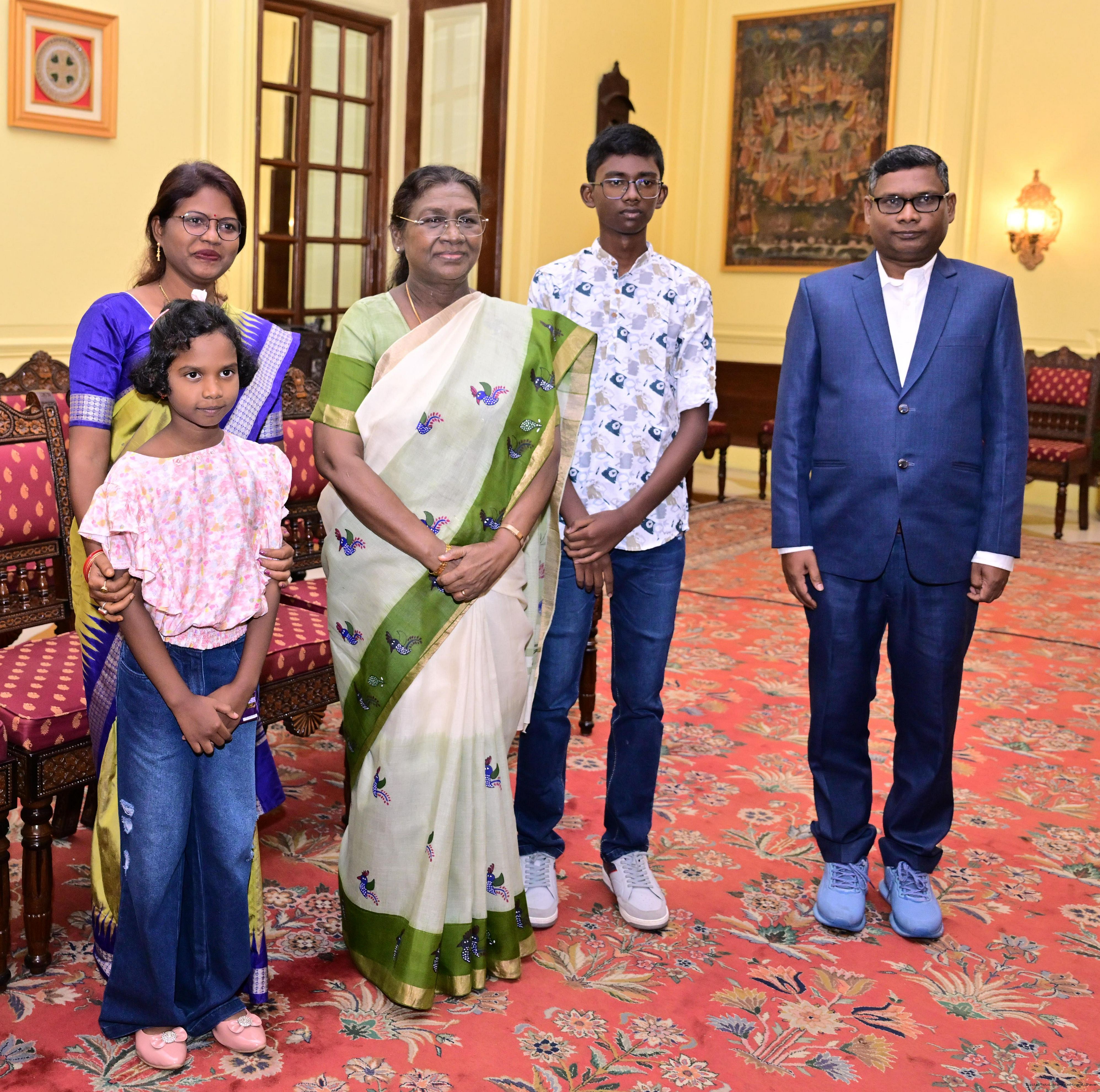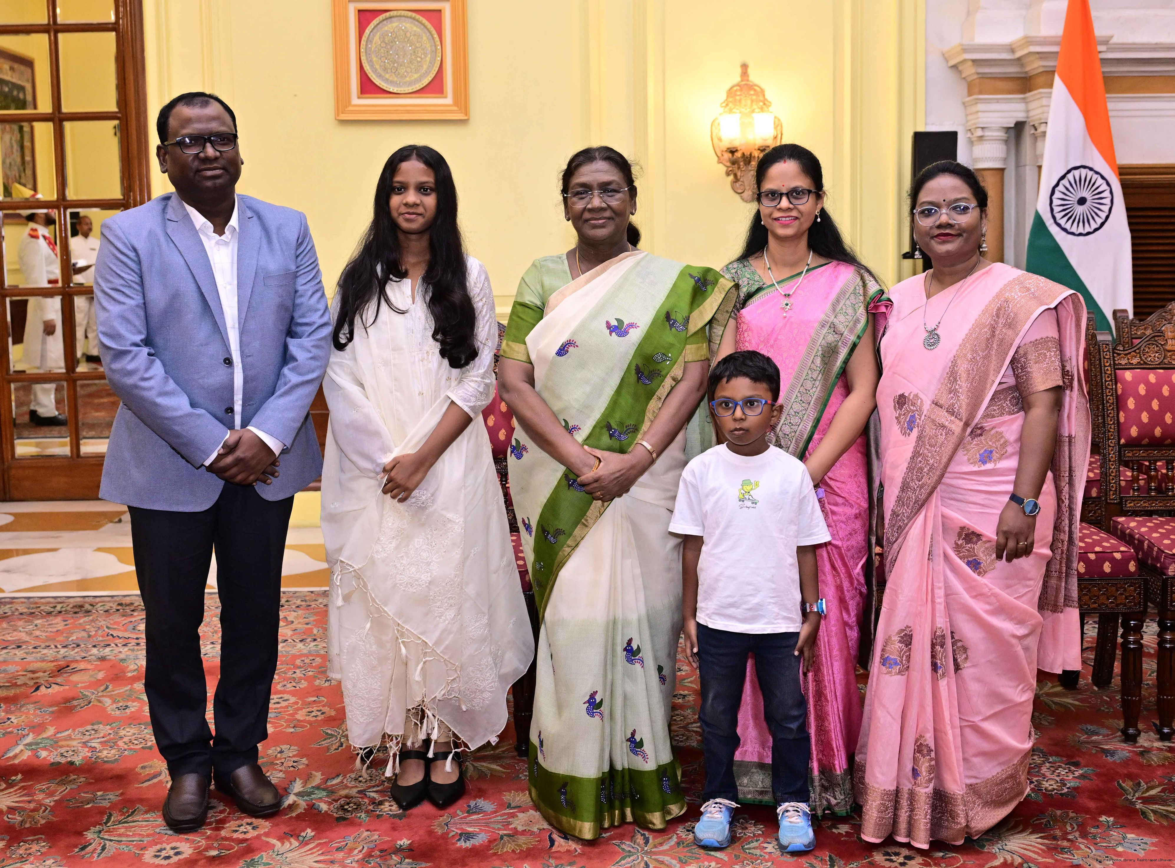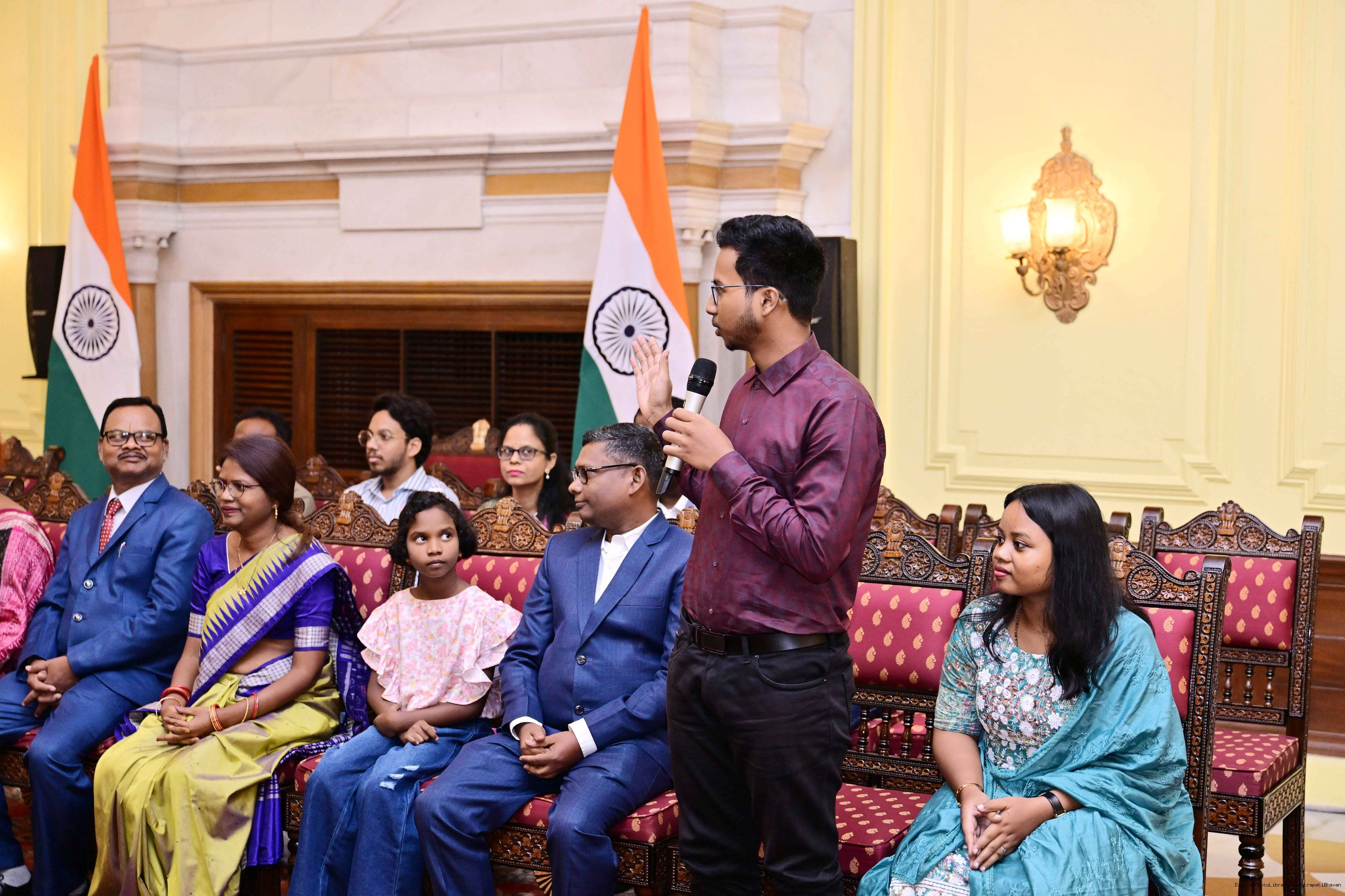 | Caption: | Smt. Saraswati Soren, Gadadharpur, Mayurbhanj along with 26 others meeting with the President of India, Smt. Droupadi Murmu at Rashtrapati Bhavan on September 30, 2025. |