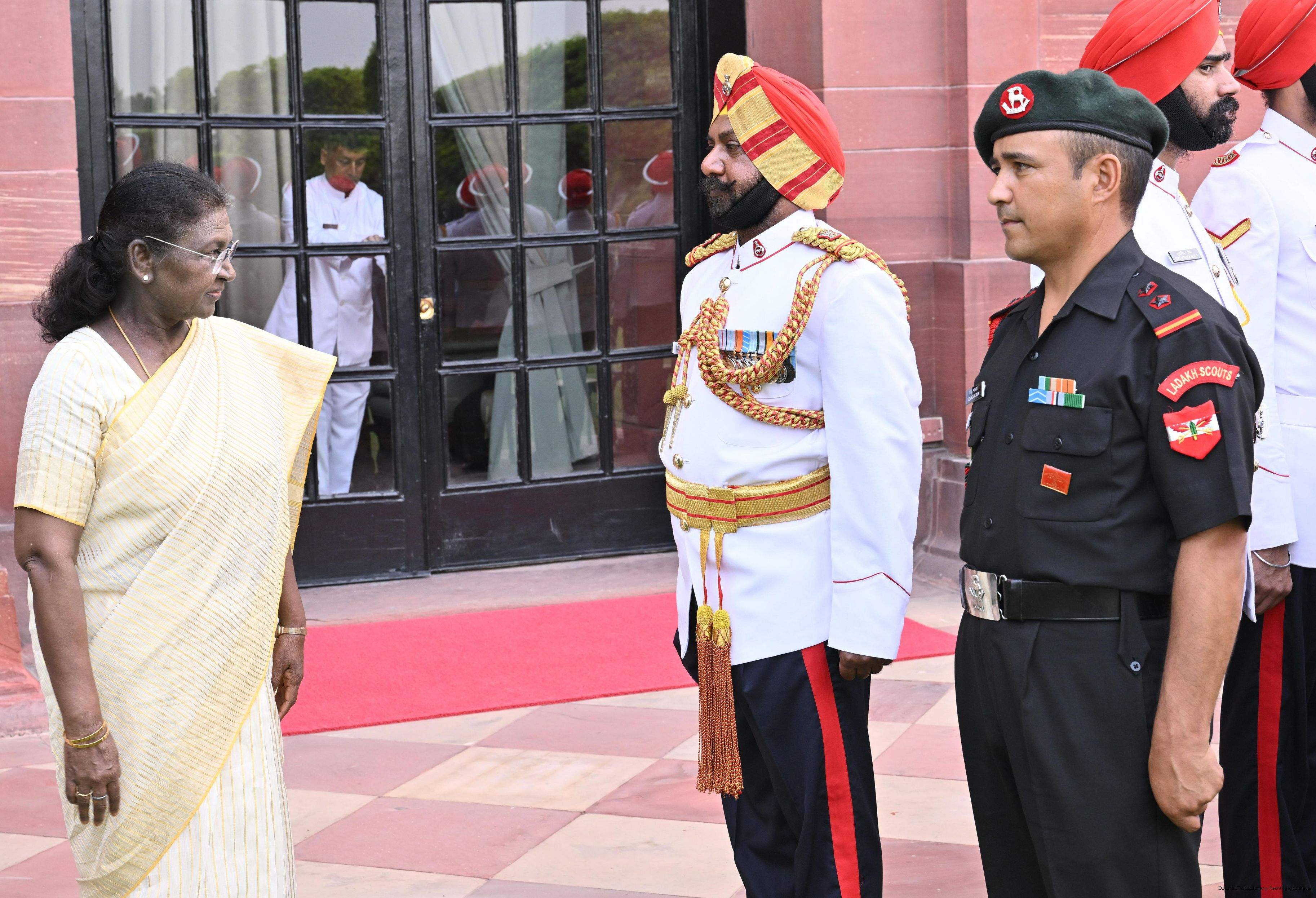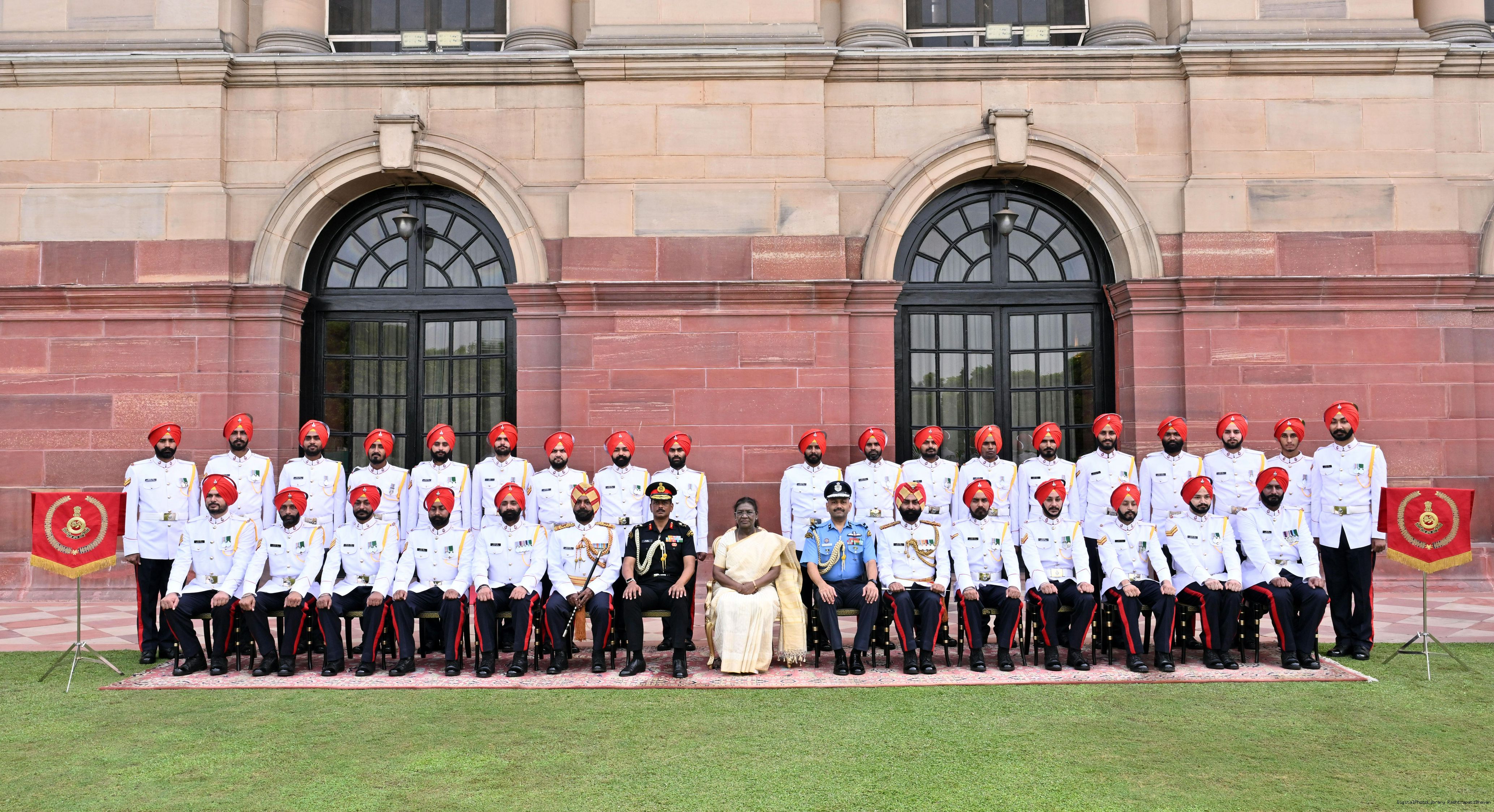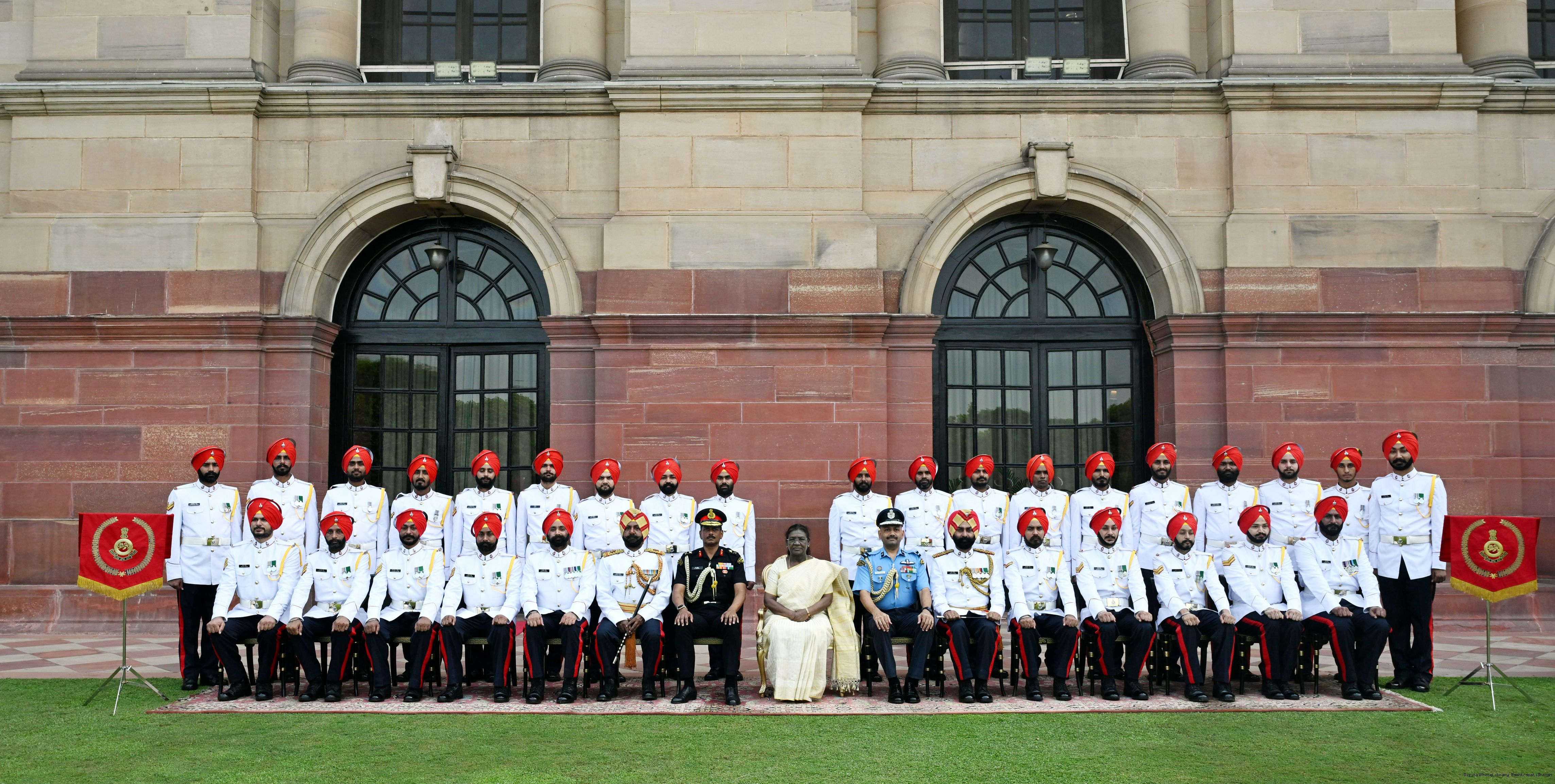 | Caption: | The President of India, Smt. Droupadi Murmu posing a group photograph with Military Band (SIKH Regimental Centre) attached with Rashtrapati Bhavan on October 2, 2025. |