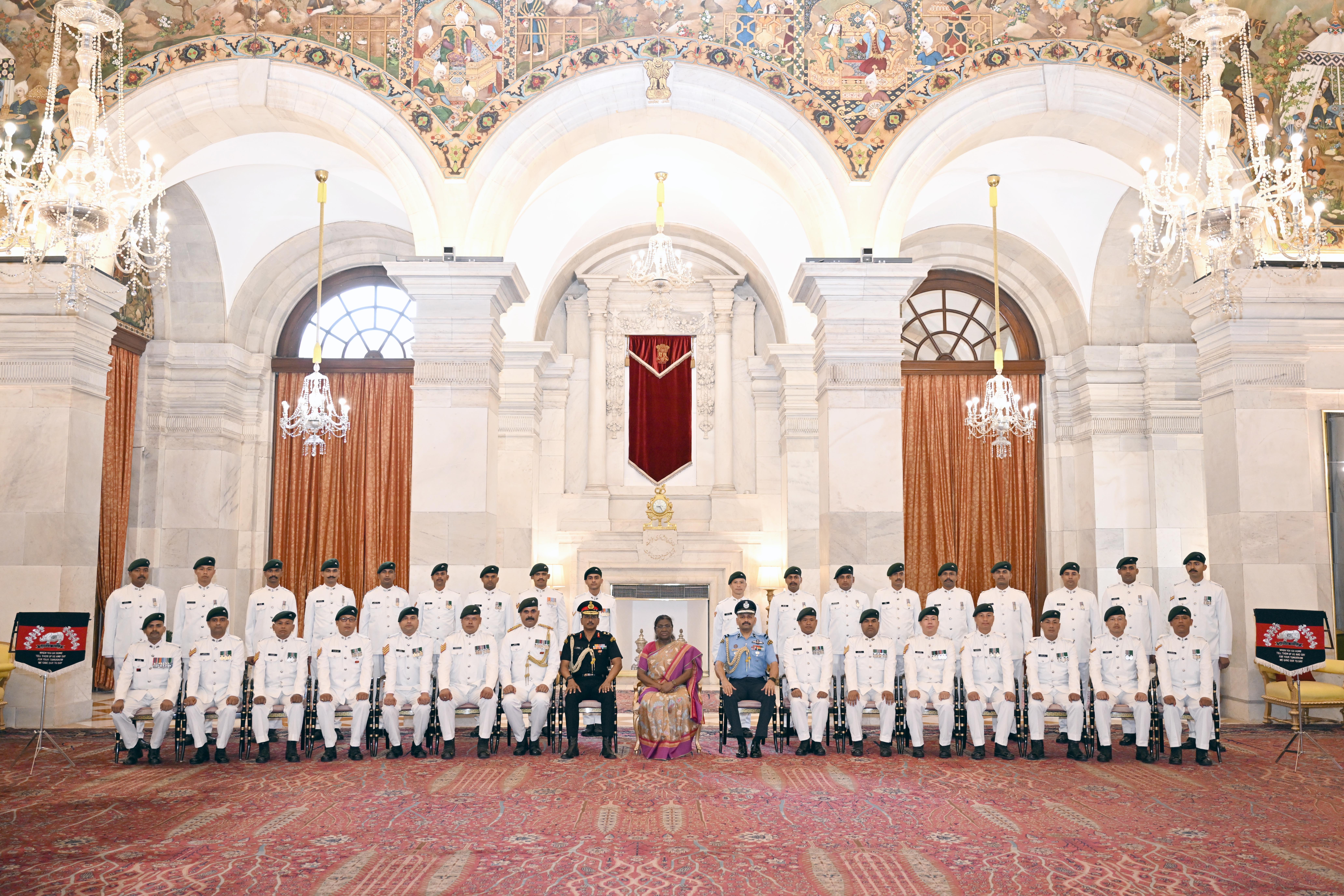 | Caption: | The President of India, Smt Droupadi Murmu posing a group photograph with the Military Band (Assam Regimental Centre) attached with Rashtrapati Bhavan on June 30, 2025. |