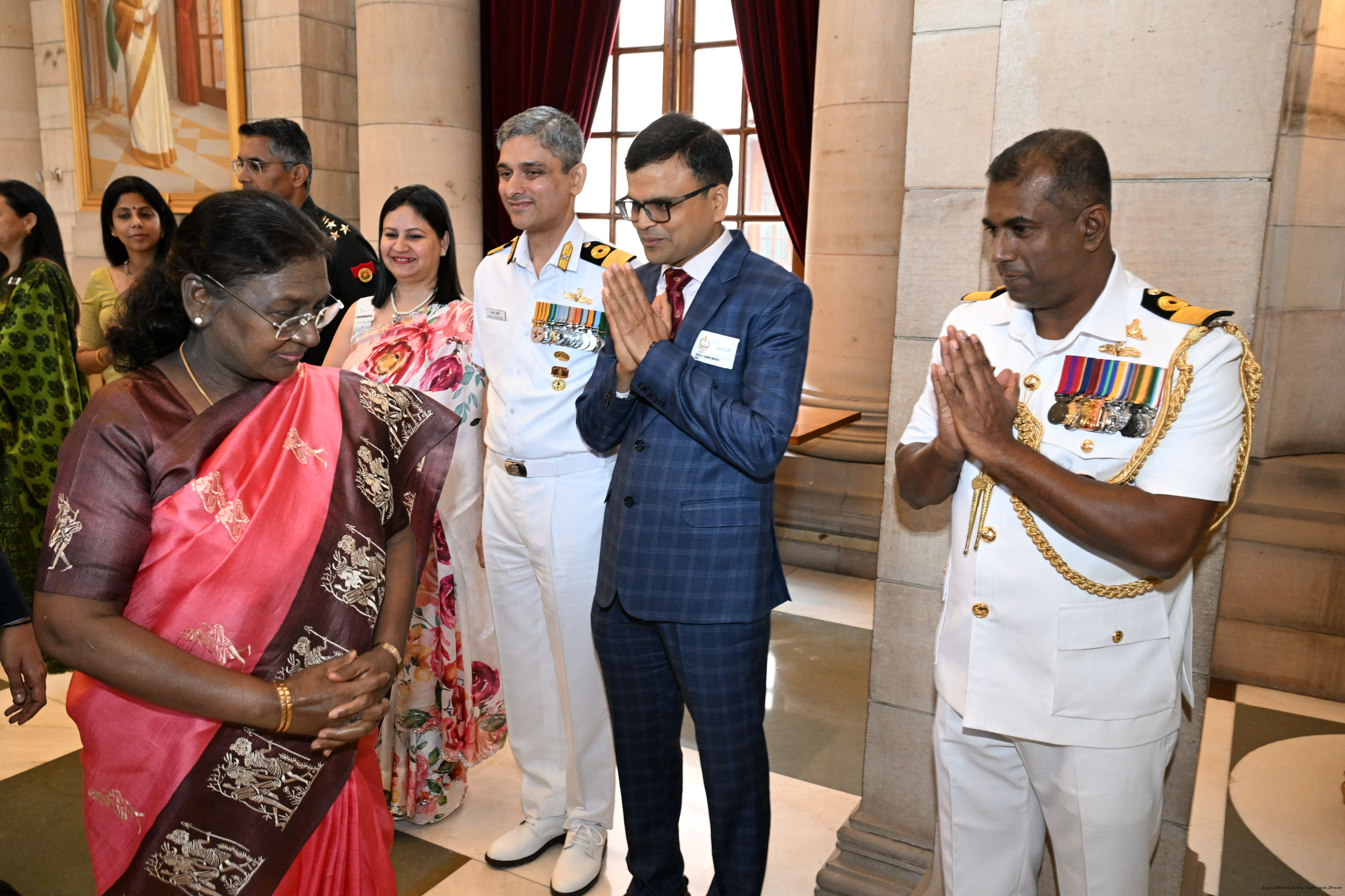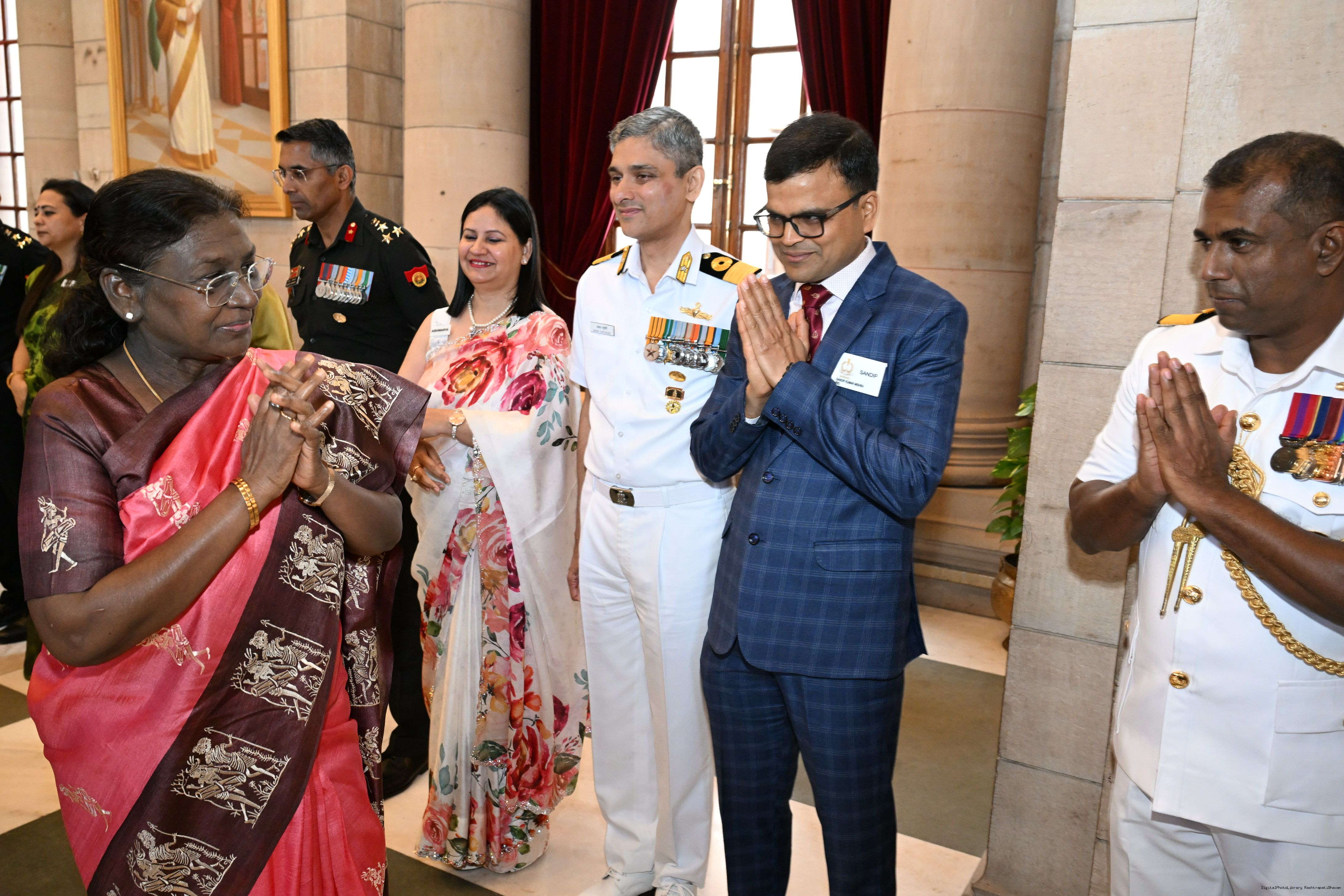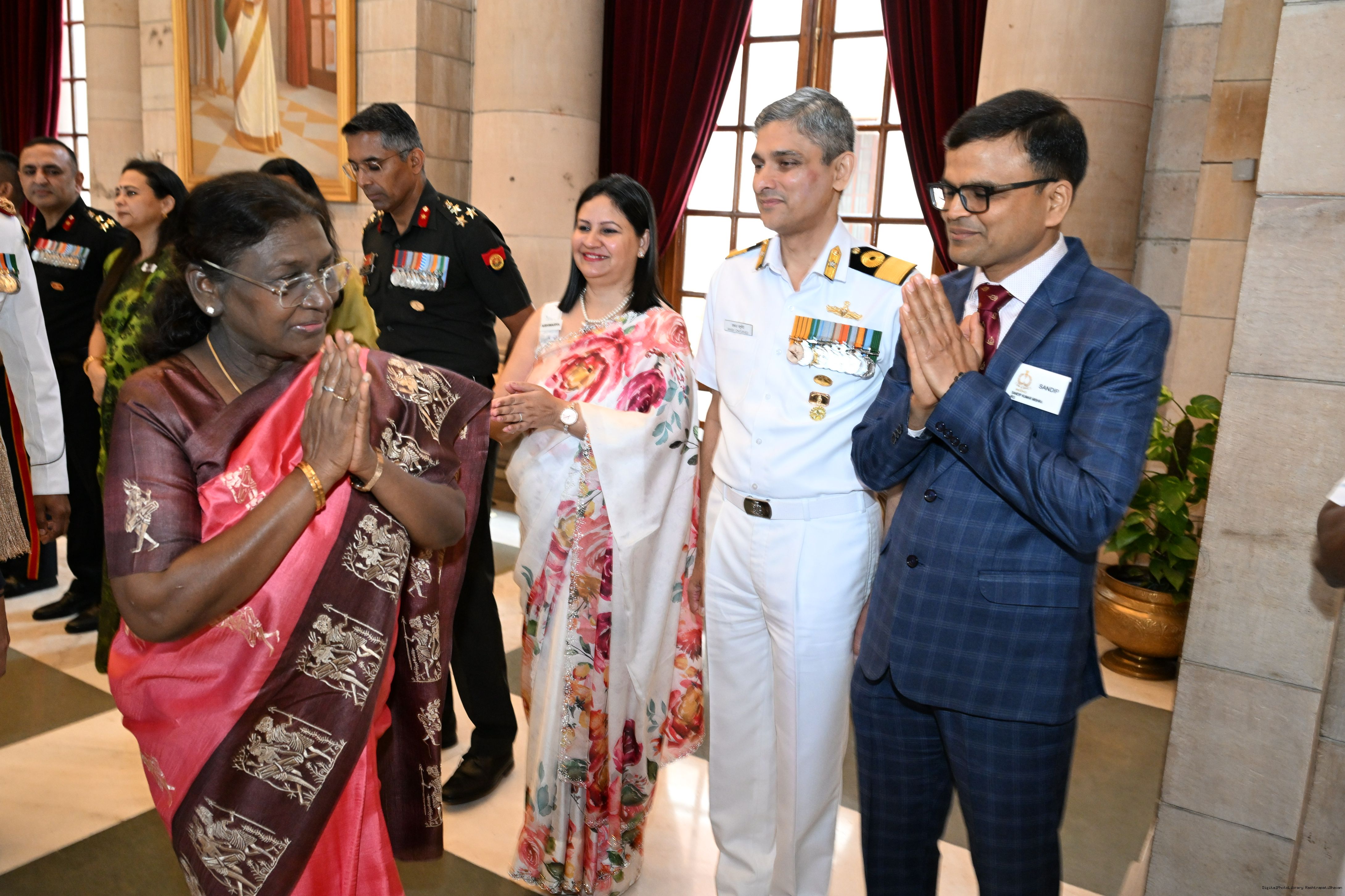 | Caption: | The faculty and course members of the 65th National Defence College Course called on the President of India, Smt Droupadi Murmu, at Rashtrapati Bhavan on October 7, 2025. |