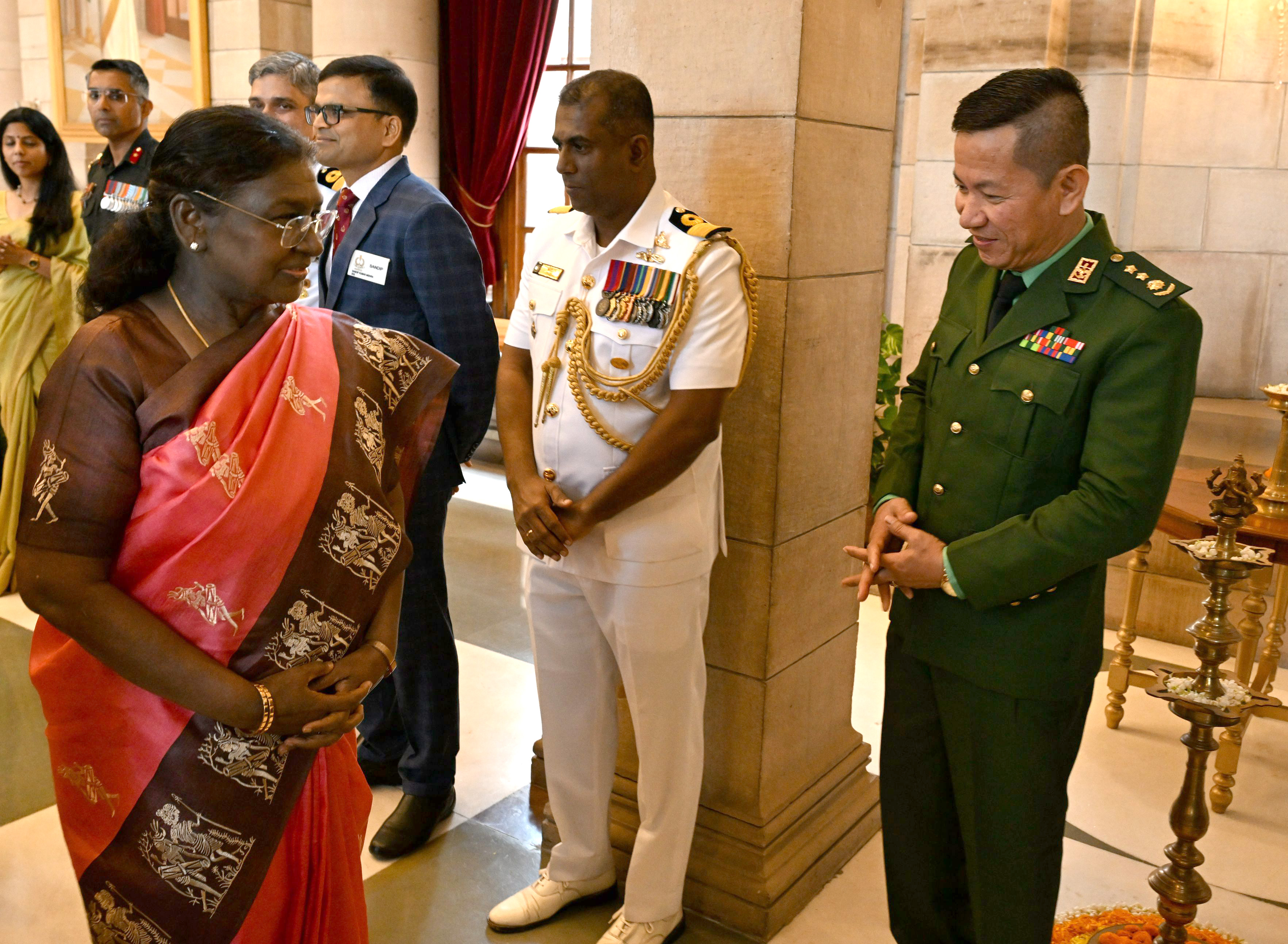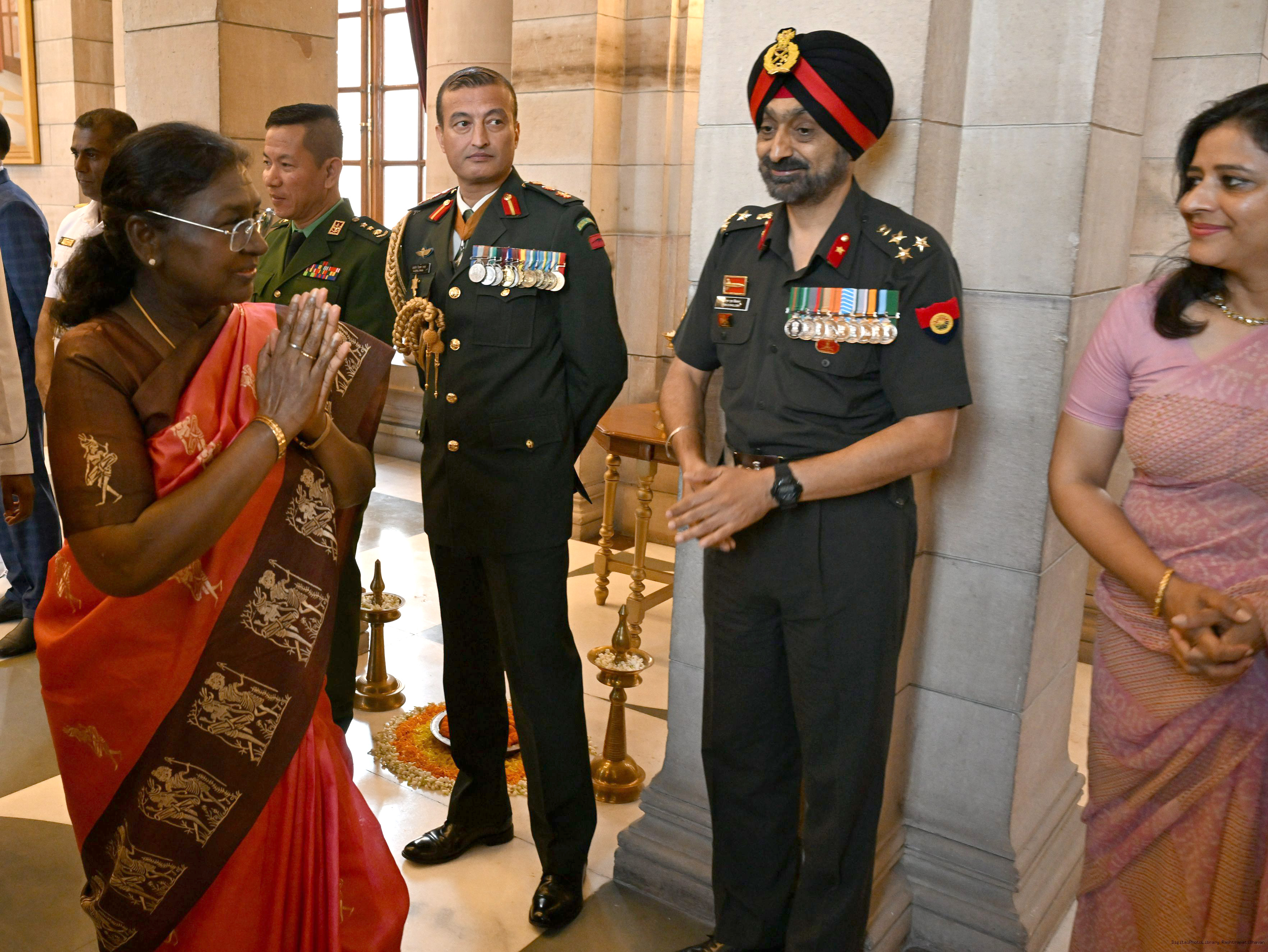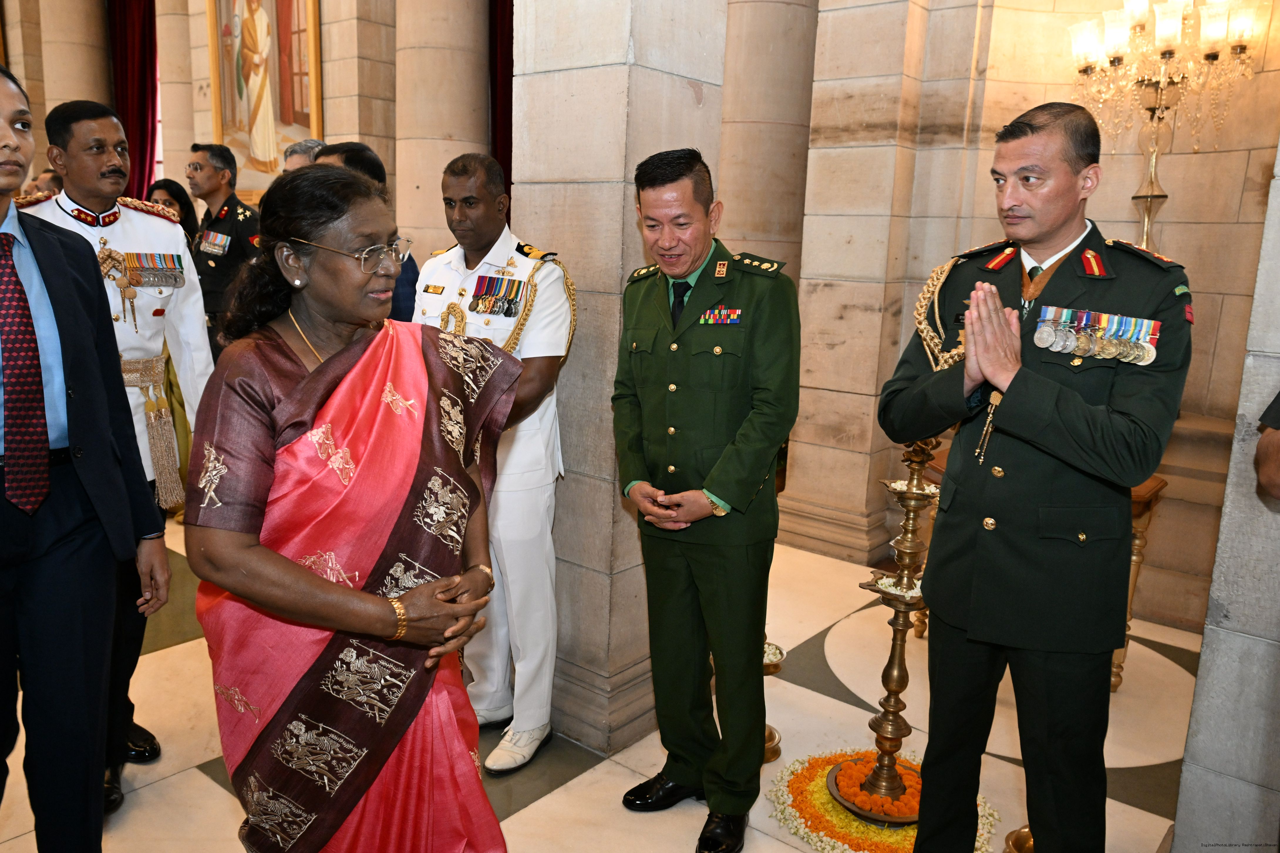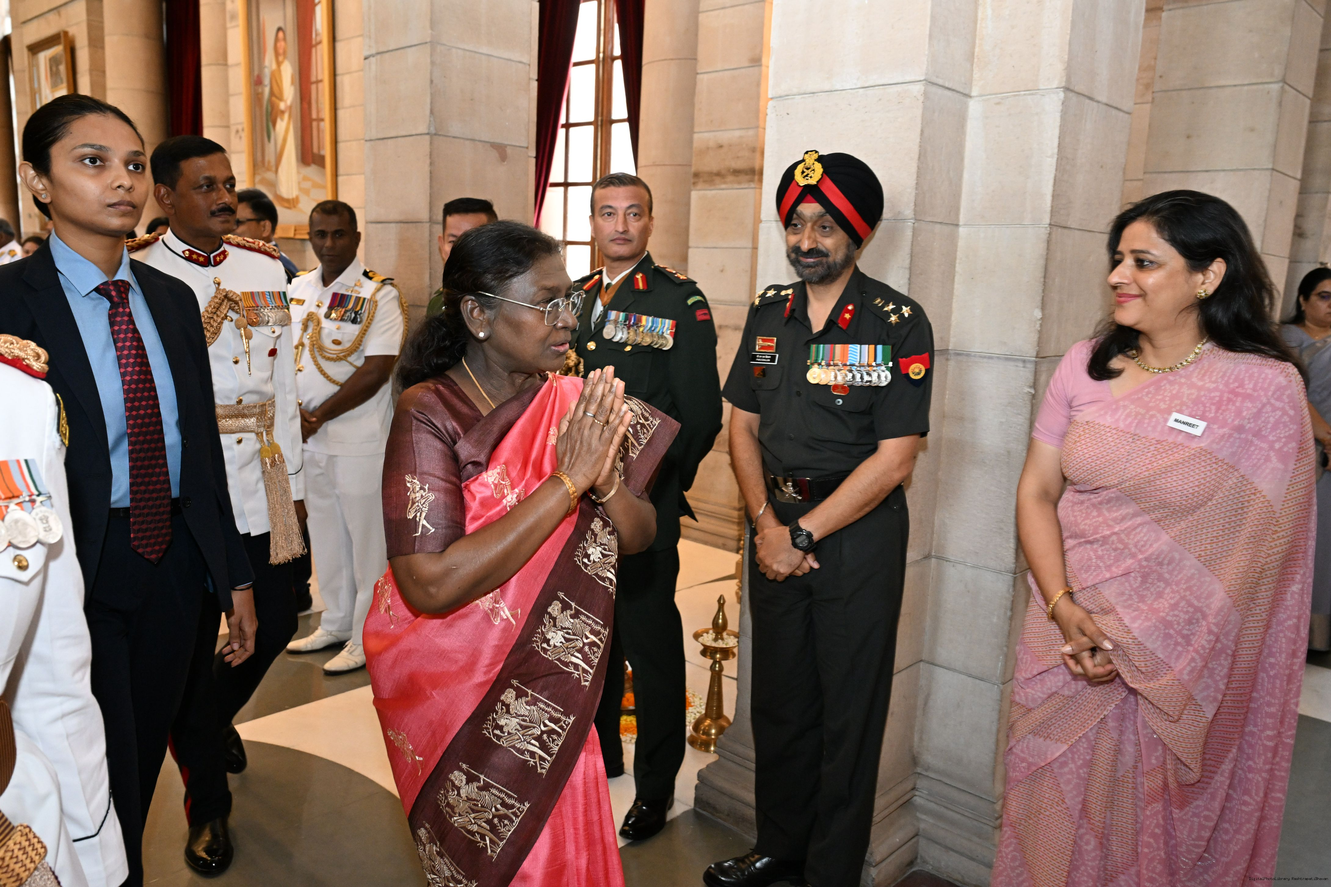 | Caption: | The faculty and course members of the 65th National Defence College Course called on the President of India, Smt Droupadi Murmu, at Rashtrapati Bhavan on October 7, 2025. |