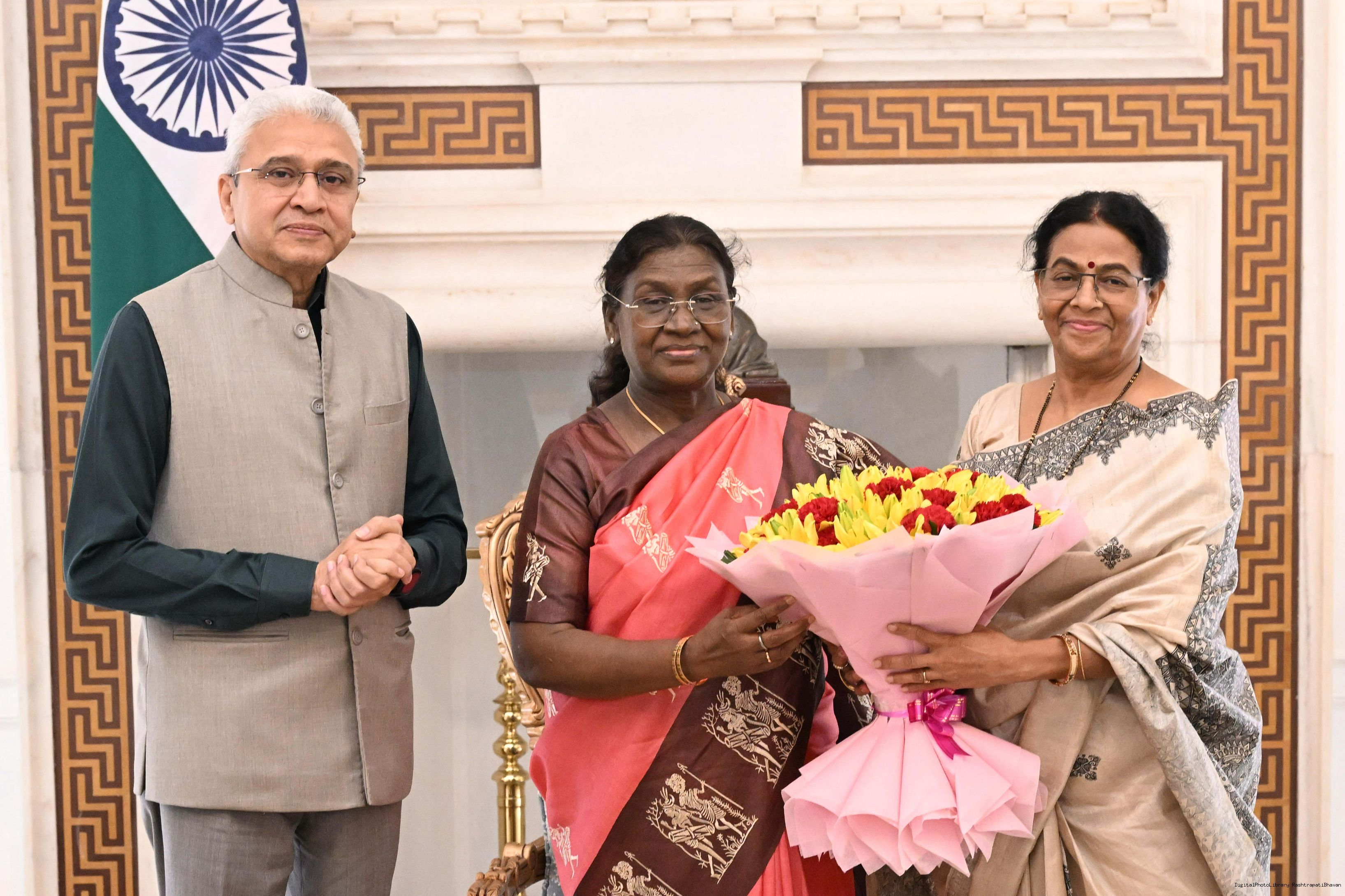 | Caption: | The President of India, Smt Droupadi Murmu at the farewell Call by Shri Ajay Kumar Singh, Former Press Secretary to the President along with spouse Smt. Anjali Singh at Rashtrapati Bhavan on October 7, 2025. |
