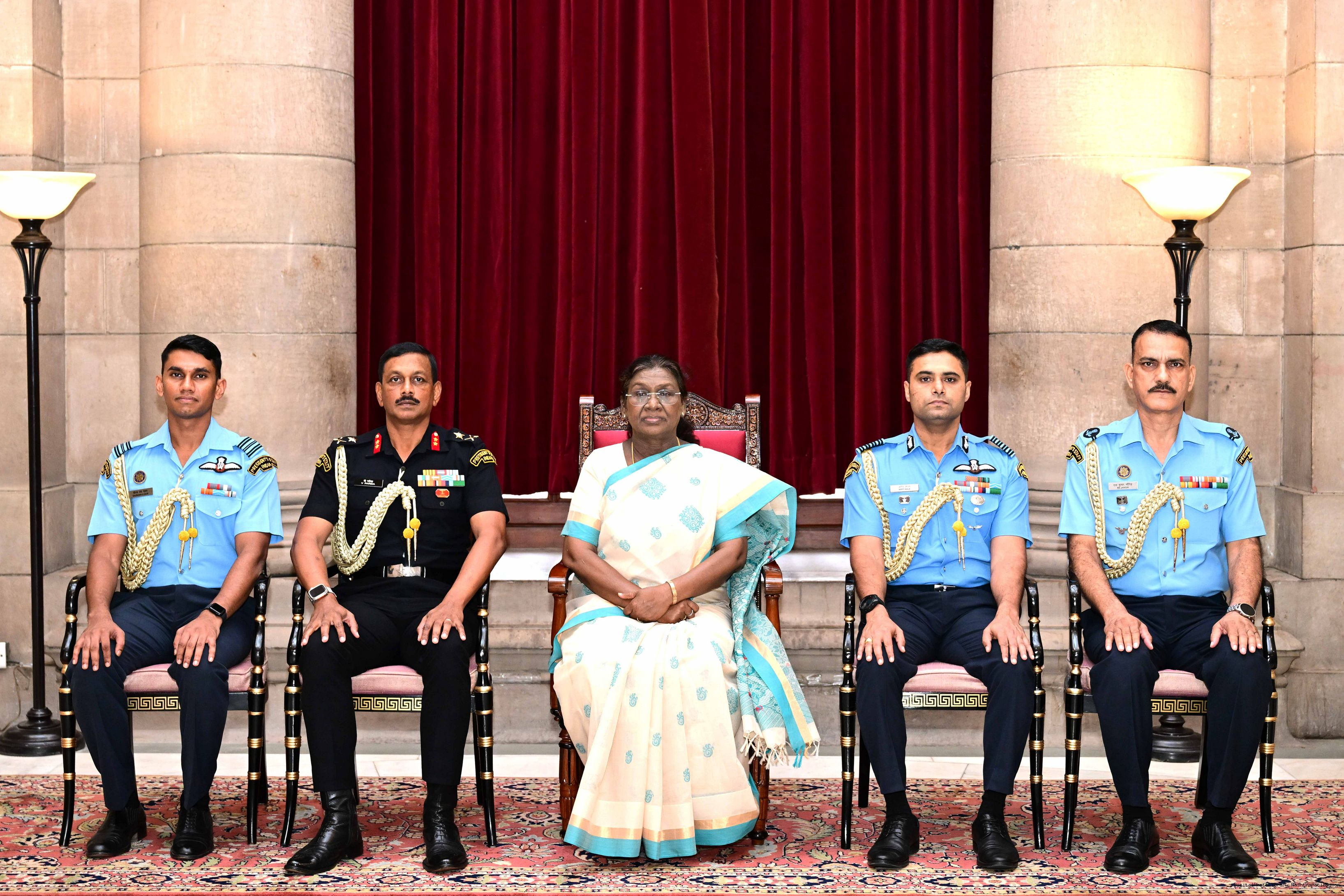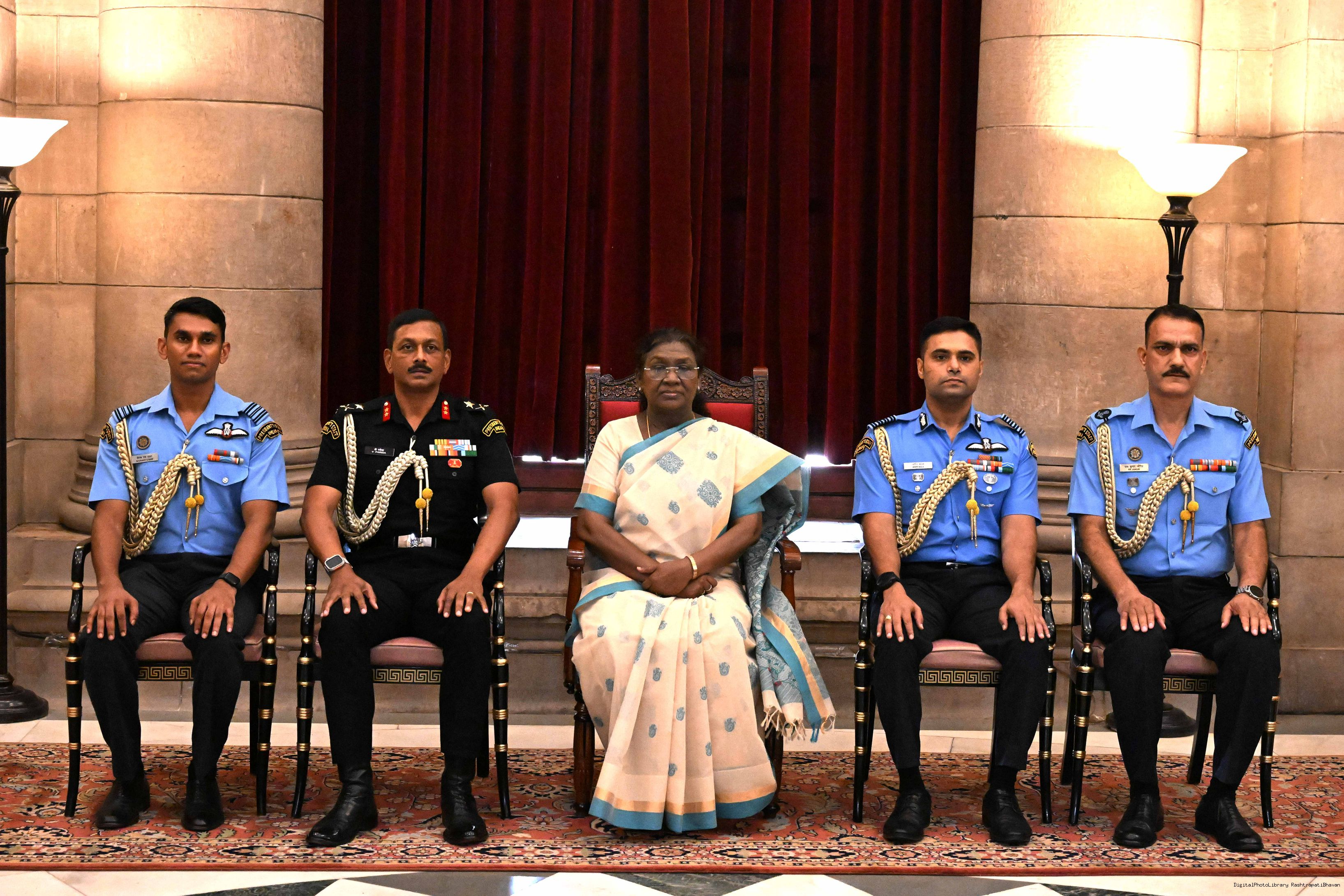 | Caption: | The President of India, Smt Droupadi Murmu posing a group photograph with the Indian Air Force personnel attached with Rashtrapati Bhavan on the occasion of Air Force Day at Rashtrapati Bhavan on October 8, 2025. |