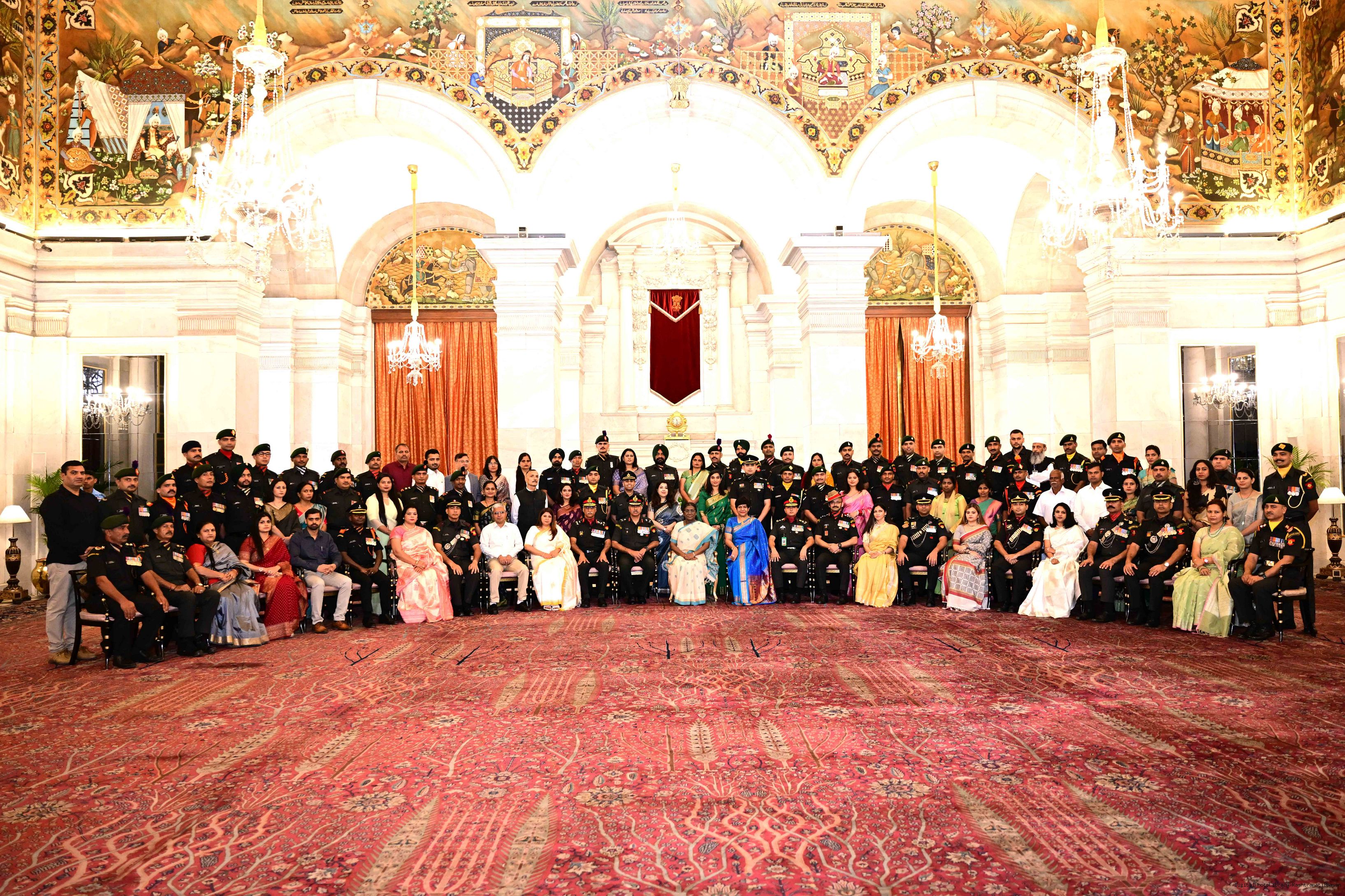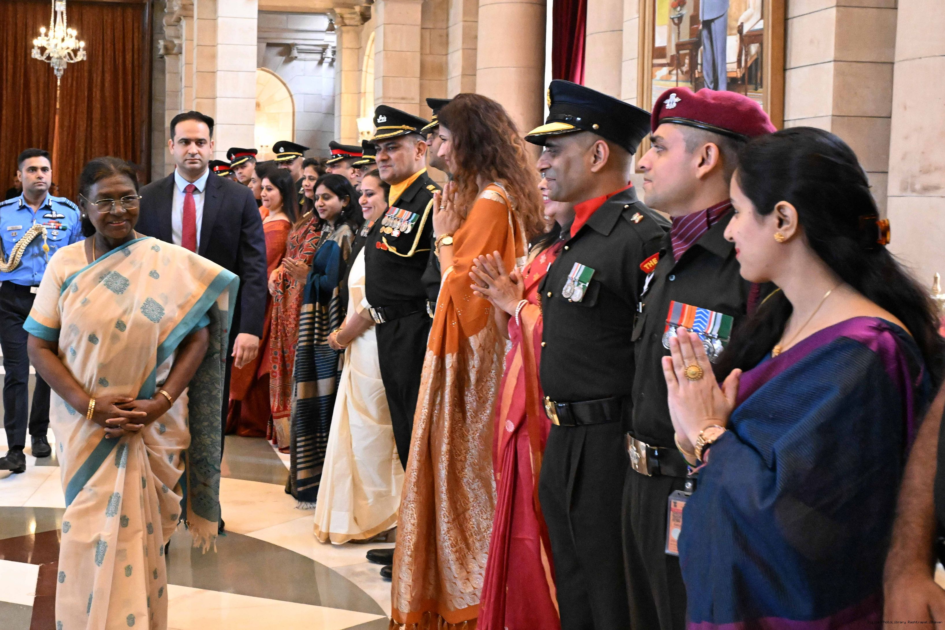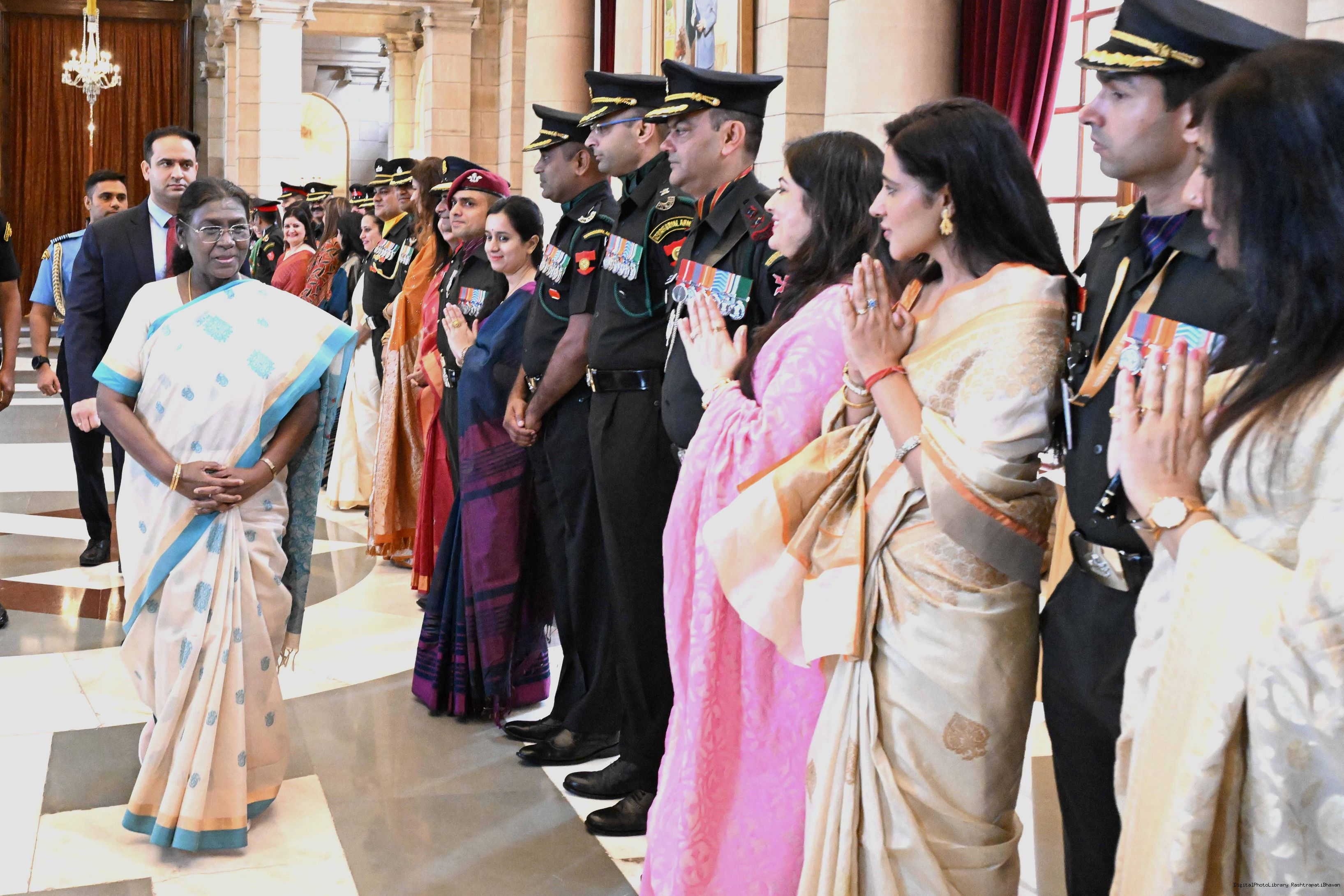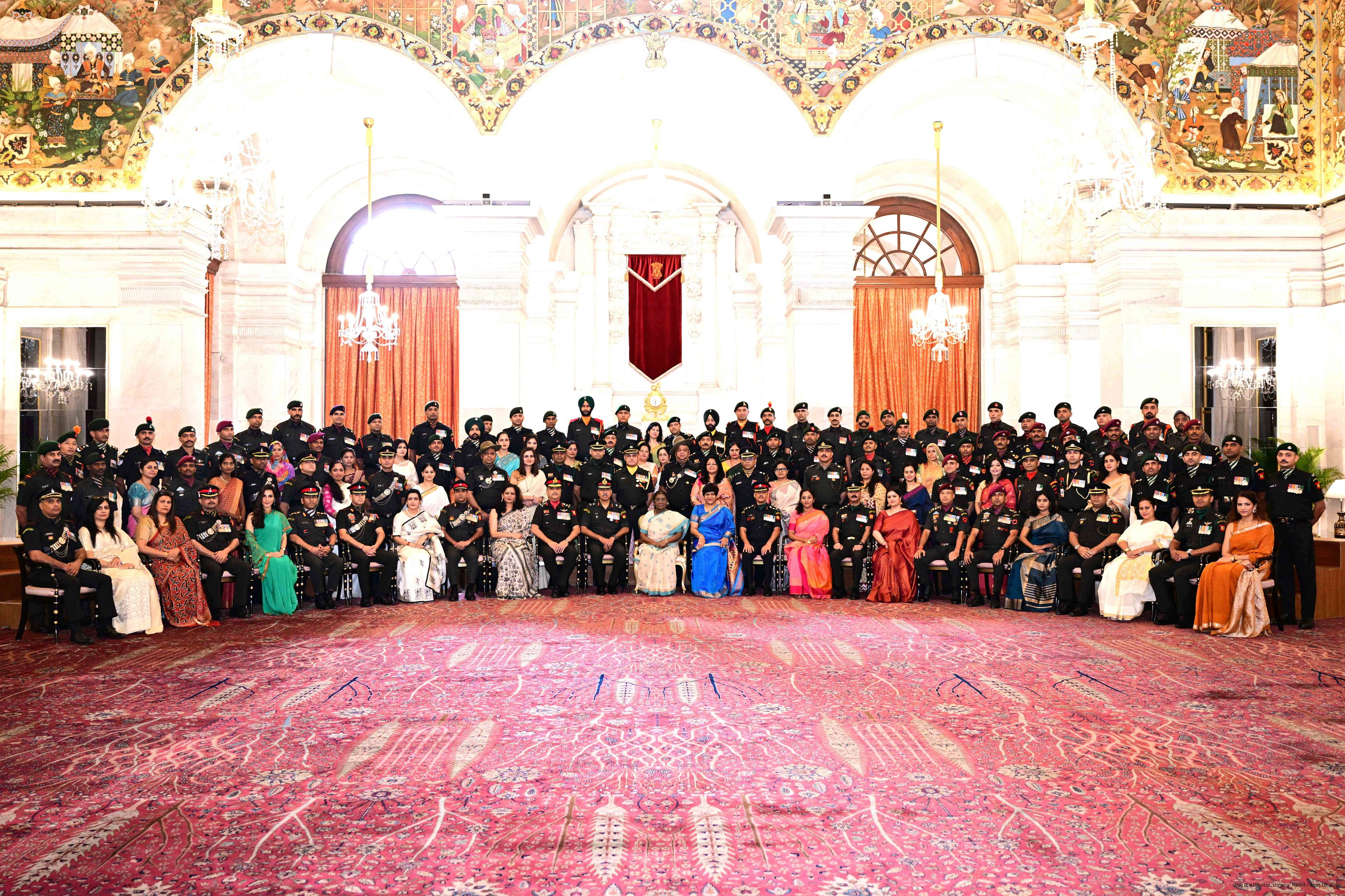 | Caption: | The President of India, Smt. Droupadi Murmu interacted and posing a group photograph with the Indian Air Force personnel attached with Rashtrapati Bhavan on the occasion of Air Force Day on October 8, 2025. |