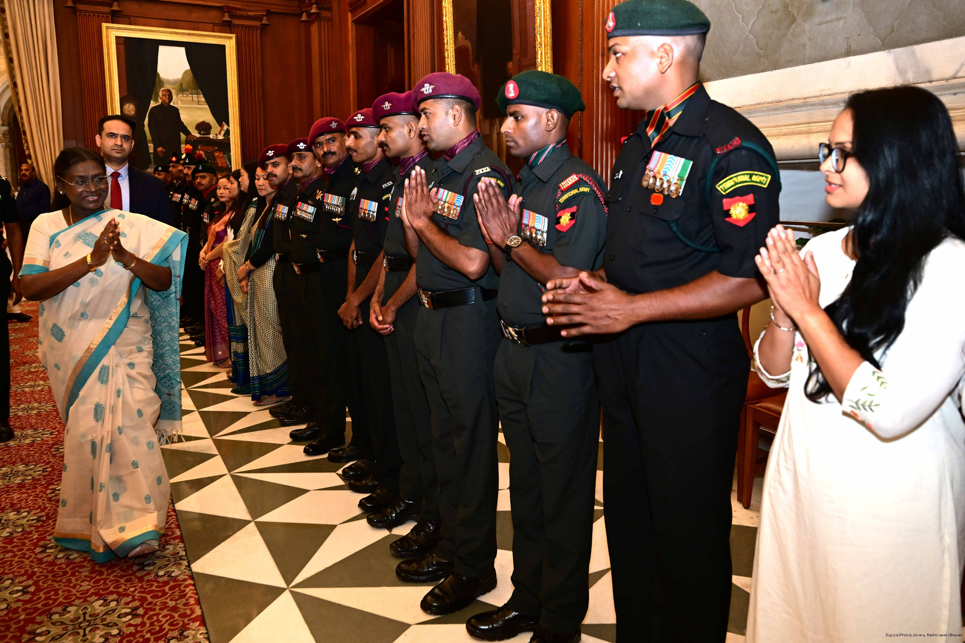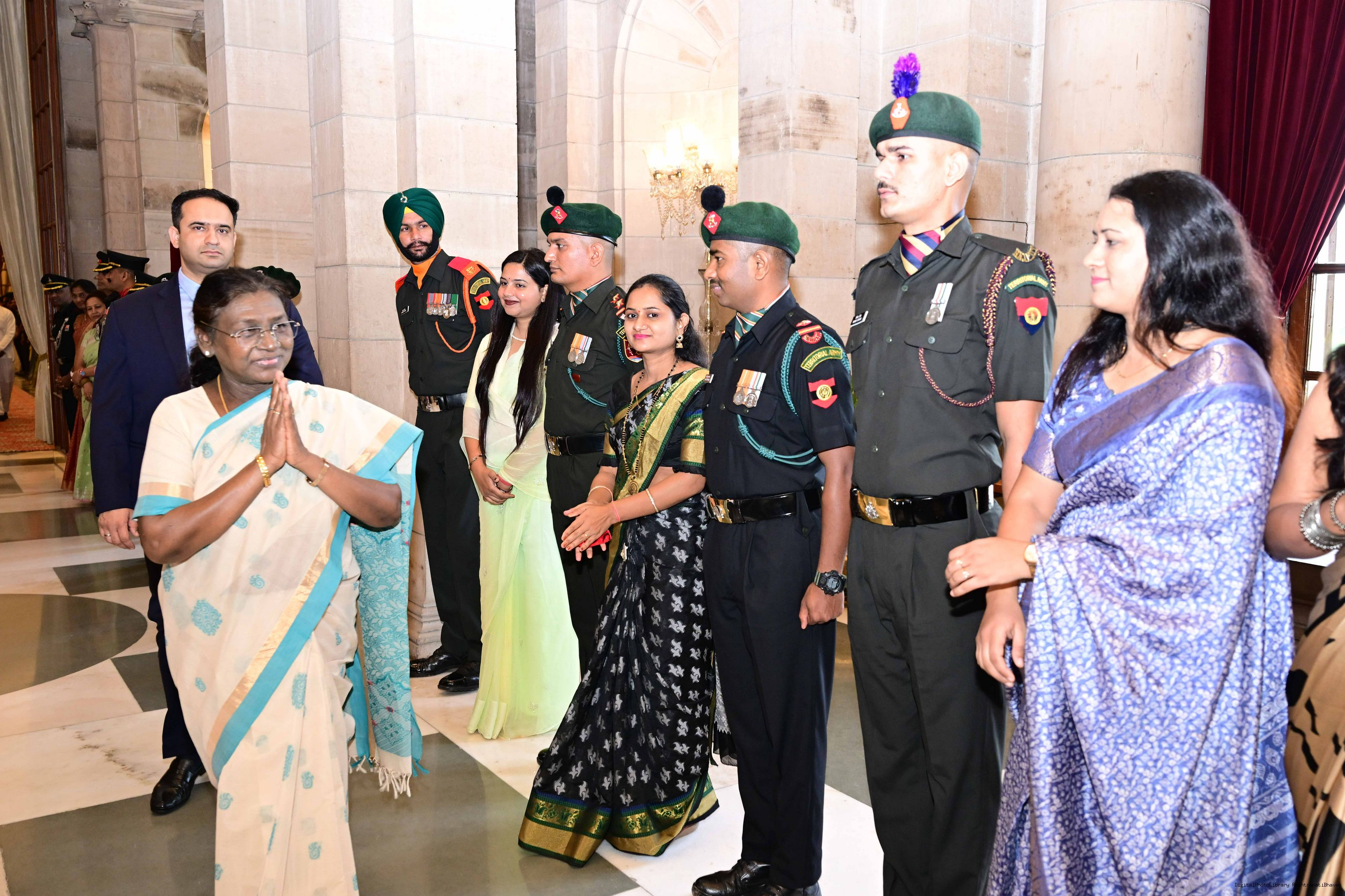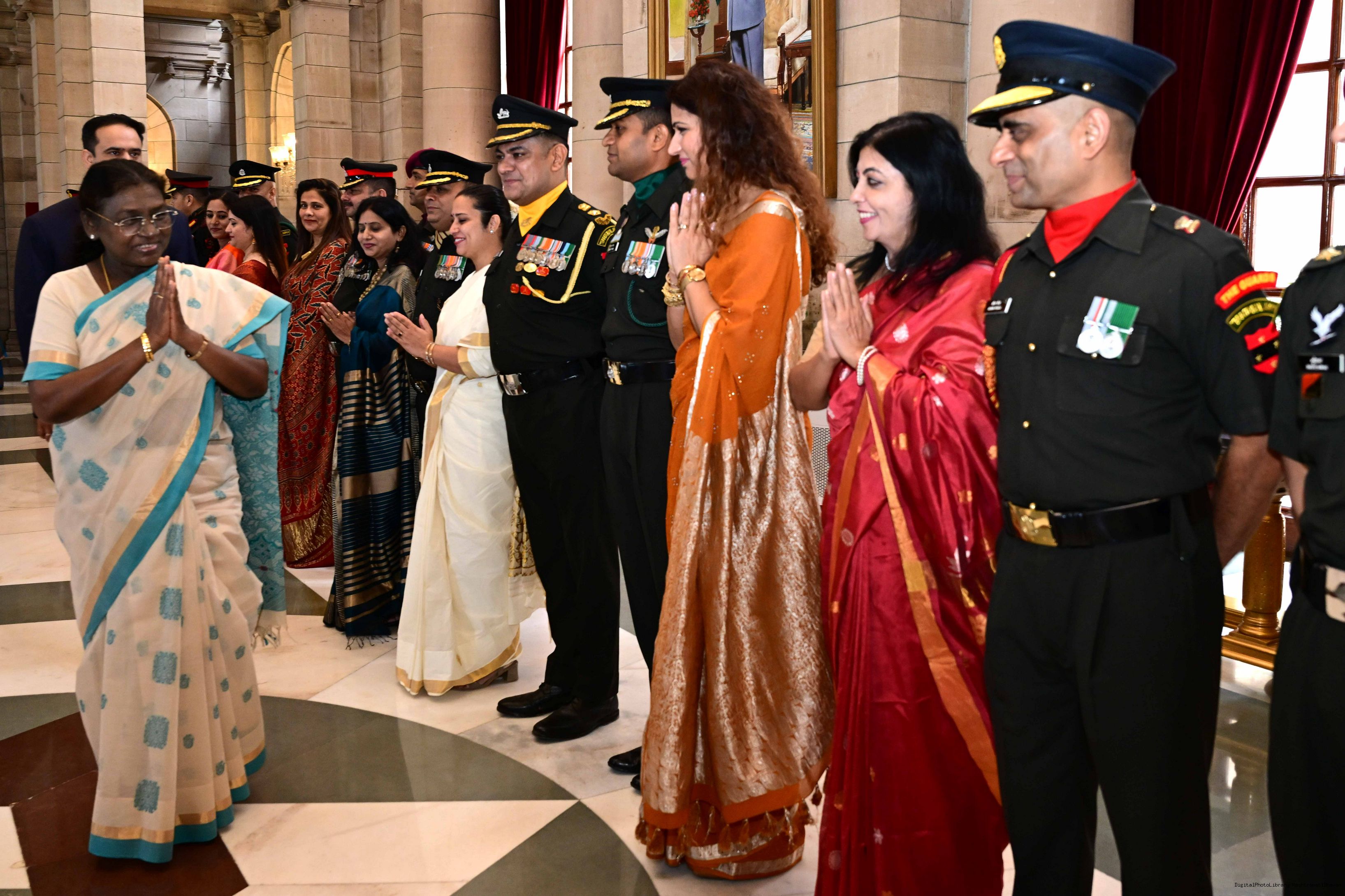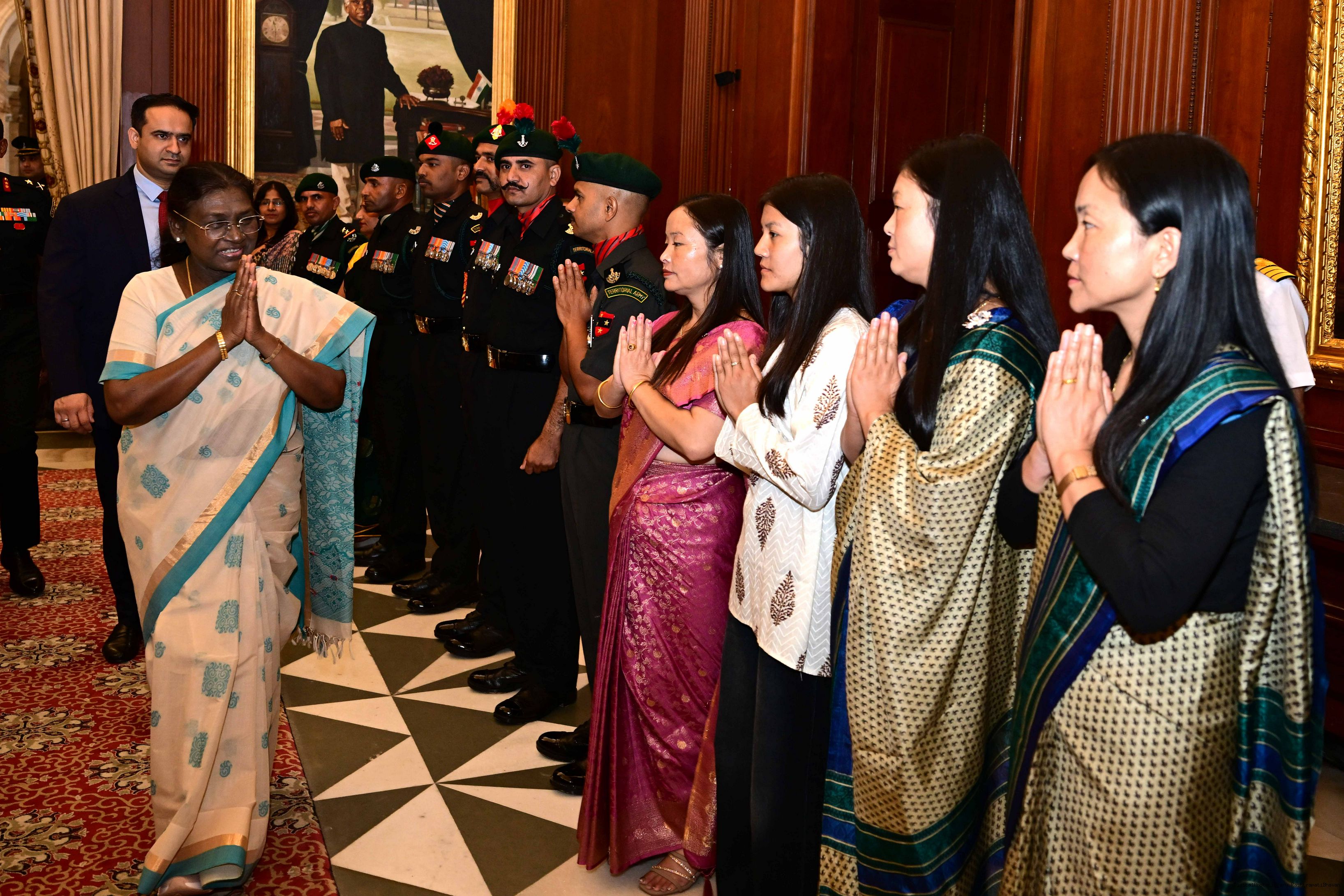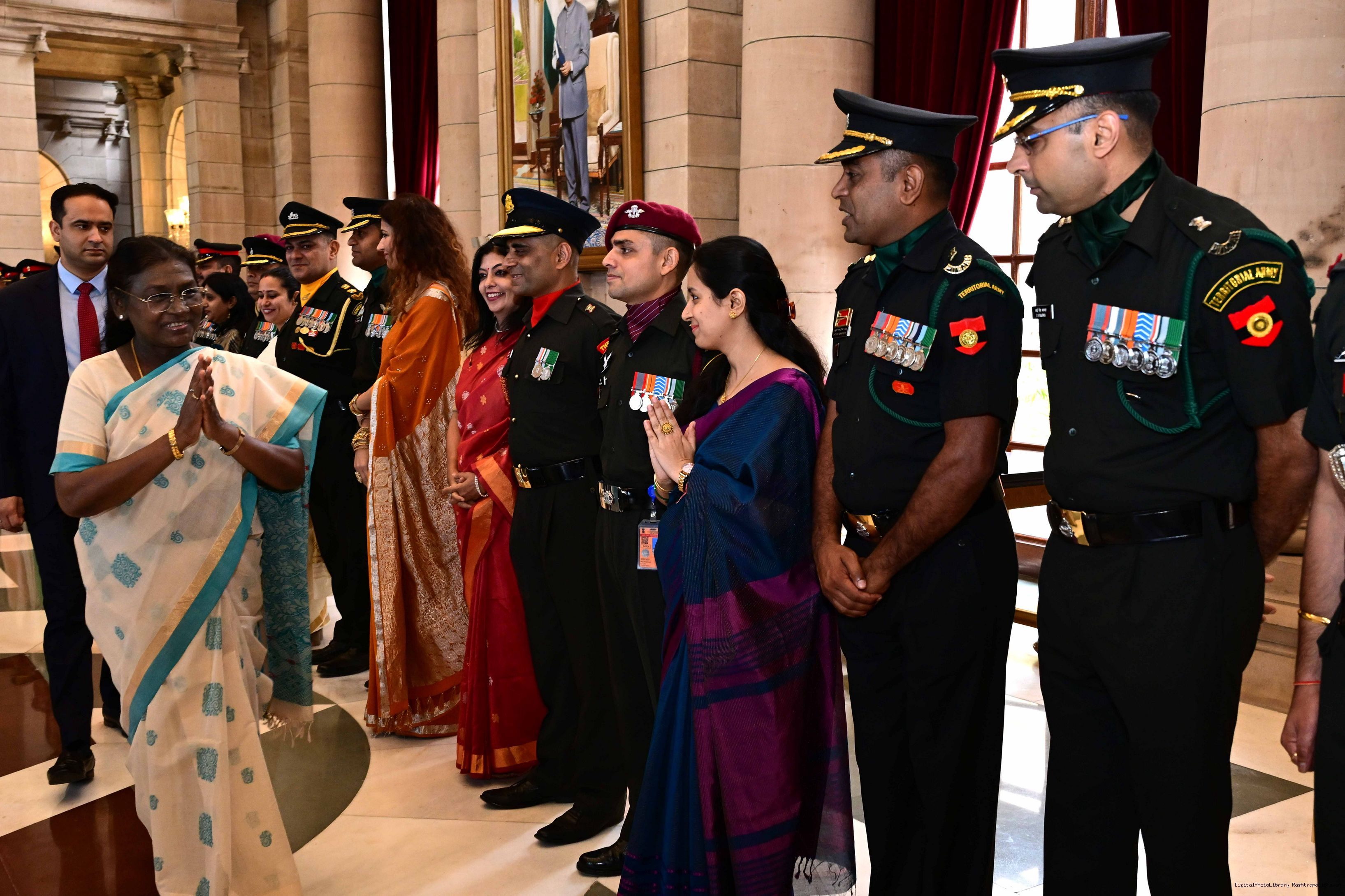| Caption: | The President of India, Smt. Droupadi Murmu interacted and posing a group photograph with the Indian Air Force personnel attached with Rashtrapati Bhavan on the occasion of Air Force Day on October 8, 2025. |