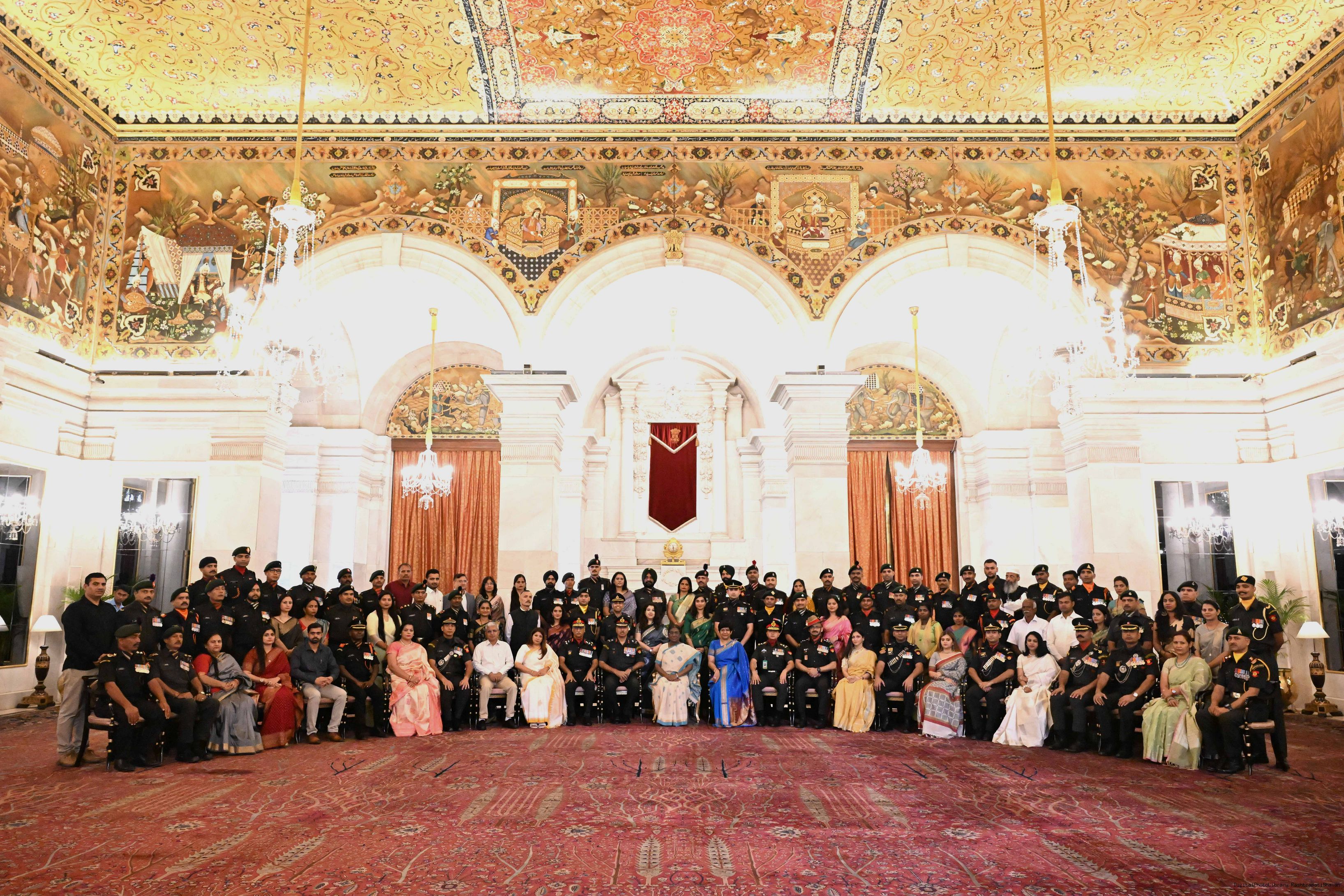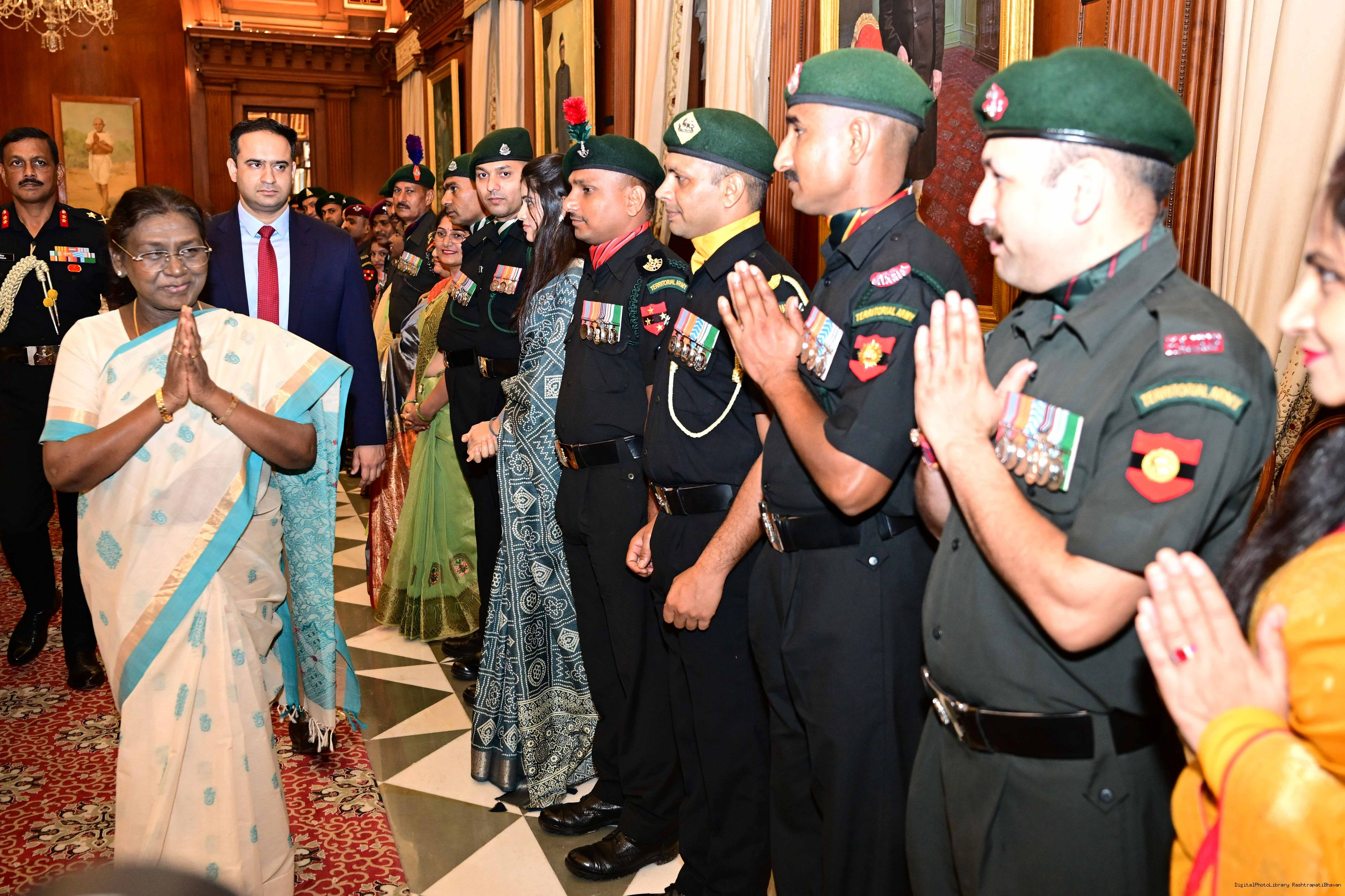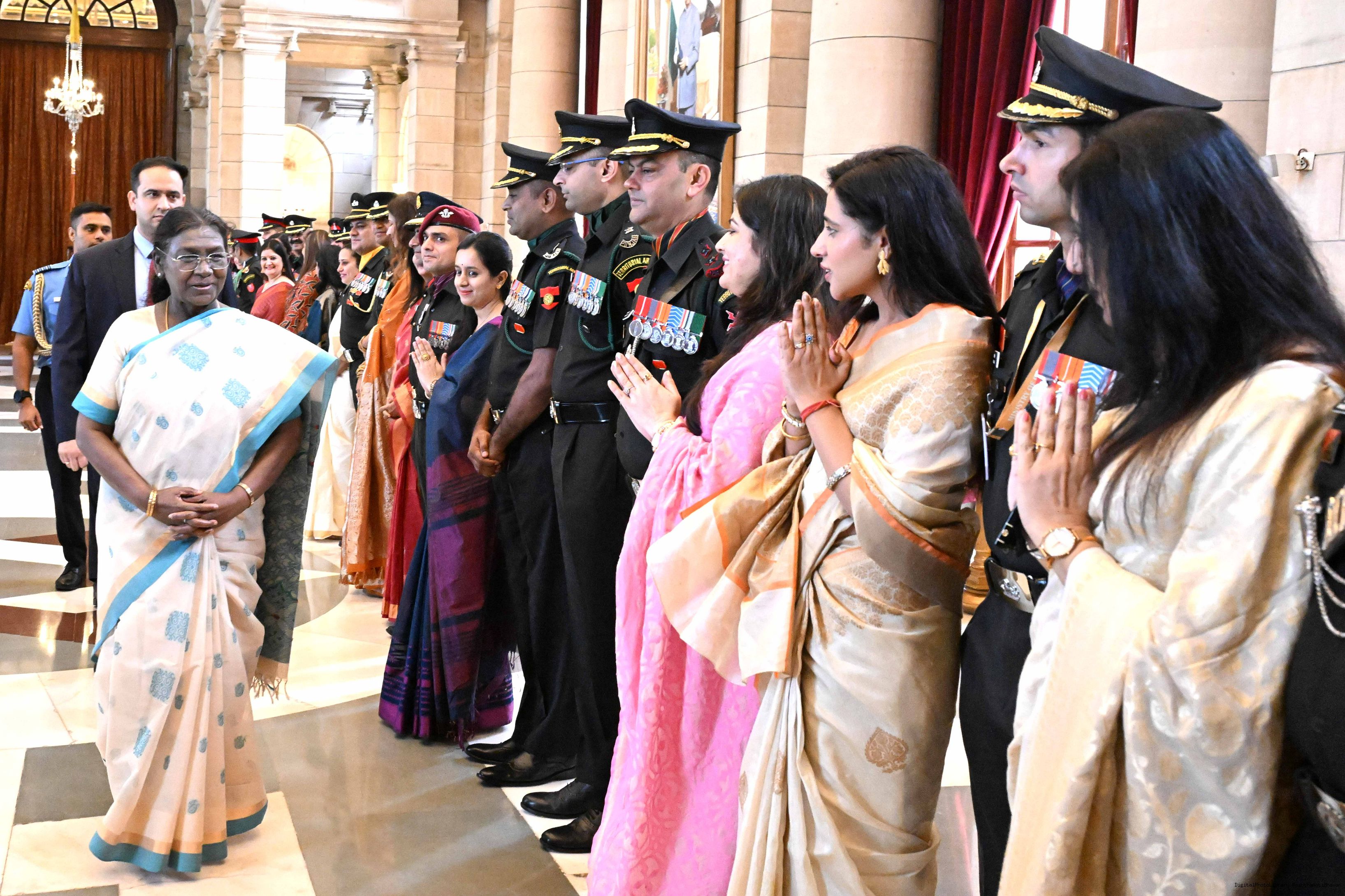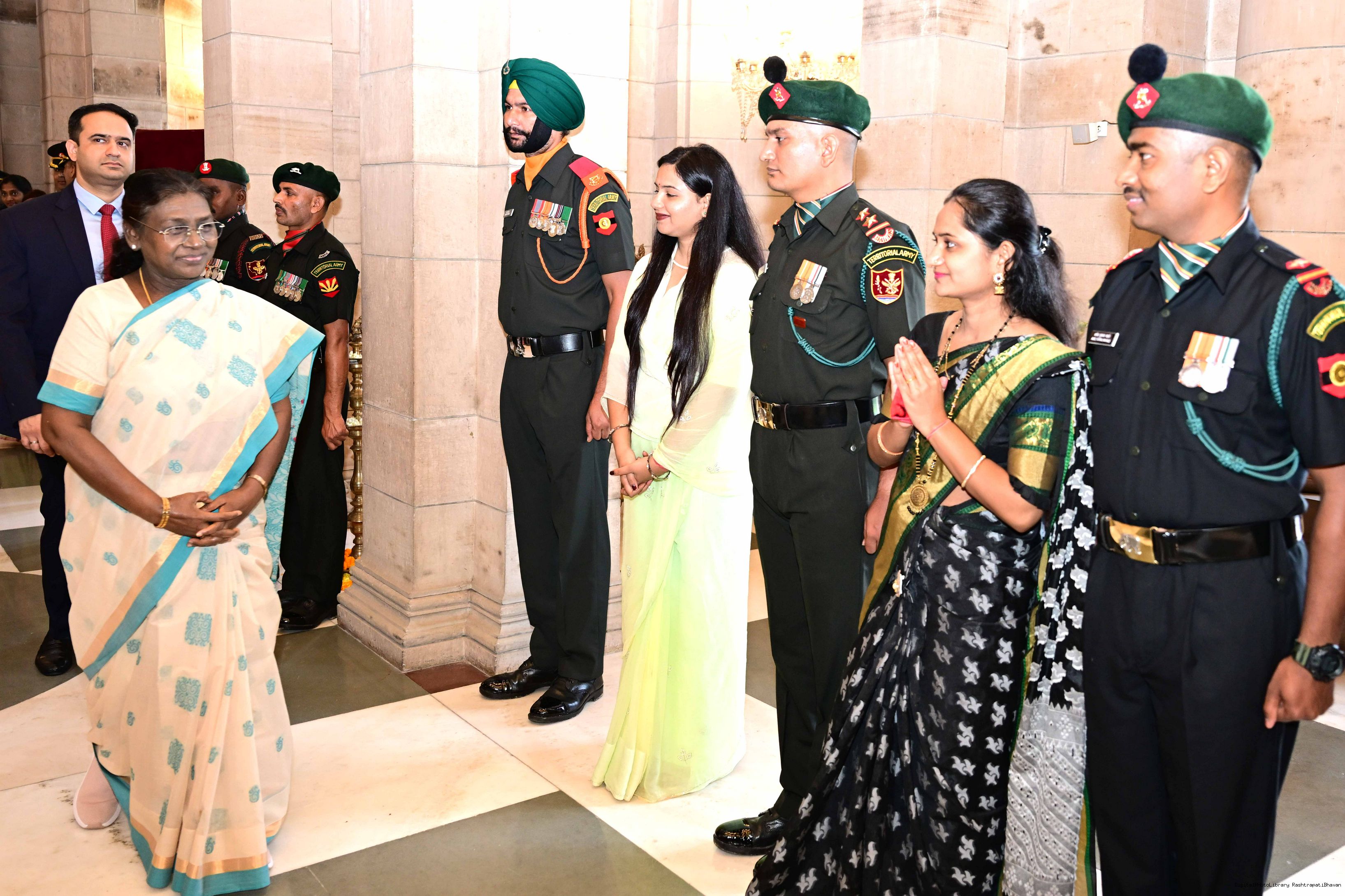 | Caption: | The President of India, Smt. Droupadi Murmu interacted and posing a group photograph with the Indian Air Force personnel attached with Rashtrapati Bhavan on the occasion of Air Force Day on October 8, 2025. |