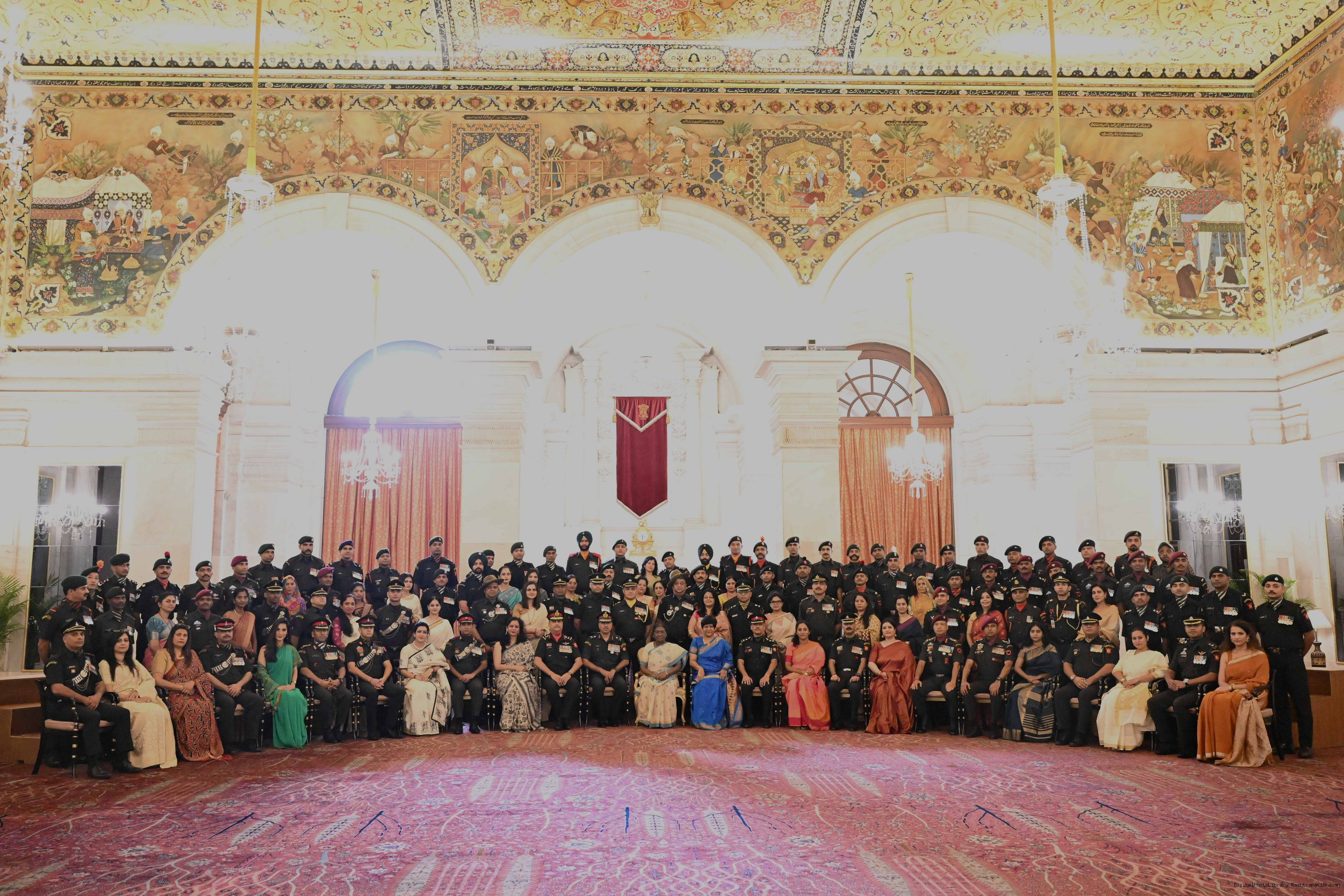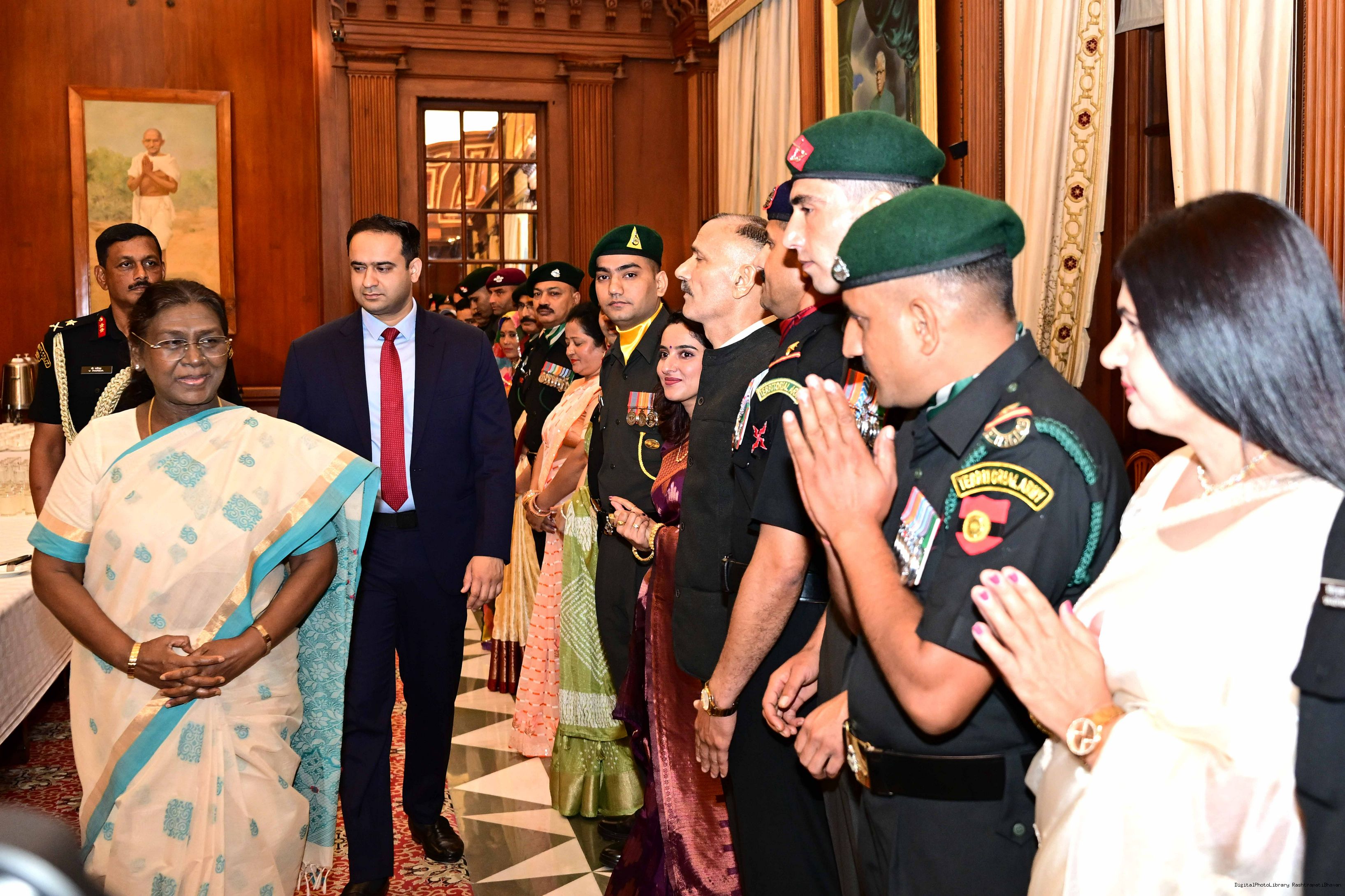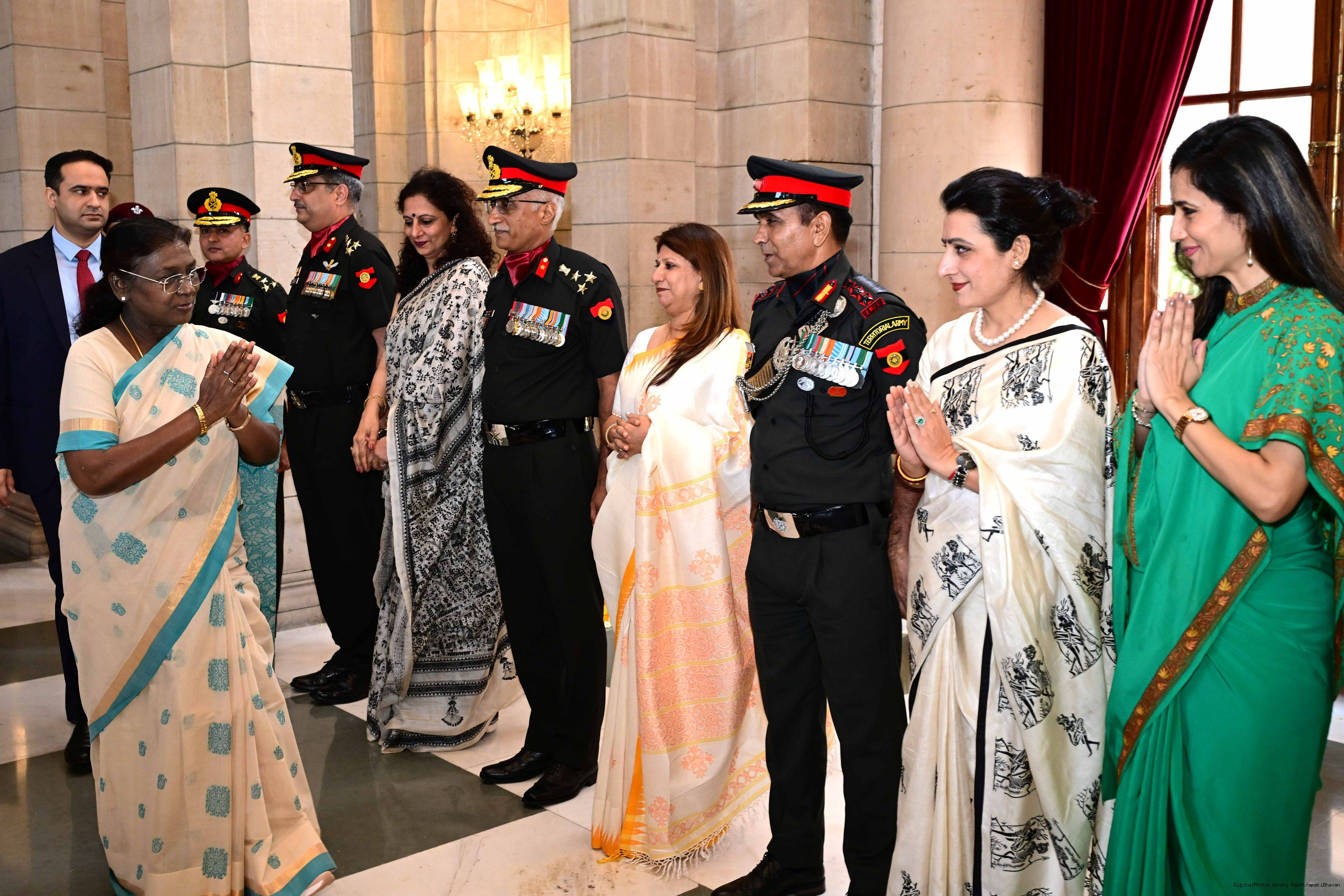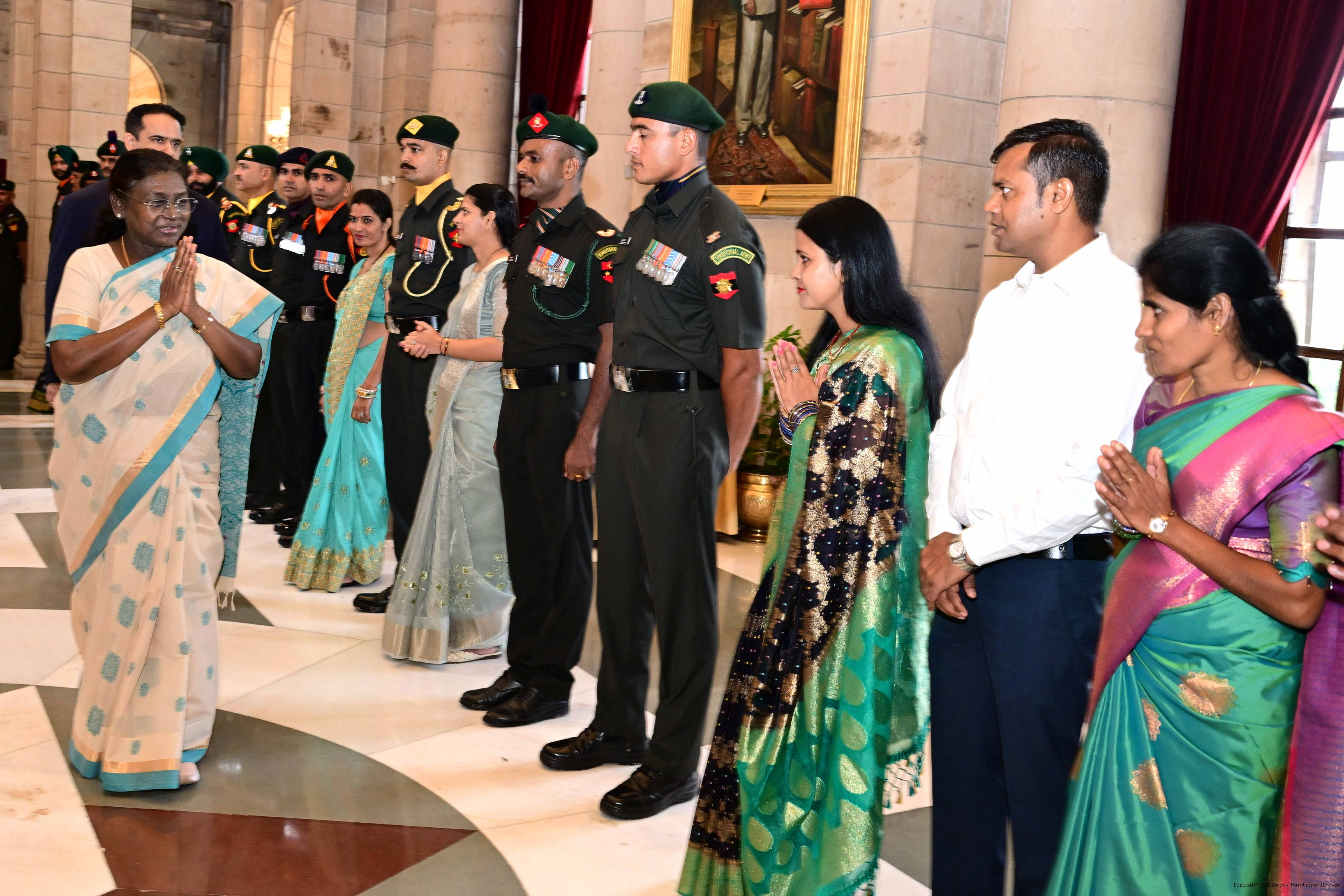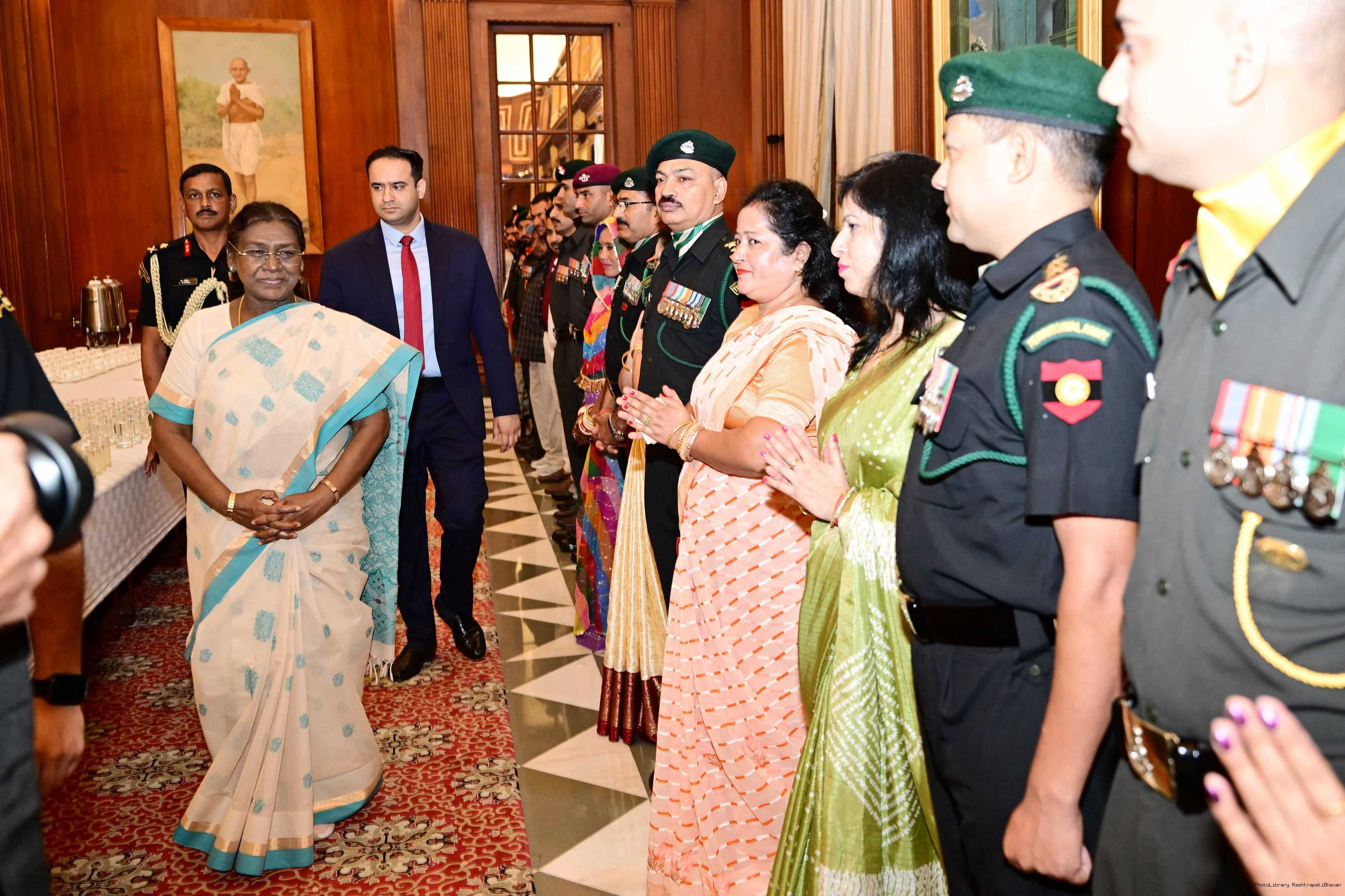 | Caption: | The President of India, Smt. Droupadi Murmu interacted and posing a group photograph with the Indian Air Force personnel attached with Rashtrapati Bhavan on the occasion of Air Force Day on October 8, 2025. |