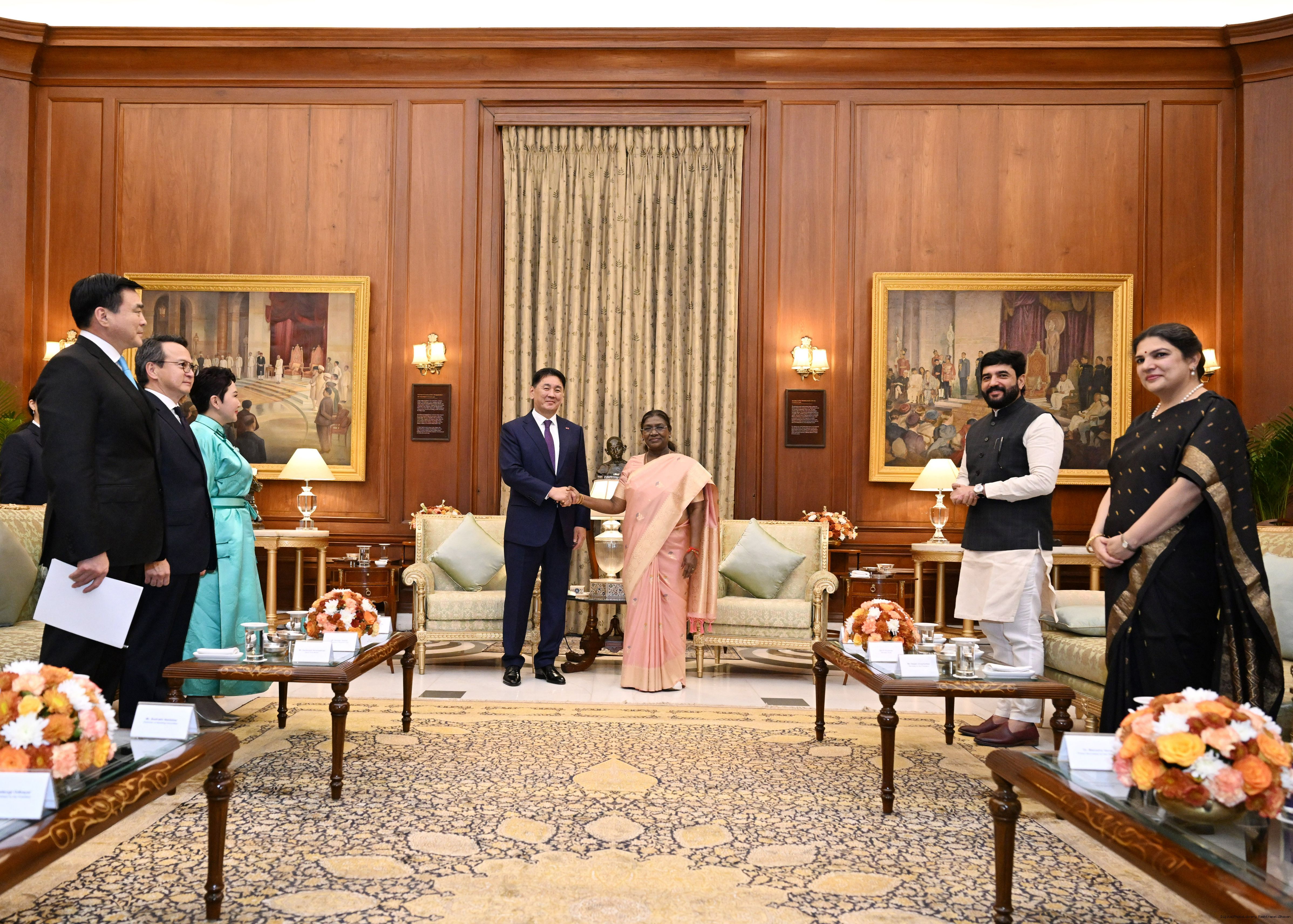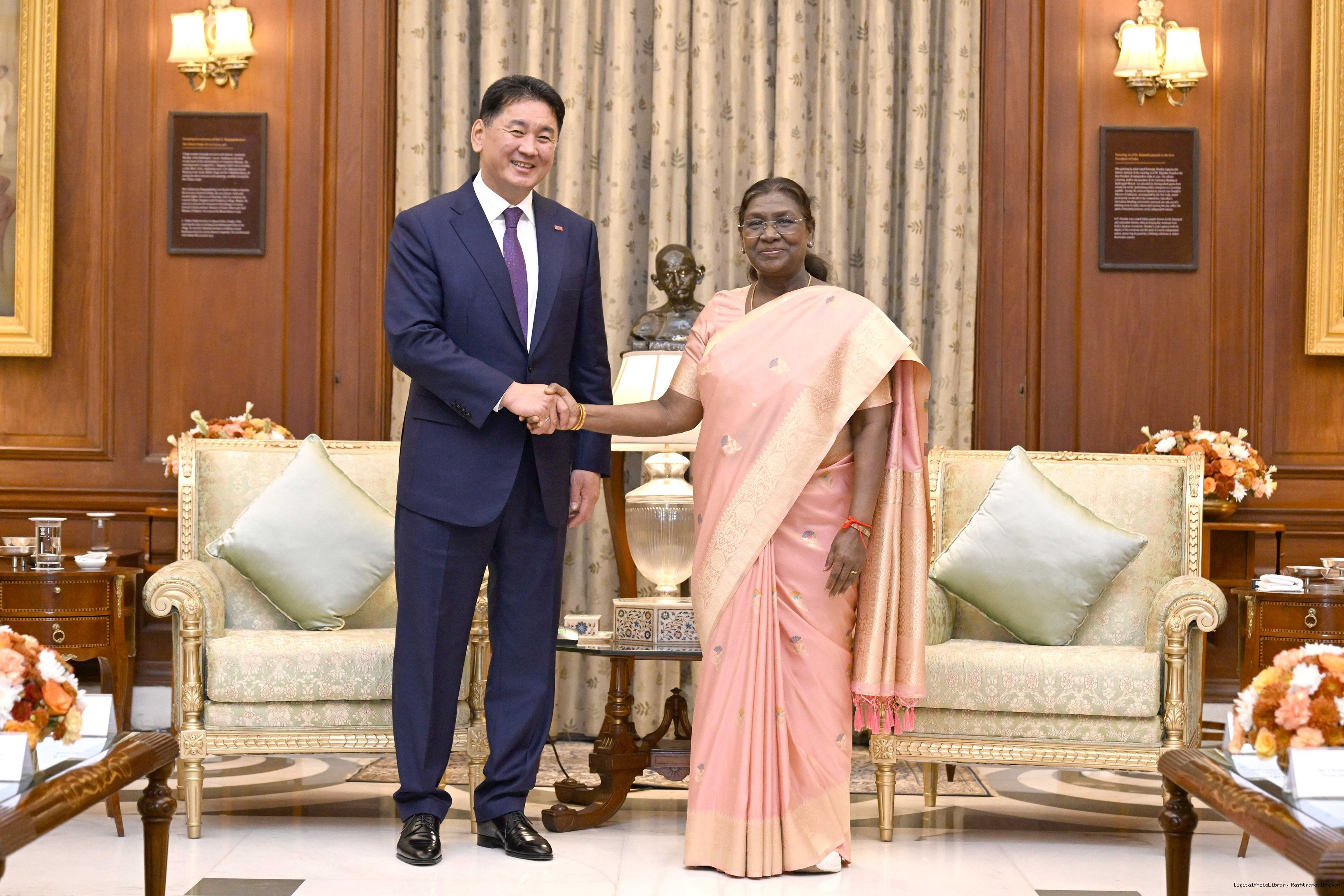 | Caption: | The President of India, Smt. Droupadi Murmu received H.E. Mr Khurelsukh Ukhnaa, President of Mongolia at Rashtrapati Bhavan on October 14, 2025. |
