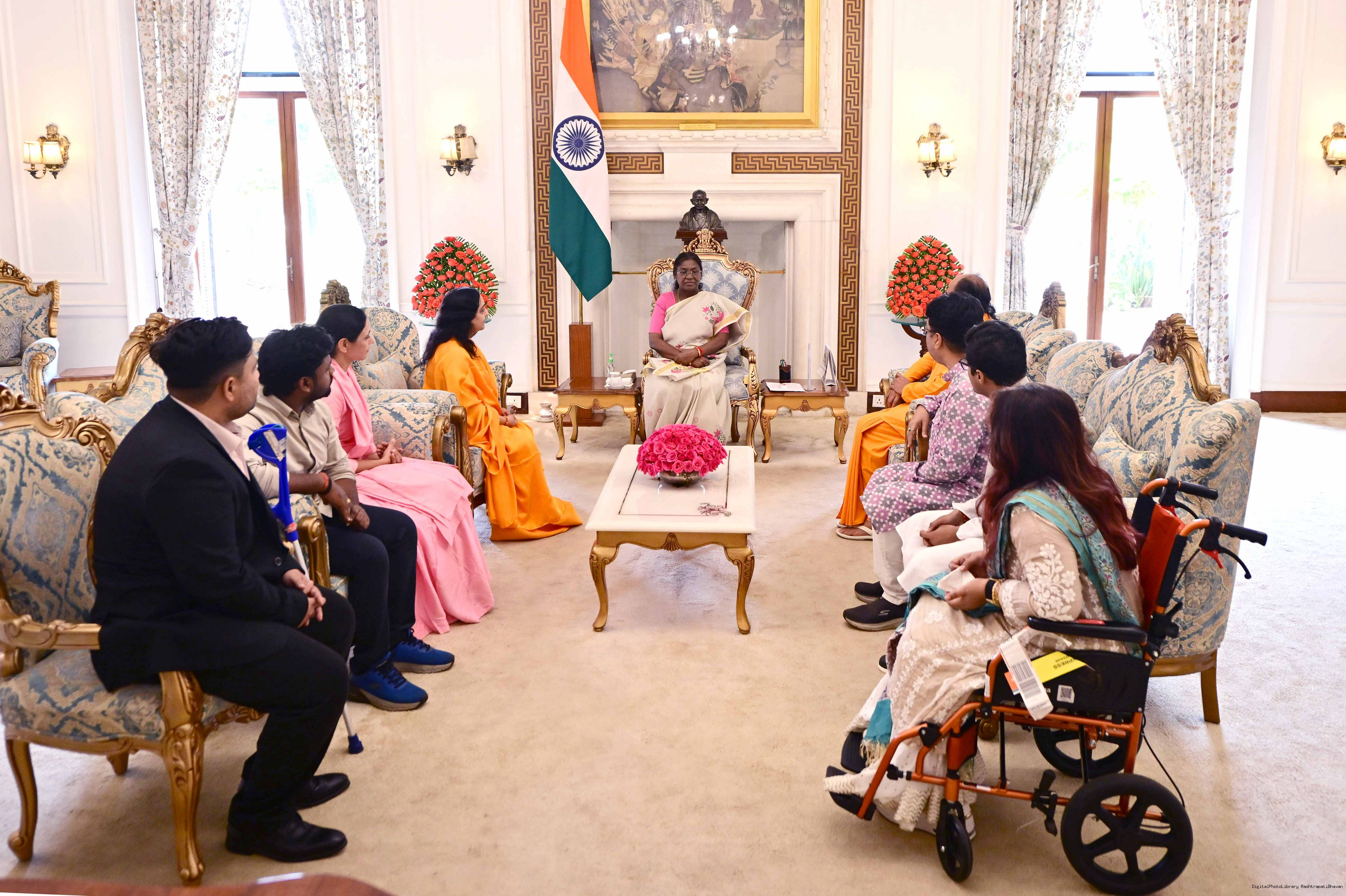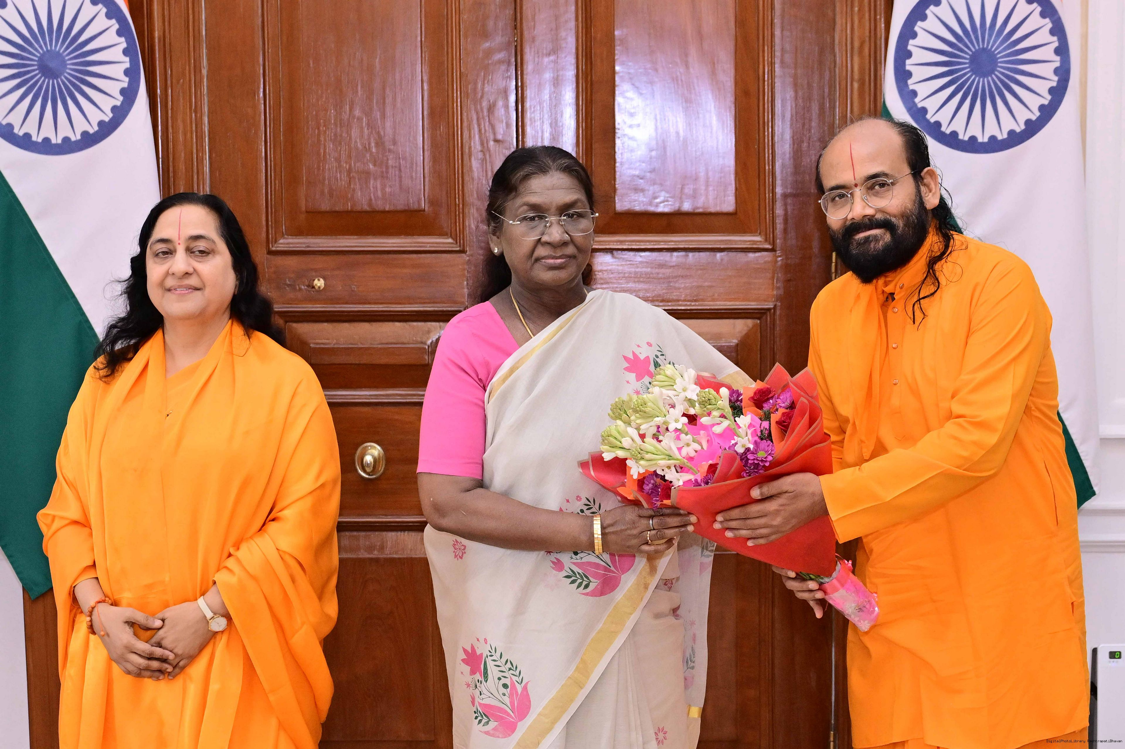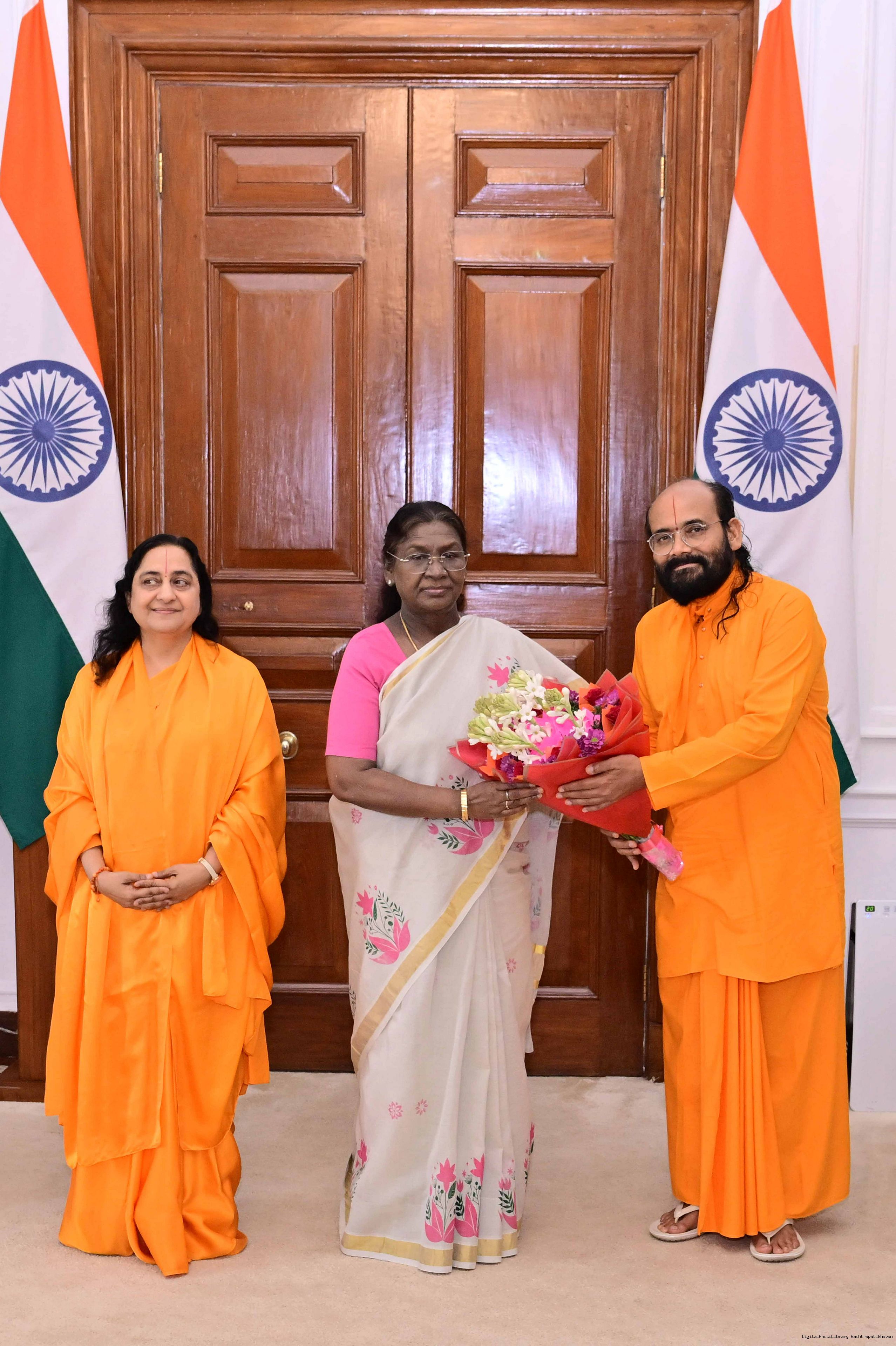 | Caption: | Dr. Krushna Chandra Mahapatra, Minister of Housing Urban Development Public Enterprises, Govt. of Odisha along with Her Holiness Raseshwari Devi of Braja Gopika Seva Mission meeting with the President of India, Smt. Droupadi Murmu at Rashtrapati Bhavan on October 15, 2025. |