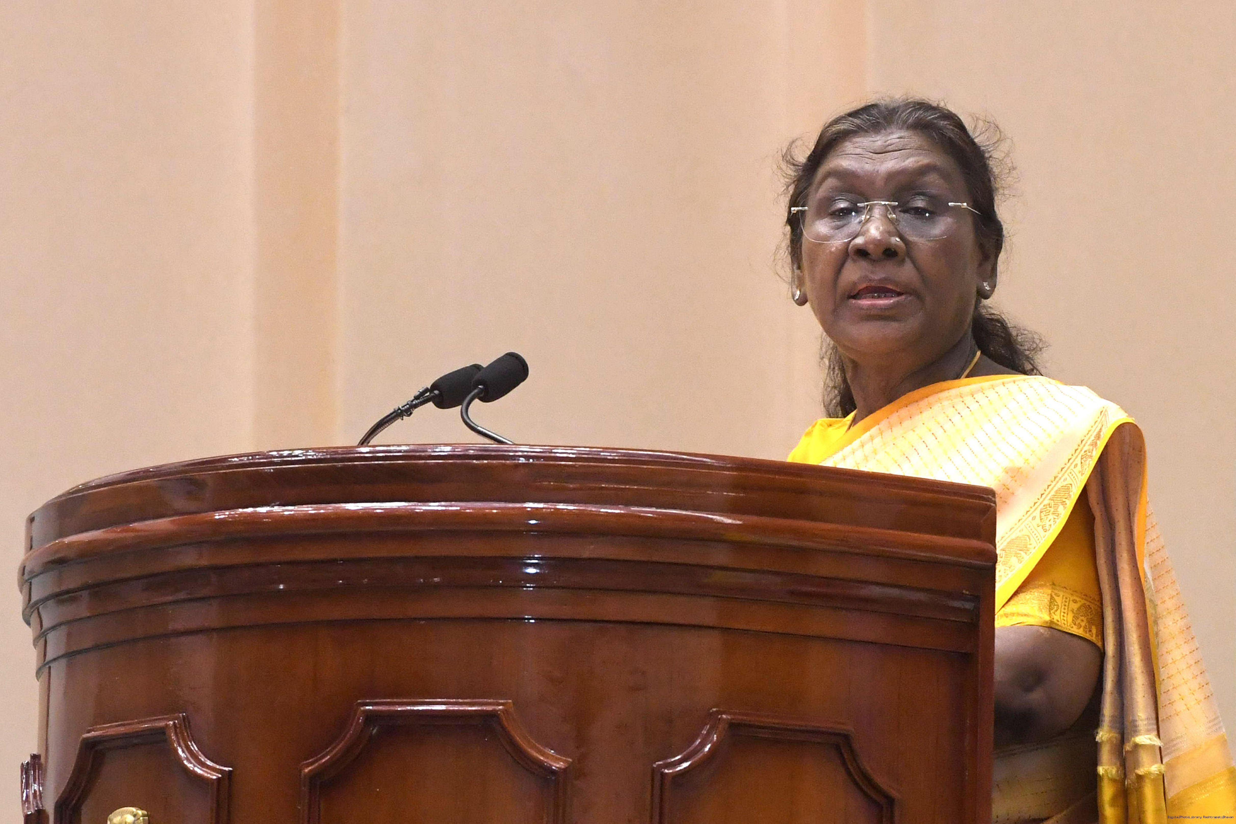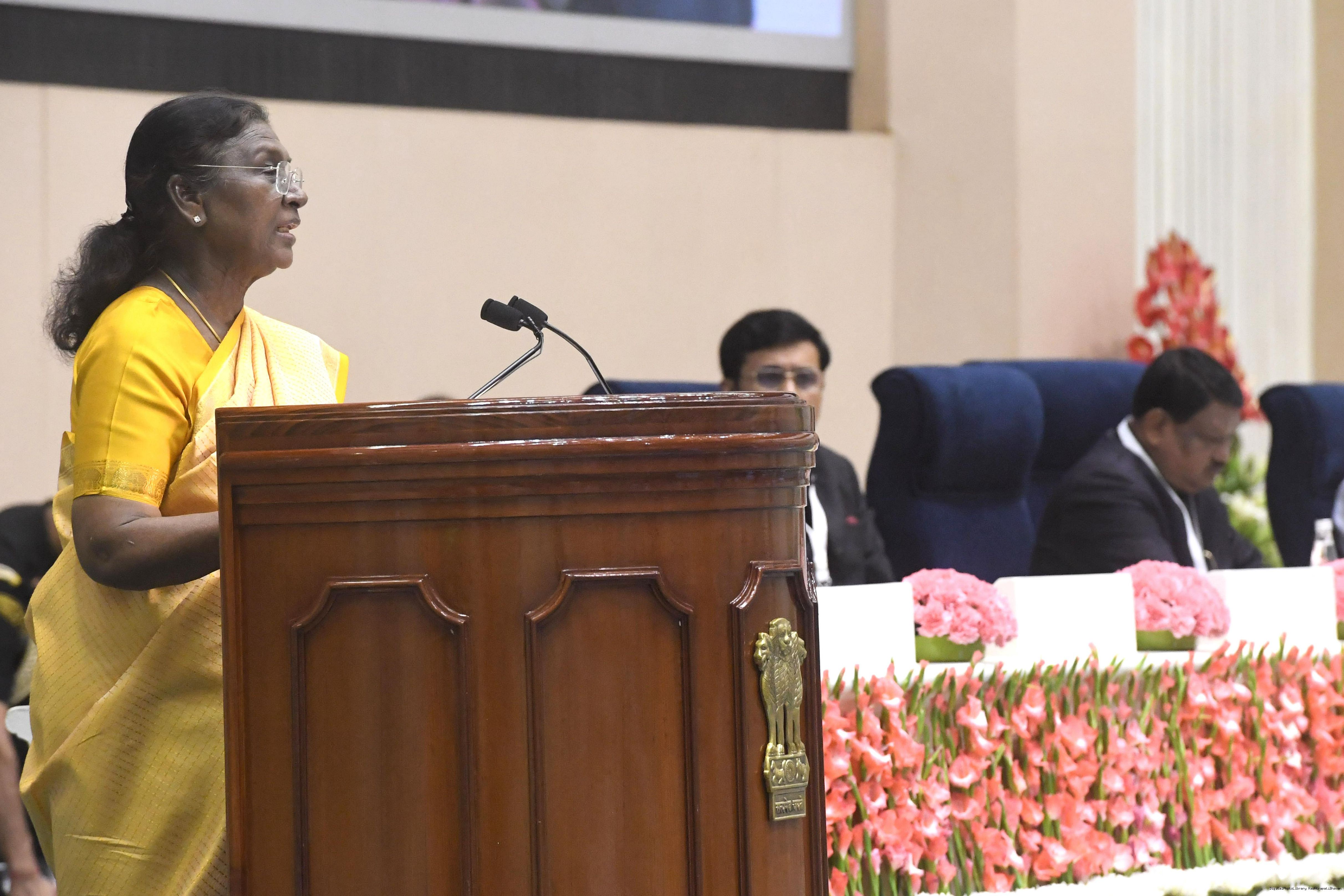 Caption: The President of India, Smt. Droupadi Murmu addressed the national conclave on the ‘Adi Karmayogi Abhiyan’ and presented awards to the best-performing states, districts, blocks, and Integrated Tribal Development Agencies at a function held in New Delhi on October 17, 2025.