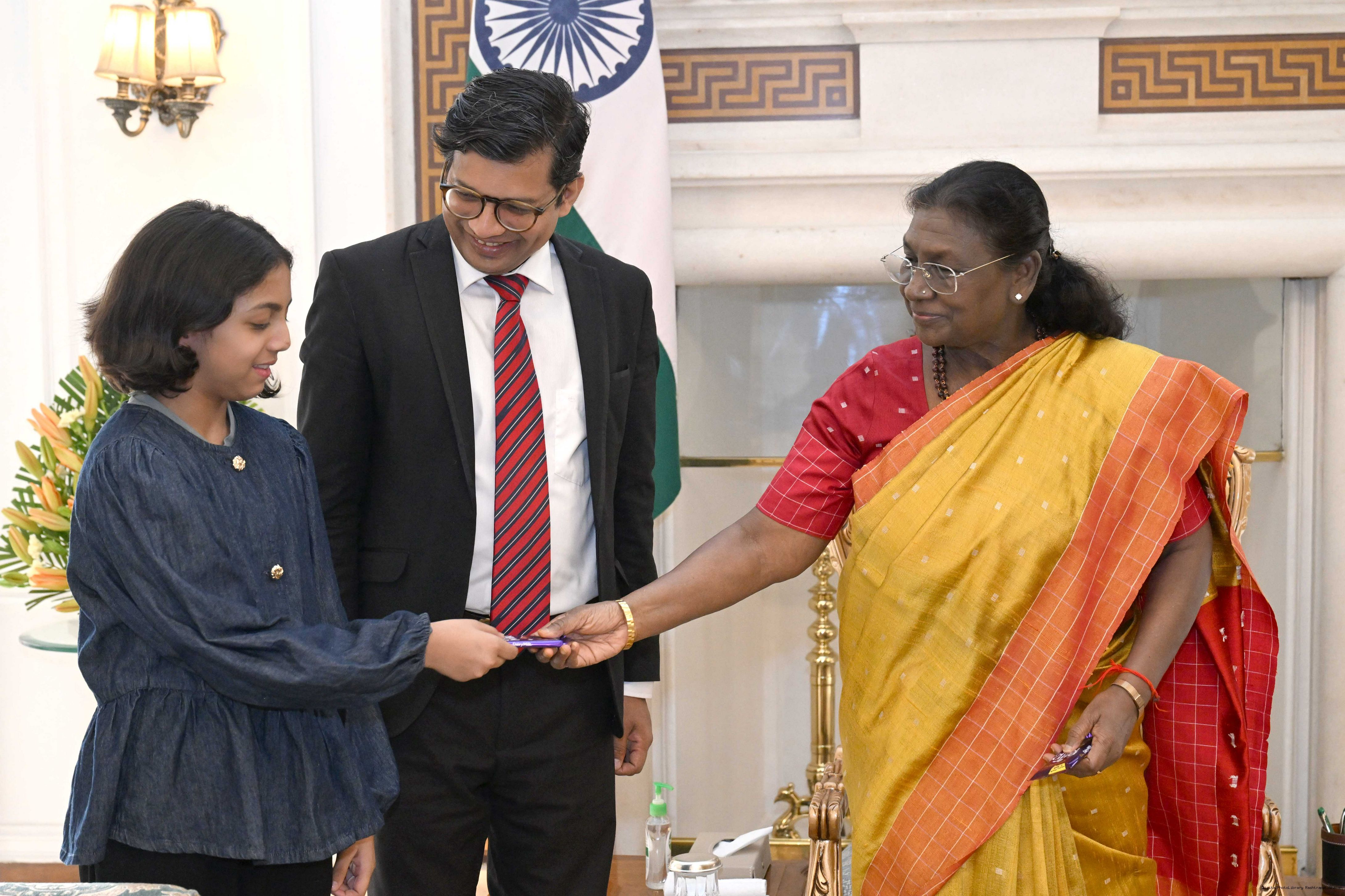 | Caption: | Dr. Shibashish Giri, from Hatbadra, Dist. Mayurbhanj, Odisha along with daughters Ms. Shibangshi Giri Rudrangshi Giri meeting with the President of India, Smt. Droupadi Murmu at Rashtrapati Bhavan on October 21, 2025. |