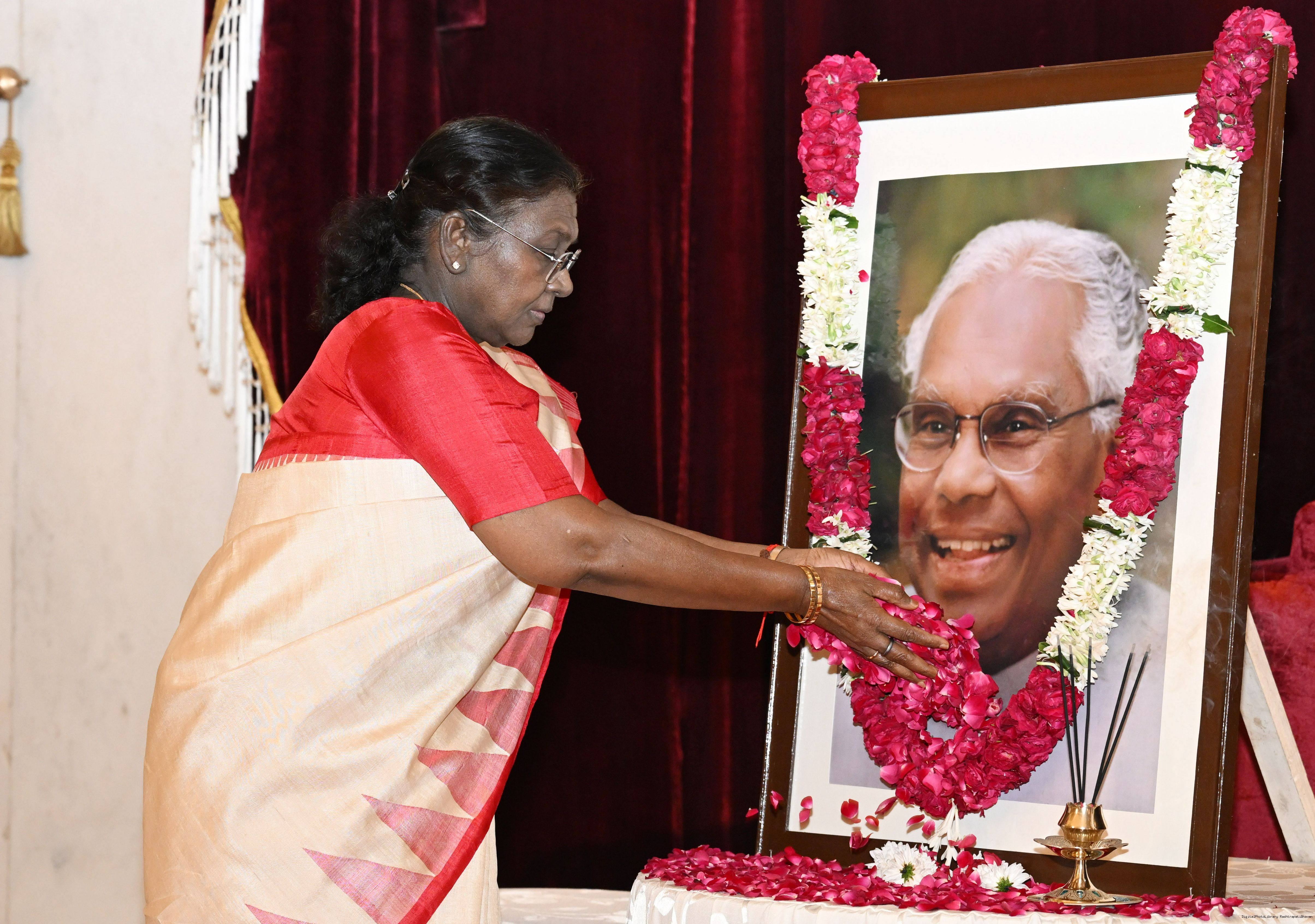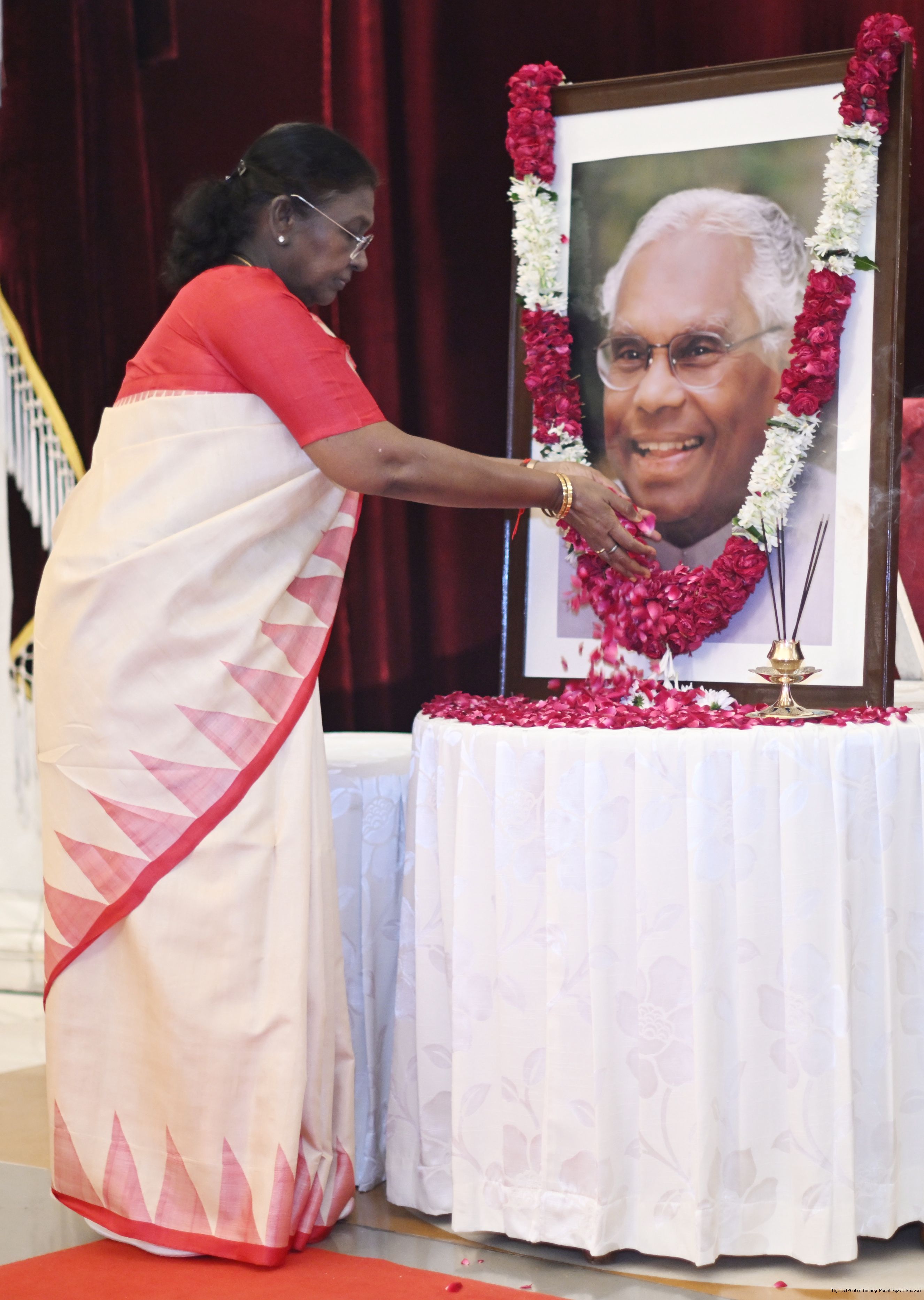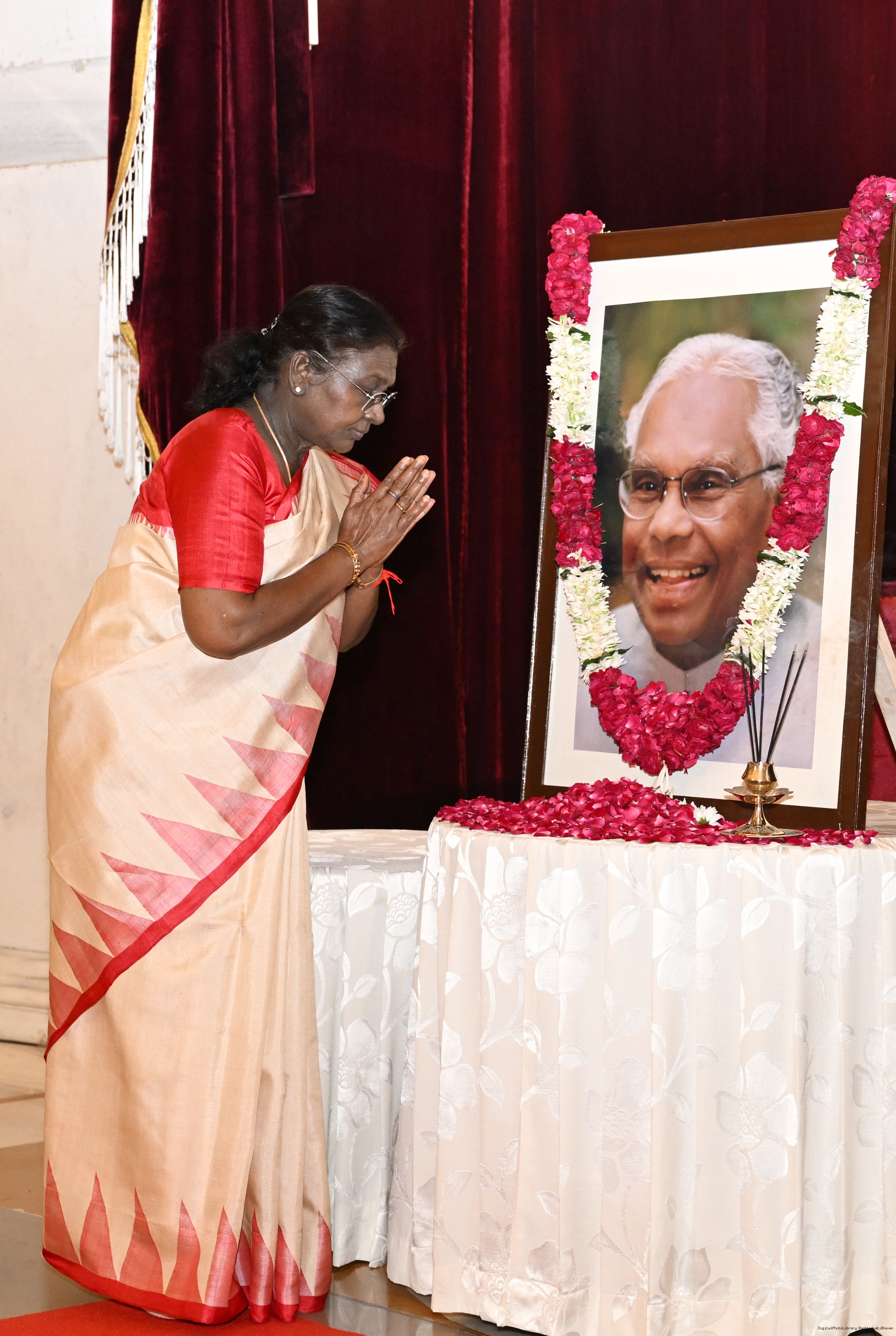 | Caption: | The President of India, Smt Droupadi Murmu paid floral tributes to Shri K.R. Narayanan, former President of India, on his birth anniversary at Rashtrapati Bhavan on October 27, 2025. |