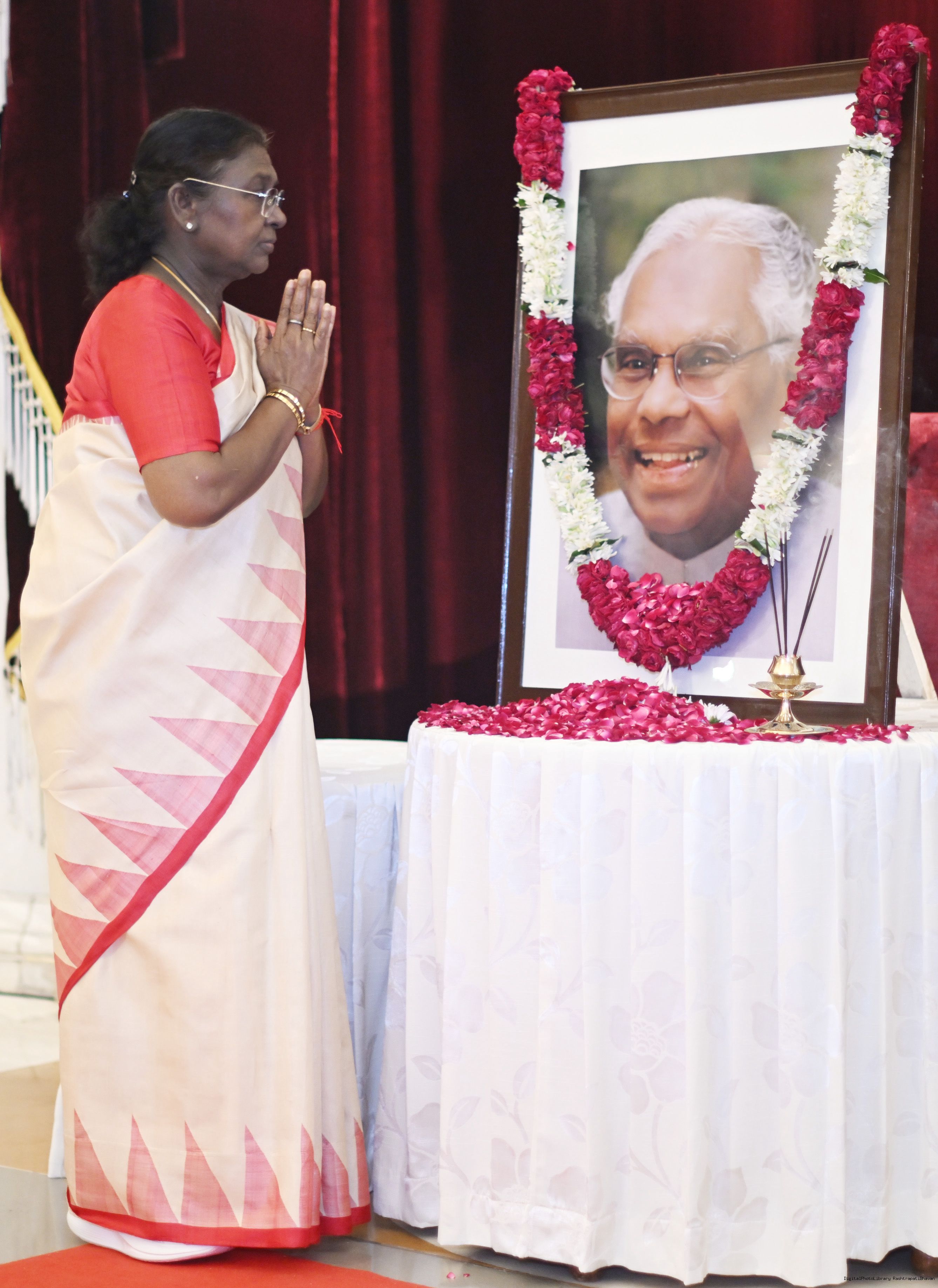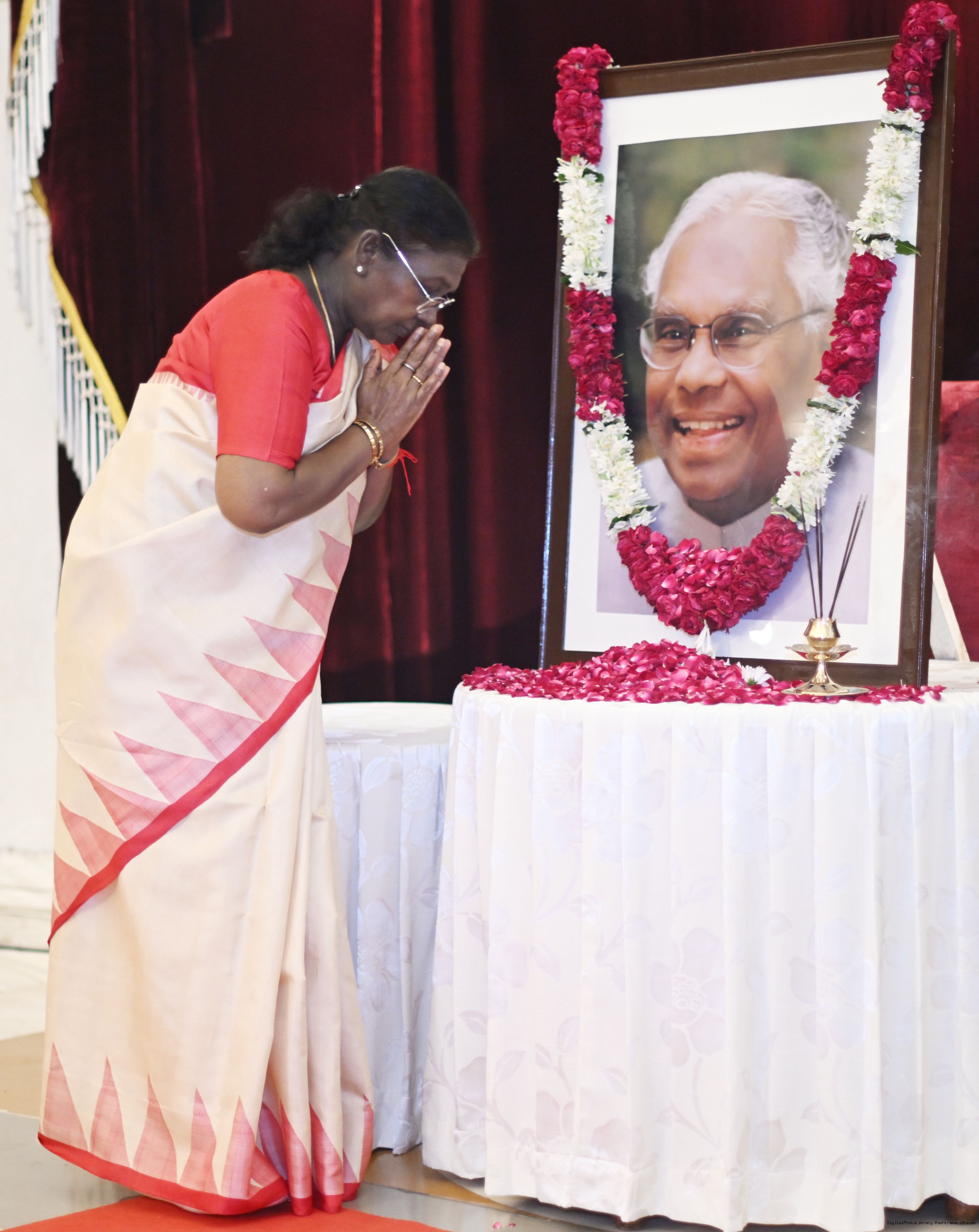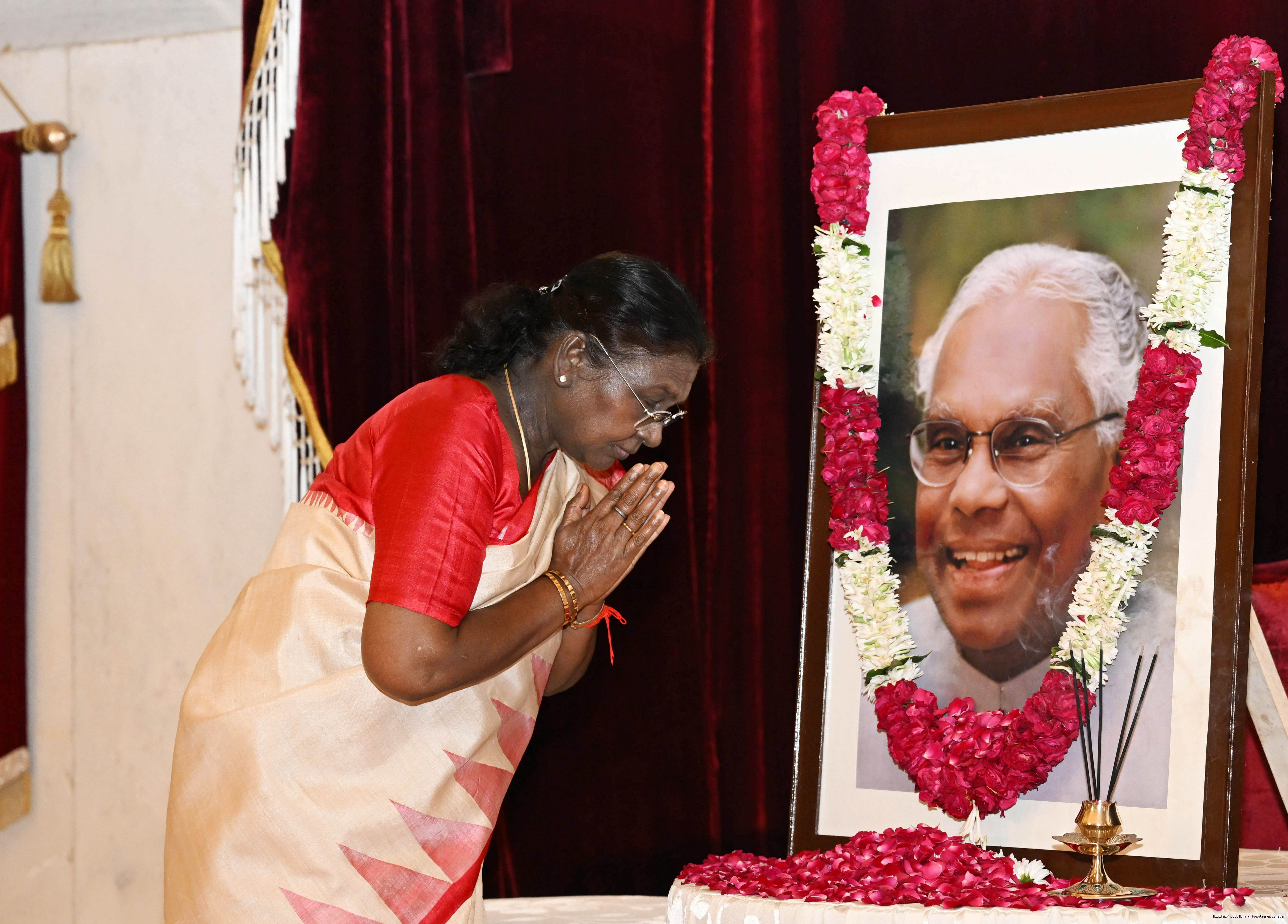 | Caption: | The President of India, Smt Droupadi Murmu paid floral tributes to Shri K.R. Narayanan, former President of India, on his birth anniversary at Rashtrapati Bhavan on October 27, 2025. |