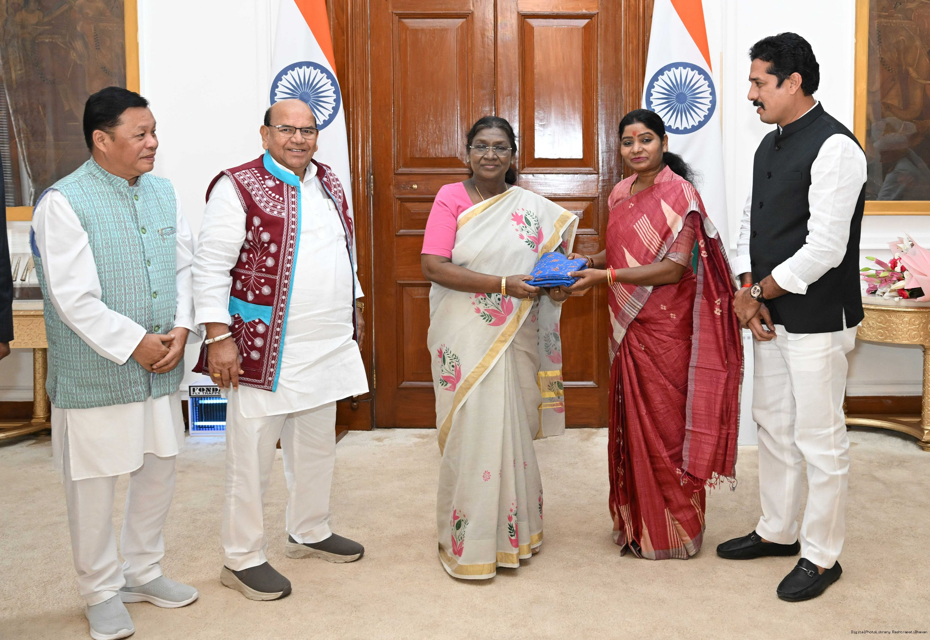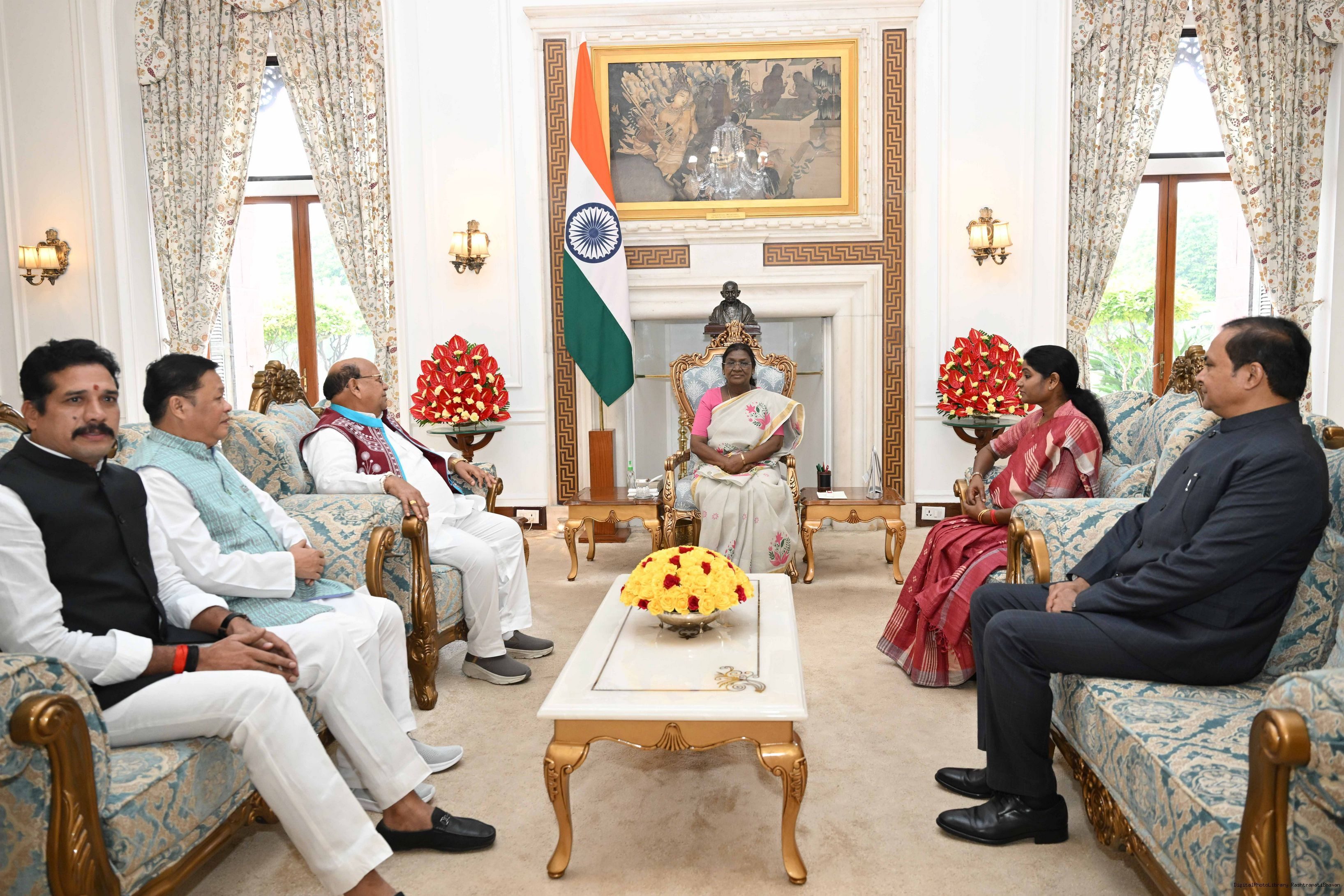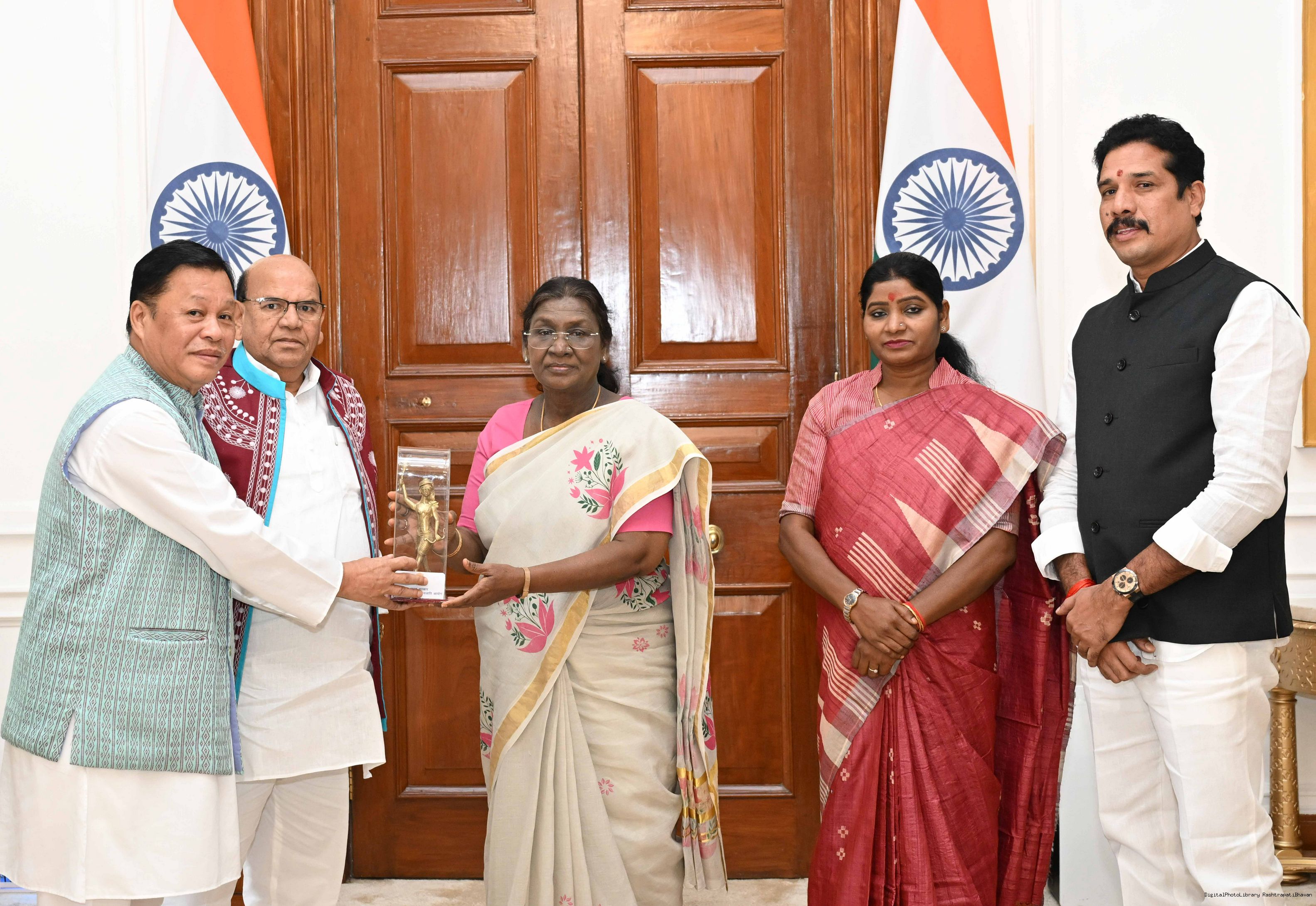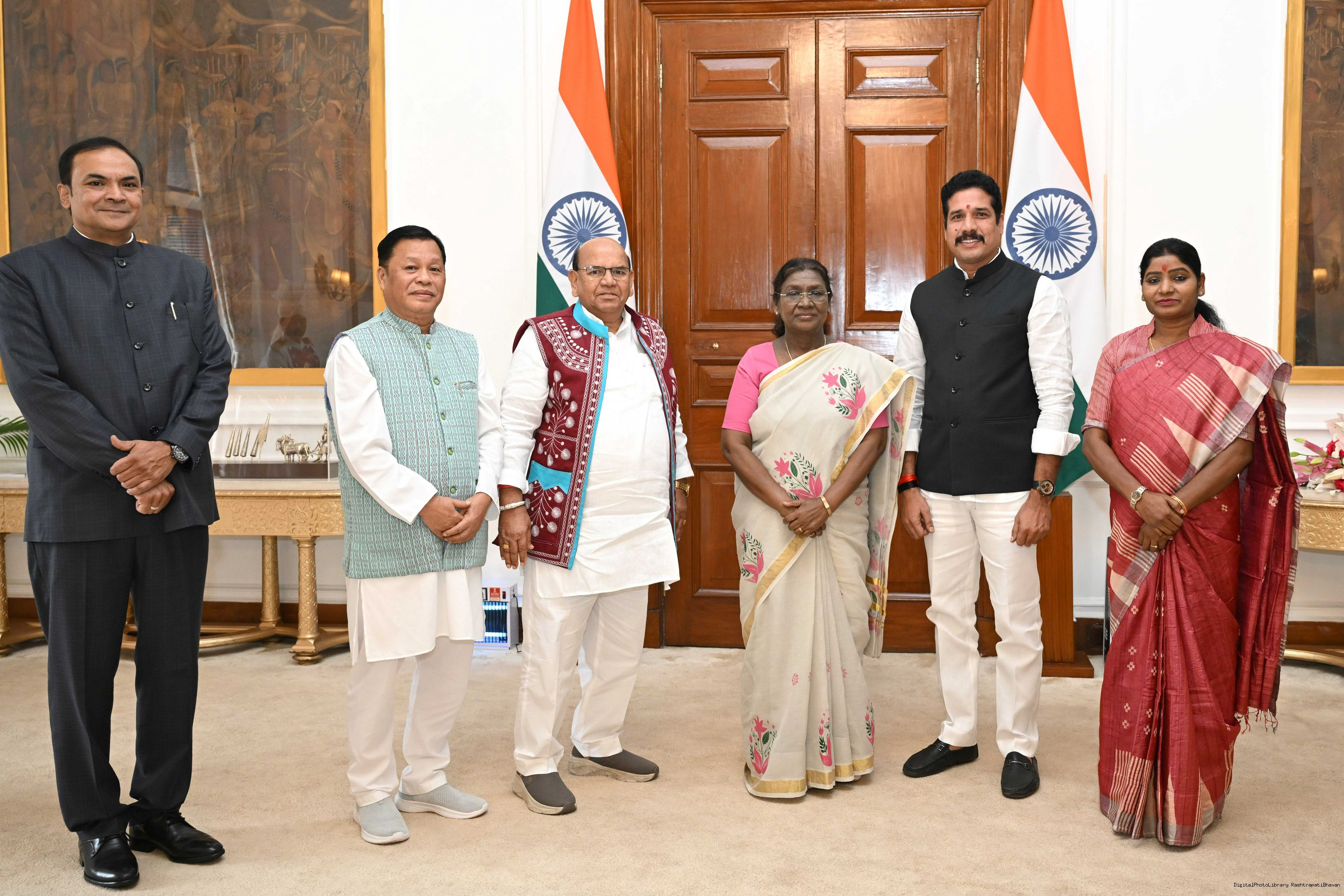 | Caption: | Shri Antar Singh Arya, Chairperson, NCST along with Shri Nirupam Chakma and others meeting with the President of India, Smt Droupadi Murmu at Rashtrapati Bhavan on October 28, 2025. |