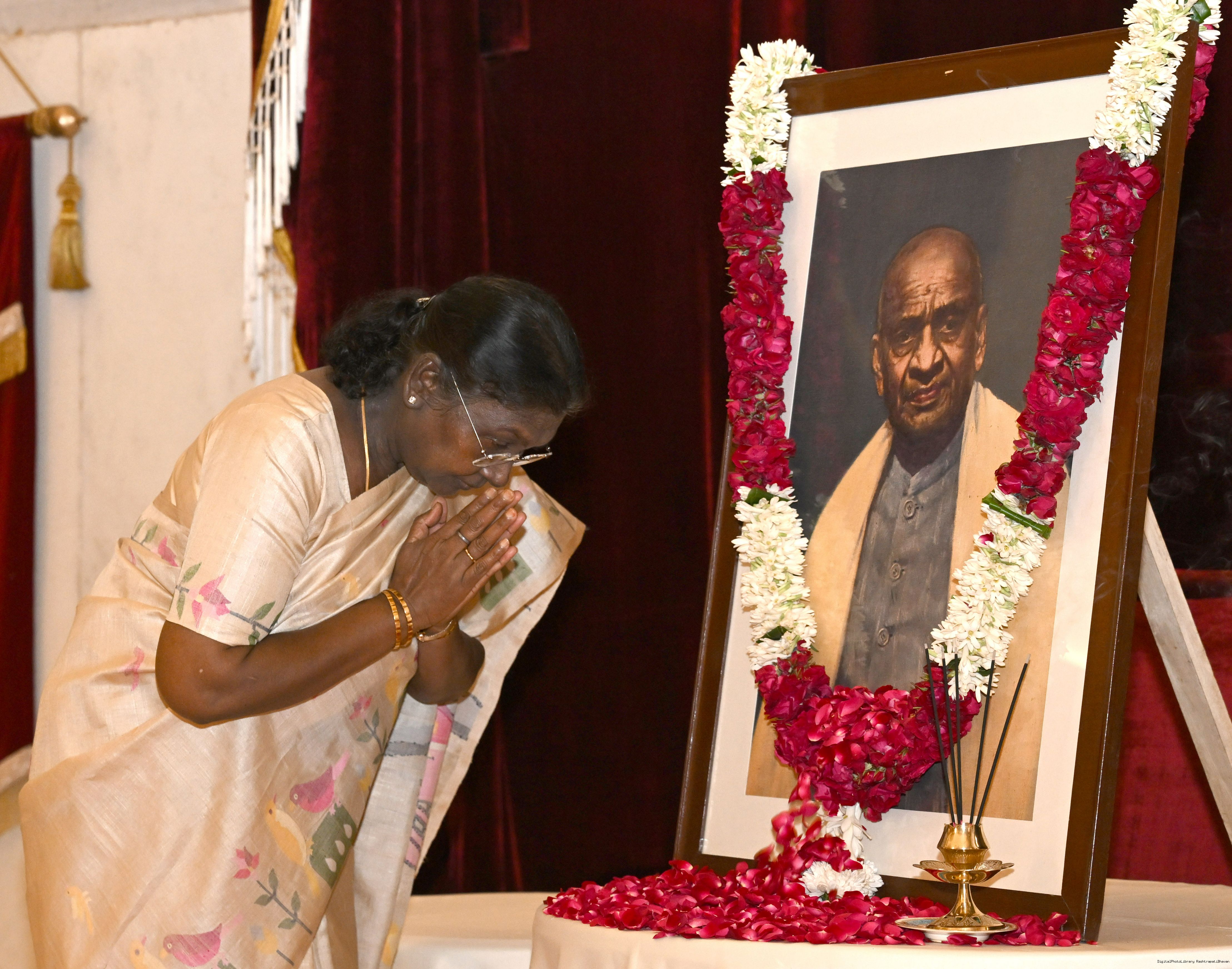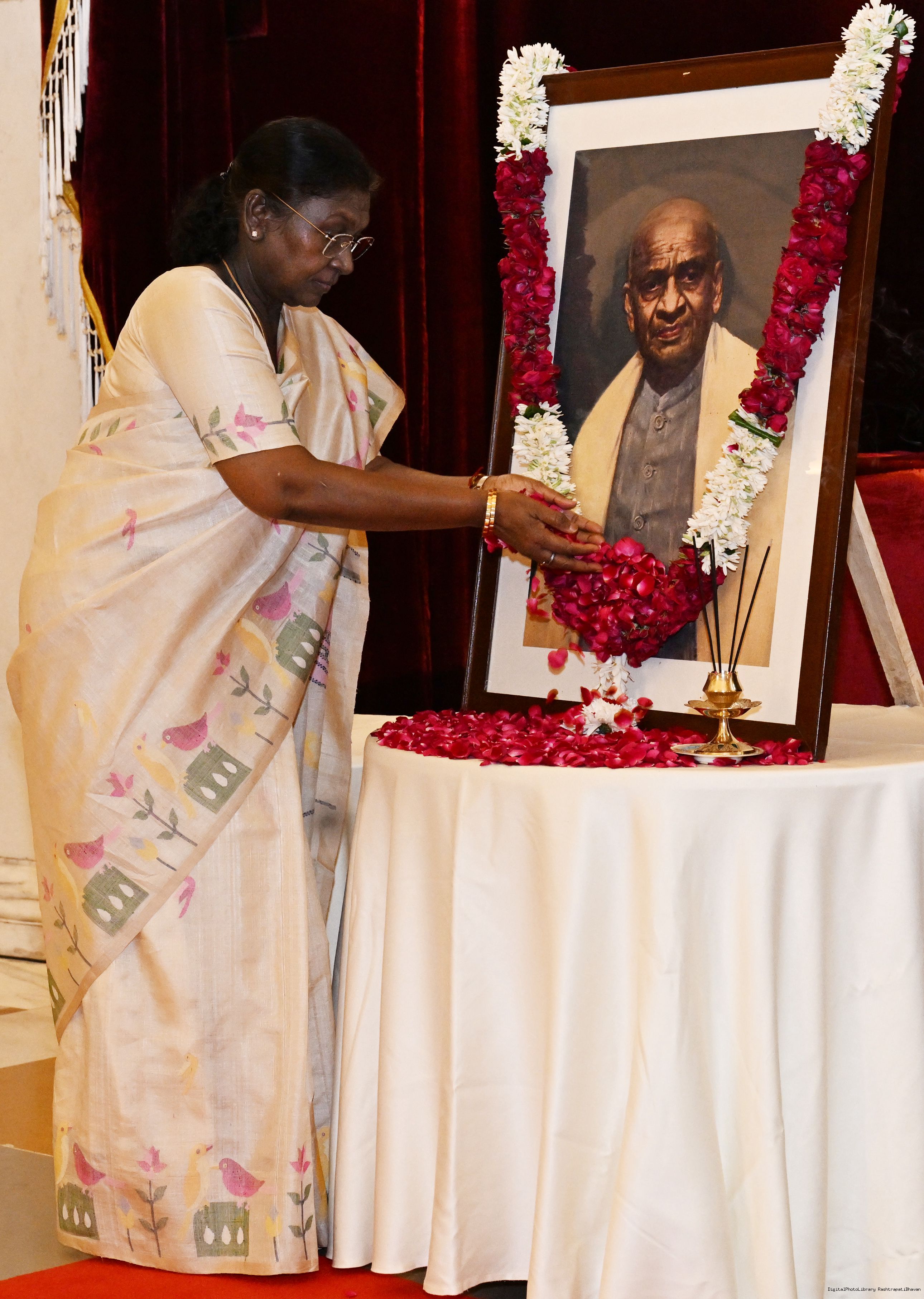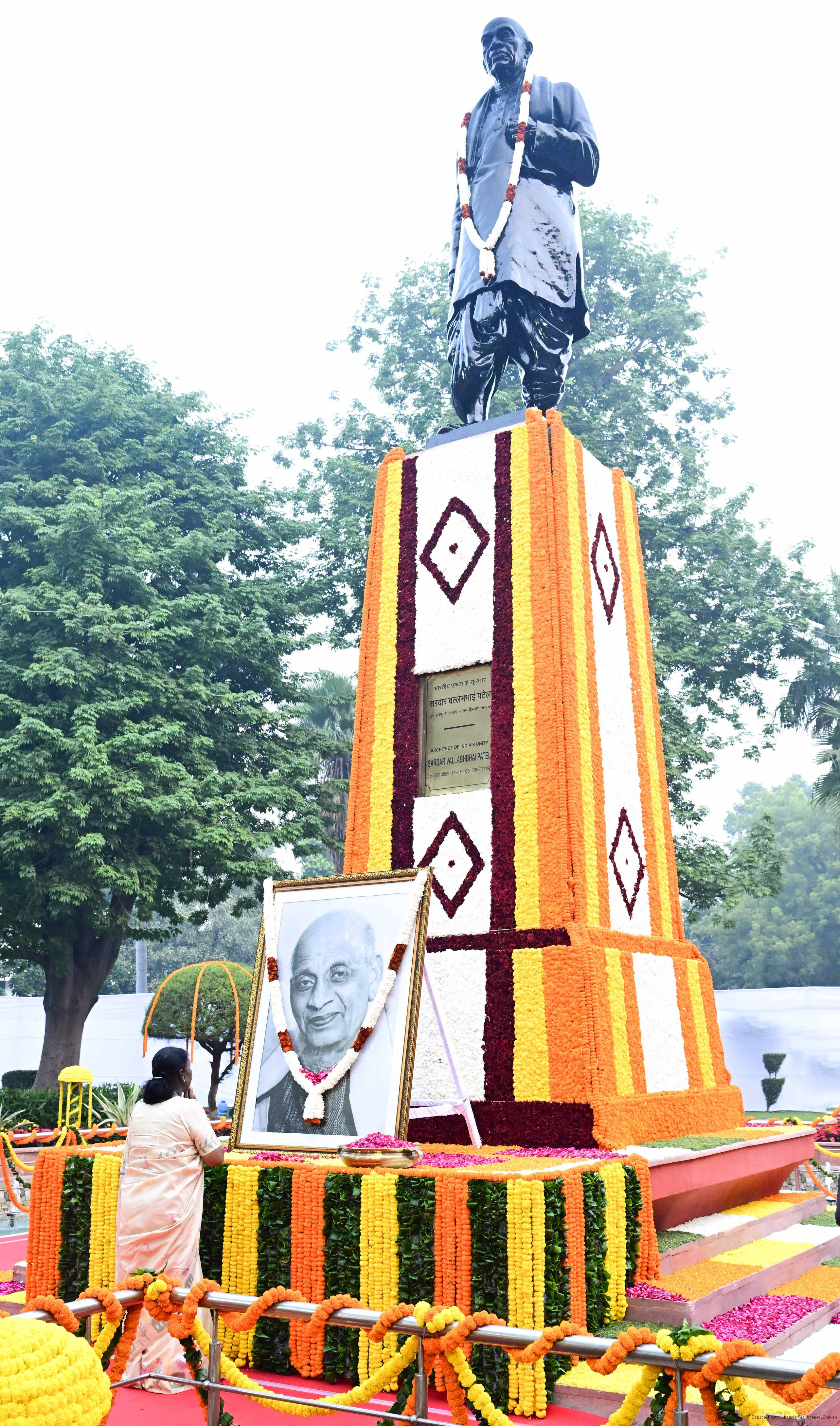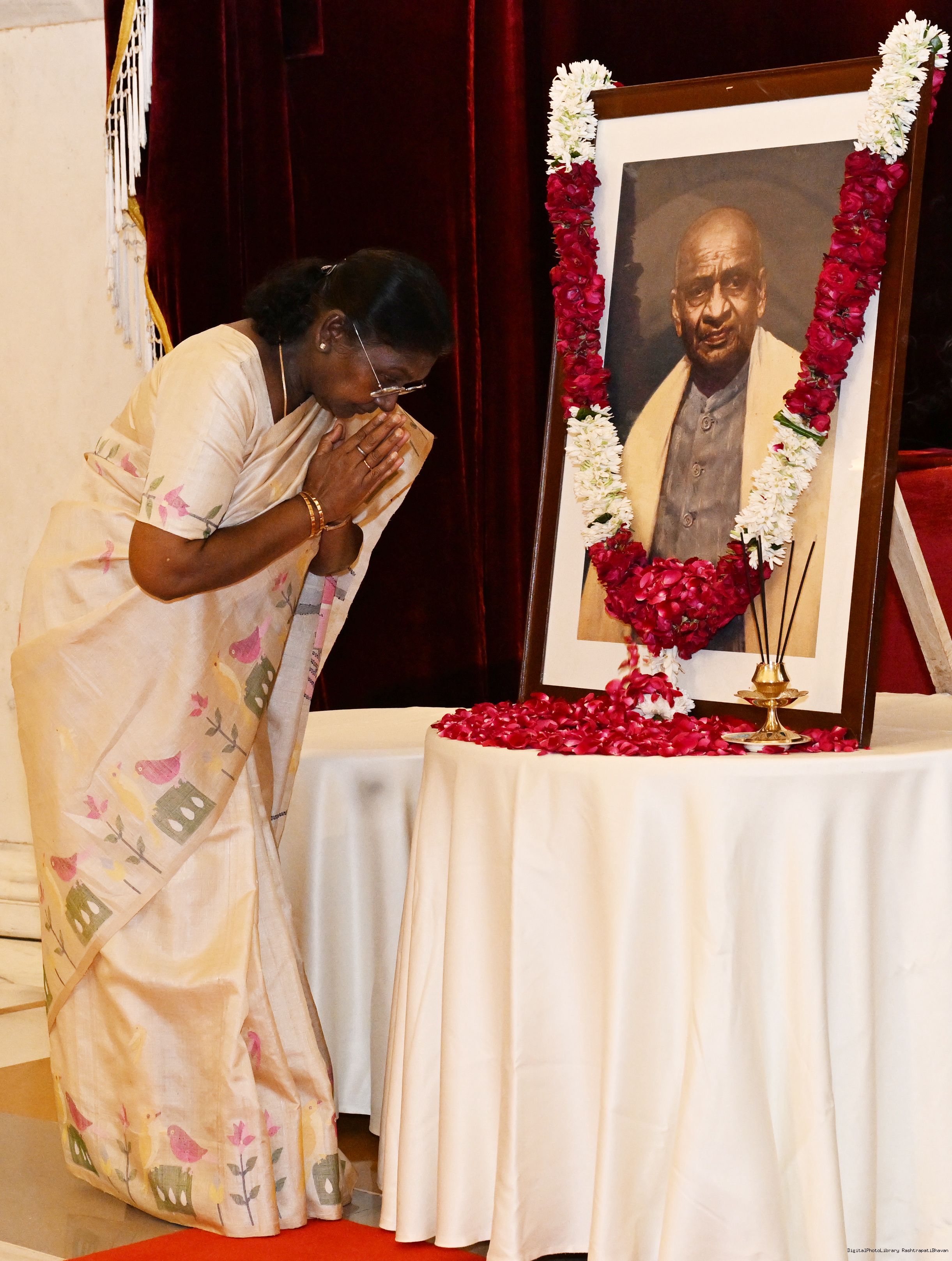 | Caption: | The President of India, Smt Droupadi Murmu paid homage at Patel Chowk in New Delhi and paid floral tributes to Sardar Vallabhbhai Patel on his 150th birth anniversary at Rashtrapati Bhavan on October 31, 2025. |
