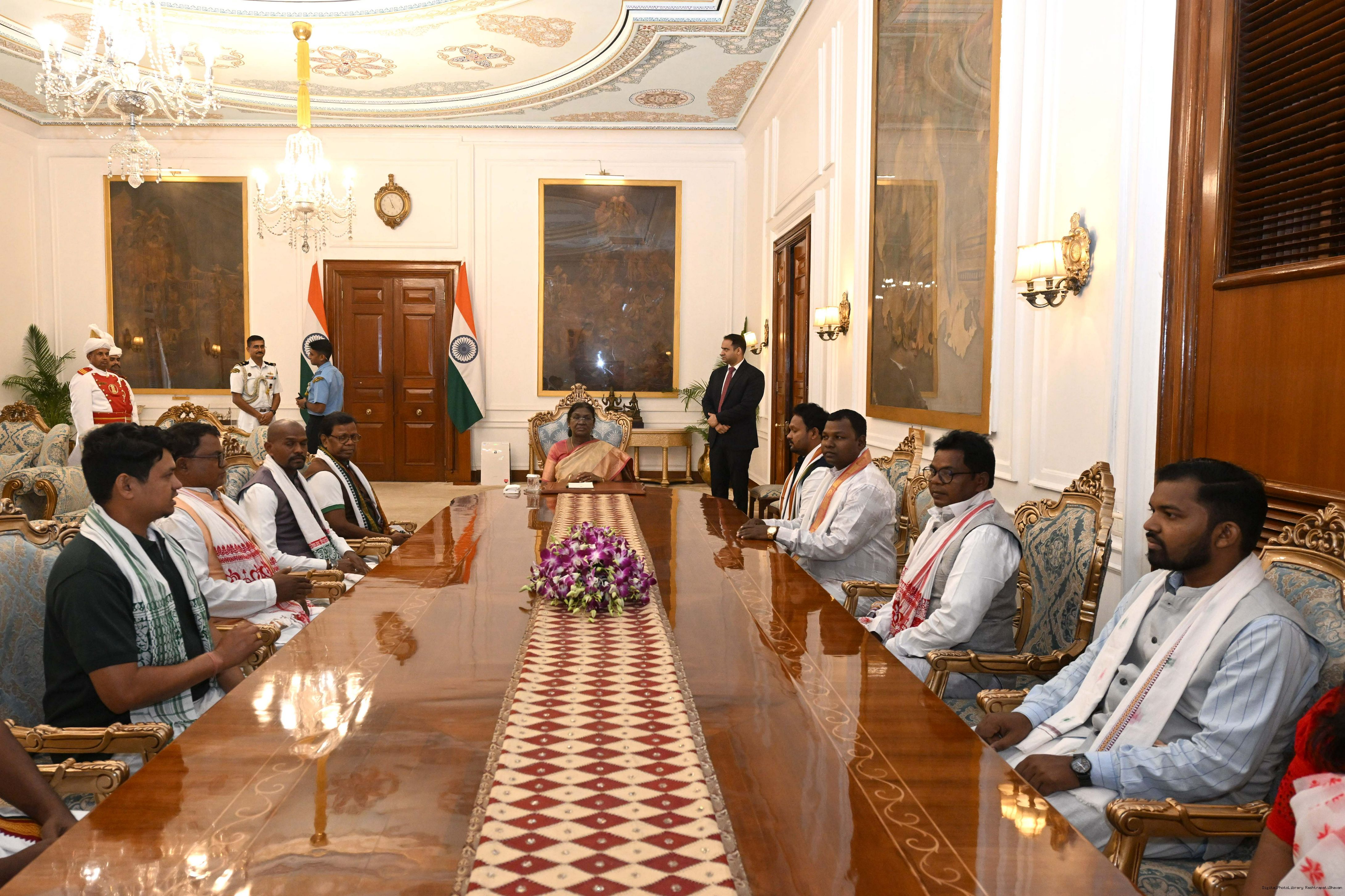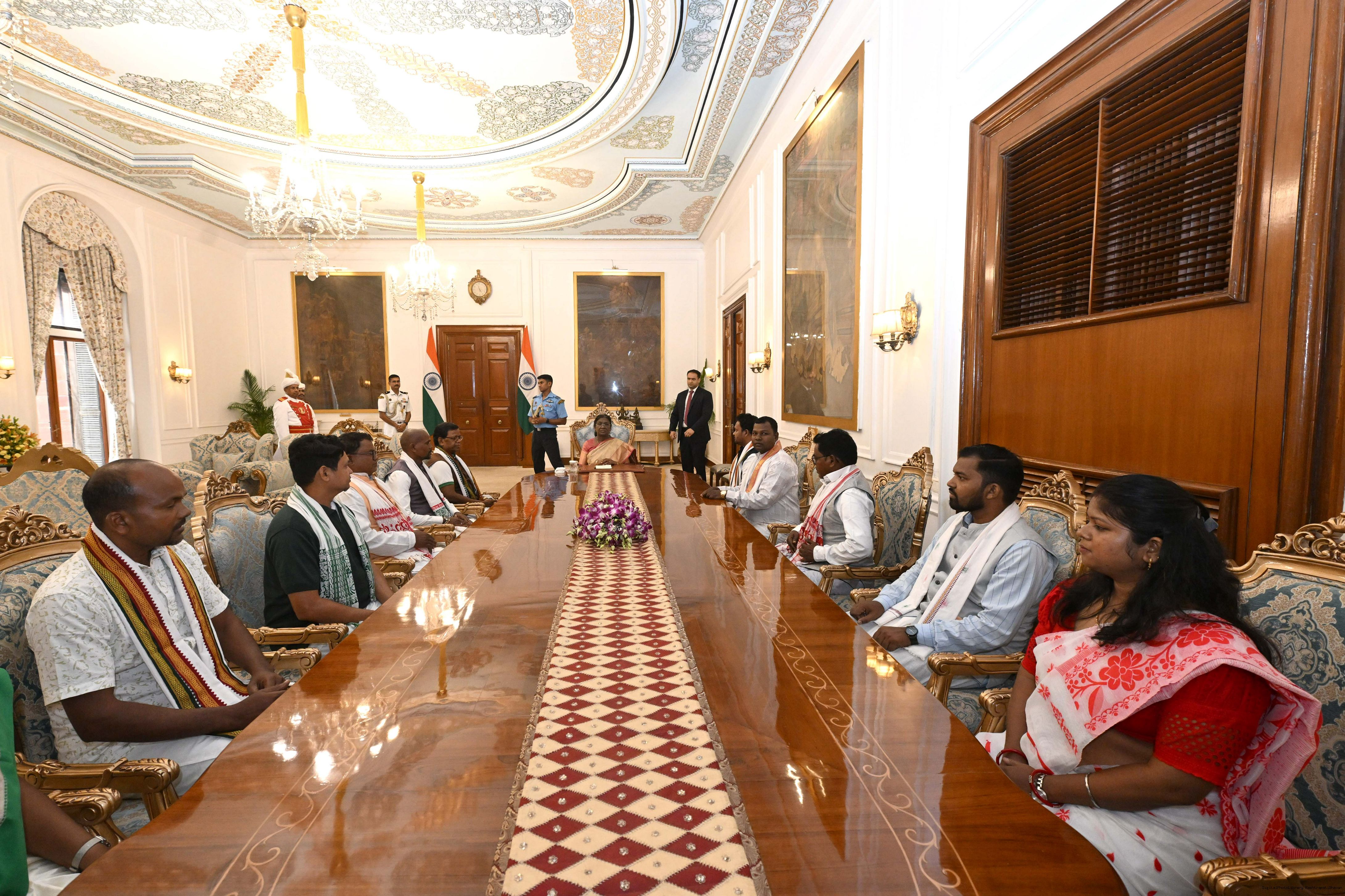 | Caption: | Shri Ramrai Munduiya, National President, All India HO Language Action Committee along with Shri Sura Biruli and others meeting with the President of India, Smt Droupadi Murmu at Rashtrapati Bhavan on October 31, 2025. |