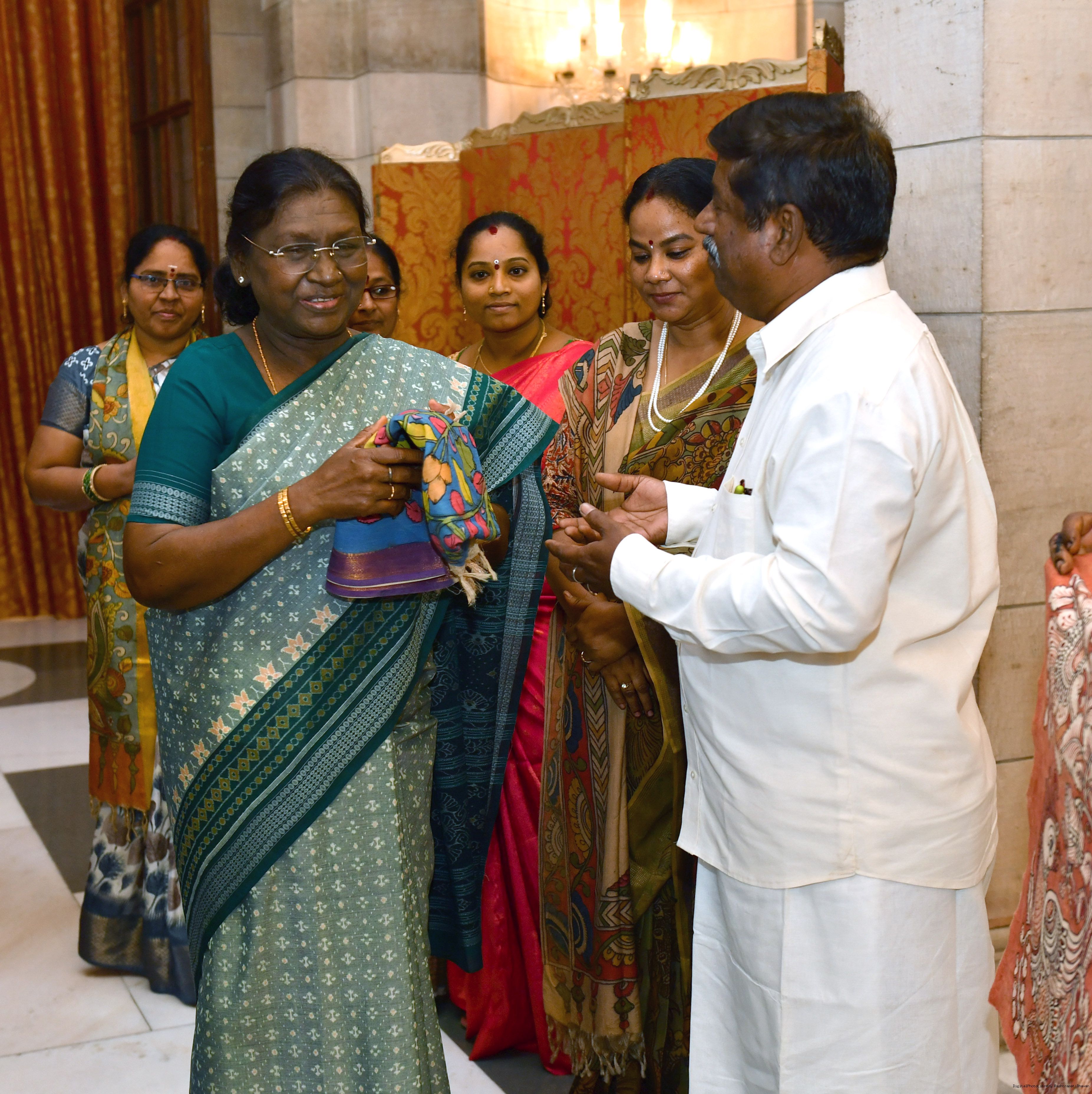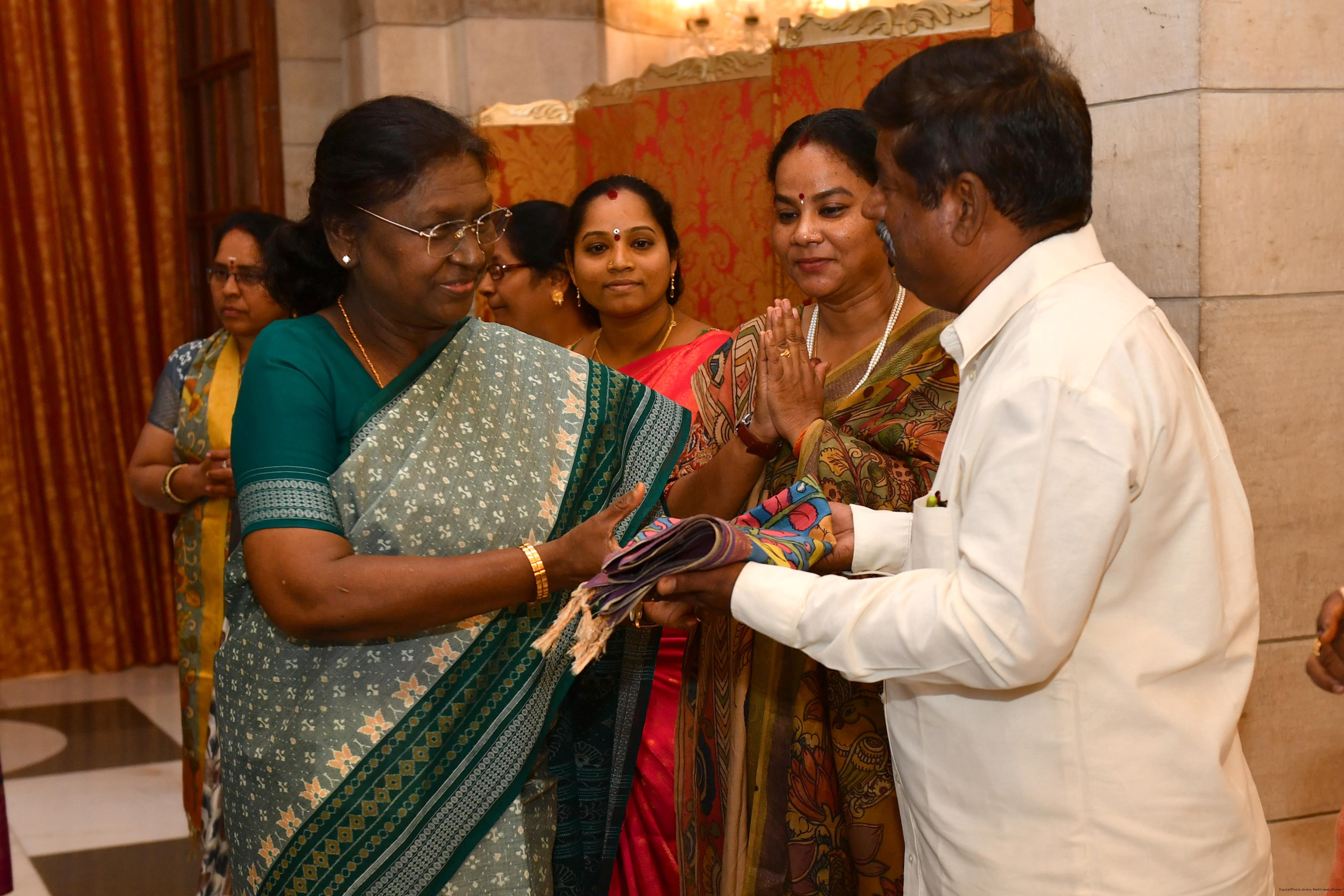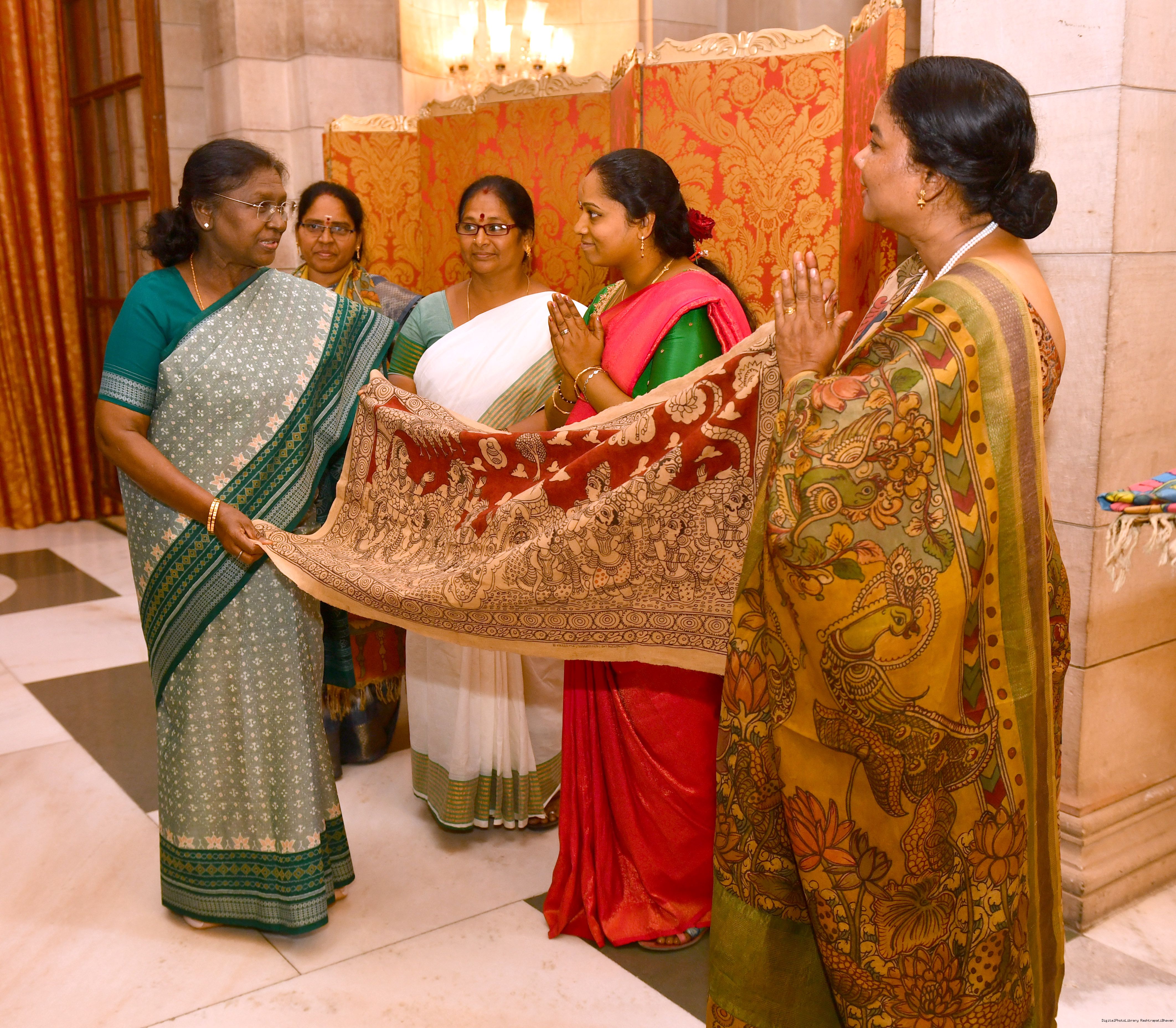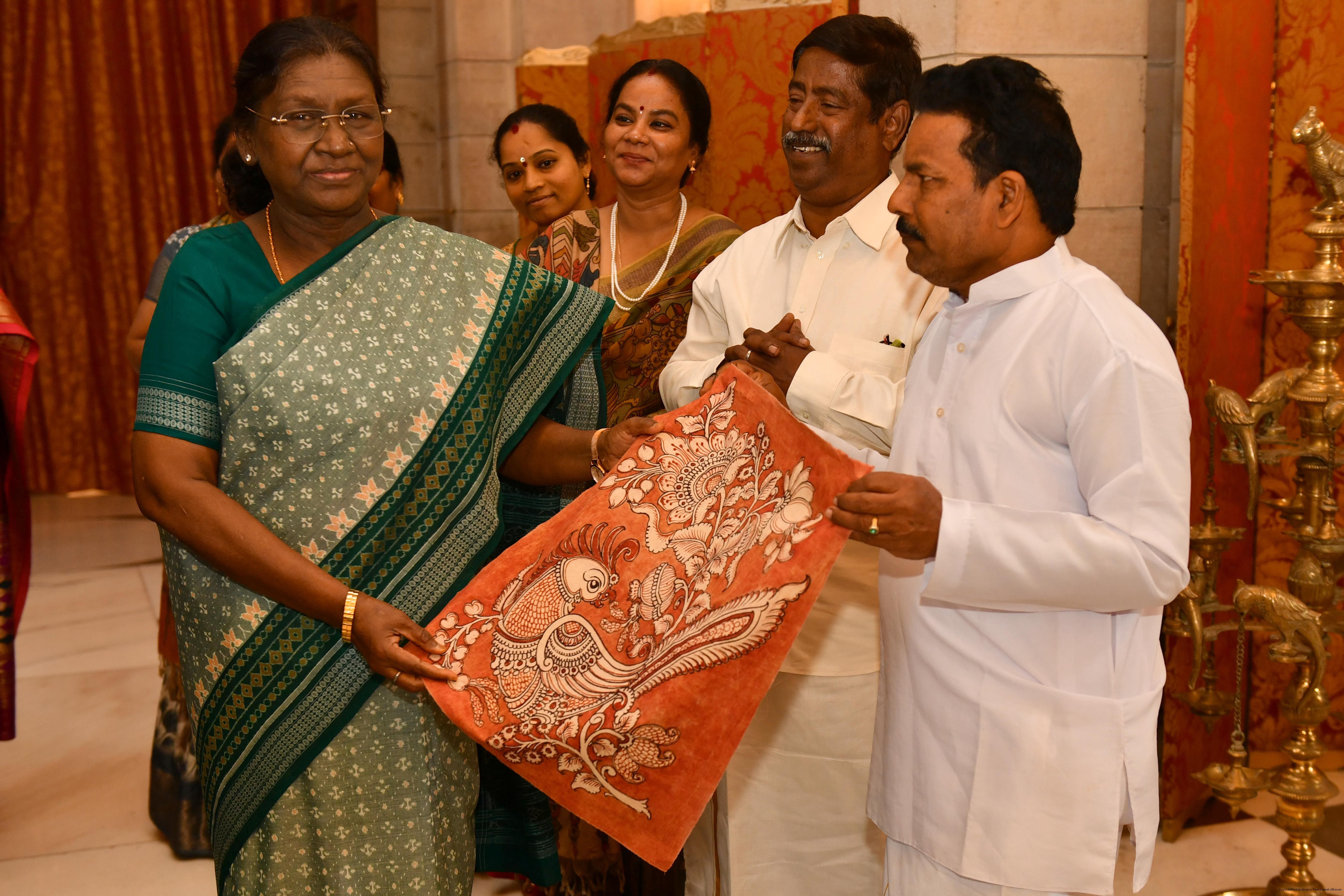 | Caption: | The President of India, Smt Droupadi Murmu met a group of artists of Kalamkari Art and witnessed their work at Rashtrapati Bhavan on February 24, 2026. |