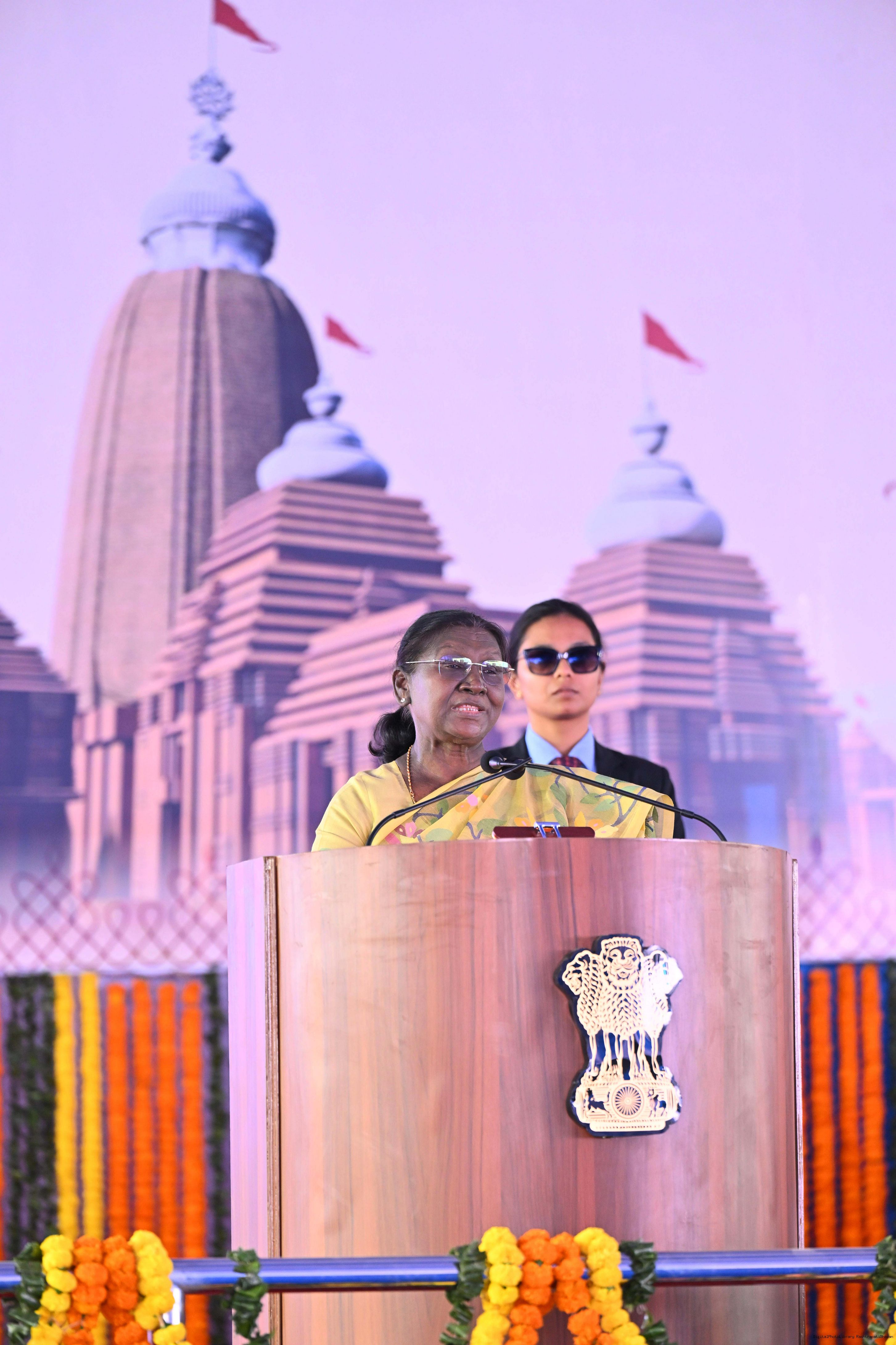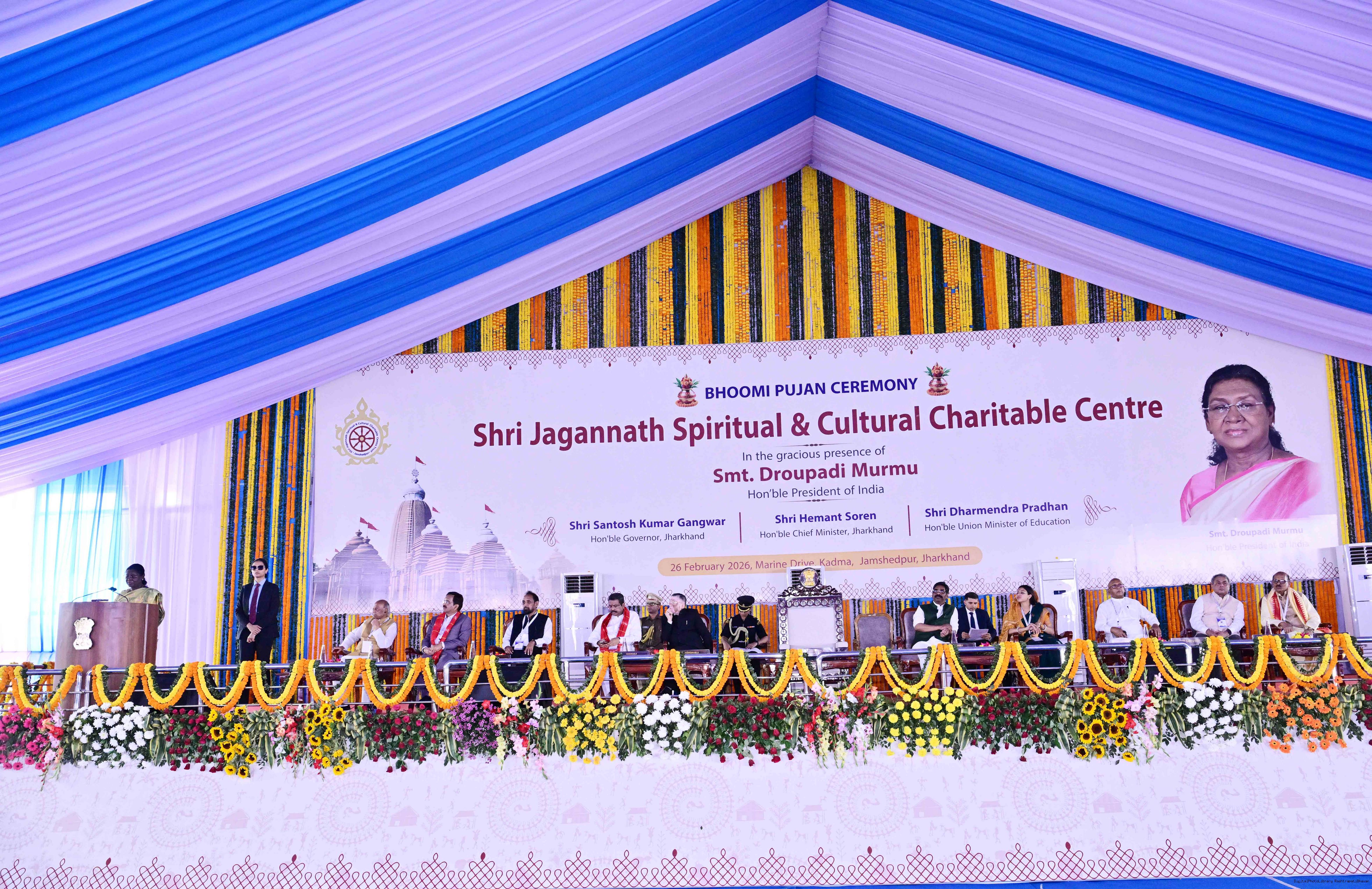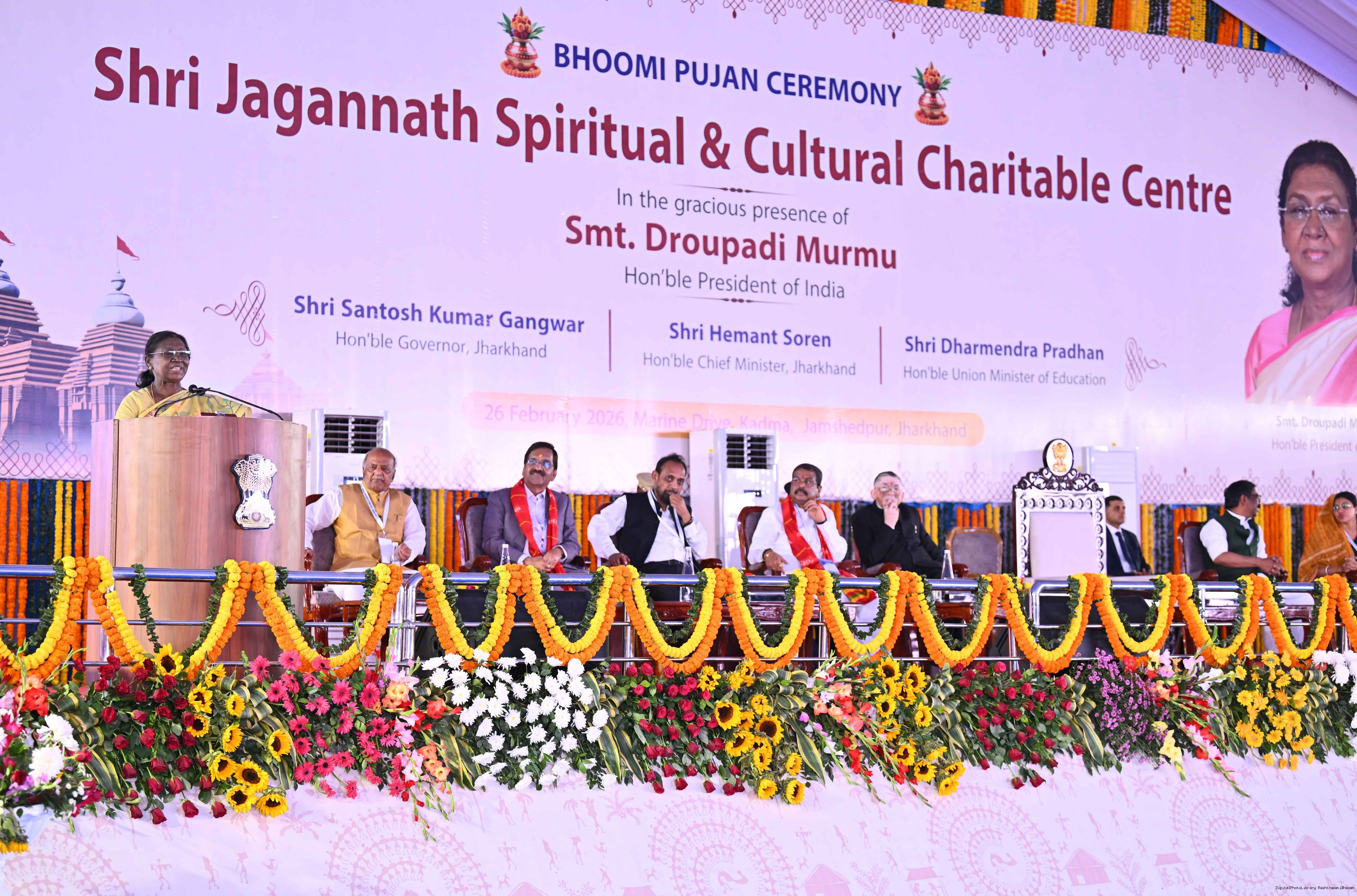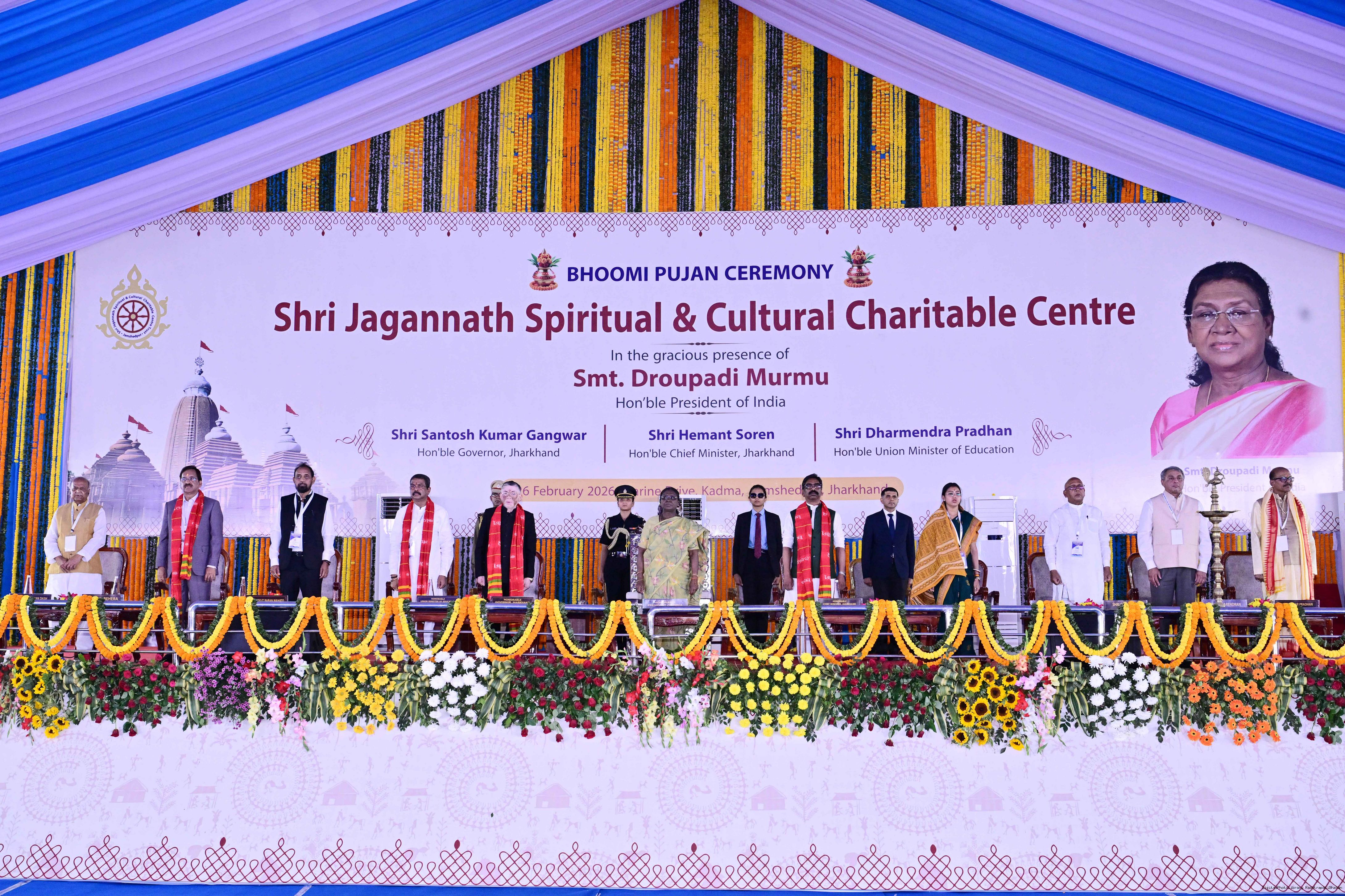 Caption: The President of India Smt Droupadi Murmu participated in the Bhoomi pujan ceremony of Sri Jagannath Temple at Jamshedpur, Jharkhand on February 26, 2026.